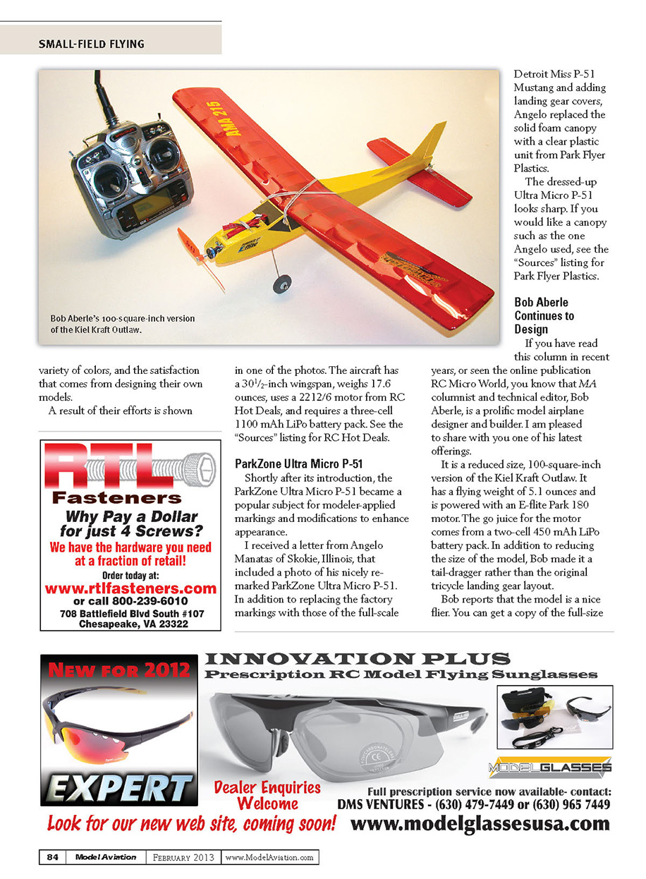 variety of colors, and the satisfaction that comes from designing their own models. A result of their efforts is shown Bob Aberle’s 100-square-inch version of the Kiel Kra Outlaw.in one of the photos. The aircraft has a 301/2-inch wingspan, weighs 17.6 ounces, uses a 2212/6 motor from RC Hot Deals, and requires a three-cell 1100 mAh LiPo battery pack. See the “Sources” listing for RC Hot Deals.ParkZone Ultra Micro P-51Shortly after its introduction, the ParkZone Ultra Micro P-51 became a popular subject for modeler-applied markings and modifi cations to enhance appearance. I received a letter from Angelo Manatas of Skokie, Illinois, that included a photo of his nicely re-marked ParkZone Ultra Micro P-51. In addition to replacing the factory markings with those of the full-scale Detroit Miss P-51 Mustang and adding landing gear covers, Angelo replaced the solid foam canopy with a clear plastic unit from Park Flyer Plastics. The dressed-up Ultra Micro P-51 looks sharp. If you would like a canopy such as the one Angelo used, see the “Sources” listing for Park Flyer Plastics.Bob Aberle Continues to Design If you have read this column in recent years, or seen the online publication RC Micro World, you know that MA columnist and technical editor, Bob Aberle, is a prolifi c model airplane designer and builder. I am pleased to share with you one of his latest offerings. It is a reduced size, 100-square-inch version of the Kiel Kraft Outlaw. It has a fl ying weight of 5.1 ounces and is powered with an E-fl ite Park 180 motor. The go juice for the motor comes from a two-cell 450 mAh LiPo battery pack. In addition to reducing the size of the model, Bob made it a tail-dragger rather than the original tricycle landing gear layout. Bob reports that the model is a nice fl ier. You can get a copy of the full-size 84Model Aviation FEBRUARY 2013www.ModelAviation.comSMALLFIELD FLYING083