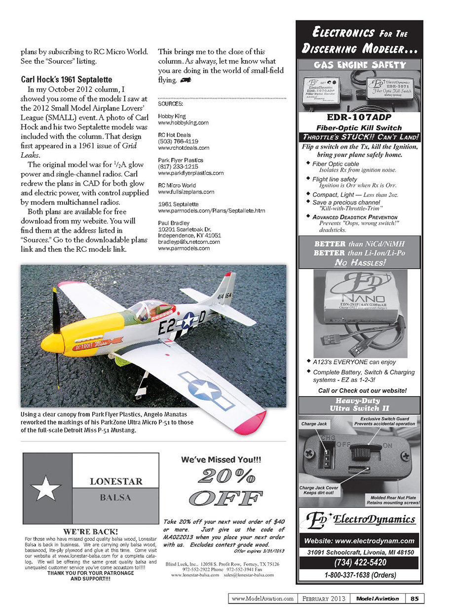 Using a clear canopy from Park Flyer Plastics, Angelo Manatas reworked the markings of his ParkZone Ultra Micro P-51 to those of the full-scale Detroit Miss P-51 Mustang.plans by subscribing to RC Micro World. See the “Sources” listing.Carl Hock’s 1961 Septalette In my October 2012 column, I showed you some of the models I saw at the 2012 Small Model Airplane Lovers’ League (SMALL) event. A photo of Carl Hock and his two Septalette models was included with the column. That design fi rst appeared in a 1961 issue of Grid Leaks. The original model was for 1/2A glow power and single-channel radios. Carl redrew the plans in CAD for both glow and electric power, with control supplied by modern multichannel radios. Both plans are available for free download from my website. You will fi nd them at the address listed in “Sources.” Go to the downloadable plans link and then the RC models link.This brings me to the close of this column. As always, let me know what you are doing in the world of small-fi eld fl ying. SOURCES:Hobby Kingwww.hobbyking.comRC Hot Deals(503) 766-4119www.rchotdeals.comPark Flyer Plastics(817) 233-1215www.parkfl yerplastics.comRC Micro Worldwww.fullsizeplans.com1961 Septalettewww.parmodels.com/Plans/Septallete.htmPaul Bradley10201 Scarletoak Dr.Independence, KY 41051bradleyp@ix.netcom.comwww.parmodels.com85Model Aviation FEBRUARY 2013www.ModelAviation.com083