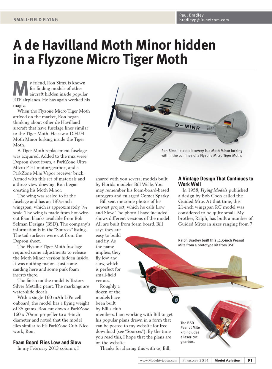 When the Flyzone Micro Tiger Moth arrived on the market, Ron began thinking about other de Havilland aircraft that have fuselage lines similar to the Tiger Moth. He saw a D.H.94 Moth Minor lurking inside the Tiger Moth.