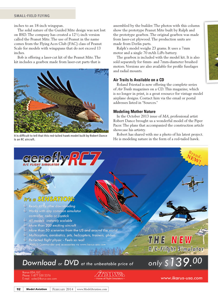 The solid nature of the Guided Mite design was not lost on BSD. The company has created a 121/2-inch version called the Peanut Mite. The use of Peanut in the name comes from the Flying Aces Club (FAC) class of Peanut Scale for models with a wingspan that does not exceed 13 inches.