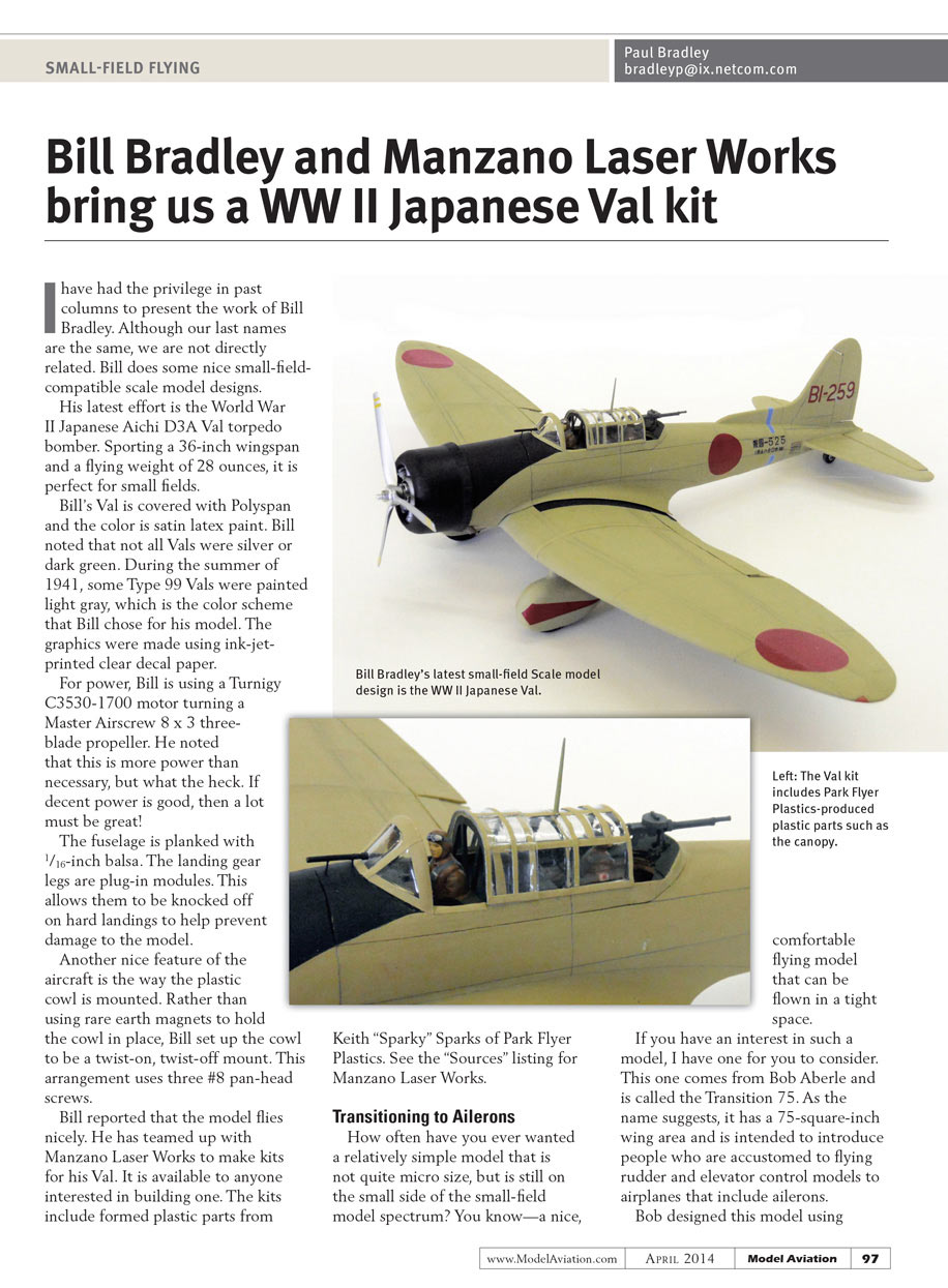 I have had the privilege in past columns to present the work of Bill Bradley. Although our last names are the same, we are not directly related. Bill does some nice small-field-compatible scale model designs.