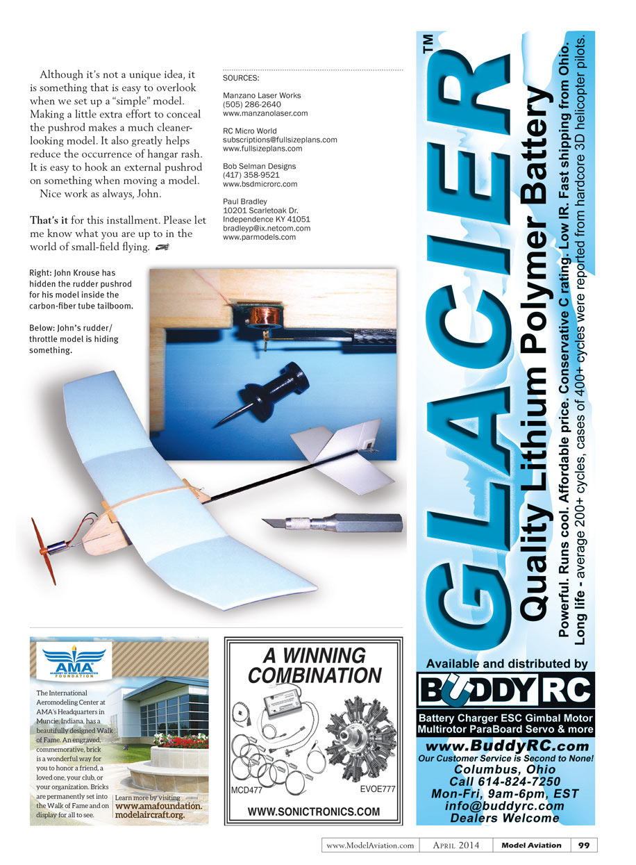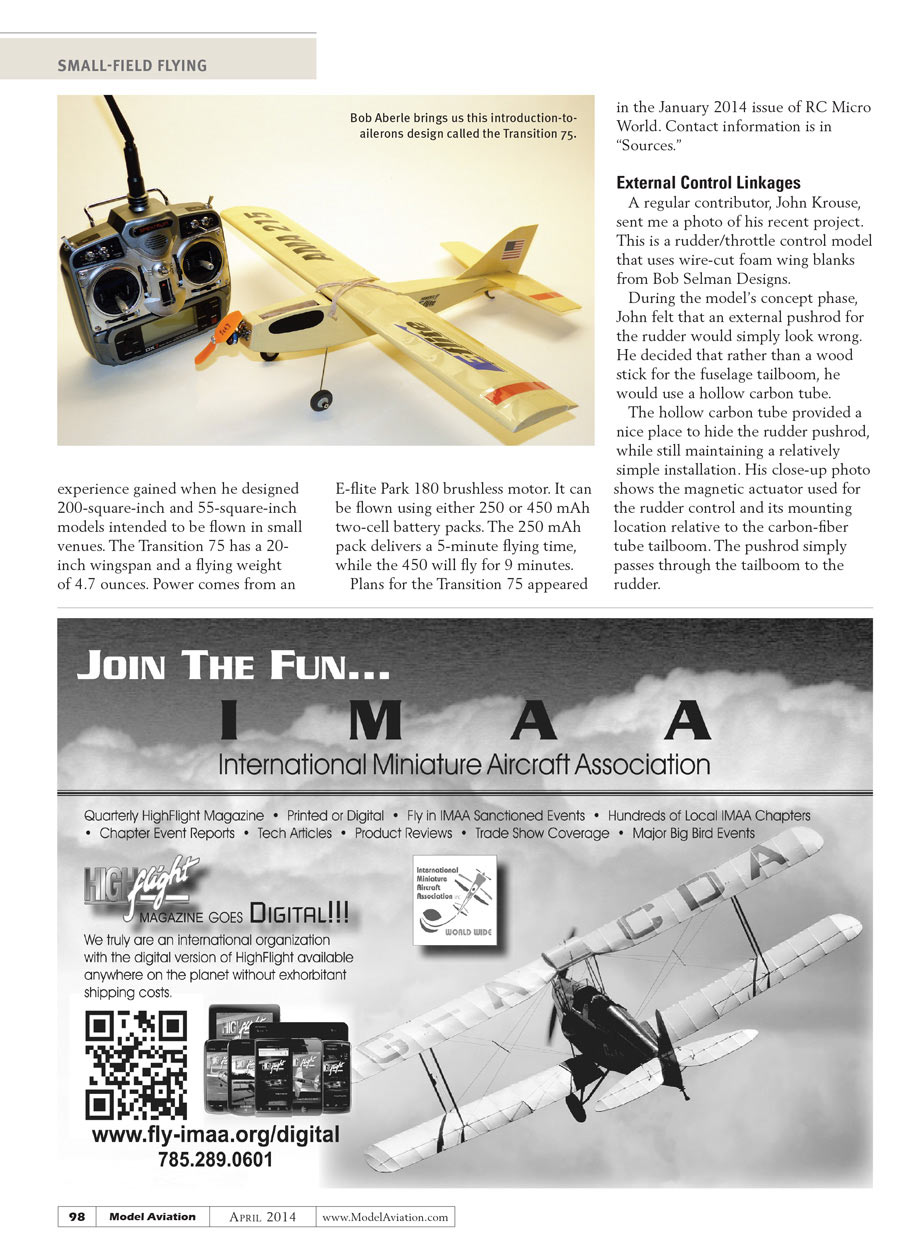 Plans for the Transition 75 appeared in the January 2014 issue of RC Micro World. Contact information is in “Sources.”
