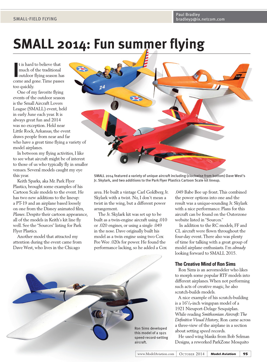 One of my favorite flying events of the outdoor season is the Small Aircraft Lovers League (SMALL) event, held in early June each year. It is always great fun and 2014 was no exception. Held near Little Rock, Arkansas, the event draws people from near and far who have a great time flying a variety of model airplanes.