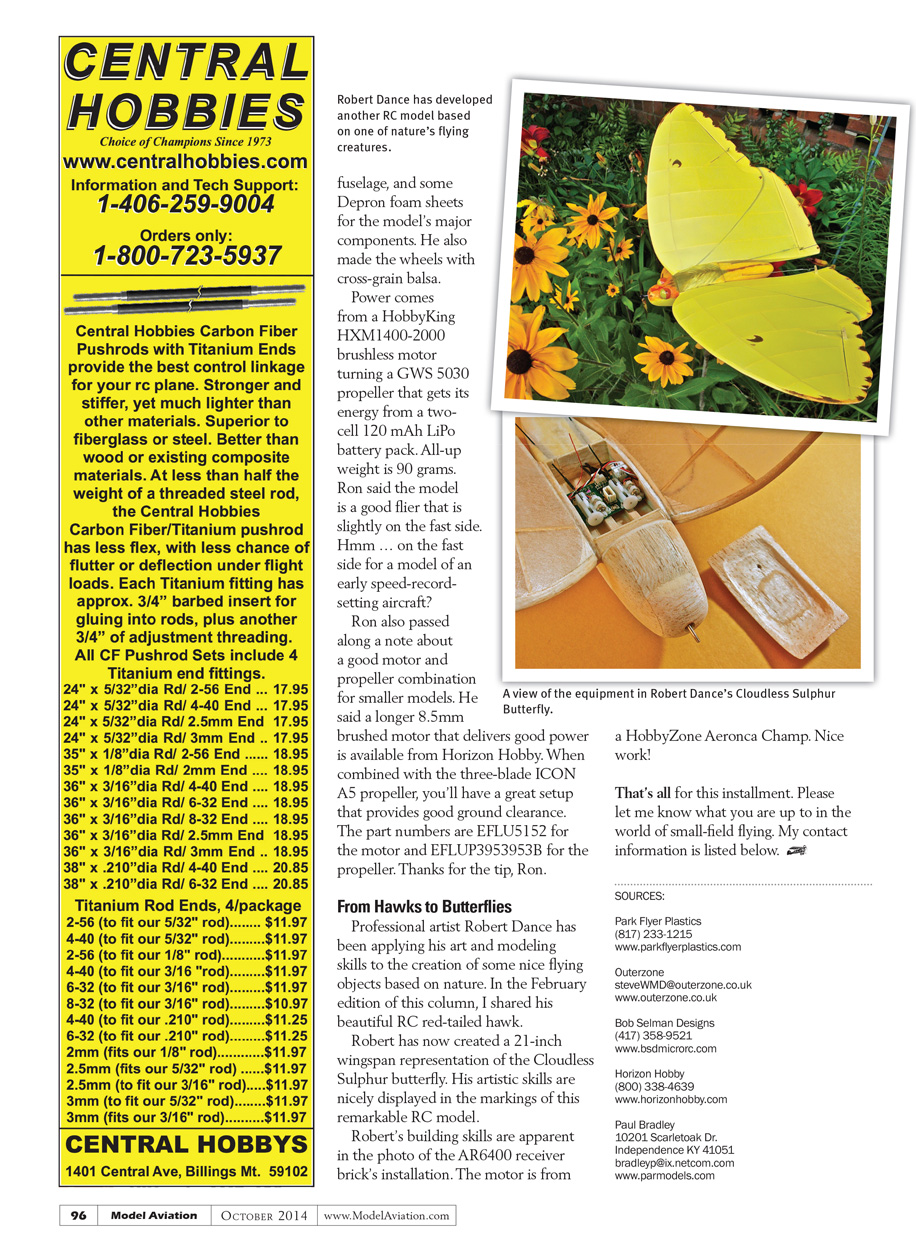 That’s all for this installment. Please let me know what you are up to in the world of small-field flying. My contact information is in the “Sources” listing.[dingbat]