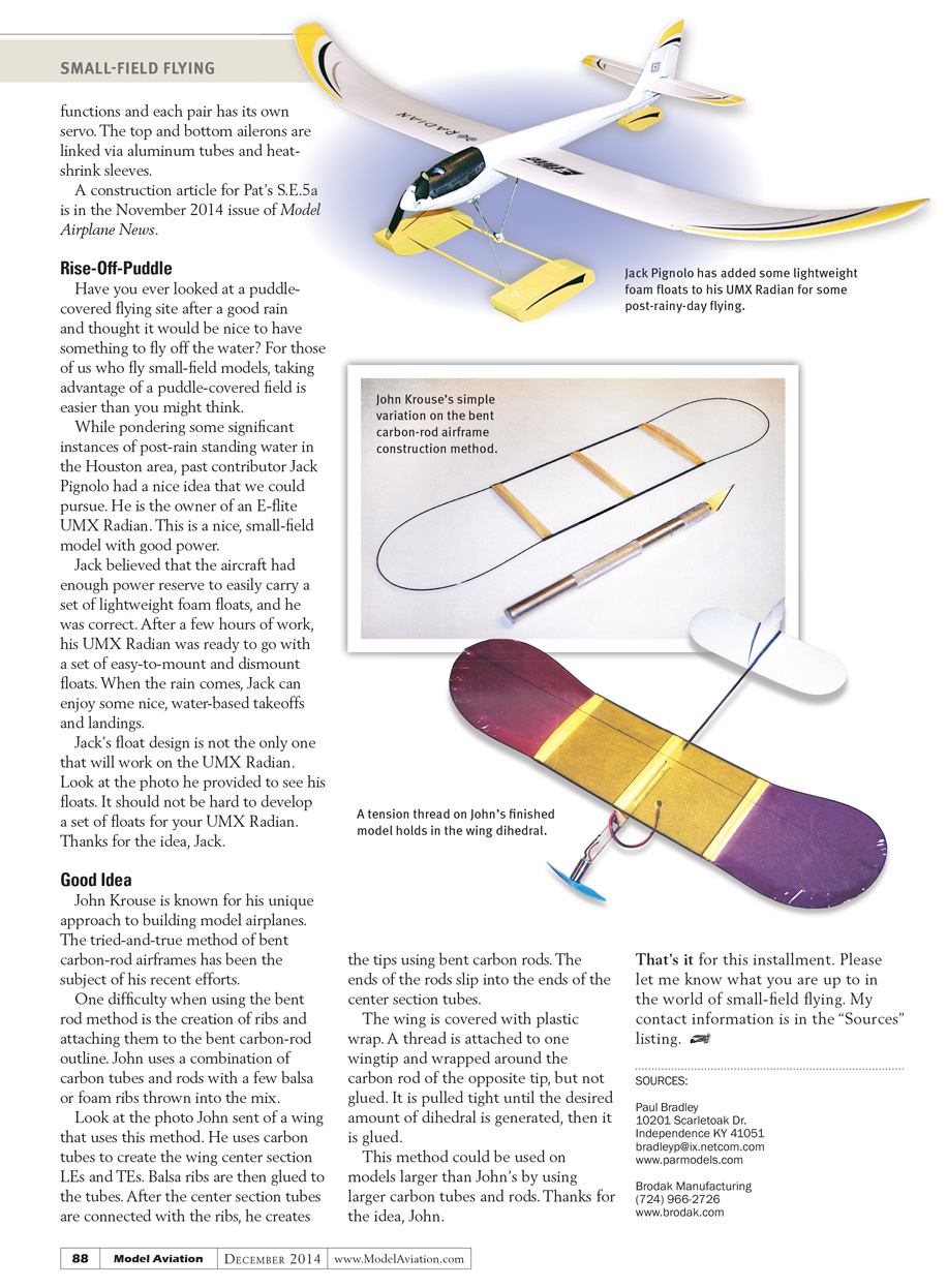 That’s it for this installment. Please let me know what you are up to in the world of small-field flying. My contact information is in the “Sources”listing.