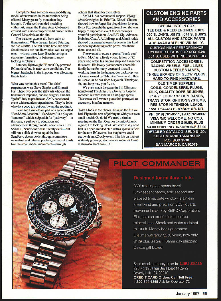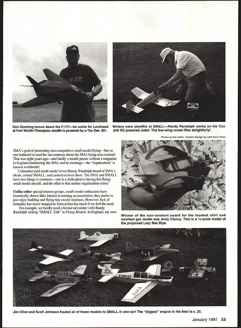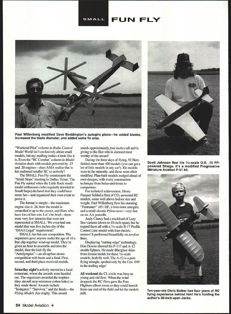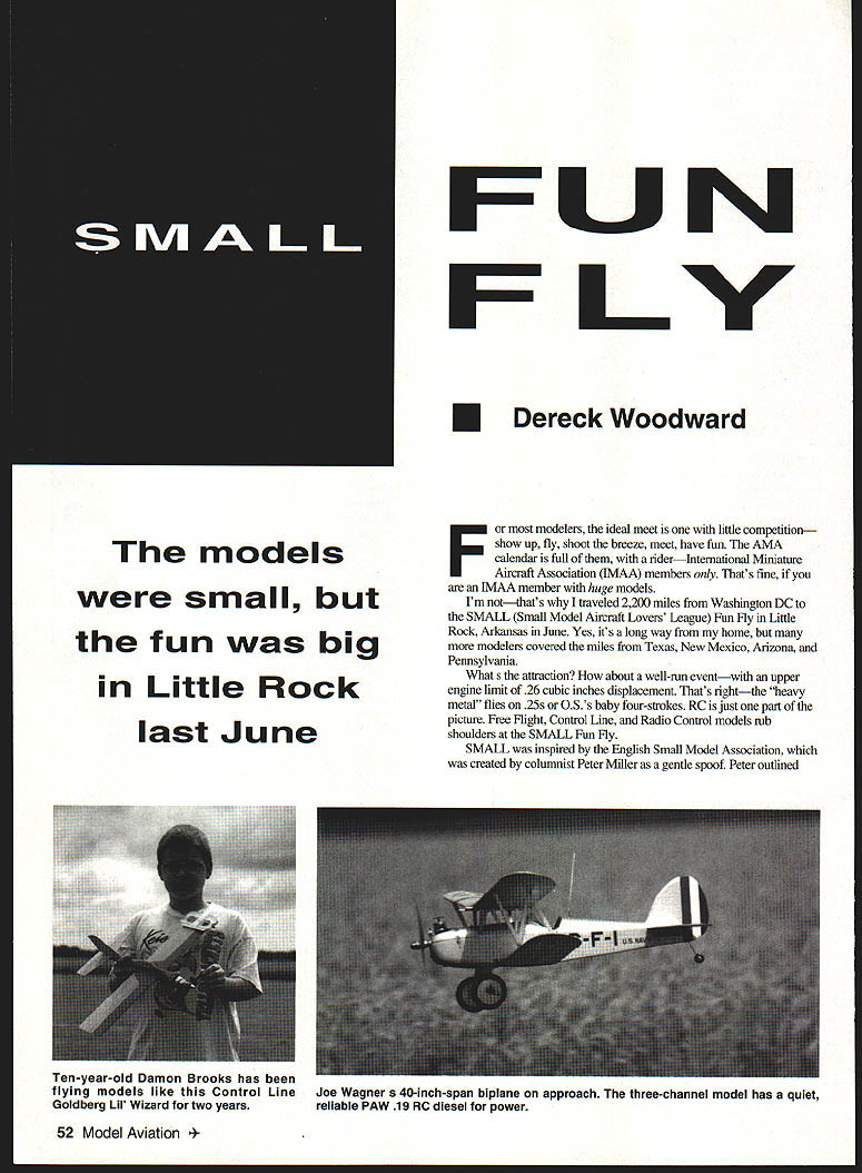 The models small fun big Little Rock last June N U Dereck Woodward modelers ideal meet little competition show up fly shoot breeze meet have fun AMA calendar full riderInternational Miniature Aircraft Association JMAA members Thats fine IMAA member huge models Im notthats traveled 2200 miles Washington DC SMALL Small Model Aircraft Lovers League Fun Fly Little Rock Arkansas June Yes its long way home modelers covered miles Texas New Mexico Arizona Pennsylvania What s attraction about well-mn eventwith upper engine limit 26 cubic inches displacement Thats rightthe heavy metal flies 25s 05 s baby four-strokes RC just part picture Free Flight Control Line Radio Control models rub shoulders SMALL Fun Fly SMALL inspired English Small Model Association created columnist Peter Miller gentle spoof Peter outlined 52 Model Aviation n-year-old Damon Brooks has flying models like Control Line Goldberg Lii Wizard two years Joe Wagner s 40-inch-span biplane approach three-channel model has quiet reliable PAW 19 RC diesel power Photos author Graphic Design Julie Anne Visco SMAs goal promoting non-competitive small model flyingbut no bothered read last sentence about SMA being non-existent eight years agoand hardly month passes magazine England mentioning SMA its meetingsthe organization known worldwide Columnist small-model lover Randy Randolph heard SMAs ideals coined SMALL carried SMA SMALL have two things commonone dedication having fun flying small model aircraft other neither organization exists Unlike other special-interest groups small-model enthusiasts have historically shown little interest running association prefer just enjoy building flying tiny model airplanes However lack formality has never stopped us achieving much feel need example hardly need formal newsletter Randy Randolph writing SMALL Talk Flying Models England own January1997 53 Don Downing knows about F-117he works Lockheed Writers plentiful SMALLRandy Randolph works Cox Fort Worth Fiberglass stealth powered Tee Dee 051 049 RC-powered Jodel low-wing model flies delightfully Winner non-existent award loudest shirt smallest gas model Andy Clancy -scale model proposed Lazy Bee Bipe Jim Olive Scott Johnson hauled models SMALL car biggeSt engine fleet 25 FUN FLV Weekend Pilot column Radio Control Model World isnt exclusively about small models mailbag makes look like RC Combat column Model Aviation deals models powered 15 20 enginesdoes AMA realize bas endorsed smaller RC actively SMALL Fun Fly counterparts Small Steps meeting Dallas Texas Fun Fly started Little Rock smallmodel enthusiasts regularly traveled Small Steps declared could have funand organized own event prove format simplethe maximum engine size 26 model controlled up owner fliers have lots fun win Lets briefthere very few interests represented SMALL model five inches shy LMAA Legal requirement SMALL has competition organizers gave anyone under age 16 free clip-together wind-up model Theyre given hour assemble trim model kids fly Aerolympicsan all-up/last-down competition heats final First second third place received medals Saturday nights activity moved local restaurant awards banded out organizers awarded trophies tiny aircraft atop miniature cotton bales made Awards include Instigator Survivor finalethe Flying Models Ace trophy award stands approximatelyfour inches tall giving flier deemed worthy award During three days flying 92 fliers fielded 400 models can get lot little models car Kit models minority often modified Plan-built models nudged ahead own-designs construction technique balsa-and-tissue composites technical achievement Henry Pasquet fielded fleet CO-powered RC models some well above Indoor size weight Paul Willenborg flew stunning Fantrainer 051 DF twin-rotor autogiro small electric Pylon racervery fast six AA pencells Andy Clancy bad tnicldoad Lazy Bee variants down 10-inch-span topped 2-scale B-17 Profile Control Line model four electric motors performed beautifully ten-foot lines Displaying cutting-edge technology Don Downs showed F-I 17 A-12 stealth fighters made fiberglass skins female molds o-scale models both fly well A- 12 pure flying triangle spoiled Cox 049 trailing edge AU weekend CL circle busy young old flew wind dropped RC fliers gave Free Flighters elbow room could launch end field let models drift 54 Model Aviation Willenborg modified Dave Boddingtons autogiro planshe added blades increased blade diameter added some fin area Scott Johnson flew 1/12-scale OS 15 FP powered Strega Its modified Progressive Miniature Aviation P-51 kit Ten-year-old Chris Bolker has four years RC flying experience behind him Hes holding authors 38-inch-span Jacko Complimenting someone good-flying model often resulted transmitter being offered got fly brought well-rounded modeling enthusiast image Flying Aces Club meet crossed non-competitive RC meet Control Line circle site weather gave its calm thunderstoun rain lashed Saturday raffle rest time flew Small models can handle wind well larger oneswitness three Lazy Bees hovering stationary formation between strangelooking aerobatics Later lightweight FF C02-powered RC models flew near-calm conditions biggest headache impound allocating flights fairly behind meet chief perpetrators Steve Staples Emmett Fry two plus stalwarts ran transmitter impound cooked burgers did gofer duty produce AMA-sanctioned event seamless organization Theyre folks good job dont want spotlight Steve Emmett part group called SendAero Aviation SendAero play sendero Spanish pathway----in case pathway education advancement through model aeronautics Like SMALL SendAero doesnt really existbut still ran slick show equal best SendAero doesnt exist through committee wrangling intemal politics perhaps exists like small model movementthrough actions stand themselves SMALL has commercial support Flying Modetr weighed Eiic Dr Diesel Clutton showed forget flat plug drivers forever Betty Fox brought gang Fox happy support event encourages youthful partic