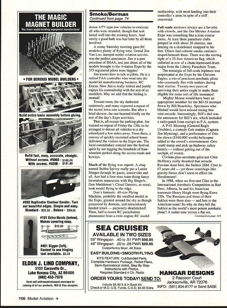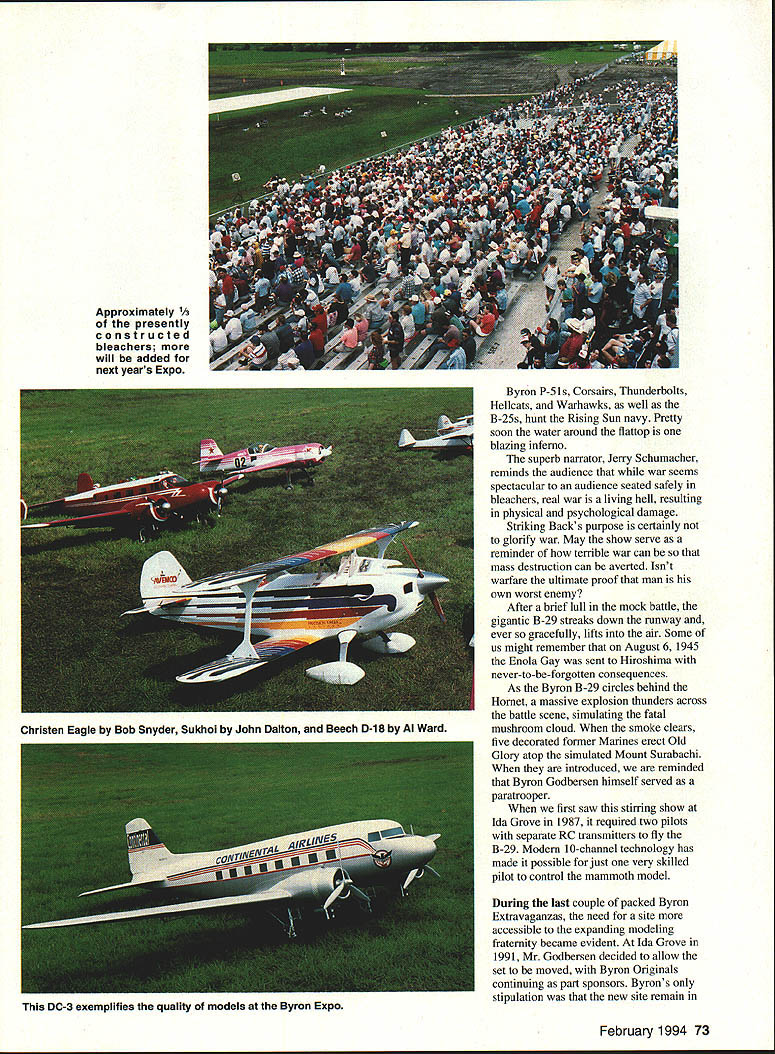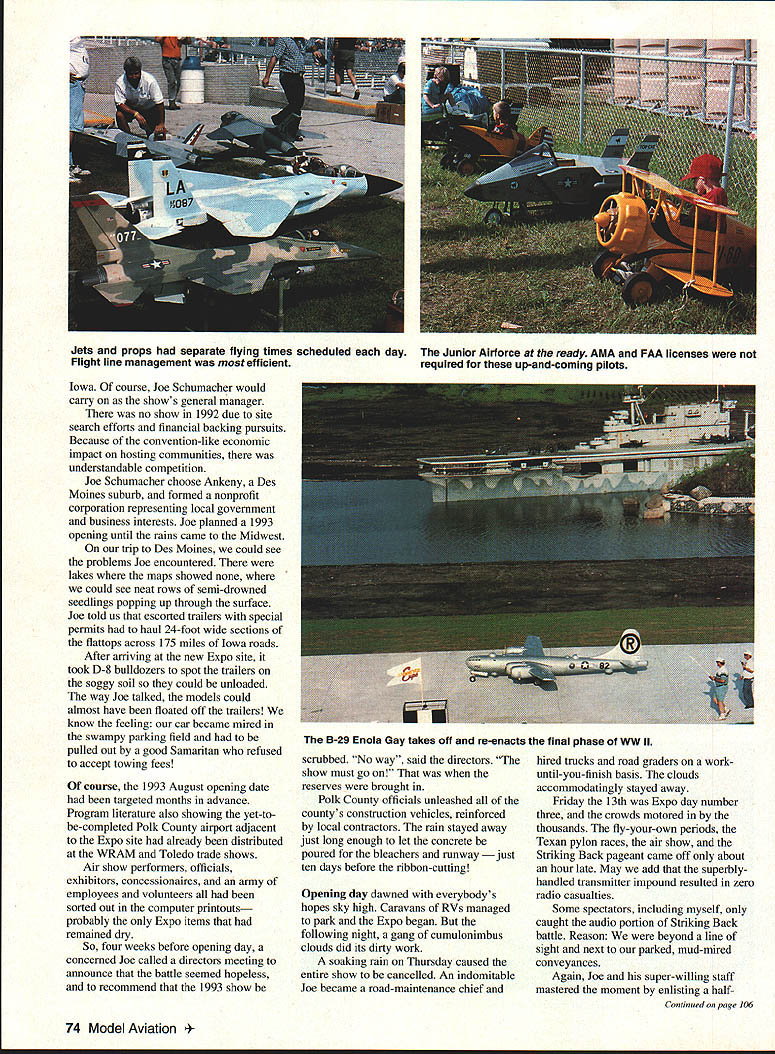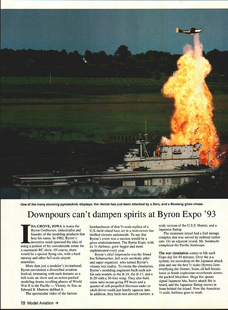 NO OCR TEXT stunning pyrotechnic displays Hornet has just attacked Zero Mustang gives chase Downpours cant dampen spirits Byron Expo 93 IDA GROVE IOWA home Byron Godbersen industrialist founder modeling products bear name 1982 Byrons inventive mind spawned idea using portion considerable estate mammoth RC show course would special flying site hard runway other full-scale airport amenities just modelers invitational Byron envisioned diversified aviation festival brimming such features full-scale air show action-packed modeling drama recalling phases World War LI Pacific ory Sea Edward R Murrow dubbed spectacular video furious bombardment /5-scale replica US-held island base set mini-ocean has thrilled viewers nationwide say Byrons event success would gross understatement Byron Expo its 1/5 Airforce grew bigger sophisticated year Byrons chief impresario friend Joe Schumacher full-scale aerobatic pilot super organizer turned Byrons visions reality create simulation Byrons modeling engineers built such notfor-sale models B-24 B-17 B-29 30-foot wing also built some mini ocean-going PT boats quartet self-propelled Sherman tanks adult driver could just barely squeeze addition built two aircraft carriers scale version USS Hornet Japanese flattop miniature island fuel storage complex served railroad tanker cars adjacent island Mt Surabachi completed Pacific landscape war simulation comes life Expo day 45 minutes Over pa system eavesdrop Japanese attack plan see first 1/5 scale Byron Zero overflying Hornet Soon hell breaks loose bomb explosions reverberate across packed bleachers Huge fire spouts signal Japanese hits heavy attack fire heard Japanese fiattop moves behind island Now American /s scale Airforce goes work 72 Model Aviation * Approximately 1/3 presently Co nst ru cted bleachers will added next years Expo Byron P-S Corsairs Thunderbolts Helicats Warhawks well B-25s hunt Rising Sun navy Pretty soon water around flattop blazing inferno superb narrator Jerry Schumacher reminds audience war seems spectacular audience seated safely bleachers real war living hell resulting physical psychological damage Striking Backs purpose certainly glorify war May show serve reminder terrible war can mass destruction can averted Isnt warfare ultimate proof man own worst enemy After brief lull mock battle gigantic B-29 streaks down runway ever gracefully lifts air Some us might remember August 6 1945 Enola Gay sent Hiroshima never-to-be-forgotten consequences As Byron B-29 circles behind Hornet massive explosion thunders across battle scene simulating fatal mushroom cloud smoke clears five decorated former Marines erect Old Glory atop simulated Mount Surabachi introduced reminded Byron Godbersen himself served paratrooper first saw stirring show Ida Grove 1987 required two pilots separate RC transmitters fly B-29 Modem 10-channel technology has made possible just very skilled pilot control mammoth model During last couple packed Byron Extravaganzas need site accessible expanding modeling fraternity became evident Ida Grove 1991 Mr Godbersen decided allow set moved Byron Originals continuing part sponsors Byrons stipulation new site remain February 1994 73 Christen Eagle Bob Snyder Sukhoi John Dalton Beech D-18 Al Ward DC-3 exemplifies quality models Byron Expo Iowa course Joe Schumacher would carry shows general manager no show 1992 due site search efforts financial backing pursuits Because convention-like economic impact hosting communities understandable competition Joe Schumacher choose Ankeny Des Moines suburb formed nonprofit corporation representing local government business interests Joe planned 1993 opening until rains came Midwest trip Des Moines could see problems Joe encountered lakes maps showed could see neat rows semi-drowned seedlings popping up through surface Joe told us escorted trailers special permits haul 24-foot wide sections flattops across 175 miles Iowa roads After arriving new Expo site took D-8 bulldozers spot trailers soggy soil could unloaded way Joe talked models could almost have floated off trailers know feeling car became mired swampy parking field pulled out good Samaritan refused accept towing fees course 1993 August opening date targeted months advance Program literature also showing yet-tobe-completed Polk County airport adjacent Expo site already distributed WRAM Toledo trade shows Air show performers officials exhibitors concessionaires army employees volunteers sorted out computer printouts probably Expo items remained dry So four weeks before opening day concerned Joe called directors meeting announce battle seemed hopeless recommend 1993 show scrubbed No way said directors show must go reserves brought Polk County officials unleashed countys construction vehicles reinforced local contractors rain stayed away just long enough let concrete poured bleachers runway ten days before ribbon-cutting Opening day dawned everybodys hopes sky high Caravans RVs managed park Expo began following night gang cumulonimbus clouds did its dirty work soaking rain Thursday caused entire show cancelled An indomitable Joe became road-maintenance chief hired trucks road graders workuntil-you-finish basis clouds accommodatingly stayed away Friday 13th Expo day number three crowds motored thousands fly-your-own periods Texan pylon races air show Striking Back pageant came off about hour late May add superblyhandled transmitter impound resulted zero radio casualties Some spectators including myself caught audio portion Striking Back battle Reason beyond line sight next parked mud-mired conveyances Again Joe super-willing staff mastered moment enlisting halfContinued page 106 74 Model Aviation props separate flying times scheduled dayThe Junior Airforce ready AMA FAA licenses Flight line management efficientrequired up-and-coming pilots B-29 Enola Gay takes off re-enacts final phase WW II #101 Extra Hands below Makes covering easy #401 Digger left Easiest use hinging tool available $335 ELDON J