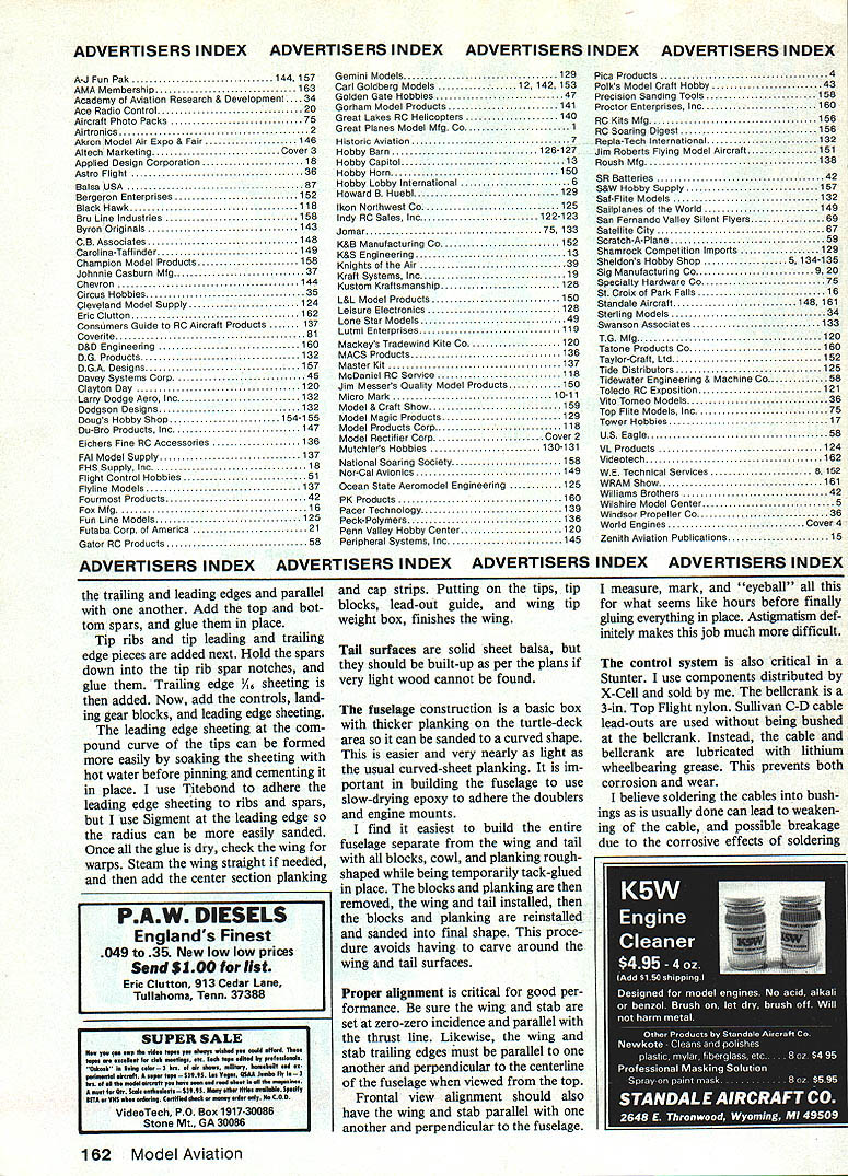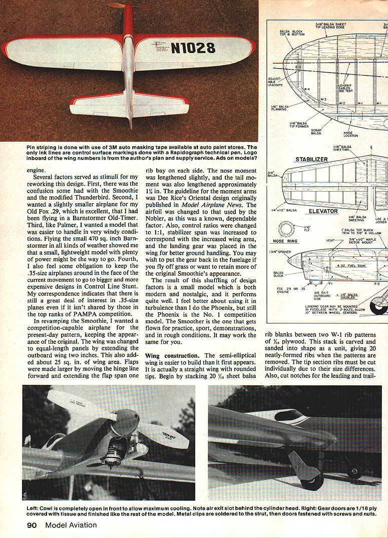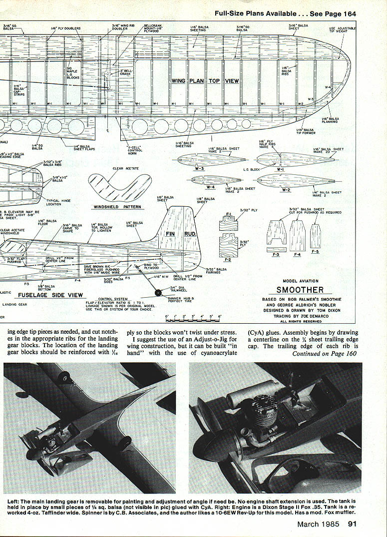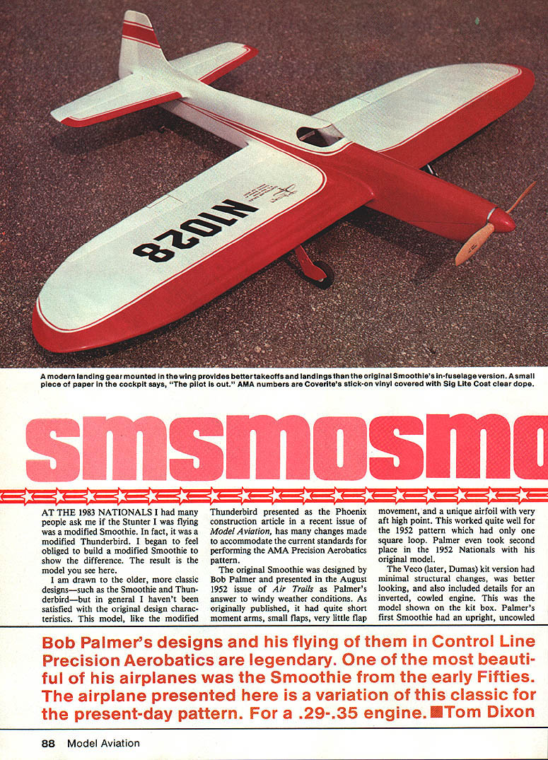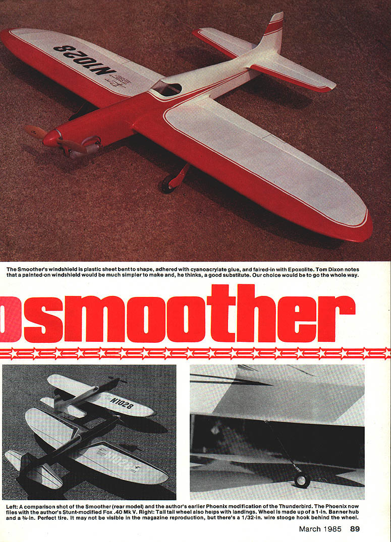 A modern landing gear mounted wing provides bettertakeoffs iandings originai Smoothies in-fuseisge version smaii piece paper cockpit says pilot out AMA numbers Coverites stick-on vinyl covered Sig Lite Coat clear dope AT THE 1983 NATIONALS people ask Stunter flying modified Smoothie fact modified Thunderbird began feel obliged build modified Smoothie show difference result model see am drawn older classic designssuch Smoothie Thun derbirdbut general havent satisfied original design charac teristics model like modified Thunderbird presented Phoenix construction article recent issue Model Aviation has changes made accommodate current standards performing AMA Precision Aerobatics pattern original Smoothie designed Bob Palmer presented August 1952 issue Air Trails Palmers answer windy weather conditions As originally published quite short moment arms small flaps very little flap movement unique airfoil very aft high point worked quite well 1952 pattern square loop Palmer took second place 1952 Nationals original model Veco later Dumas kit version minimal structural changes better looking also included details inverted cowled engine model shown kit box Palmers first Smoothie upright uncowled Bob Palmers designs flying Control Line Precision Aerobatics legendary beauti ful airplanes Smoothie early Fifties airplane presented variation classic present-day pattern 29-35 engine ETom Dixon 88 Model Aviation Smoothers windshield plastic sheet bent shape adhered cyanoacrylate glue faired-in Epoxolite Tom Dixon notes painted-on windshield would much simplerto make thinks good substitute choice would go whole way IIIIIIIIIIII III Left comparison shot Smoother rear model authors earlier Phoenix modification Thunderbird Phoenix now flies authors Stunt-modified Fox 40 Mk V Right Tall tail wheel also helps landings Wheel made up al-in Banner hub -in Perfect tire may visible magazine reproduction theres 1/32-in wire stooge hook behind wheel March 1985 89 engine Several factors served stimuli reworking design First confusion some Smoothie modified Thunderbird Second wanted slightly smaller airplane Old Fox 29 excellent flying Barnstormer Old-Timer Third like Palmer wanted model easier handle very windy condi tions Flying small 470 sq inch Barn stormer kinds weather showed small lightweight model plenty power might way go Fourth also feel some obligation keep 35-size airplanes around face current movement go bigger expensive designs Control Line Stunt correspondence indicates still great deal interest 35-size planes isnt shared top ranks PAMPA competition revamping Smoothie wanted competition-capable airplane present-day pattern keeping appear ance original wing changed equal-length panels extending outboard wing two inches also add ed about 25 sq wing area Flaps made larger moving hinge line forward extending flap span rib bay side nose moment lengthened slightly tail mo ment also lengthened approximately 11/4 guideline moment arms Dee Rices Oriental design originally published Model Airplane News airfoil changed used Nobler known dependable factor Also control ratios changed 11 stabilizer span increased correspond increased wing area landing gear placed wing better ground handling may wish put gear back fuselage fly off grass want retain original Smoothies appearance result shuffling design factors small model both modern nostalgic performs quite well feel better about using turbulence Phoenix still Phoenix No 1 competition model Smoother gets flown practice sport demonstrations rough conditions may work same Wing construction semi-elliptical wing easier build first appears actually straight wing rounded tips Begin stacking 20 /16 sheet balsa BALSA OCK TOP B BOTTOM 7 1 ADJUST ABLE LEAOOJTSw W4 016 BALSA PLANKING 3IB BALSA SHEET3/I TIP LEADING EDGEBAI &2KIAFZ7iw_t W-3 SABLES SEE TEET W-2 W1 W1 x-IL74I/IKBALSAVIZ _____ TIP FORMER SCRAP BALSAHI GE LOCATION I/I6 BALSA SHEETING STABILIZER 3B-1t}Ji BALSAII I-_ 4 IrA I/2 BALSAELEVATOR 1/16 BALSA SHEETINGUSE JOINER I/IR PLY NOSE RING BALSA TOP BLOCK TRIM TO 7/B B HOLLOW VENT3/BII/O MAPLE MOTOR MOUNT I-3/4 SPINNER-----II 4 OZ FUEL TANK ii BALSA BLOCK- -U FOG 2H OR 35 ENGINEAIR SIT/1 OUTBOARD• I/B BALSA77A SIDE LER LANDING SEAR MAY BE MOUNTED IN FUSELAGE WITH 3 BOLTS ALLO~ 10 BETWEEN WHEEL CENTERS rib blanks between two W-l rib patterns /6 plywood stack carved sanded shape unit giving 20 neatly-formed ribs patterns removed tip section ribs must cut individually due size differences Also cut notches leading trailLeft Cowl completely open frontto allow maximum cooling Note air exit slot behind cylinder head Right Geardoors 1/16 ply covered tissue finished like rest model Metal clips soldered strut doors fastened screws nuts 90 Model Aviation Pin striping done use 3M auto masking tape available auto paint stores ink lines control surface markings done Rapidograph technical pen Logo inboard wing numbers authors plan supply service Ads models Full-Size Plans Available. See Page 164 3/IA SOS/IA WING RIBLLCRANK3/16 BALSA BALSA116 PLY DOUBLERSDOUBLERMOUNT- I/BI/lB BALSA3/lB SOSHE 1USE ADJIJYTA PLYWOOOSHEETINGBALSATIP WEIGHT ---- t EUii IIMAPI.E13BELL I/lBIIWIIIG PLAN TOP VIEWh7 BALSA 4I7 i---__-- -- Th7irni /L16 PLY I/4SO1/4 BALSAS-CELLSHEETING1/16 BALSA SHEETHALF RIBS MAKE 4 BALSASI-fEY FLAPSV16 BALSA SHEET CONTROLMARE 3MAKE DO B I/O BALSAHORN lADING EDGE 3/3D 3/B [v32][b-1-10-1-10]] BALSA RIBS H CL AR ACETATE W3 L S BLOCK W1 I/O BALSA/---/ /W41/16 BALSA SHEETw-2 MAKE D016 BALSA SHEET /MAKE S I/B BALSAI/B BALSA TYPICAL HINGESHEETSHEET LOCATION WINDSHIELD PATTERN 3/SD PLY 3/32 BALSA SHEET B ELEVATORMAY BEL,CUT FOR PUSHNOC AS REQUIRES SHEET3/B 1/16 BALSAI/B BALSAI FL CI3/16 BALSA1/4 BALSASHEET[L~ ILEAR ACETATECARVE TOTOP HOLLOW I[ ILc2J 6INSSRIELDSHAPETO LIGHTEN- FINRUDj--yj J -III F-S S/ FLADIALL 1/2 FROM IF-3F-4 P551-WOO L BIND TO IBERGLASS PUSHRODPLYWOODI ---3/3D BALSA WITh I/IA MUSIC WIREFAR NGS VIA MWDRILL 1/2 FROM 3/32 BALSA F-NCENTER LINEMODEL AVIATION F-4SIDES Ls BA