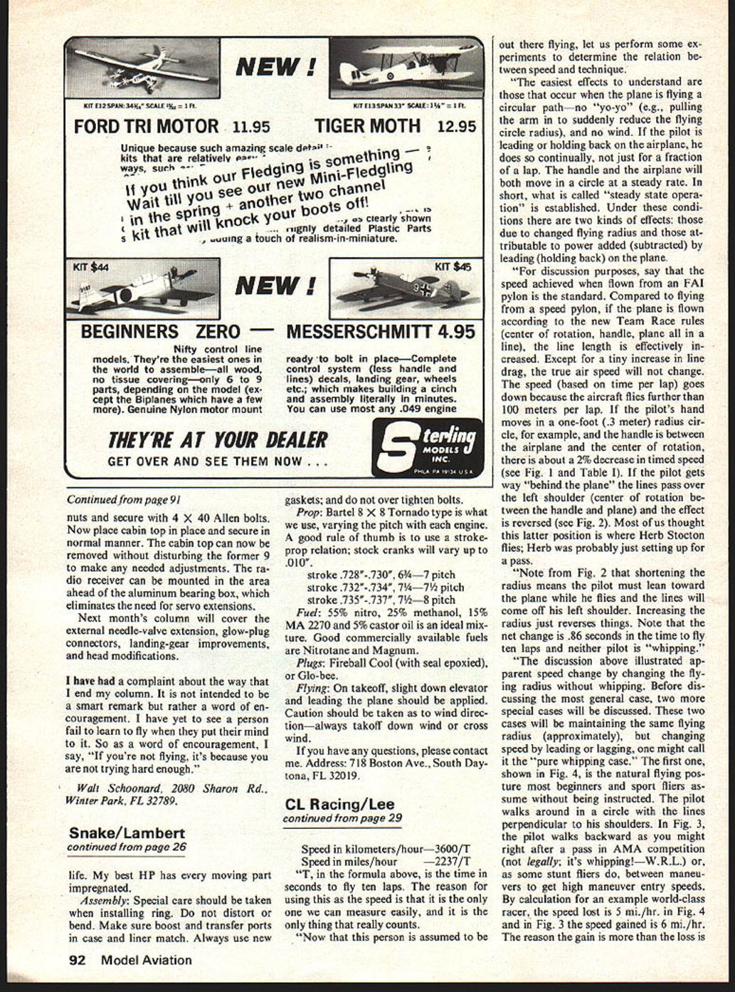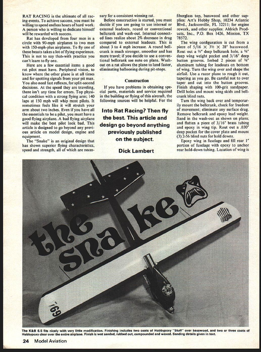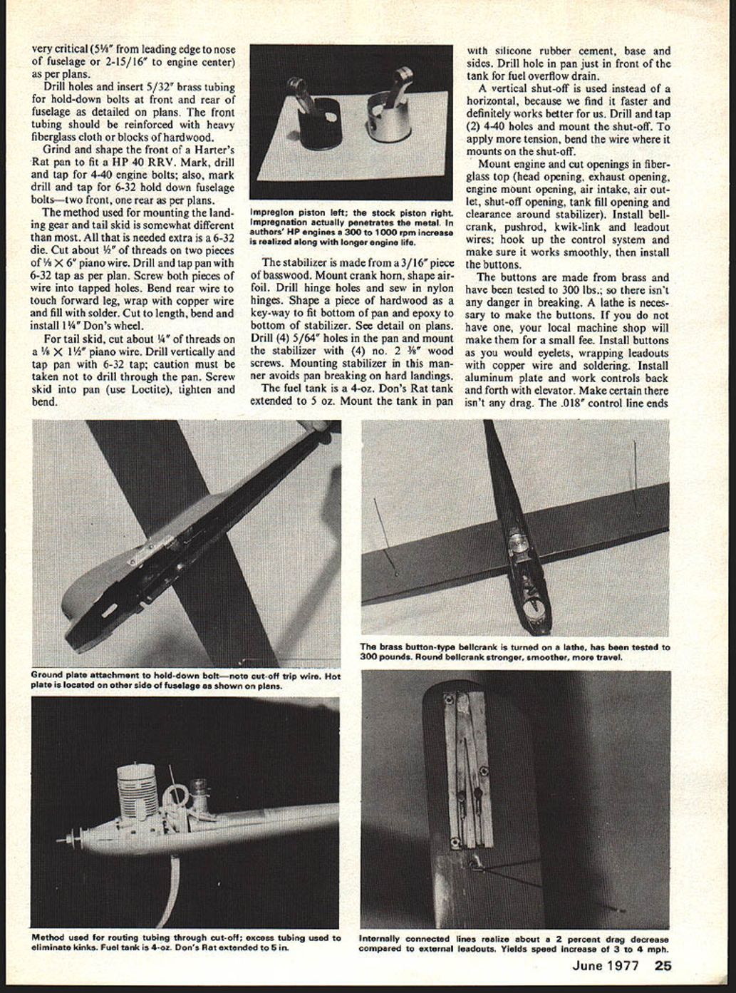 RAT RACING ultimate rac ing events achieve success must willing spend endless hours hard work person willing dedicate himself will rewarded success Rat has developed four men circle 90-mph airplanes two men 150-mph-plus airplanes fly beasts takes lot flying experience say practice cant learn fly few essential items good rat pilot must have Peripheral vision know other plane times spotting signals pit man also need fast reflexes split-second decisions speed traveling isnt time errors Top physi cal condition strong flying arm 140 laps 150 mph will whip pilots sometimes feels like will stretch arm about two inches have essentials pilot must have good flying airplane bad flying airplane will make best pilot look bad article designed go beyond previ ous article model design engine equipment Snake original design has shown superior flying characteristics speed strength neces sary consistent winning rat Before construction started must decide going use internal external leadouts round conventional bellcrank wash-out Internal connect ed lines realize about 2% decrease drag compared external leadouts about 3 4 mph increase round bellcrank much stronger smoother has travel decide use conven tional bellcrank see note plans Wash out rat allows plane land faster eliminating ballooning during pit-stops Construction have problems obtaining spe cial parts materials service required building flying aircraft following sources will helpful Rat Racing fly best article design go beyond anything previously published subject fiberglass top basswood other sup plies Arts Hobby Shop 10234 Atlantic Blvd Jacksonville FL 32211 engine rework other supplies Aldrich Prod ucts Inc PO Box 1426 Mission TX 78572 wing configuration cut piece 5/16 x 3 x 28 basswood Rout out bellcrank hole /8 deep wing weight pocket 3/16 deep button grooves Imbed 2 pieces /8 aluminum tubing leadouts bottom wing Turn wing over shape airfoil Use razor plane rough out tapering go careful over taper cut button grooves Finish shaping 100-grit sandpaper Drill holes mount wing skids bellcrank blind nuts Turn wing back over temporar ily mount bellcrank check freedom movement eliminate surface drag Remove bellcrank epoxy lead weight Sand wash-out shown plans flatten piece 3/16 brass tubing epoxy wing tip Rout out 030 deep pocket cover plate mount 3 2-56 blind nuts hold downs Epoxy wing fuselage fill rear 1 portion fuselage epoxy anchor rear hold-down tubing Logation wing 24 Model Aviation Dick Lambert K&B 65 fits nicely very little moditication Finishing includes two Coats Hobbypoxy Stuff over basswood two three coats Hobbypoxy clear over entire airplane Finish wet sanded rubbed Out compounded waxed Sanding details given text very critical 5 leading edge nose fuselage 2-15/16 engine center per plans Drill holes insert 5/32 brass tubing hold-down bolts front rear fuselage detailed plans front tubing should reinforced heavy fiberglass cloth blocks hardwood Grind shape front Harters Rat pan fit HP 40 RRV Mark drill tap 4-40 engine bolts also mark drill tap 6-32 hold down fuselage boltstwo front rear per plans method used mounting land ing gear tail skid somewhat different needed extra 6-32 die Cut about /2 threads two pieces /i X 6 piano wire Drill tap pan 6-32 tap per plan Screw both pieces wire tapped holes Bend rear wire touch forward leg wrap copper wire fill solder Cut length bend install 1 4 Dons wheel tail skid cut about ads /s X 1 /2 piano wire Drill vertically tap pan 6-32 tap caution must taken drill through pan Screw skid pan use Loctite tighten bend stabilizer made 3/16 piece basswood Mount crank horn shape air foil Drill hinge holes sew nylon hinges Shape piece hardwood key-way fit bottom pan epoxy bottom stabilizer See detail plans Drill 4 5/64 holes pan mount stabilizer 4 no 2 3/s~ wood screws Mounting stabilizer man ner avoids pan breaking hard landings fuel tank 4-oz Dons Rat tank extended 5 oz Mount tank pan silicone rubber cement base sides Drill hole pan just front tank fuel overflow drain vertical shut-off used instead horizontal because find faster definitely works better us Drill tap 2 4-40 holes mount shut-off apply tension bend wire mounts shut-off Mount engine cut openings fiber glass top head opening exhaust opening engine mount opening air intake air out let shut-off opening tank fill opening clearance around stabilizer Install bell crank pushrod kwik-link leadout wires hook up control system make sure works smoothly install buttons buttons made brass have tested 300 lbs isnt danger breaking lathe neces sary make buttons have local machine shop will make small fee Install buttons would eyelets wrapping leadouts copper wire soldering Install aluminum plate work controls back forth elevator Make certain isnt drag 0 18 control line ends Method used routing tubing through cut-off excess tubing used Internally connected lines realize about 2 percent drag decrease eliminate kinks Fuel tank 4-oz Dons Rat extended 5 compared external leadouts Yields speed increase 3 4 mph June 1977 25 Impreglon piston left stock piston right Impregnation actually penetrates metal authors HP engines 300 1000 rpm increase realized along longer engine life urouna plate artacnmern nola-aown boltnote cut-off trip wire Hot plate located other side fuselage shown plans brass button-type bellcuank turned lathe has tested 300 pounds Round bellcrank stronger smoother travel made up buttons found general section AMA Rule Book shut-off trip wire 018 braided wire small eyelet soldered end Connect other end pushrod 1 bellcrank wrapping copper wire soldering Place eyelet over cut off wire adjust correct length moving solder joint n pushrod back forth Fine adjustments shut-off made turning kwik-link out Finish Two coats Hobbypoxy Stuff applied basswood sanding 320-grit sandpaper between coats Finish sanding entire plane 360-grit sand paper Apply two three coats Hobby poxy color choice entire plane let dry Wet sand 500-grit sand paper rub out entire plane compound wax