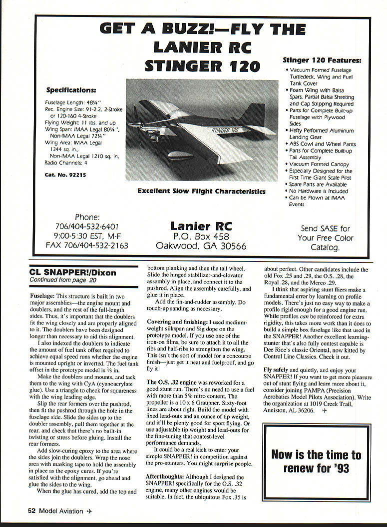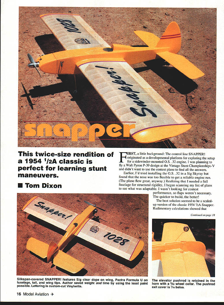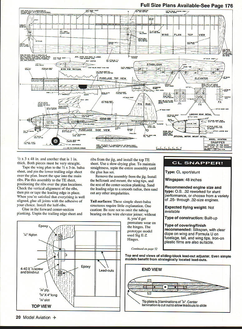 maneuvers FIRST little background control line SNAPPER originated developmental platfomi exploring setup sidewinder-mounted OS 32 engine planning fly Walt Pyron P-39 design Vintage Stunt Championships-V didnt want use contest plane find answers Earlier Id tried installing OS 32 Sig Skyray found nose too flexible get reliable engine run plane flew great anyway Realizing needed full fuselage structural rigidity began scanning list plans see what adaptable wasnt looking contest performance flaps werent necessary quicker build better best solution seemed scaledup version classic 1954 /2A Snapper Rudimentary calculations showed 16 Model Aviation esize rendition 1954 112A classic perfect learning stunt U Tom Dixon Continued page 18 Silkspan-covered SNAPPER features Sig clear dope wing Pactra Formula U onThe elevator pushrod retained fuselage tail wing tips Author saved weight time using least painthorn l32 wheel collar pushrod possible Lettering custom-cut Vinylwriteexit cover /i6 balsa doubling linear dimensions would increase wingspan 48 inches wing area approximately 460 square inches made quick trip photocopy shop 200% enlargement original plan work Its much easier trace parts scale up individually better maintain airfoil section added half-ribs between main ribs Otherwise original plan unchanged general doubled original wood sizes isnt essential cant find very lightweight -in balsa stabilizer example substituting medium-weight 3/~ balsa wont make difference few words about original Half-A Snapper order Designed George Millikin 1954 model kitted Southwestern Models Tulsa Oklahoma must have built five six kid using OK Cub Cox Babe Bee 049 engines Dacron lines plane flew comfortably inverted doing loops figure eights original plans brag Snapper capable square loops doubt its relatively heavy wing loading Southwestern Models version would have lacked enough efficiency square loops larger version can perform maneuverand everything else AMA patternas long dont overload paint Two different nose arrangements shown planthe test bed system beam mounts inverted engine test bed system built two cowls permit both side-mounted inverted engine installations rear base plate Great Planes engine mount exactly square handy feature allows engine mounted down up outall using same holes firewall Most modelers probably will use arrangement includes beam mounts inverted engine because its easier build intend try flying SNAPPER engine cylinder mounted inboard no other reason settle controversy about inboard versus outboard mounting profile models Construction As models its best begin making kit parts advocate buying two sets plans Use building guide cut up other paper templates trace parts onto wood time hassle saved worth few extra dollars Plan engine mounting method decide use Great Planes mount may need order Tower Hobbies since its unlikely available hobby shops Wing Cut in wing spar piece wider sheet saw sand sizeand dead straight use method because can difficult find straight strip wood Glue first doubler spar halves Add other spar half align assembly carefully straightedge add second doubler Like spar 1A6 x 2-in trailing edge TE pieces should cut 3-inwide sheet achieve straight edges Splice TE pieces together reinforce joints backup pieces 6 sheet Cut rib templates /i6 ply stack cut 16 full ribs Cut 12 ribs half-ribs trimming shown plan Use X-Acto knife #11 blade relieve center ribs spar doublers Trim ribs center planking well see plan dont have flat pinnable building board make temporary jig two pieces balsaone measuring Left simple sliding-block lead-out adjuster permits optimum trimming see sketchThe side-mounted engine snug cowl page 20 Right Modified Smith fuel tank Vents moved get tanklend SNAPPER very clean appearance volume limited space availableand decrease drag smooth flights 18 Model Aviation A Royal 28 modified stunt performance possible engine installations needle locking collet can tightened through large hole top cowl Right Wing ribs stack cut A6 ply template Continued paRe 20 Full Size Plans Available-See Page 176 /BA / /V WING PLAN TOP VIEW il74 -Th-~4i--V - - PLT S1AABBBLSABB ARBEiBALSABATE BBEB BOA PAABL B SALT TAABTASR TABS TASAA BAA BESA TASARA SALAA BABETATTSAA5 AAAWOaELBOSBAIT LACATESTAP ABA BATTAB LI STABILIZER BESEWINGRIBPATTERN FUSELAGE TOP VIEWELEVATOR SABABB __ASPUTAOTAPAESPBATAPBAUET T1BABBBAE P3 P2 B BALSA BABATLANDING GEAR DETAIL LB TOTSFUSELAGE VIEWTAL BALTS TAIL BAAOPTIONAl MOTOR MOUNT DETRL UDDEL AVIATIGN SNAPPER BIBS TIP PLATE S LSBASST AS BALSA ESBET ABABEE BY TANS BIXAN ABASE AAAABSI TEBTEB SBm B BAT BAT SALASTEBABACA55rBAINERT PLAN CAC EPUBACA ISAPLTPLSBLABPBAABASALSABAATOALLASEBB /2 X 3 x 48 another 1 thick Both pieces must very straight Tape wing plan /2 X 3-in balsa sheet pin lower trailing edge sheet over plan Insert spar main ribs Pin assembly TE sheet positioning ribs over plan locations Check vertical alignment ribs pin tape leading edge place youTre satisfied everything well aligned glue joints adhesive choice Install half-ribs Glue forward center-section planking Unpin trailing edge sheet Epoxy /4TANLlOflKFI Fr 4-40X1/2ScrewF blind nut FiIF F /G plyF 31GX4 long1F T/ slot TOP ViEW ribs jig install top TE sheet Use slow-drying glue maintain straightness repin entire assembly until glue has set Remove assembly jig Install bellcrank mount wing tips rest center-section planking Sand leading edge smooth radius sand out other irregularities Tail surfaces simple sheet-balsa structures require little explanation caution sure omit tubing bearing wire elevator joiner youd get premature wear hinges prototype model used Sig E-Z Hinges Continued poge 52 Wingspan 48 inches Recommended engine size type OS 32 reworked stunt performance choose Variety 25- through 32-size engines Expected flying weight available Type construction Built-up Type covering/finish recommended Silkspan clear dope wing Formula U fuselage tail wing tips Iron-on plastic films also suitable Top end views