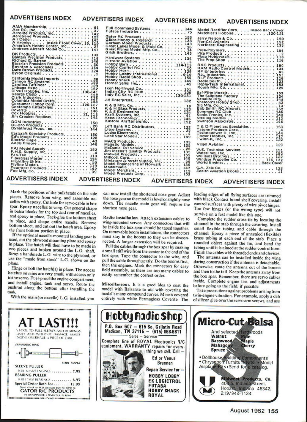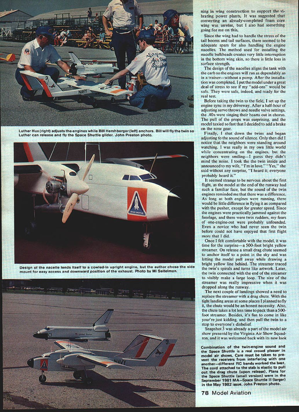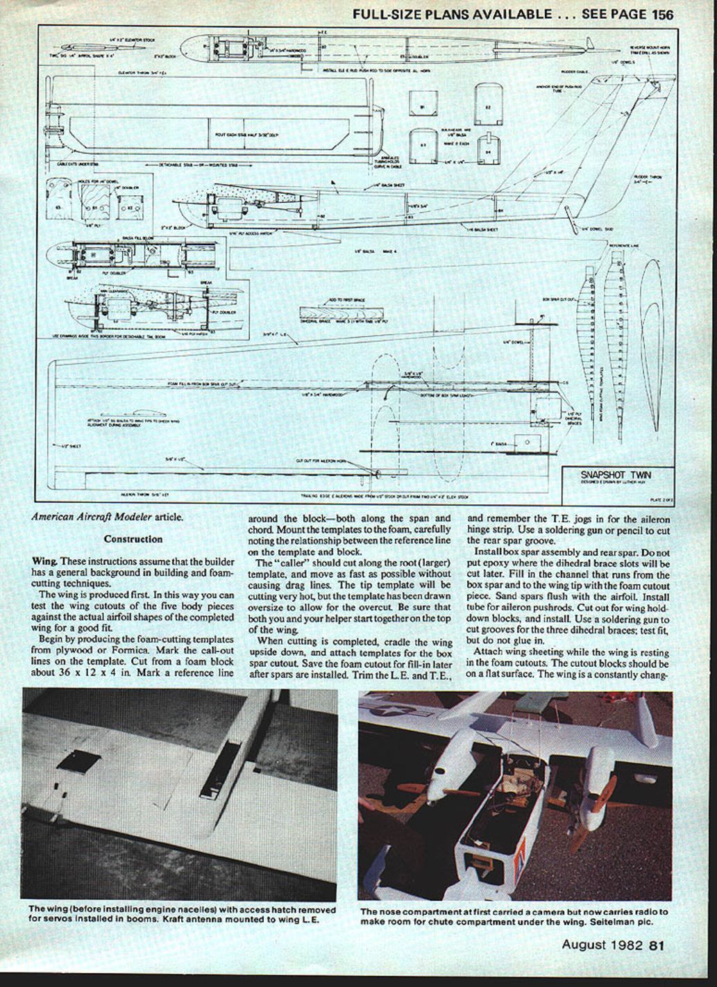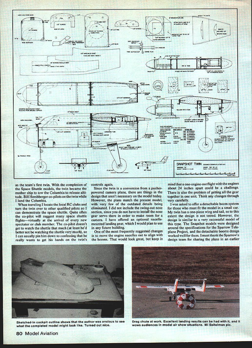 NO OCR TEXT NO OCR TEXT ning wing construction support vi- brating power plants suggested converting already-completed foam core wing unwise also something going Since wing handle stress tail booms tail surfaces seemed adequate spars also handling engine nacelles method used installing nacelle bulkheads creates very little interruption bottom wing skin little loss surface strength design nacelles aligns tank carb engines will run dependably trainerwithout pump After installa tion completed put model under great deal stress see add-ons would safe safe indeed ready real test Before taking twin field set up engine sync driveway After half-hour adjusting servo throws needle valve settings 40s singing hearts out chorus pull props surprising model taxied fast decided add brake nose gear Finally shut down twins began adjusting sound silence Only did notice neighbors standing around watching really own little world concentrating engines neighbors smilingI guess didnt mind noise took the twin inside announced wife Im love Yes said surprise heard everyone probably heard seemed strange nervous about first flight model end runway such familiar face sound twin engines reminded difference As long both engines running would little difference flying compared pusher except greater speed Since engines practically jammed against fuselage twin rudders fears one-engine-out probably unfounded novice never seen twin before could have enjoyed first flight did Once felt comfortable model time surprisea 500-foot bright yellow streamer release small drag chute seemed anchor itself point sky letting model pull away drawing bright yellow line behind streamer traced twins spirals turns like artwork Later twin connected end streamer visibly make large loop size streamer really impressive dropped along runway next couple landings showed need replace streamer drag chute tight landing areas some places planned fly chute would honest necessity Also chute takes lot less time pack 500foot streamer Besides its fun come like yourre just kidding pull twin stop everyones disbelief Snapshot 3 already part model air show presentd Virginia Air Show Squad ron welcomed back its new look Combination twin-engine sound Space Shuttle real crowd pleaser model air shows Care must taken pre vent receivers interfering anotherdifferent RC bands worked best cord attached stab elastic pull out drag chute upon release Plans Space Shuttle small version September 1981 MASpace Shuttle II larger May 1982 issue John Preston photo Luther Hux right adjusts engines Bill Hershbergerleft anchors Bill will fly twin Luther can release fly Space Shuttle glider John Preston photo Design nacelle lends Itself cowled-in upright engine author chose side mount easy access downward position exhaust Photo Ml Seitelman RUDDER flJNEC11NG CABLE 1/4 X 2 ELEVATOR IISCREW DISMANTLES STABIUZE- INTO BLOCK PUSHROD CASING __IOF HARDWOOD OPTiONAL TO ELEVATOR/ / NACELLE BLOCK///ROUT STABILIZER HALVES 3/32 DEEPI/B DOWELS STIFFEN JOINT 1/4 X 1/2 BALSA 1/8 BALSA SIDES 1/4 50 LONGERON 1/4 BALSATOP ____1A6BALSA BOTTOM TRIANGLE CORNER SlOCK 1/8 PLYWOOD SADDLE TO WING SERVO RODS TO AILERONS BOOM ATTACH SCREW TO HARDWOOD BLOCK 3/B11/2 AILERON SPAR 1/16 SHEET OVER FOAM WING 1/2 X 2 AILERON BLKDS STOCKENGINE MOUNTS F 1 1/8 PLYWOOD1/4 NYLONBEYOND BOOMSTIP BLOCK I/B X I/2HARDWOOOX 1/4 PLYACiOD BRACE Fl TO F3 MOUNTS IN NACELLE 2 1/2 WHEEL ONIF LG IS PUT THERE1/8 X 3/4 HARDWOOD 1/8 ALUMINUM GEAR3/BX BALSA LEDGESPAR THRUTO C/S CHOICE OF LG YOKE I/B BALSA SIDES AND BOTTOM UNDER FUSELAGE 3 MAIN WHEELS AND STEERING BELLCRANK bc 004 boo 0 0 0 Le aueesI,rear retLOAYWUOOFe SO WOWOFO -4aSoe#eO-OJTOF -SASS2 FrOtS 10 OCOt SWUT OMTSeOrF ooorrea ~ F FF000 SSCELO SOFarsLaOSaeS-earaacc.o Fa7 p10 "2--eas cleF 0501$ een SetsSeat00 maCse po goess/boo eaFIFOO La Toe j tree/os roe ears 010-FFarF,5ra0055 r-0 trrrsamar\ WI Se/oarF.a 0//NSf 110 0FsrFOee 00 negate erreste/ 7711 tale,a/leo c2 ______FOe Ff0555010 nears eoaoaeo aaaesrserrs Fe -MO 00 toSt VoerOse {reotSO 5r05 5005FOb tOF4ItO t15F0*e SNAPSHOT TWIN osarsaooereromrroa teams first twin completion Space Shuttle models twin became mother ship tow Columbia release alti tude Bill Hershberger co-pilots twin land Columbia traveling locate local RC clubs turn twin over other qualified pilots can demonstrate space shuttle Quite often co-pilot will suggest space shuttle flightsvirtually arrival new spectator club member co-pilot doesnet get watch shuttle much least hed better watching shuttle very much can usually pin him down confessing really wants get hands twinrs controls again Since twin conversion pusherpowered camera planer things design arent necessary model today However plans match present model very few outdated details being eliminated did include swing-out nose section since have install nose gear servo order make room camera have offered optional nacellemounted landing gear would plan use future building frequently suggested changes move engine nacelles out align booms would look great keep mind one-engine-out flight engines about 24 inches apart could challenge also problem getting gear together unit Think changes through very carefully asked offer detachable boom system must fit model small car twin has one-piece wing tail extent design tested Howeverr design similar very successful model type Snapshot models designed around specifications Sparrow Tele plane Project detachable booms design worked well must thank Sparrows design team sharing plans earlier Sketched-In cockpit outline shows author anxious see what completed model might look like Turned out nice Drag chute work Excellent landing results can it wows audiences model air show situations Mi Seitelman plc 80 Model Aviation FULL-SIZE PLANS AVAILABLE. SEE PAGE 156 American Aircraft Modeler article Construction Wing instructions assume builder has general background building foamcutting techniques wing produced first way can test wing cutouts five body pieces against actual airfoil shapes com