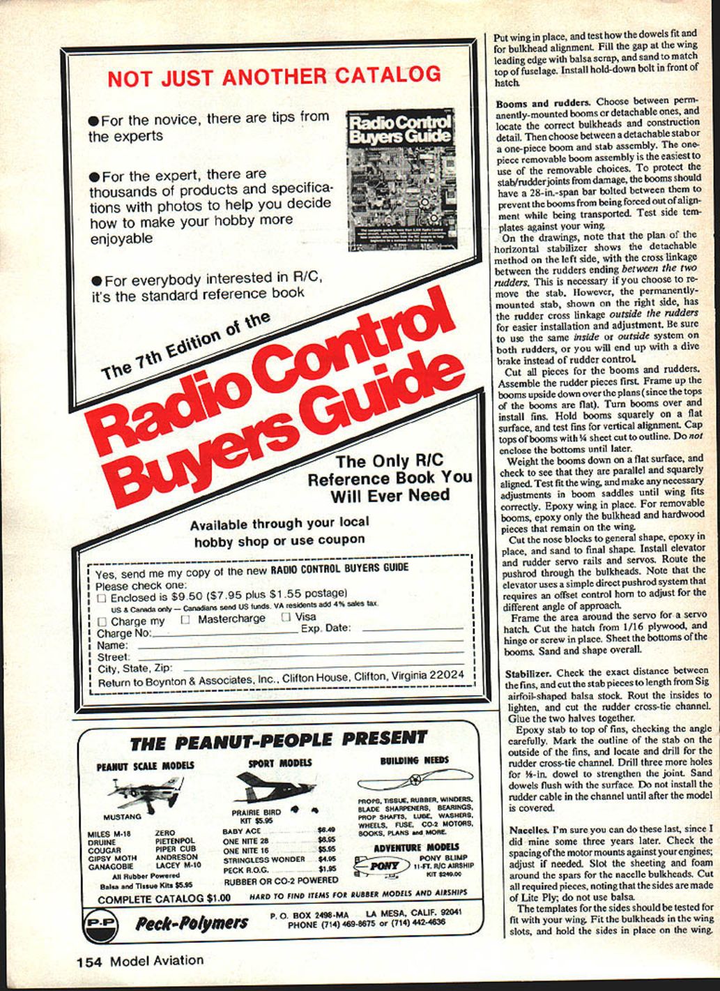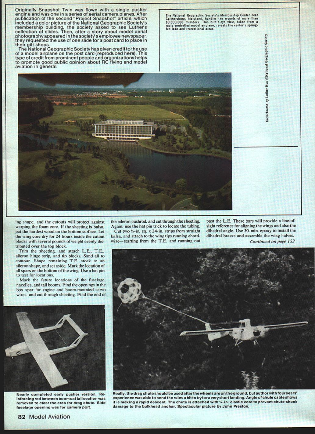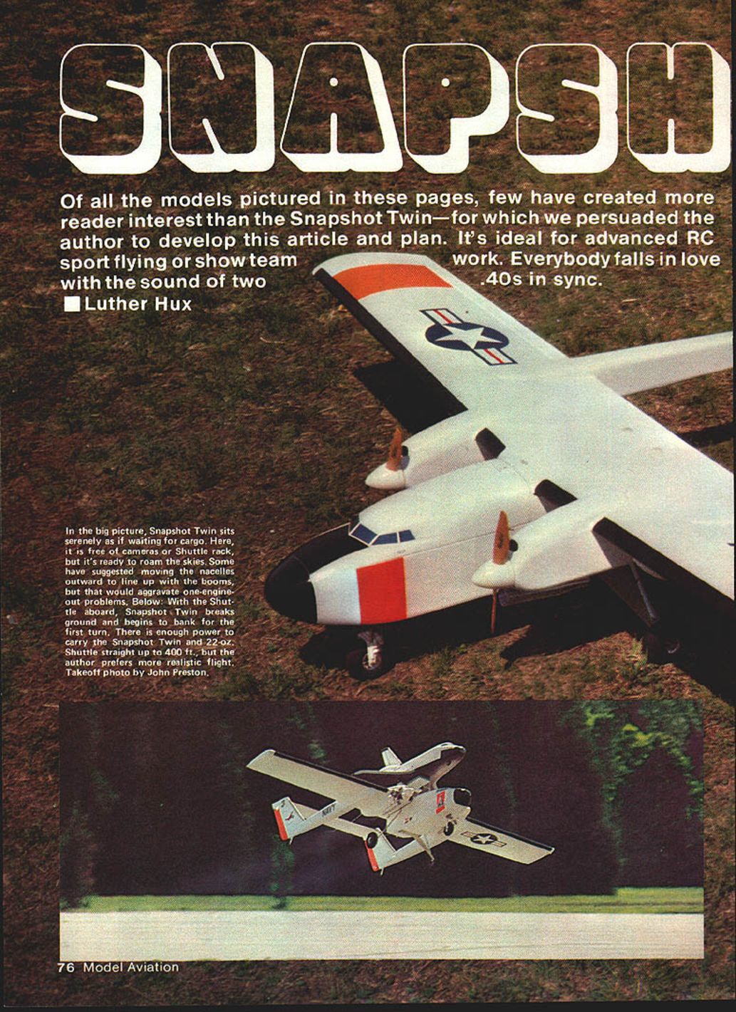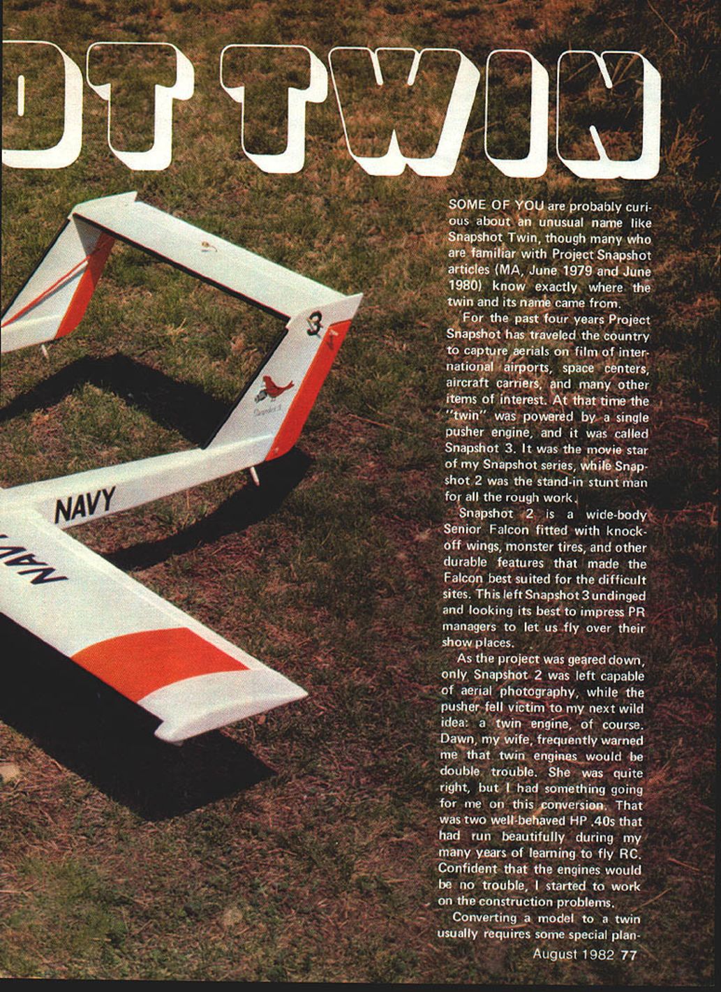 NO OCR TEXT NO OCR TEXT ning wing construction support vi- brating power plants suggested converting already-completed foam core wing unwise also something going Since wing handle stress tail booms tail surfaces seemed adequate spars also handling engine nacelles method used installing nacelle bulkheads creates very little interruption bottom wing skin little loss surface strength design nacelles aligns tank carb engines will run dependably trainerwithout pump After installa tion completed put model under great deal stress see add-ons would safe safe indeed ready real test Before taking twin field set up engine sync driveway After half-hour adjusting servo throws needle valve settings 40s singing hearts out chorus pull props surprising model taxied fast decided add brake nose gear Finally shut down twins began adjusting sound silence Only did notice neighbors standing around watching really own little world concentrating engines neighbors smilingI guess didnt mind noise took the twin inside announced wife Im love Yes said surprise heard everyone probably heard seemed strange nervous about first flight model end runway such familiar face sound twin engines reminded difference As long both engines running would little difference flying compared pusher except greater speed Since engines practically jammed against fuselage twin rudders fears one-engine-out probably unfounded novice never seen twin before could have enjoyed first flight did Once felt comfortable model time surprisea 500-foot bright yellow streamer release small drag chute seemed anchor itself point sky letting model pull away drawing bright yellow line behind streamer traced twins spirals turns like artwork Later twin connected end streamer visibly make large loop size streamer really impressive dropped along runway next couple landings showed need replace streamer drag chute tight landing areas some places planned fly chute would honest necessity Also chute takes lot less time pack 500foot streamer Besides its fun come like yourre just kidding pull twin stop everyones disbelief Snapshot 3 already part model air show presentd Virginia Air Show Squad ron welcomed back its new look Combination twin-engine sound Space Shuttle real crowd pleaser model air shows Care must taken pre vent receivers interfering anotherdifferent RC bands worked best cord attached stab elastic pull out drag chute upon release Plans Space Shuttle small version September 1981 MASpace Shuttle II larger May 1982 issue John Preston photo Luther Hux right adjusts engines Bill Hershbergerleft anchors Bill will fly twin Luther can release fly Space Shuttle glider John Preston photo Design nacelle lends Itself cowled-in upright engine author chose side mount easy access downward position exhaust Photo Ml Seitelman RUDDER flJNEC11NG CABLE 1/4 X 2 ELEVATOR IISCREW DISMANTLES STABIUZE- INTO BLOCK PUSHROD CASING __IOF HARDWOOD OPTiONAL TO ELEVATOR/ / NACELLE BLOCK///ROUT STABILIZER HALVES 3/32 DEEPI/B DOWELS STIFFEN JOINT 1/4 X 1/2 BALSA 1/8 BALSA SIDES 1/4 50 LONGERON 1/4 BALSATOP ____1A6BALSA BOTTOM TRIANGLE CORNER SlOCK 1/8 PLYWOOD SADDLE TO WING SERVO RODS TO AILERONS BOOM ATTACH SCREW TO HARDWOOD BLOCK 3/B11/2 AILERON SPAR 1/16 SHEET OVER FOAM WING 1/2 X 2 AILERON BLKDS STOCKENGINE MOUNTS F 1 1/8 PLYWOOD1/4 NYLONBEYOND BOOMSTIP BLOCK I/B X I/2HARDWOOOX 1/4 PLYACiOD BRACE Fl TO F3 MOUNTS IN NACELLE 2 1/2 WHEEL ONIF LG IS PUT THERE1/8 X 3/4 HARDWOOD 1/8 ALUMINUM GEAR3/BX BALSA LEDGESPAR THRUTO C/S CHOICE OF LG YOKE I/B BALSA SIDES AND BOTTOM UNDER FUSELAGE 3 MAIN WHEELS AND STEERING BELLCRANK bc 004 boo 0 0 0 Le aueesI,rear retLOAYWUOOFe SO WOWOFO -4aSoe#eO-OJTOF -SASS2 FrOtS 10 OCOt SWUT OMTSeOrF ooorrea ~ F FF000 SSCELO SOFarsLaOSaeS-earaacc.o Fa7 p10 "2--eas cleF 0501$ een SetsSeat00 maCse po goess/boo eaFIFOO La Toe j tree/os roe ears 010-FFarF,5ra0055 r-0 trrrsamar\ WI Se/oarF.a 0//NSf 110 0FsrFOee 00 negate erreste/ 7711 tale,a/leo c2 ______FOe Ff0555010 nears eoaoaeo aaaesrserrs Fe -MO 00 toSt VoerOse {reotSO 5r05 5005FOb tOF4ItO t15F0*e SNAPSHOT TWIN osarsaooereromrroa teams first twin completion Space Shuttle models twin became mother ship tow Columbia release alti tude Bill Hershberger co-pilots twin land Columbia traveling locate local RC clubs turn twin over other qualified pilots can demonstrate space shuttle Quite often co-pilot will suggest space shuttle flightsvirtually arrival new spectator club member co-pilot doesnet get watch shuttle much least hed better watching shuttle very much can usually pin him down confessing really wants get hands twinrs controls again Since twin conversion pusherpowered camera planer things design arent necessary model today However plans match present model very few outdated details being eliminated did include swing-out nose section since have install nose gear servo order make room camera have offered optional nacellemounted landing gear would plan use future building frequently suggested changes move engine nacelles out align booms would look great keep mind one-engine-out flight engines about 24 inches apart could challenge also problem getting gear together unit Think changes through very carefully asked offer detachable boom system must fit model small car twin has one-piece wing tail extent design tested Howeverr design similar very successful model type Snapshot models designed around specifications Sparrow Tele plane Project detachable booms design worked well must thank Sparrows design team sharing plans earlier Sketched-In cockpit outline shows author anxious see what completed model might look like Turned out nice Drag chute work Excellent landing results can it wows audiences model air show situations Mi Seitelman plc 80 Model Aviation FULL-SIZE PLANS AVAILABLE. SEE PAGE 156 American Aircraft Modeler article Construction Wing instructions assume builder has general background building foamcutting techniques wing produced first way can test wing cutouts five body pieces against actual airfoil shapes com