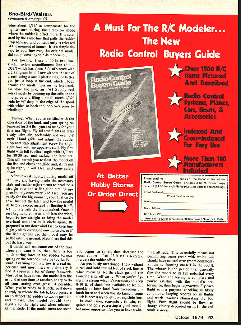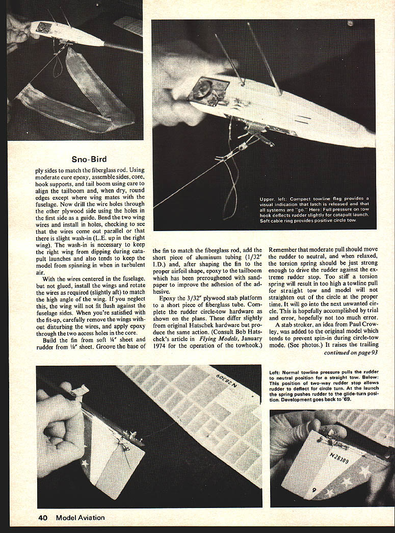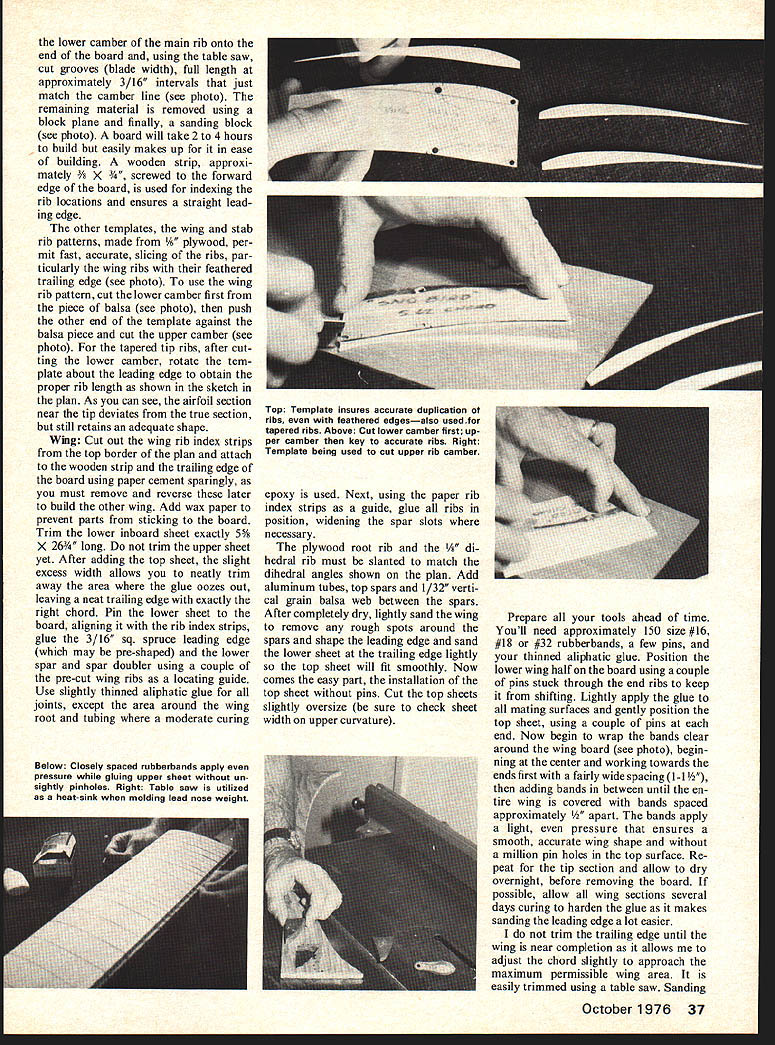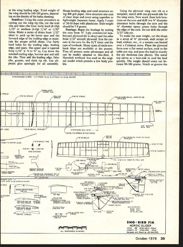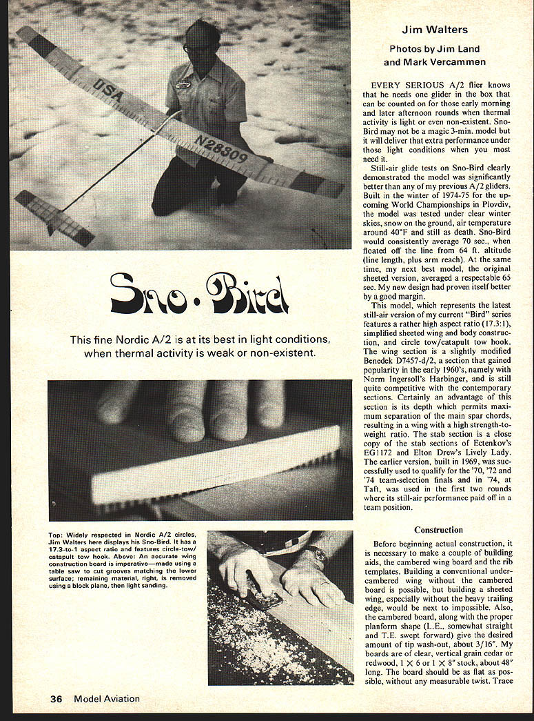 S fine Nordic A/2 its best light conditions thermal activity weak non-existent Jim Walters Photos Jim Land Mark Vercam men EVERY SERIOUS A/2 flier knows needs glider box can counted early morning later afternoon rounds thermal activity light non-existent Sno Bird may magic 3-mm model will deliver extra performance under light conditions need Still-air glide tests Sno-Bird clearly demonstrated model significantly better previous A/2 gliders Built winter 1974-75 up coming World Championships Plovdiv model tested under clear winter skies snow ground air temperature around 400F still death Sno-Bird would consistently average 70 sec floated off line 64 ft altitude line length plus arm reach same time next best model original sheeted version averaged respectable 65 sec new design proven itself better good margin model represents latest still-air version current Bird series features rather high aspect ratio 1731 simplified sheeted wing body construc tion circle tow/catapult tow hook wing section slightly modified Benedek D7457-d/2 section gained popularity early 1960s namely Norm Ingersolls Harbinger still quite competitive contemporary sections Certainly advantage section its depth permits maxi mum separation main spar chords resulting wing high strength-toweight ratio stab section close copy stab sections Ectenkovs EGl 172 Elton Drews Lively Lady earlier version built 1969 suc cessfully used qualify 70 72 74 team-selection finals 74 Taft used first two rounds its still-air performance paid off team position Construction Before beginning actual construction necessary make couple building aids cambered wing board rib templates Building conventional undercambered wing cambered board possible building sheeted wing especially heavy trailing edge would next impossible Also cambered board along proper planform shape LE somewhat straight TE swept forward give desired amount tip wash-out about 3/16 boards clear vertical grain cedar redwood 1 X 6 1 X 8 stock about 48 long board should flat pos sible measurable twist Trace 36 Model Aviation Top Widely respected Nordic A/2 circles Jim Walters displays Sno-Bird has 173-to-i aspect ratio features circle-tow catapult tow hook Above An accurate wing construction board imperativemade using table saw cut grooves matching lower surface remaining material right removed using block plane light sanding lower camber main rib onto end board using table saw cut grooves blade width full length approximately 3/16 intervals just match camber line see photo remaining material removed using block plane finally sanding block see photo board will take 2 4 hours build easily makes up ease building wooden strip approxi mately crewed forward edge board used indexing rib locations ensures straight lead ing edge other templates wing stab rib patterns made Y6 plywood per mit fast accurate slicing ribs par ticularly wing ribs feathered trailing edge see photo use wing rib pattern cut lower camber first piece balsa see photo push other end template against balsa piece cut upper camber see photo tapered tip ribs after cut ting lower camber rotate tem plate about leading edge obtain proper rib length shown sketch plan As can see airfoil section near tip deviates true section still retains adequate shape Wing Cut out wing rib index strips top border plan attach wooden strip trailing edge board using paper cement sparingly must remove reverse later build other wing Add wax paper prevent parts sticking board Trim lower inboard sheet exactly 5 X 26 long trim upper sheet yet After adding top sheet slight excess width allows neatly trim away area glue oozes out leaving neat trailing edge exactly right chord Pin lower sheet board aligning rib index strips glue 3/16 sq spruce leading edge may pre-shaped lower spar spar doubler using couple pre-cut wing ribs locating guide Use slightly thinned aliphatic glue joints except area around wing root tubing moderate curing epoxy used Next using paper rib index strips guide glue ribs position widening spar slots necessary plywood root rib edral rib must slanted match dihedral angles shown plan Add aluminum tubes top spars 1/32 verti cal grain balsa web between spars After completely dry lightly sand wing remove rough spots around spars shape leading edge sand lower sheet trailing edge lightly top sheet will fit smoothly Now comes easy part installation top sheet pins Cut top sheets slightly oversize sure check sheet width upper curvature Prepare tools ahead time Youll need approximately 150 size #16 #18 #32 rubberbands few pins thinned aliphatic glue Position lower wing half board using couple pins stuck through end ribs keep shifting Lightly apply glue mating surfaces gently position top sheet using couple pins end Now begin wrap bands clear around wing board see photo begin ning center working towards ends first fairly wide spacing 1- 1 adding bands between until en tire wing covered bands spaced approximately t bands apply light pressure ensures smooth accurate wing shape million pin holes top surface Re peat tip section allow dry overnight before removing board possible allow wing sections several days curing harden glue makes sanding leading edge lot easier trim trailing edge until wing near completion allows adjust chord slightly approach maximum permissible wing area easily trimmed using table saw Sanding October1976 37 Top Template insures accurate duplication ot ribs feathered edgesalso used tapered ribs Above Cut lower camber first up per camber key accurate ribs Right Template being used cut upper rib camber Below Closely spaced rubberbands apply pressure gluing upper sheet un sightly pinholes Right Table saw utilized heat-sink molding lead nose weight Sno-Bird leading-edge radius before joining panels permits easy inspection proper shape Attaching tip section cen ter section similar building handlaunch glider wing Just sand proper dihedral angles section double glue using moderate cure epoxy ali phatic Ambroid type glue Note bothersome pl