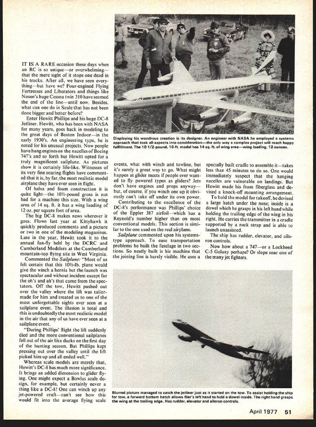 A sensation wherever flown Hewitt Phillips magnificent radio-control jetliner capable long soaring flights Photographs Bill Cavanaugh Cant say Hewitt Phillips saying eke just grinning joy unique soarer finds lift Cumberland high performance sailpianes dropping out sky using cradled transmitter neck strap Hewitt able launch unassisted 50 Model Aviation SOARING DC-8 Top page High towand flightthe huge foam-and-balsa model has uncanny realism Experienced glider modelers agree realistic looking machine ever grace glider meet Above fuselage separates two pieces easy transport IT IS RARE occasion days RC uniqueor overwhelming mere sight stops dead tracks After have seen thingbut have Four-engined Flying Fortresses Liberators things like Nosens huge Cessna twin 310 have seemed end lineuntil now Besides what can Scale has done bigger better before Enter Hewitt Phillips huge DC-8 Jetliner Hewitt has NASA years goes back modeling great days Boston Indoorin early 1930s An engineering type noted unusual projects Now people have hung engines nacelles Boeing 747s forth Hewitt opted truly magnificent sailplane As pictures show certainly life-like Witnesses its very fine soaring flights have comment ed far realistic model airplane have ever seen flight balsa foam construction quite lightthe l0/2-pound gross bad machine size wing area 14 sq ft has wing loading 12 oz per square foot area big DC-8 makes news wherever goes Flown last year Kittyhawk quickly produced comments picture two modeling magazines Late year Hewitt took annual fun-fly held DCRC Cumberland Modelers Cumberland mountain-top flying site West Virginia Commented Sailplane Most us felt certain 10-lb plane would give winch hernia launch spectacular incident except ohs ahs came spec tators Off tow Hewitt pushed out over valley lift tailormade him treated us unforgettable sights ever seen sailplane event illusion total undoubtedly realistic model air us have ever seen sailplane event During Phillips flight lift suddenly died conventional sailplanes fell out air like ducks first day hunting season Phillips kept pressing out over valley until lift picked him up ended well Whereas scale models merely Hewitts DC-8 has much significance brings added dimension glider fly ing might expect Bowlus scale de sign example certainly never thing like DC-8 can winch up jet-powered craftcant see would fit average flying scale events what winch towline its surely great way go What might happen glider meets people ever want ed fly powered types gliders Jets dont have engines props anyway course winch up obvi ously cant take off under its own power Contributing excellence DC-8s performance Phillips choice Eppler 387 airfoilwhich has Reynolds number higher conventional models section simi lar used real airplane Sailplane commented upon systemstype approach ease transportation problems built fuselage two sec tions So neatly built machine joining line barely visible uses specially built cradle assemble ittakes less 45 minutes would immediately suspect hanging nacelles vulnerable landings Hewitt made fiberglass de vised knock-off mounting arrangement hold model takeoff devised large hatch under nose inside dowel grasps left hand holding trailing edge wing right carries transmitter cradle supported neck strap able launch unassisted ship has rudder elevator aile ron controls Now about 747or Lockheed C-s Galaxy perhaps slope soar jet fighters April 1977 51 Displaying wondrous Creation IS its designer An engineer NASA employed systems approach took aspects considerationthe way complex project will reach happy fulfillment 101/2-pound 10-ft model has l4sq ft wing areawing loading 12 ounces Blurred picture managed catch jetliner just started tow assist holding ship tow forward bottom hatch allows fliers left hand hold dowel inside right hand grasps wing trailing edge Has rudder elevator aileron controls