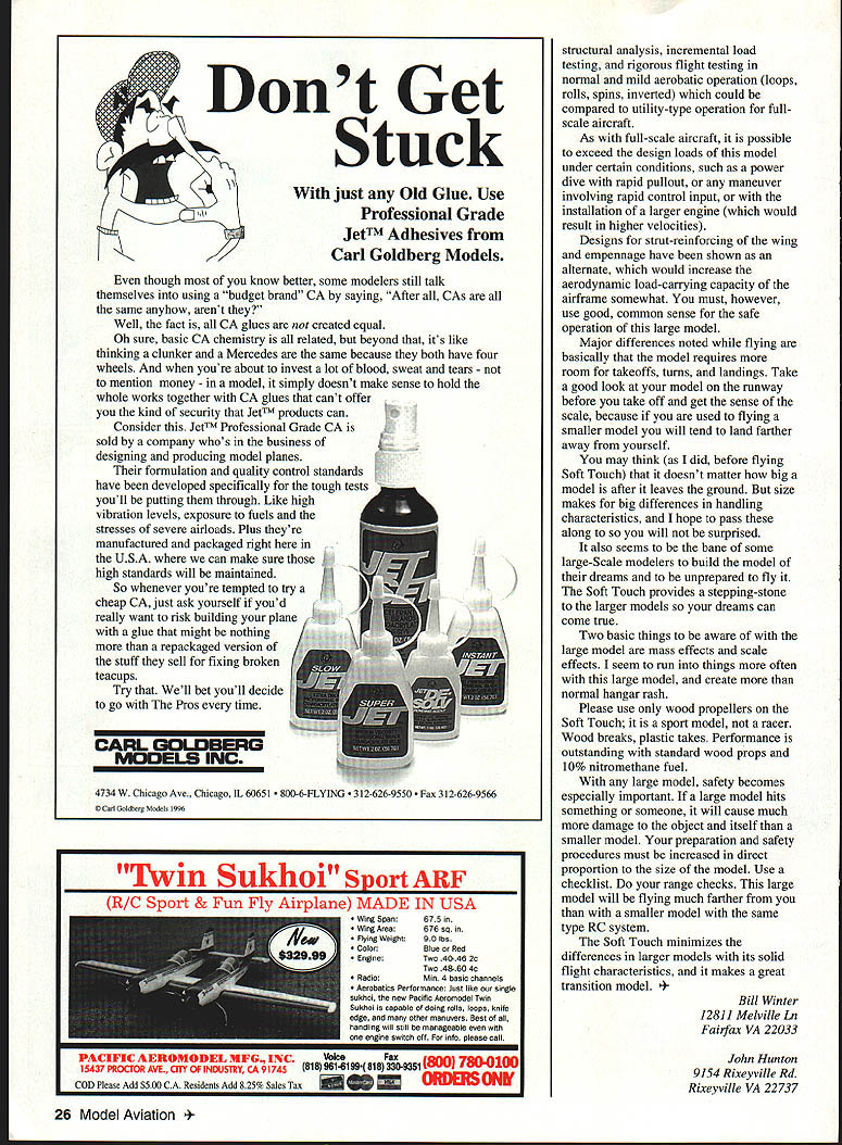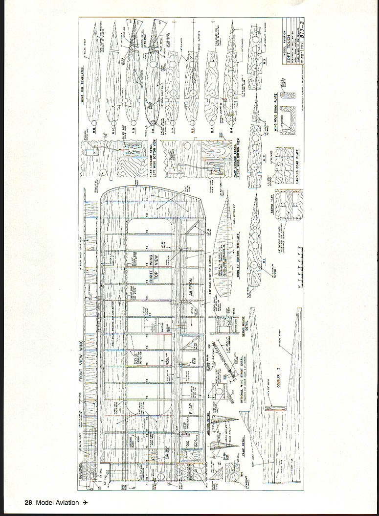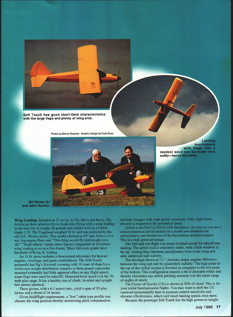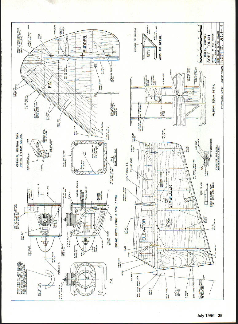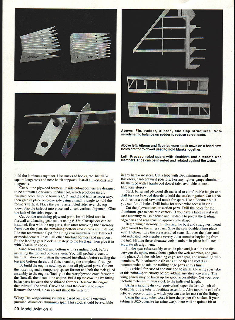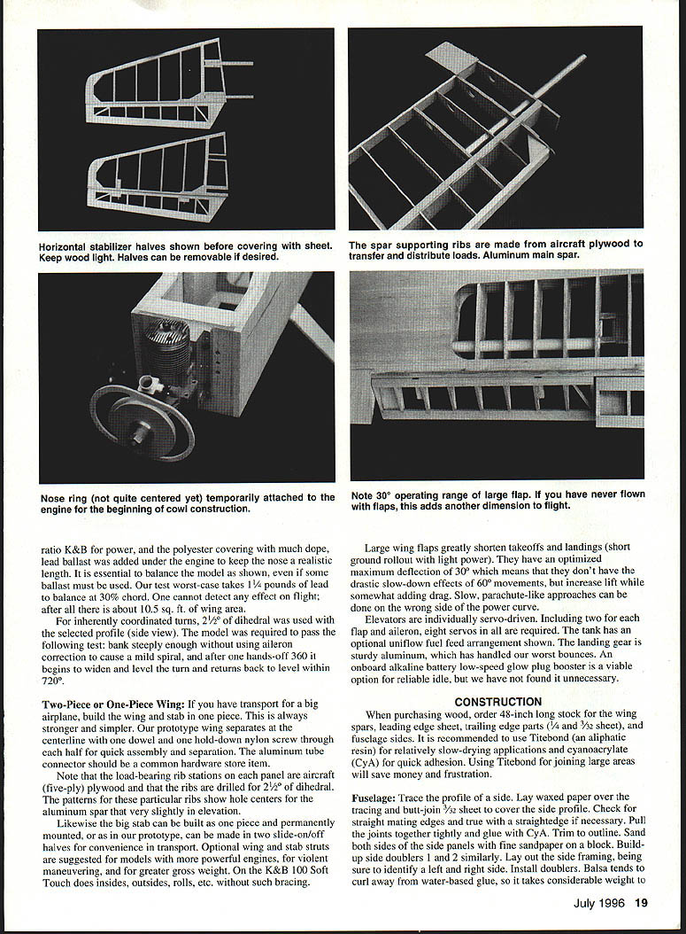 t 16 Model Aviation h has good short-field characteristics Lii large flaps plenty wing area Photos Bernie Stuecker Graphic Design Carts Kunz July1996 17 modest softly chosen w mud away underside touch class aving t tocrat ibond r model aerobatics Ancient shy away nations 18 Model Aviation ll Winte wheel wing ratio K&B power polyester covering much dope lead ballast added under engine keep nose realistic length essential balance model shown some ballast must used test worst-case takes 1 ds lead balance 30% chord cannot detect effect flight after about 105 sq ft wing area inherently coordinated turns 2 dihedral used selected profile side view model required pass following test bank steeply enough using aileron correction cause mild spiral after hands-off 360 begins widen level turn returns back level within 7200 Two-Piece One-Piece Wing have transport big airplane build wing stab piece always stronger simpler prototype wing separates centerline dowel bold-down nylon screw through half quick assembly separation aluminum tube connector should common hardware store item Note load-bearing rib stations panel aircraft five-ply plywood ribs drilled 2/2 dihedral patterns particular ribs show hole centers aluminum spar very slightly elevation Likewise big stab can built piece permanently mounted prototype can made two slide-onloff halves convenience transport Optional wing stab struts suggested models powerful engines violent maneuvering greater gross weight K&B 100 Soft Touch does insides outsides rolls etc such bracing Large wing flaps greatly shorten takeoffs landings short ground rollout light power have optimized maximum deflection 30 means dont have drastic slow-down effects 60 movements increase lift somewhat adding drag Slow parachute-like approaches can done wrong side power curve Elevators individually servo-driven Including two flap aileron eight servos required tank has optional uniflow fuel feed arrangement shown landing gear sturdy aluminum has handled worst bounces An onboard alkaline battery low-speed glow plug booster viable option reliable idle have found unnecessary CONSTRUCTION purchasing wood order 48-inch long stock wing spars leading edge sheet trailing edge parts sheet fuselage sides recommended use Titebond aliphatic resin relatively slow-drying applications cyanoacrylate CyA quick adhesion Using Titebond joining large areas will save money frustration Fuselage Trace profile side Lay waxed paper over tracing butt-join 3A2 sheet cover side profile Check straight mating edges true straightedge necessary Pull joints together tightly glue CyA Trim outline Sand both sides side panels fine sandpaper block Build up side doublers 1 2 similarly Lay out side framing being sure identify left right side Install doublers Balsa tends curl away water-based glue takes considerable weight July1996 19 Horizontal stabilizer halves shown before covering sheet spar supporting ribs made aircraft plywood Keep wood light Halves can removable desired transfer distribute loads Aluminum main spar Nose ring quite centered yet temporarily attached engine beginning cowl construction Note 300 operating range large flap have never flown flaps adds another dimension flight hold laminates together Use stacks books etc Install square longerons nose hatch supports Install verticals diagonals Cut out plywood formers Inside cutout corners designed cut one-inch Forstner bit produces nicely finished holes Slip-fit formers C D E trim necessary glue place onto side using small triangle hold formers vertical Place partly assembled sides over top view Slip tailpost place check vertical alignment Glue tails sides together Cut out remaining plywood parts Install blind nuts firewall landing gear mount using 6-32s Crosspieces can installed first top parts after removing assembly over plan remaining bottom crosspieces installed recommend CyA gluing crossmembers use Titebond model cement Install other fuselage formers members Fit landing gear block intimately fuselage glue 30-minute epoxy Sand across top bottom sanding block before installing top bottom sheets will probably want wait until after completing control installation before adding top bottom sheets finish-sanding completed fuselage build engine cowling cut out plywood parts Cut out nose ring temporary spacer former bolt tack glued assembly engine Tack-glue rear plywood cowl former firewall install engine Build up cowling fitting balsa parts between positioned formers Remove engine reinstall cowl Carve sand cowling shape Remove cowl clean up shape interior Wing The wing-joining system based use one-inch nominal diameter aluminum spar stock should available Above left Aileron flap ribs stack-sawn band saw Holes /a dowel used hold blanks together Left Preassembled spars doublers alternate web members Ribs can inserted rotated against webs hardware store Get tube 090 minimum wall thickness hard-drawn possible lighter-gauge aluminum fill tube hardwood dowel also available hardware stores Stack balsa plywood rib material comfortable height drill two 1/g wood dowels hold stacks together Cut rib outlines band saw notch spars Use Forstner bit can holes Drill holes servo wire access ribs Cut plywood center section parts Drill holes aluminum spar accurate centers have table saw will ease assembly use fence tilt-table precut leading edge parts rear spars approximate shape Begin wing assembly selecting best straightest wood hardwood wing spars Glue spar doublers place Titebond Lay preassembled spars flat over plans add indicated web members other member beginning tip Having alternate web members place facilitates accurate rib alignment Pin spar subassembly over plan just slip ribs between spars rotate against web member glue place Add sub-leading edge rear spar remaining web members vulnerable rib ends tip root recommended add trailing edge parts time critical ease construction install wing spar tube pointparticularly before adding sheet covering wing panels may taken up good