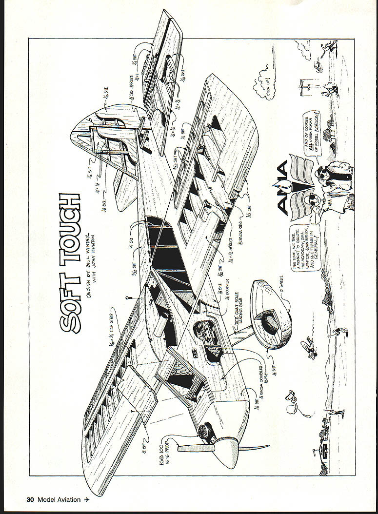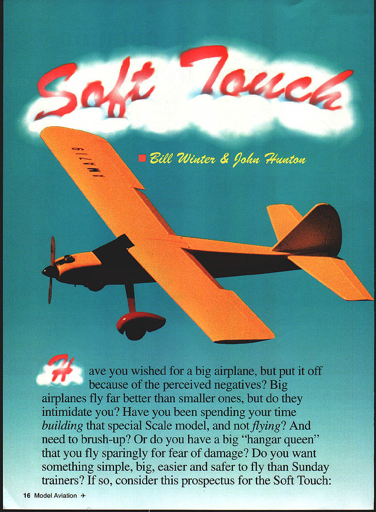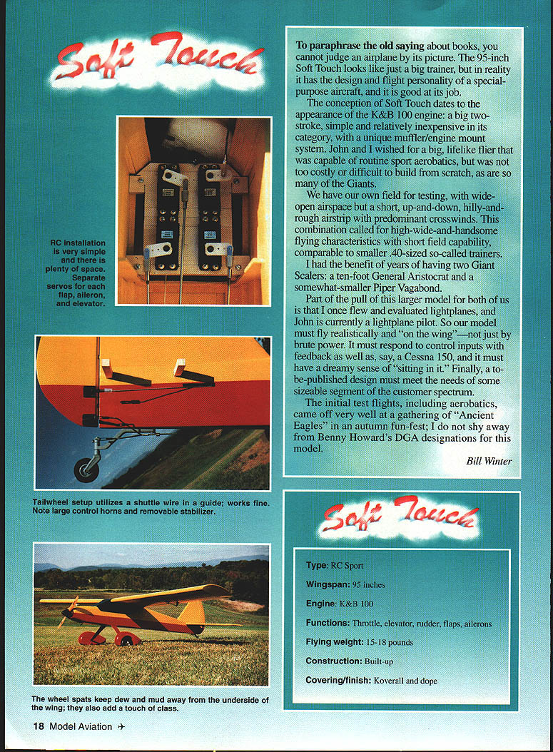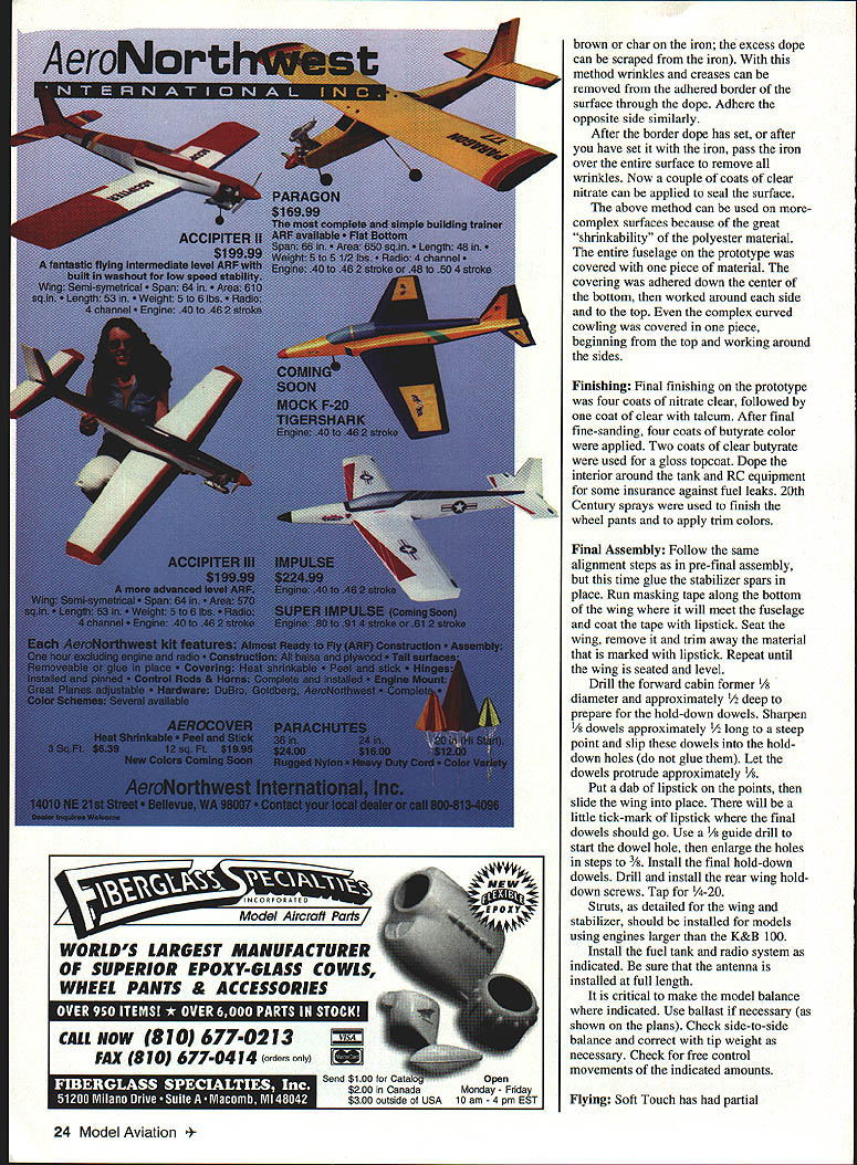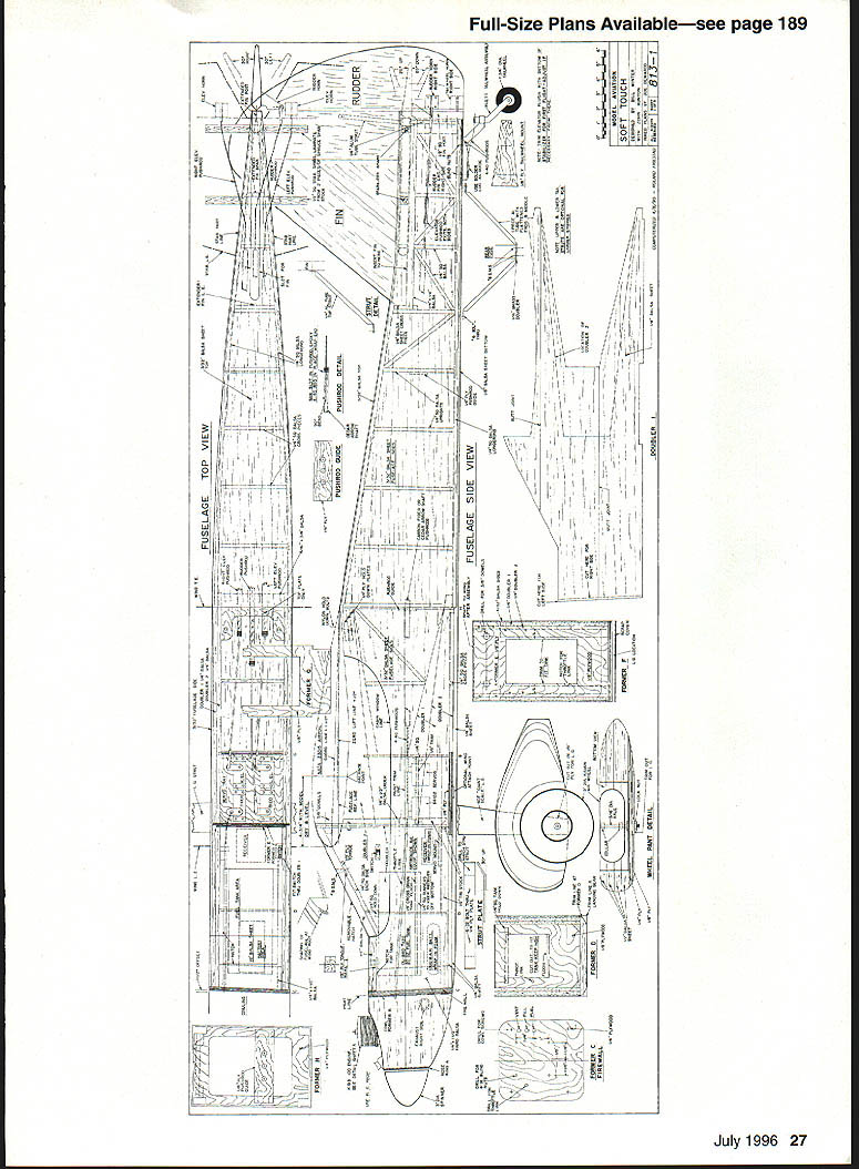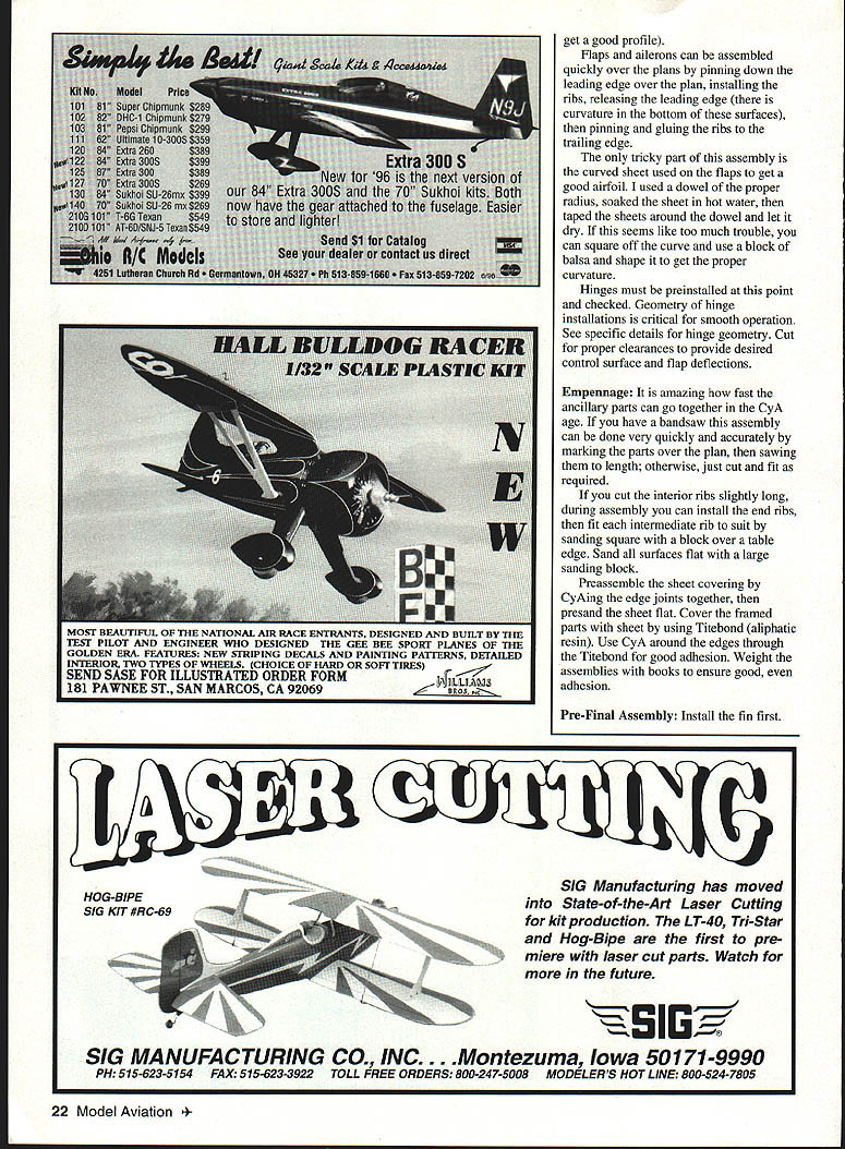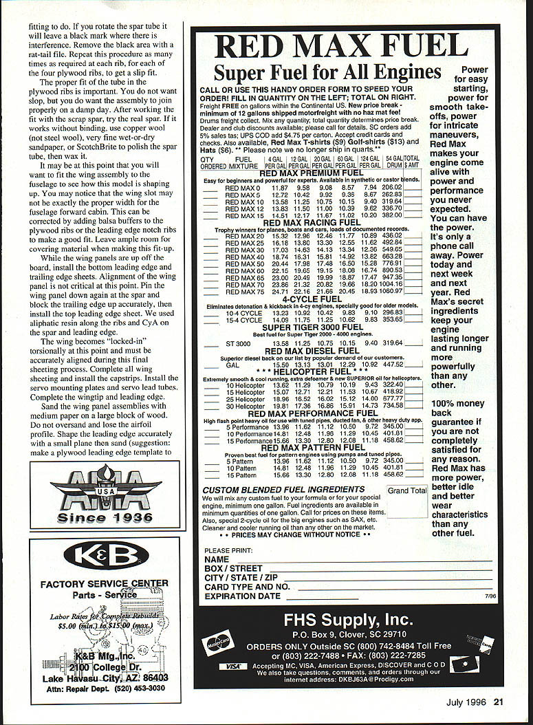 t 16 Model Aviation h has good short-field characteristics Lii large flaps plenty wing area Photos Bernie Stuecker Graphic Design Carts Kunz July1996 17 modest softly chosen w mud away underside touch class aving t tocrat ibond r model aerobatics Ancient shy away nations 18 Model Aviation ll Winte wheel wing ratio K&B power polyester covering much dope lead ballast added under engine keep nose realistic length essential balance model shown some ballast must used test worst-case takes 1 ds lead balance 30% chord cannot detect effect flight after about 105 sq ft wing area inherently coordinated turns 2 dihedral used selected profile side view model required pass following test bank steeply enough using aileron correction cause mild spiral after hands-off 360 begins widen level turn returns back level within 7200 Two-Piece One-Piece Wing have transport big airplane build wing stab piece always stronger simpler prototype wing separates centerline dowel bold-down nylon screw through half quick assembly separation aluminum tube connector should common hardware store item Note load-bearing rib stations panel aircraft five-ply plywood ribs drilled 2/2 dihedral patterns particular ribs show hole centers aluminum spar very slightly elevation Likewise big stab can built piece permanently mounted prototype can made two slide-onloff halves convenience transport Optional wing stab struts suggested models powerful engines violent maneuvering greater gross weight K&B 100 Soft Touch does insides outsides rolls etc such bracing Large wing flaps greatly shorten takeoffs landings short ground rollout light power have optimized maximum deflection 30 means dont have drastic slow-down effects 60 movements increase lift somewhat adding drag Slow parachute-like approaches can done wrong side power curve Elevators individually servo-driven Including two flap aileron eight servos required tank has optional uniflow fuel feed arrangement shown landing gear sturdy aluminum has handled worst bounces An onboard alkaline battery low-speed glow plug booster viable option reliable idle have found unnecessary CONSTRUCTION purchasing wood order 48-inch long stock wing spars leading edge sheet trailing edge parts sheet fuselage sides recommended use Titebond aliphatic resin relatively slow-drying applications cyanoacrylate CyA quick adhesion Using Titebond joining large areas will save money frustration Fuselage Trace profile side Lay waxed paper over tracing butt-join 3A2 sheet cover side profile Check straight mating edges true straightedge necessary Pull joints together tightly glue CyA Trim outline Sand both sides side panels fine sandpaper block Build up side doublers 1 2 similarly Lay out side framing being sure identify left right side Install doublers Balsa tends curl away water-based glue takes considerable weight July1996 19 Horizontal stabilizer halves shown before covering sheet spar supporting ribs made aircraft plywood Keep wood light Halves can removable desired transfer distribute loads Aluminum main spar Nose ring quite centered yet temporarily attached engine beginning cowl construction Note 300 operating range large flap have never flown flaps adds another dimension flight hold laminates together Use stacks books etc Install square longerons nose hatch supports Install verticals diagonals Cut out plywood formers Inside cutout corners designed cut one-inch Forstner bit produces nicely finished holes Slip-fit formers C D E trim necessary glue place onto side using small triangle hold formers vertical Place partly assembled sides over top view Slip tailpost place check vertical alignment Glue tails sides together Cut out remaining plywood parts Install blind nuts firewall landing gear mount using 6-32s Crosspieces can installed first top parts after removing assembly over plan remaining bottom crosspieces installed recommend CyA gluing crossmembers use Titebond model cement Install other fuselage formers members Fit landing gear block intimately fuselage glue 30-minute epoxy Sand across top bottom sanding block before installing top bottom sheets will probably want wait until after completing control installation before adding top bottom sheets finish-sanding completed fuselage build engine cowling cut out plywood parts Cut out nose ring temporary spacer former bolt tack glued assembly engine Tack-glue rear plywood cowl former firewall install engine Build up cowling fitting balsa parts between positioned formers Remove engine reinstall cowl Carve sand cowling shape Remove cowl clean up shape interior Wing The wing-joining system based use one-inch nominal diameter aluminum spar stock should available Above left Aileron flap ribs stack-sawn band saw Holes /a dowel used hold blanks together Left Preassembled spars doublers alternate web members Ribs can inserted rotated against webs hardware store Get tube 090 minimum wall thickness hard-drawn possible lighter-gauge aluminum fill tube hardwood dowel also available hardware stores Stack balsa plywood rib material comfortable height drill two 1/g wood dowels hold stacks together Cut rib outlines band saw notch spars Use Forstner bit can holes Drill holes servo wire access ribs Cut plywood center section parts Drill holes aluminum spar accurate centers have table saw will ease assembly use fence tilt-table precut leading edge parts rear spars approximate shape Begin wing assembly selecting best straightest wood hardwood wing spars Glue spar doublers place Titebond Lay preassembled spars flat over plans add indicated web members other member beginning tip Having alternate web members place facilitates accurate rib alignment Pin spar subassembly over plan just slip ribs between spars rotate against web member glue place Add sub-leading edge rear spar remaining web members vulnerable rib ends tip root recommended add trailing edge parts time critical ease construction install wing spar tube pointparticularly before adding sheet covering wing panels may taken up good