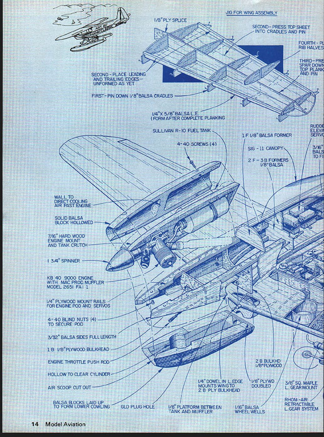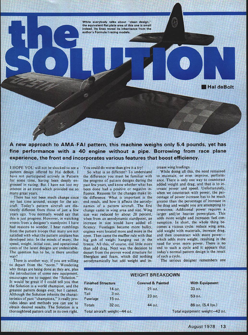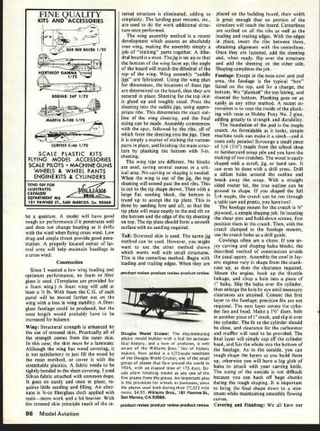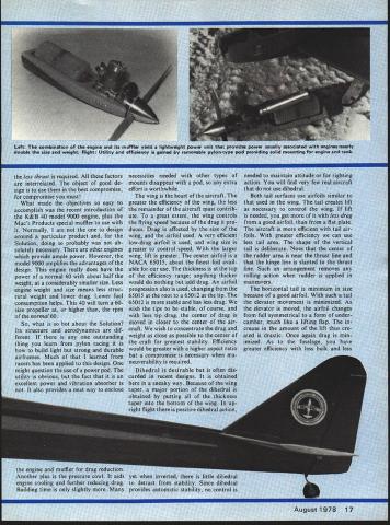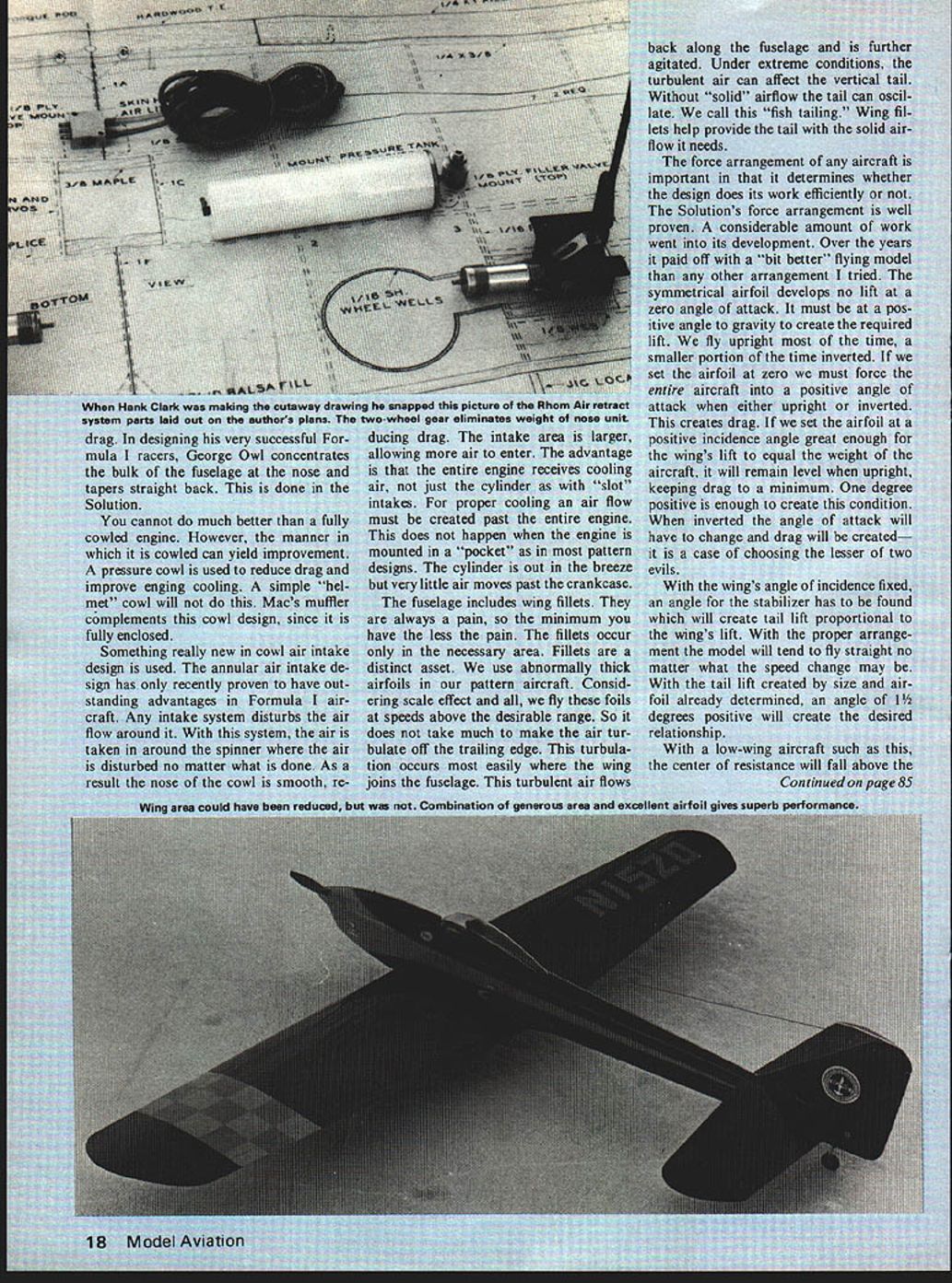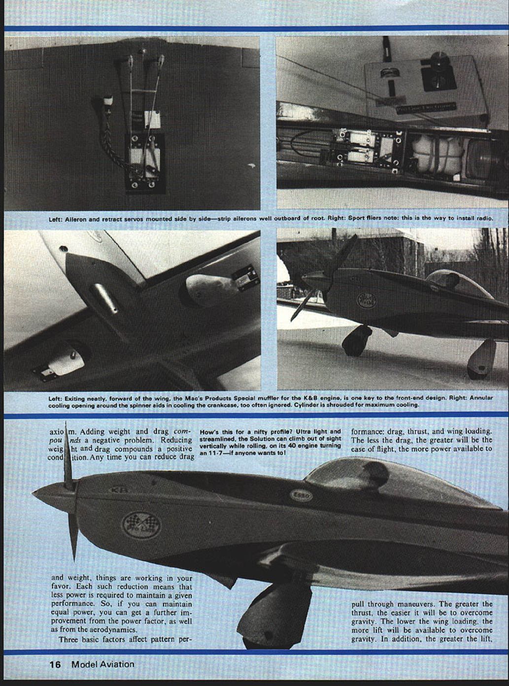 tcIi iheritmi udels altec aircr area about namic Si uld have ecame m re ifier ri rse ood hich I/B PLY 1 SA CRADLESI/4X 5/8 FORM AF SULLIVAN - FOR WING SE1DNDINTO Ck N N 2 F Va 1 34 SP 3/32 iR 1/A SCOOP / 1 1/4 HARD BALSA FIN L EDGE /4X 5/8 BALSA LEDGE AND SPAR 1/16 TOPAND BOTTOM PLANKING 1/16 BALSA RIBS ER 1/4 BALSA TIP CK AND RUDDER am ailerons w Special muffler fw aae too often ignore4axim s nifty proflielmance milned Solution rolling light t -if anyone wants less thrust required factors interrelated object goad de sign use best compromise compromise must What made objectives easy accomplish recent introduction K&B 40 model 9000 engine plus Macs Products special muffler use Normally am design around particular product Solution doing probably ab solutely necessary other engines provide ample power However model 9000 amplifies dvantagCs design engine really does have power normal 60 about half weight considerably smaller size Less engine weight site means less struc tural weight lower drag Lower fuel consumption helps 40 will turn 60size propeller higher rpm normal 60 So what hot about Solution Its structure ~rodynamics dif ferent outstanding thing learn pylon racing build light strong durable airframes Much learned racers has applied design might question use power pod utility obvious fact excellent power vibration absorber 15 also provides neat way enclose ww unit t ovabl pyic necessities needed other t mounts disappear pod effort worthwhile wing heart aircr2ft greater efficiency wing remainder aircraft must cc ute great extent wing cc flying speed because dra duces Drag affected si wing airfoil used very low-drag airfoil used greater control speed tne larger wing lift greater center airfoil NACA 65015 about finest foil avail able use thickness top efficiency range anything thicker would nothing add drag An airfoil progression also used changing 65015 root 65012 tip 65012 stable has less drag wish tips stable course less tip drag center drag moved closer center r craft wish concentrate dr weight close possible cei craft greatest stability Effic would greater higher aspect compromise necessary whe euverabiity required Dihedral desirable oft carded recent designs obt sneaky way Because th taper major portion dib obtained putting di intoi~ttntT wit dihec tail nenoerate Note tne center ot rudder area near thrust line hinge line slanted thrust line Such arrangement removes rolling action rudder applied maneuvers horizontal tail minimum size because good airfoil such tail elevator movement minimized As elevator moved airfoil changes full symmetrical m under Thp Hank Clark wE System parts laid omj ag de oIutIon cannot cowled engine F cowled pressure cowl enging will nc suiding craft Any Intl flow around taken around disturbed no r result nose Witi snapped picture th -wheel gear eliminates w ducing drag intake allowing air enter entire engine air just intakes proper i must created past does happen mounted pocket designs cylinder i very little air move fuselage inclu always pain have less pain necessary distinct asset use airfoils pattern ering scale effect ds above desira does take much m bulate off trailing tion occurs enqi joins fuselage w Combination along fusela d Under extrer nt air can affect solid airflow call fish Drovide tail rce arrangement dete toes its work el force arrai eveiopment bit better arrangement rfoil develop tack mu vity create lht time rero angle great equal will remain g enough erted iange choc wings angle inci& stabilizer has t ate tail lift p udel will tend speed ch lift created determined ositive will create 1p inter c NOW WHAT EVERYONES BEEN WAITING FOR BEELPAE L Please send complete utalog -Enclosed Si 00 refunded NAME first order Add 550 1st clam mail return add $100 handling other ADDRESS sophisticated piece lab quality equipment cycling ni-cd batteries Accurate dependable attractive --Automatic discharging recharging both re ceiver transmitter batteries simultaneously independently --Switch three different transmitter voltages 6V 96V 12V --Switch two different receiver charge rates 20 ma 50 ma --Four digit LED readout no mechanical clock motors --Modern design tight tolerance components sure total accuracy down lOb 1/10 minute --Available kit form assembled tested -I AF mi Efl1 interference can easily get point particularly true shielded wire making connection broken connections dirty have check out possibilities before making decision Ultimately simple solution keep trans mitter antenna collapsed much possible seek out locations alignments antenna pro duce least interference Several people have requested informa tion Art Cervenkas castoring nose wheel Ranger 42 ways get effect shown Fig 3 works need some pieces 3/32 ID brass tubing piece 3/32 OD music wire some 20gauge copper wire solder rubber band Keep letters coming folks makes feel wanted George Myers 70 Froelich Farm Rd Hicksville NY 11801 Solution/deBolt continued page 18 wing considering flat plate drag Drag also increases square speed As speed increases drag wing rises quickly rest craft As far maintaining straight flight over Now Hobbypoxy PFX H85 Polyester Filler compound white can great level ing dips dents wrin kies chips other im perfections fiberglass parts brilliant white polyester resin paste form non-sagging fast setting feathers out zero thickness peeling flaking Fuel-proof can filed drilled sanded Price $275 per pint catalyst Formula 3H53 Thixo tropic Epoxy Glue stays put no sag runs dips vertical surfaces Its controlled viscosity allows applied vertical surfaces thin edges other prob lem areas other glues just run off Price $450 per set two 4-az cans Pettit Paint Co 36 Pine St Borough Rockaway NJ 07866 product review product review product review wide speed range concerned need something compensate shift center drag caused wing accomplished placing line thrust above center resistance Thrust decreases proportionally speed action used counteract wing drag also proportional speed obtain optimu