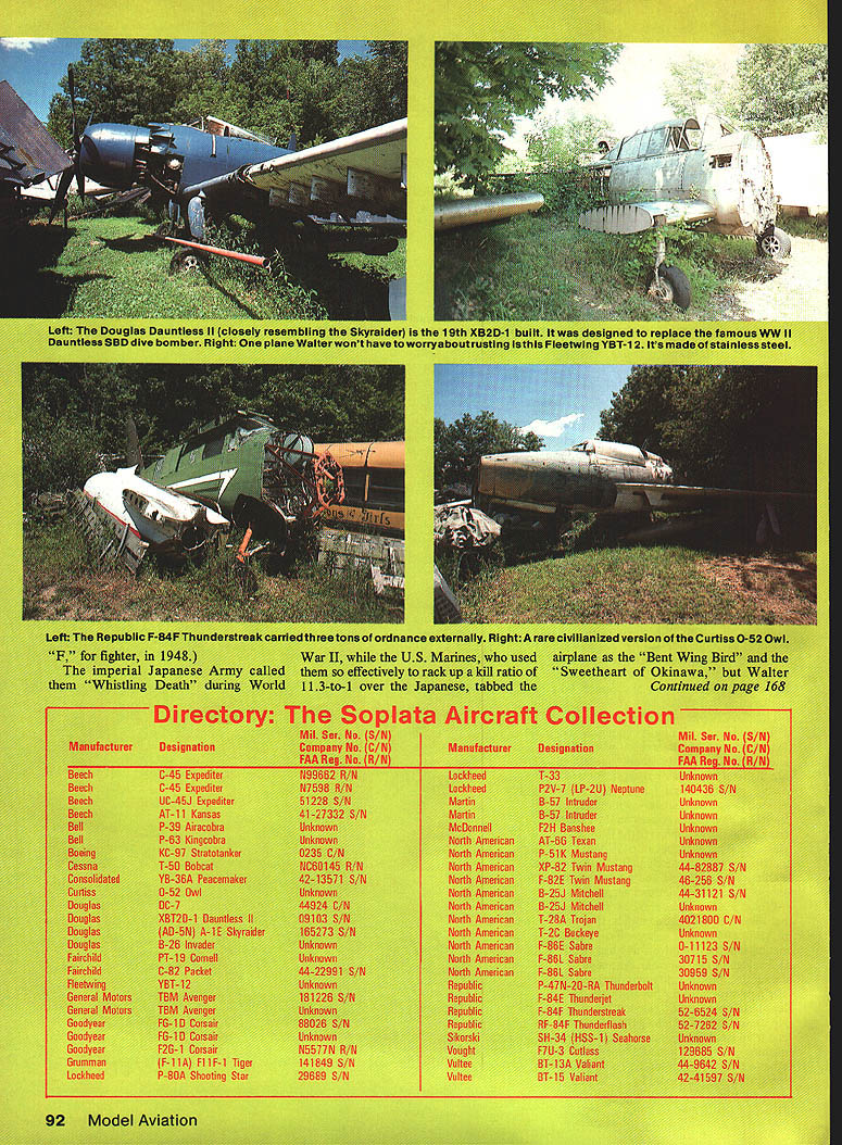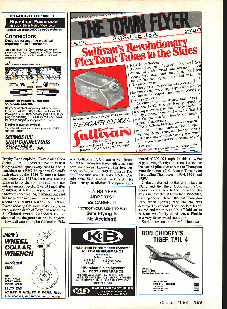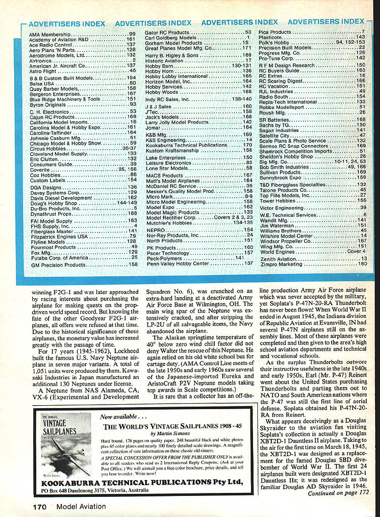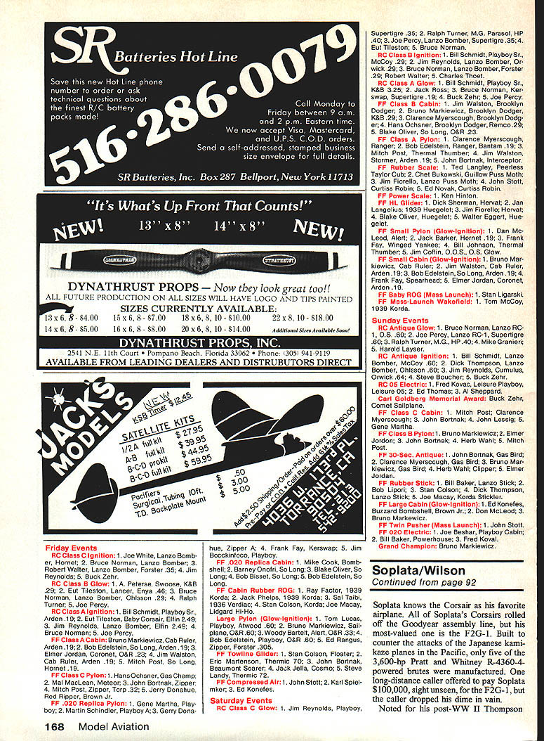 NO OCR TEXT NO OCR TEXT NO OCR TEXT NO OCR TEXT NO OCR TEXT NO OCR TEXT 2541 N E 11th Court ano Beach Florida 33062 e 305 941-9119 AVAILABLE FROM LEADING DEALERS AND DISTRUBUTORS flTR1CT Friday Events RC Class C Ignition 1 Joe White Lanzo Bomb er Hornet 2 Bruce Norman Lanzo Bomber 3 Robert Walter Lanzo Bomber Forster 35 4 Jim Reynolds 5 Buck Zehr RC Class 8 Glow 1 Peterse Swoose K&B 29 2 Eut Tileston Lancer Enya 46 3 Bruce Norman Lanzo Bomber Ohlsson 29 4 Ralph Turner 5 Joe Percy RC ClassA Ignition 1 Bill Schmidt PlayboySr Arden 19 2 Eut Tileston Baby Corsair Elfin 249 3 Jim Reynolds Lanzo Bomber Elfin 249 4 Bruce Norman 5 Joe Percy FF ClassACabin Bruno Markiewicz Cab Ruler Arden 19 2 Bob Edeistein So Long Arden 19 3 Elmer Jordan Coronet O&R 23 4 Jim Waiston Cab Ruler Arden 19 5 Mitch Post So Long Hornet 19 FF Class C Pylon 1 Hans Ochsner Gas Champ 2 Mal MacLean Meteor 3 John Bortnak Zipper 4 Mitch Post Zipper Torp 32 5 Jerry Donahue Red Ripper Brown Jr FF 020 Replica Pylon 1 Gene Martha Play boy 2 Martin Schindler Playboy 3 Gerry Donshue Zipper 4 Frank Fay Kerswsp 5 Jim Bocckinfoco Playboy FF 020 Replica Cabin 1 Mike Cook Bomb shell 2 Barney Onotri So Long 3 Blake Oliver So Long 4 Bob Bisset So Long 5 Bob Edeistein So Long FF Cabin Rubber ROG 1 Ray Factor 1939 Korda 2 Jack Phelps 1939 Korda 3 Sal Taibi 1936 Verdiac 4 Stan Colson Korda Joe Macay Lidgard Hi-Ho Large Pylon Glow-Ignition 1 Tom Lucas Playboy Atwood 60 2 Bruno Markiewicz Sail plane O&R 60 3 Woody Bartelt Alert O&R 33 4 Bob Edeistein Playboy O&R 60 5 Ed Rangus Zipper Forster 305 FF Towline Glider 1 Stan Colson Floater 2 Eric Martenson Thermic 70 3 John Bortnak Beaumont Soarer 4 Jack Jells Cosmo 5 Steve Landy Thermic 72 FF Compressed Air 1 John Stott 2 Karl Spiel mker 3 Ed Konetes Saturday Events RC Class C Glow 1 Jim Reynolds Playboy Supertigre 35 2 Ralph Turner MG Parasol HP 40 3 Joe Percy Lanzo Bomber Supertigre 35 4 Eut Tileston 5 Bruce Norman RC Class B Ignition 1 Bill Schmidt PlayboySr McCoy 29 2 Jim Reynolds Lanzo Bomber Orwick 29 3 Bruce Norman Lanzo Bomber Forster 29 Robert Walter 5 Charles Thoet RC Class Glow 1 Bill Schmidt Playboy Sr K&B 325 2 Jack Ross 3 Bruce Norman Ker swap Supertigre 19 4 Buck Zehr 5 Joe Percy FF Class B Cabin 1 Jim Waiston Brooklyn Dodger 2 Bruno Markiewicz Brooklyn Dodger K&B 29 3 Clarence Myerscough Brooklyn Dodg er 4 Hans Ochaner Brooklyn Dodger Remco 29 5 Blake Oliver So Long O&R 23 FF Class Pylon 1 Clarence Myerscough Ranger 2 Bob Edeistein Ranger Bantam 19 3 Mitch Post Thermal Thumber 4 Jim Waiston Stormer Arden 19 5 John Bortnak Interceptor FF Rubber Scale 1 Ted Langley Peerless Taylor Cub 2 Chet Bukowaki Guillow Puss Moth 3 Jim Fiorello Lanzo Puss Moth 4 John Stolt Curtiss Robin 5 Ed Novak Curtiss Robin FF Power Scale 1 Ken Hinton FF HL Glider 1 Dick Sherman Hervat 2 Jan Langelius 1939 Huegelet 3 Jim Fiorello Hervat 4 Blake Oliver Huegelet 5 Walter Eggert Hue gelet FF Small Pylon Glow-Ignition 1 Dan Mc Leod Alert 2 Jack Barker Hornet 19 3 Frank Fay Winged Yankee 4 Bill Johnson Thermal Thumber 5 Jim Coffin 0OS OS Glow FF Small Cabin Glow-Ignition 1 Bruno Mar kiewicz Cab Ruler 2 Jim Waiston Cab Ruler Arden 19 3 Bob Edeistein So Long Arden 19 4 Frank Fay Spearhead 5 Elmer Jordan Coronet Arden 19 FF Baby ROG Mass Launch 1 Stan Ligarski FF Mass-Launch Wakefield 1 Tom McCoy 1939 Korda Sunday Events RC Antique Glow 1 Bruce Norman Lanzo RC 1 OS 60 2 Joe Percy Lanzo RC-1 Supertigre 60 3 Ralph Turner MG HP 40 4 Mike Granieri 5 Harold Layser RC Antique Ignition 1 Bill Schmidt Lanzo Bomber McCoy 60 2 Dick Thompson Lanzo Bomber Ohlsson 60 3 Jim Reynolds Cumulus Orwick 64 4 Steve Boucher 5 Buck Zehr RC 05 Electric 1 Fred Kovsc Leisure Playboy Leisure 05 2 Ed Thomas 3 Al Sheppard Carl Goldberg Memorial Award Buck Zehr Comet Sailplane FF Class C Cabin 1 Mitch Post Clarence Myerscough 3 John Bortnak 4 John Lessig 5 Gene Martha FFClassBPylon1 BrunoMarkiewicz2 Elmer Jordon 3 John Bortnak 4 Herb WahI 5 Mitch Post FF30-Sec Antique 1 John Bortnak Gas Bird 2 Clarence Myerscough Gas Bird 3 Bruno Mar kiewicz Gas Bird 4 Herb Wahi Clipper 5 Elmer Jordan FF Rubber Stick 1 Bill Baker Lanzo Stick 2 Bob Lipori 3 Stan Colson 4 Dick Thompson Lanzo Stick 5 Joe Macay Korda Stickler FF Large Cabin Glow-Ignition 1 Ed Konefes Buzzard Bombshell Brown Jr 2 Don McLeod 3 Bruno Markewicz FF Twin Pusher Mass Launch 1 John Stott FF 020 Electric 1 Joe Beshar Playboy Cabin 2 Bill Baker Powerhouse 3 Fred Koval Grand Champion Bruno Markiewicz Soplata/Wilson Continued page 92 Soplata knows Corsair favorite airplane Soplatas Corsairs rolled off Goodyear assembly line most-valued F2G-1 Built counter attacks Japanese kami kaze planes Pacific five 3600-hp Pratt Whitney R-4360-4powered brutes manufactured long-distance caller offered pay Soplata $100000 sightunseen forthe F2G-lbut caller dropped dime vain Noted post-WW II Thompson 168 Model Aviation DYNATHRUST PROPS look great too! ALL FUTURE PRODUCTION ON ALL SIZES WILL HAVE LOGO AND TIPS PAINTED SIZES CURRENTLY AVAILABLE 13x 68- 40015 x6 8- $70018x 6810 -$100022 x8 10- $1800 14 x 6 8 $5 0016 x 6 8 $80020 X 6 810 $1400Additional SizesArodoble Soon Connectors Designed anything electrical requiring quick disconnects Ideal Power Pock Connector electric planes cars boats Designed o high vibrafion environment Cycled ten thousand times elecfrical failure dJ Anderson Power Products Inc SORRY NO PERSONAL CHECKS OR COD ORDERS Only certified checks money orders accepfed Minimum order $1000 torthree packages ot4 Powerpoles $300 per package plus $100 ship ping handling CT residents add 75% sales fax Prices sublect fo change nof ice Dealer Inquiries Invited further informafion dealer prices send SASE Bus Card SERMOS RIC SNAP CONNECTORS Cedar Corners Station Box 16787 Stamford CT 06905 F LN NewS Service americas foremost sun products designer of model parts acces qu~at FlexTank son nnounced th fuel tank sonies 1uSt squeeze-to revolutionary proven winner"is ~FlexTank assures modelers perfect fit because C