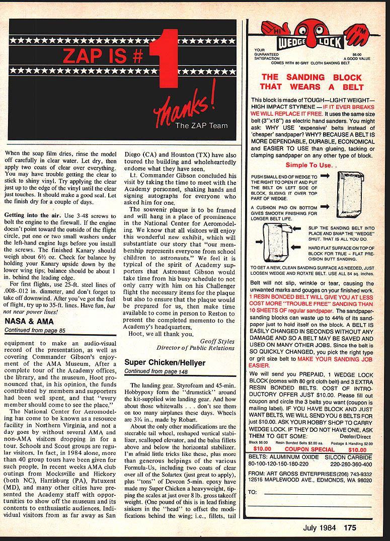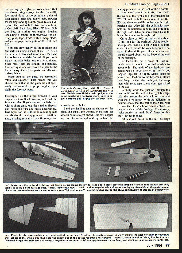Sorta Kanarini plan ahoyd WHEN SAW Top Flites Hot Kanary RC model knew cute Control Line model possible prototype beginning Control Line scratch builder has simple straight lines two wings build onto fuselage cabane racy looks After doing some research Bill Warwicks full-size racing Canary decided simplify some areas order make model easy build notably around nose Also adjusted some di mensions order waste little balsa possible result looks quite lot like Canary dubbed Sorta Kanary youve built two balsa profile pilots engine Bo kits itching try something ambitious model may just right best way get started study photos plan instructions until know details heart Materials needed sheet 6 X 3 x 36 medium balsa wings sheet /16 X 4 x 36 medium balsa fu selage tail piece /s ply firewall bellcrank mount three Popsicle craft sticks wing struts tail joiner piece A6 X 36-in music wire landing gear piece 045 x 36-in music wire pushrod piece Left Most fuselage tail parts can cut balsa sheet youll need some scrap fuselage doublers wheel pants Right Mark fuselage sides firewall 52 B3 bellcrank mount Cut pushrod hole 54 per plan picture 76 Model Aviation dow p rice feel 025 x 36-in music wire lead-outs two 1-in-dia wheels aluminum hubs /2-in-dia wheel aluminum hub tail wheel 2-in bellcrank four 3-48 x 1-in screws blind mounting nuts engine mount 4-40 x 1-in screw nut bellcrank mount two 2-56 x /2-in screws nuts securing elevator horn small ele vator horn about 12 Dacron nylon string monofilament fishing line sol der washers pennies wing tip weight Spackling compound ding filling scraps pantyhose fiberglass re inforcement some soft copper wire bind landing gear glue choice use slow-drying epoxy firewall fuel-proof dope polyurethane paint choice clear color baby powder making sanding sealer pressure-stick vi nyl other materials trim numbers Cox 049 Babe Bee Black Widow Gol den Bee similar engine brushes including couple throwaways ep oxy pins tape knife sharp blade garnet paper grits 80 180 320 can draw nearly fuselage tail parts single sheet A6 X 4 x 36 balsa Youll also need some scrap V16 balsa doublers around firewall dont have 4-in-wide balsa use two 3-in sheets Since lines straight parallel transferring dimensions plan balsa easy Cut parts carefully sharp blade Make sure parts assembled fair square means should check parts cut accu rately assembled proper angles espe cially fuselage parts Fuselage Use larger firewall engine Cox Black Widow mark fuselage sides engine Babe Bee short tank use smaller firewall mark fuselage sides accordingly Drill holes 3-48 blind mounting nuts also landing gear wire Install nuts making sure fit snugly squarely holes Bend landing gear shown plan install wheels Make sure wheels point straight ahead Use soft copper wire Dacron nylon string bind Full-Size Plan Pages 90-91 landing gear wire back firewall Using soft pencil felt-tip pen mark inside right side fuselage B2 B3 bellcrank mount Glue B2 B3 wing saddle doublers right fuselage side Also drill bellcrank screw hole bellcrank mount glue right side. Glue some scrap balsa brace motint right side Cut piece 045-in music wire about 10 long pushrod Using needlenose pliers make neat Z-bend both ends Z should fit bellcrank other Z should fit elevator horn should extend about A6 beyond end fuselage lead-outs cut piece 025-in music wire about 10 another about 9 ends lead-outs staggered line clips wont get tangled together flight Make loops secure lead-out bellcrank Dont bend loops other ends yet wrap some tape dont get poked eye Carefully work pushrod through hole B3 slot right fuselage side secure bellcrank mount 4-40 screw bellcrank neutral check part Z will fit elevator horn extends about A6 beyond end fuselage necessary make another pushrod Dont forget glue 4-40 nut place Cut lead-out holes left fuselage Left Make sure pushrod correct length before gluing left fuselage side place Note scrap belicrank mount support wing saddle doublers fuselage sides Right Author used tape hold sides together glue drying Assemble th parts perpen dicular anotherwhat author refers fair square Lace landing gear plywood firewall strandsof copper wire Left Pieces nose doublers left vertical tail surfaces Brush slow-setting epoxy liberally around nose fasten doublers fuel-proof engine area keep epoxy Out engine-mounting nut threadsl Right Dacron nylon fishing line monofilament hinges stabilizer elevator together leave about 1/32-in gap between surfaces dont get glue across hinge gap July 1984 77 authors son Paul Nos 2 3 Sorta Kanaries Note windshield head rest Models finished polyurethane paint bought hardware store Easy-to-ap ply numbers stripes self-stick vinyl Left Popsicle sticks craft sticks used wing struts lead-out guide Struts securely glued snauow grooves cut tne wing surfaces Right first Sorts Kanary no wing struts formed wire lead-out guide used Struts arent necessary strength side Glue left side B2 B3 bellcrank mount Use some scrap secure bellcrank mount left side Now glue wing saddle doublers left side everything dry pull ends fuselage together rear glue Make sure sides bend evenly fuselage fair square Use tape hold ends together glue dries Glue B4 B5 Use tape pins hold sides together B4 B5 will fit snugly glue dries Cut fuselage doublers will fit firewall installation Glue firewall place making sure faces straight ahead bit toward outside flight circle dry use slow-drying epoxy glue 3-48 nuts landing gear sure no epoxy threaded holes nuts Glue doublers slow-drying epoxy Use throwaway brush paint front back firewall epoxy area inside fuselage front B2 firewall doublers Use tape pins hold parts place until epoxy sets After wings stabilizer controls have installed trace top bottom parts fuselage onto /16 balsa Cut bit larger way around make trial fit Trim fit until its right Use tape pins hold pieces glue dries Stabilizer elevator As plan shows cut six slits across line separates stabilizer elevator Dont cut way through other side Just cut