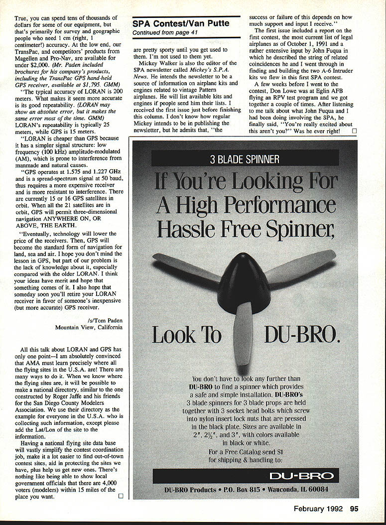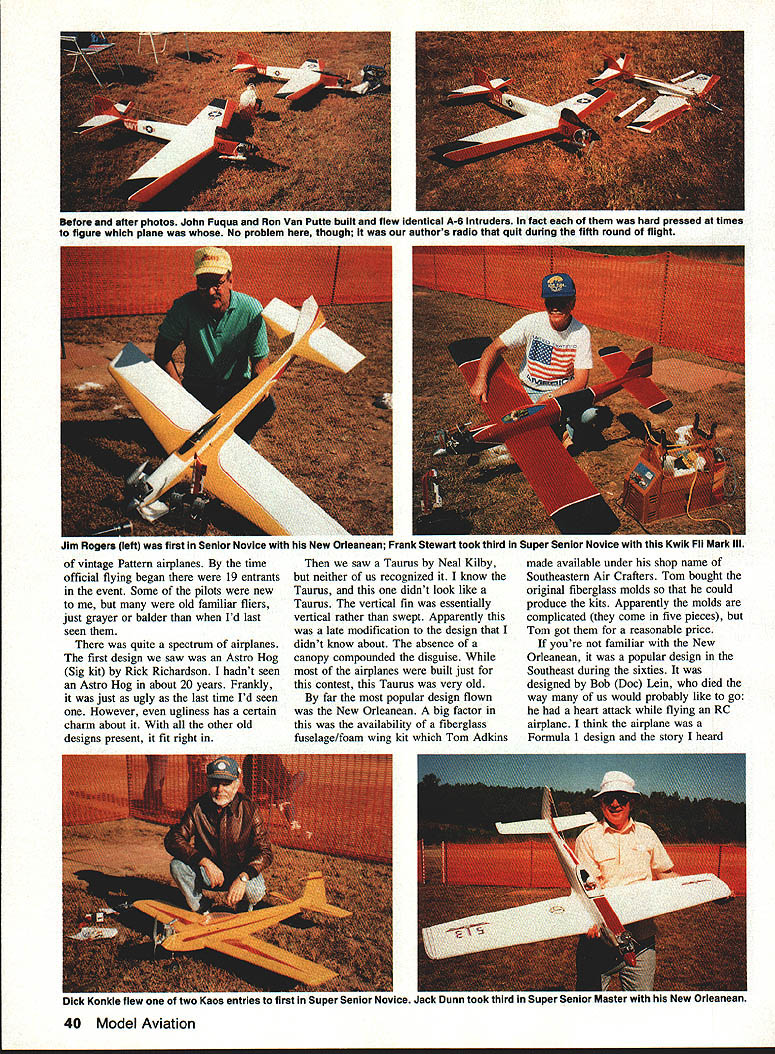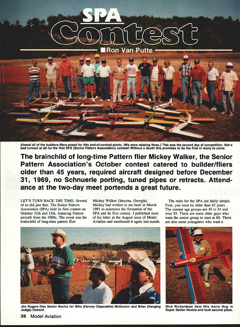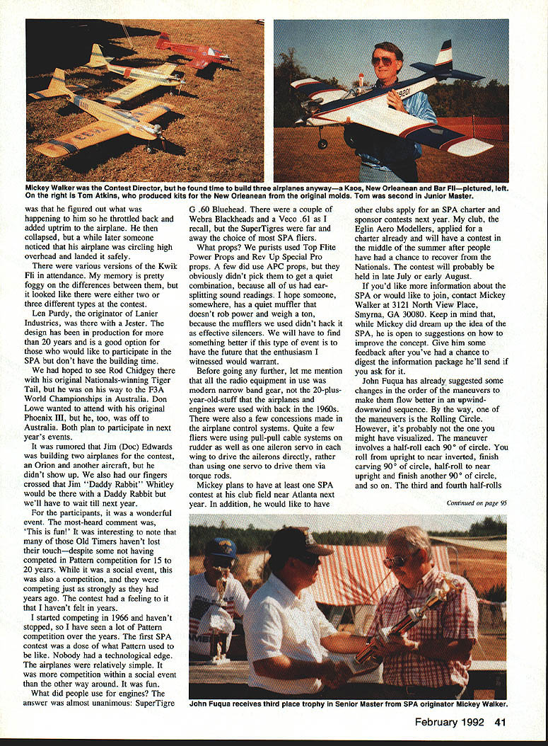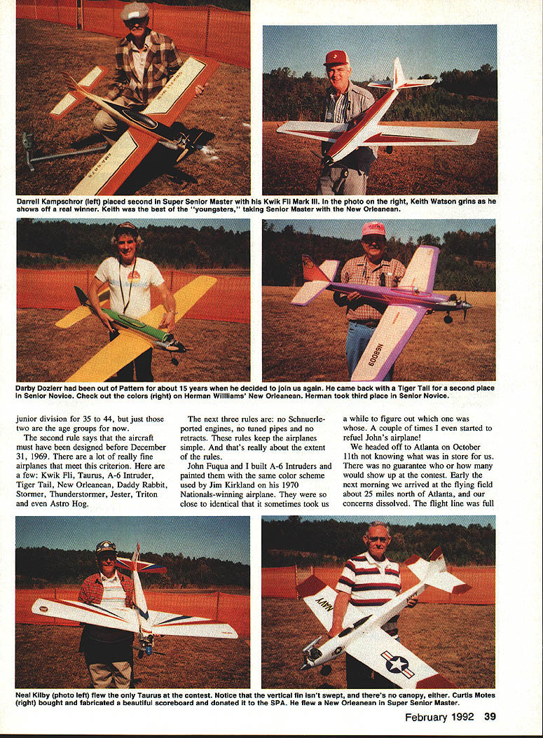 Almost builders-fliers posed end-of-contest-photo missing three second day competItIon bad turnout first SPA Senior Pattern Association contest Without doubt promises first come brainchild long-time Pattern flier Mickey Walker Senior Pattern Associations October contest catered builder/fliers older 45 years required aircraft designed before December 31 1969 no Schnuerle porting tuned pipes retracts Attend ance two-day meet portends great future LETS TURN BACK THE TIME Several us did just Senior Pattern Association SPA held its first contest October 12th 13th featuring Pattern aircraft 1960s event brainchild long-time pattern flier Mickey Walker Smyrna Georgia Mickey written back March 1991 announce formation SPA its first contest published letter August issue Model Aviation mentioned again last month rules SPA fairly simple First must older 45 years current age groups 45 54 over 55 some older guys want senior group start 60 also some youngsters want Jim JiJdgu 38 Model Aviation ncnrusun new mis Asiro nog ouper Senior Novice took second place junior division 35 44 just two age groups now second rule says aircraft must have designed before December 31 1969 lot really fine airplanes meet criterion few Kwik Fli Taurus A-6 Intruder Tiger Tail New Orleanean Daddy Rabbit Stormer Thunderstormer Jester Triton Astro Hog next three rules no Schnuerle ported engines no tuned pipes no retracts rules keep airplanes simple thats really about extent rules John Fuqua built A-6 Intruders painted same color scheme used Jim Kirkland 1970 Nationals-winning airplane close identical sometimes took us figure out couple times started refuel Johns airplane headed off Atlanta October 11th knowing what store us no guarantee would show up contest Early next morning arrived flying field about 25 miles north Atlanta concerns dissolved flight line full February 1992 39 Darrell Kampschror left placed second Super SenIor Master Kwik FIi Mark Ill photo right Keith Watson grins shows off real winner Keith best youngsters taking Senior Master New Orleanean Darby Dozlerr out Pattern about 15 years decided join us again came back Tiger Tall second piace Senior Novice Check out colors right Herman Willliams New Orleanean Herman took third place Senior Novice Neal KlY photo left flew Taurus contest Notice vertical Tin isnt swept ana ineres no canopy enner uurris motes right bought fabricated beautiful scoreboard donated SPA flew New Orleanean Super Senior Master vintage Pattern airplanes time official flying began 19 entrants event Some pilots new old familiar fliers Just grayer balder Id last seen quite spectrum airplanes first design saw Astro Hog Sig kit Rick Richardson hadnt seen Astro Hog about 20 years Frankly just ugly last time Id seen However ugliness has certain charm about other old designs present fit right saw Taurus Neal Kilby neither us recognized t know Taurus didnt look like Taurus vertical fin essentially vertical rather swept Apparently late modification design didnt know about absence canopy compounded disguise airplanes built just contest Taurus very old far popular design flown New Orleanean big factor availability fiberglass fuselage/foam wing kit Tom Adkins made available under shop name Southeastern Air Crafters Tom bought original fiberglass molds could produce kits Apparently molds complicated come five pieces Tom got reasonable price youre familiar New Orleanean popular design Southeast during sixties designed Bob Doc Lein died way us would probably like go heart attack flying RC airplane think airplane Formula 1 design story heard melore after photos John Fuqua Ron Van Putte built flew identical A-6 Intruders fact hard pressed times figure plane No problem though authors radio quit during fifth round flight Jim Rogers left first Senior Novice New Orieanean Frank Stewart took third Super Senior Novice Kwik Ri Mark Ill k EUI 40 Model Aviation uw urIc urn wu Super Senior Novice Jack Dunn took third Super Senior Master New Oricanean figured out what happening him throttled back added uptrim airplane collapsed later someone noticed airplane circling high overhead landed safely various versions Kwik Fli attendance memory pretty foggy differences between looked like either two three different types contest Len Purdy originator Lanier Industries Jester design has production 20 years good option would like participate SPA dont have building time hoped see Red Chidgey original Nationals-winning Tiger Tail way F3A World Championships Australia Don Lowe wanted attend original Phoenix III too off Australia Both plan participate next years events rumored Jim Doc Edwards building two airplanes contest Orion another aircraft didnt show up also fingers crossed Jim Daddy Rabbit Whitley would Daddy Rabbit well have wait till next year participants wonderful event most-heard comment fun interesting note Old Timers havent lost touchdespite some having competed Pattern competition 15 20 years social event also competition competing just strongly years ago contest feeling havent felt years started competing 1966 havent stopped have seen lot Pattern competition over years first SPA contest dose what Pattern used like Nobody technological edge airplanes relatively simple competition within social event other way around fun What did people use engines answer almost unanimous SuperTigre G 60 Bluehead couple Webra Blackheads Veco 61 recall SuperTigres far away choice SPA fliers What props purists used Top Flite Power Props Rev Up Special Pro props few did use APC props obviously didnt pick get quiet combination because us ear splitting sound readings hope someone somewhere has quiet muffler doesnt rob power weigh ton because mufflers used didnt hack effective silencers will have find something better type event have future enthusiasm witnessed would warrant Before going further let mention radio equipment use modern narrow band gear 20-plusyear-old-stuff airplanes engines used back 1960s also few concessions made airplane cont
