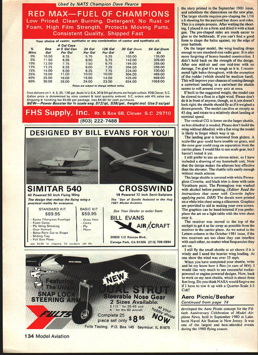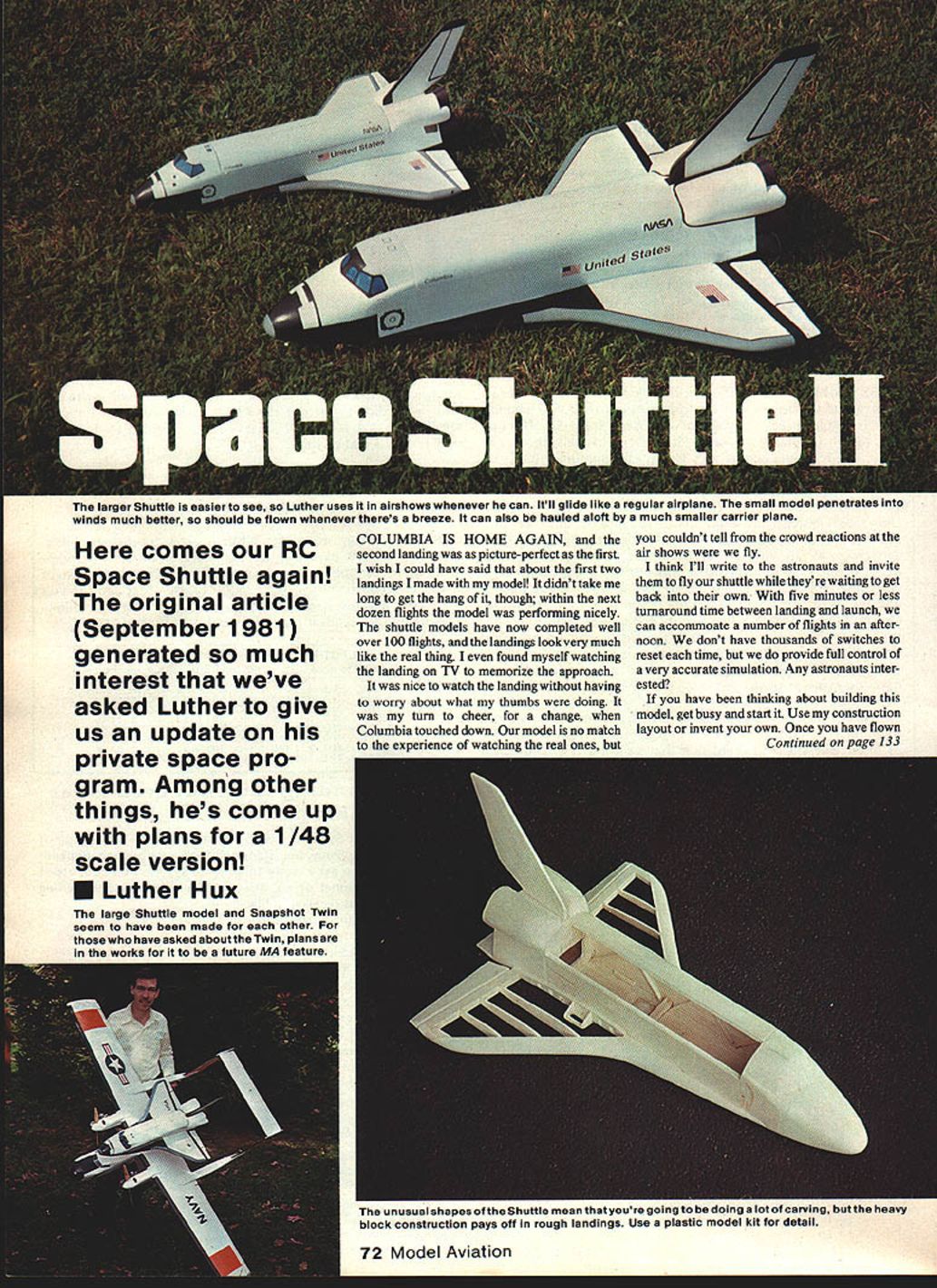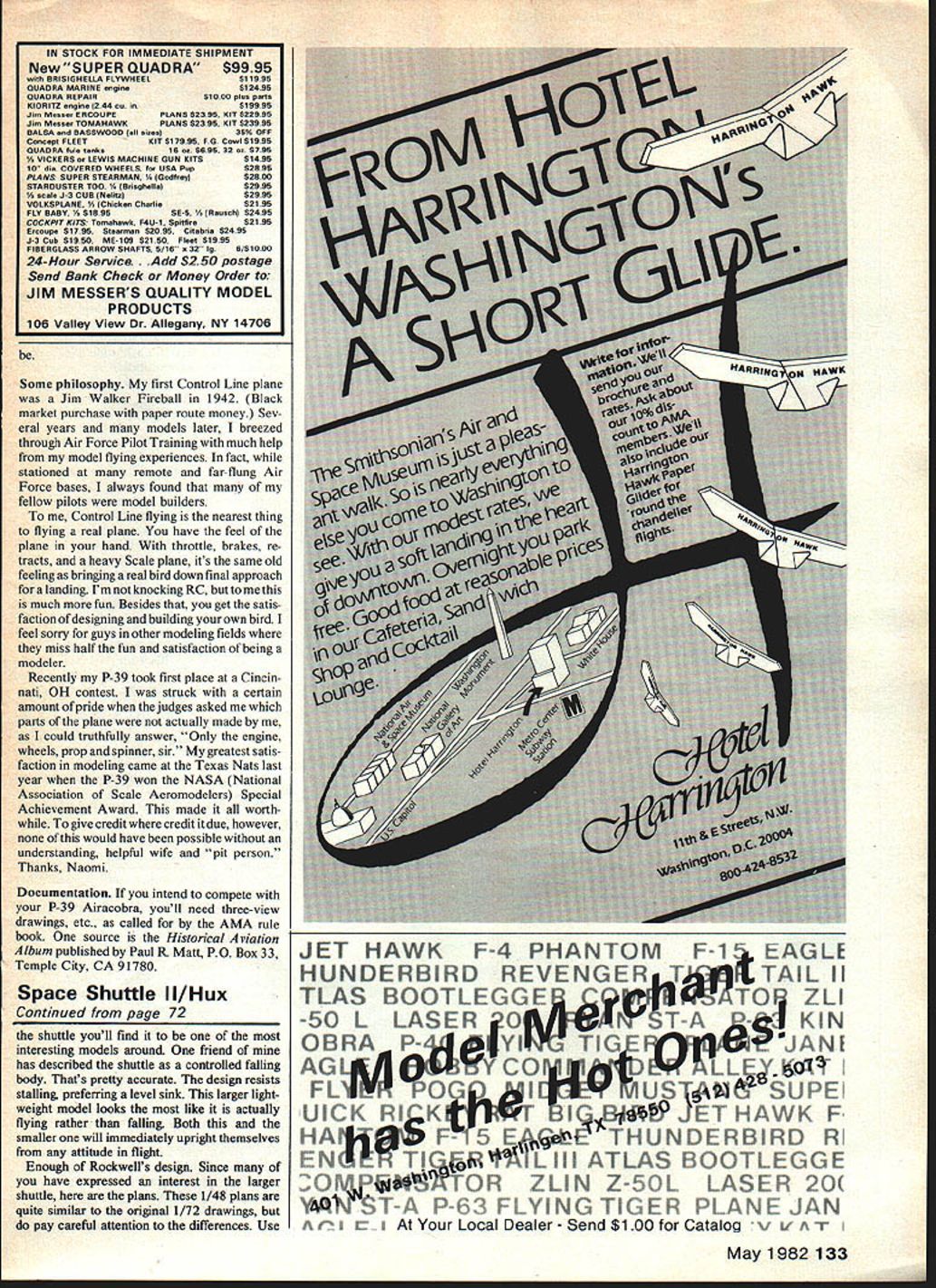 The larger Snuttle easier see Lutner uses IT Ifl airshows whenever can Itll glide like regular airplane small model penetrates winds much better should flown whenever theres breeze can also hauled aloft much smaller carrier plane comes RC Space Shuttle again original article September 1981 generated much interest weve asked Luther give us update private space pro gram Among other things hes come up plans 1/48 scale version U Luther Hux COLUMBIA IS HOME AGAIN second landing picture-perfect first wish could have said about first two landings made model didnt take long get hang though within next dozen flights model performing nicely shuttle models have now completed well over 100 flights landings look very much like real thing found myself watching landing TV memorize approach nice watch landing having worry about what thumbs doing turn cheer change Columbia touched down model no match experience watching real ones couldnt tell crowd reactions air shows fly think Ill write astronauts invite fly shuttle theyre waiting get back own five minutes less turnaround time between landing launch can accommoate number flights after noon dont have thousands switches reset time provide full control very accurate simulation Any astronauts inter ested have thinking about building model get busy start Use construction layout invent own Once have flown Continued page 133 72 Model Aviation large Shuttle model Snapshot Twin seem have made other have asked abouttheTwin plans works future AIAA ual snapesossne nuuie mean Inalyaure goIng iu u uuw arving butthe heavy block construction pays off rough landings Use plastic model kit detail Some philosophy first Control Line plane Jim Walker Fireball 1942 Black market purchase paper route money Sev eral years models later breezed through Air Force Pilot Training much help model flying experiences fact stationed remote far-flung Air Force bases always found fellow pilots model builders Control Line flying nearest thing flying real plane have feel plane hand throttle brakes re tracts heavy Scale plane its same old feeling bringing real bird down final approach landing Im knocking RC much fun Besides get satis faction designing building own bird feel sorry guys other modeling fields miss half fun satisfaction being modeler Recently P-39 took first place Cincin nati OH contest struck certain amount pride judges asked parts plane actually made could truthfully answer Only engine wheels prop spinner sir greatest satis faction modeling came Texas Nats last year P-39 won NASA National Association Scale Aeromodelers Special Achievement Award made worth give credit credit due however would have possible understanding helpful wife pit person Thanks Naomi Documentation intend compete P-39 Airacobra youll need three-view drawings etc called AMA rule book source Historical nation Album published Paul R Matt PO Box 33 Temple City CA 91780 Space Shuttle Il/Hux Continued page 72 shuttle youll find interesting models around friend has described shuttle controlled falling body Thats pretty accurate design resists stalling preferring level sink larger light weight model looks like actually flying rather falling Both smaller will immediately upright themselves attitude flight Enough Rockwells design Since have expressed interest larger shuttle plans 1/48 plans quite similar original 1/72 drawings pay careful attention differences Use JET HAWK F4 PHANTOMFAGLE HUNDERBIRD REVENGEAlL II TLAS BOOTLEGGETO ZLI -5O L LASER 0 KIN pA dYIG OBRA $3P THAWK HArH THUNDERB RD RI EN TI U ATLAS i300TL GOF OP&JOR ZLIN Z OL LASER 20 NTST P- B FLYING TIG P PLANE JAN AAt Local Dealer Send $100 Catalog v i 1 May 1982 133 IN STOCK FOR IMMEDIATE SHIPMENT NewSUPER QUADRA$9995 wth BRISIGHELLA FLYWHEEL 996 QUADRA MARINE engine 495 QUADRA RSPAIR$1000 plot petit KIORITZ engine 244 cc in$19995 Jim Mccc, ERCOUPEPLANS $2395 KIT $22995 Jin Mccc, TOMAHAWKPLANS $2395 KIT $23995 BALSA end BASSWOOD cli niece35% OFF Concept FLEETKIT $17995 FG Cowl $1995 QUADRA fole tenke16 oc $696 32 cc $795 VICKERS LEWIS MACHINE GUN KITS$1496 10 die COVERED WHEELS USA Pop$2596 PLAAISs SUPER STEARMAN Godfrey$2800 STARDUSTER TOO Brieghellc$2996 conic J3 CUB NeIi$2995 VOLKSPLANE Chioken CIterlie$2195 FLY BABY $1896 SES Reocohl$Z495 COCKPIT KITS Tonehcwk F4U-1 Spittre$2195 Eronope $1795 Stearteen $2096 Citebrie $2496 J-3 Cob $1950 ME109 $2150 Fleet $1996 FIBERGLASS ARROW SHAFTS 5/16 032 IgB/$1000 24-Hour Service. Add $250 postage Send Bank Check Money Order JIM MESSERS QUALITY MODEL PRODUCTS 106 Valley View Dr Allegany NY 14706 choice castor synthetic cor 4 Gal Case %Oneor 5 Gal Can24 Gal126 Gal30 Gal Drum54 Gal Drum Nltro Gal Per GalPer GalPer Gal 0% 1050 625 575 525 10300 13500 5%11506956505751420020500 10%12507757506751840026500 12%13258258007252040029600 15%14008508257752240033000 25% 1850 1100 1050 1000 30400 46600 40% 2500 1600 1500 1400 42500 66800 60% 3000 2600 2400 2300 65400 105800 Pdce e ebjct te ch,ge eithoet ,etce Free delivery 14525126 gal deals USA 30 & 54 gal drums freight collect FOB Clover SC Gallon price determined nitro content & total quantity ordered SC orders add 4% sales tas Shipping 8 handling fee $500 per package less $400 cash purchases NEWPower Booster e eng $12/qt $38/gal freight md Use 3 az/gal UI 803 222-7488 STANDARD KIT $8995 Epoxy Fiberglass Fuselage Foam Cores - Ply Wing Sheeting Gear Formed - Balsa Parts Cut Shape - Sliding Tray - Full Size Plans Add $300 xg CA BASIC KIT $5995 Glass Fuse Cores Ply - Plans resdents add $96 See Dealer order BILL EVANS AIR/CRAFT 20825 1/2 Roscoe Blvd Canoga Park CA 91306 1213 709-0894 story printed September 1981 issue substitute dimensions new plan larger shuffle requires pre- shaping 1/16 x 6 sheeting payload bay doors sides simple process After wetting sheet ing placed form dried heat gun pre-shaped sides much easier glue bulkheads cant find good form shape balsa against try edge bathtub larger model wing loading drops enough use standard-size radio gear also forgiving heavy-