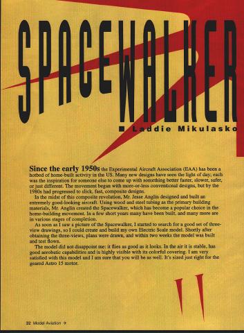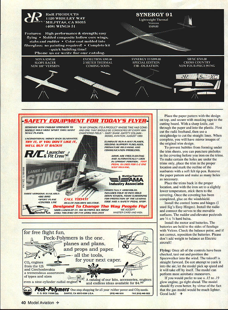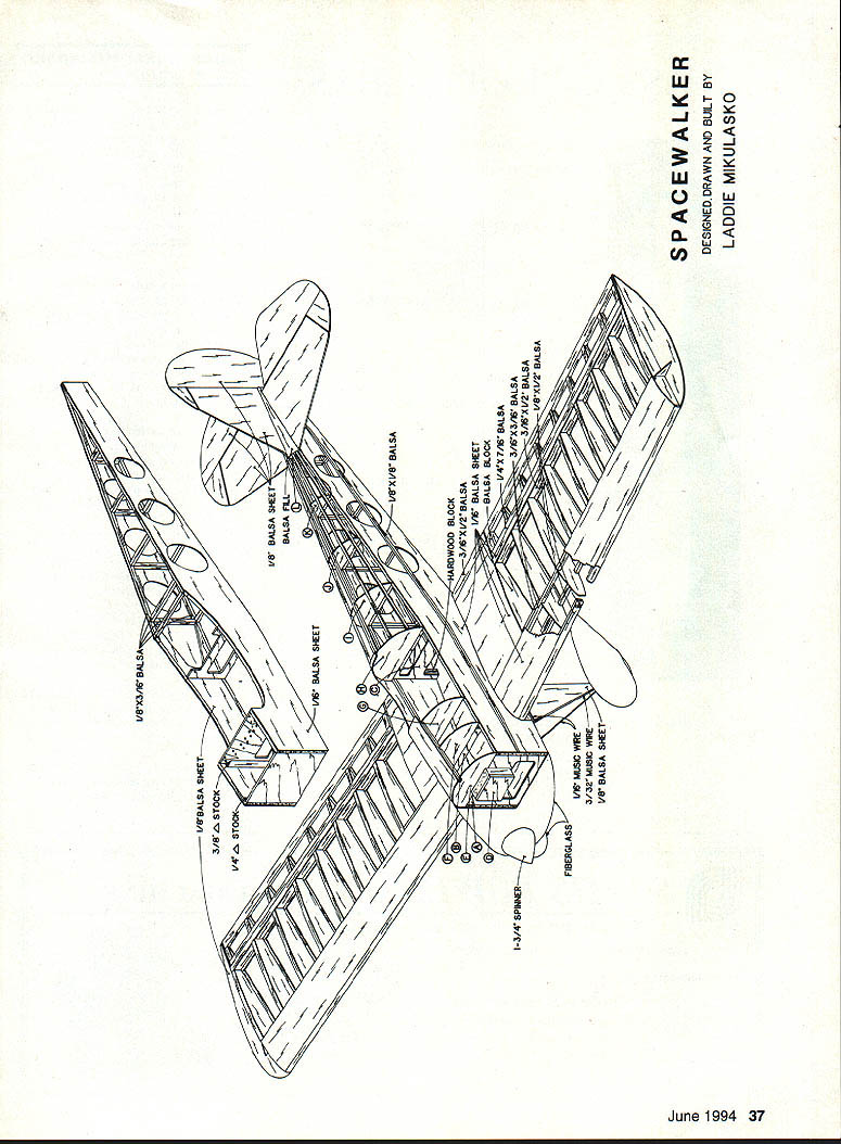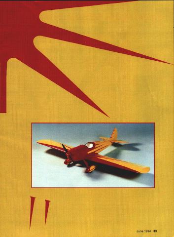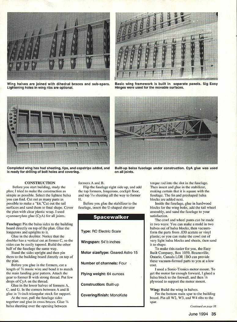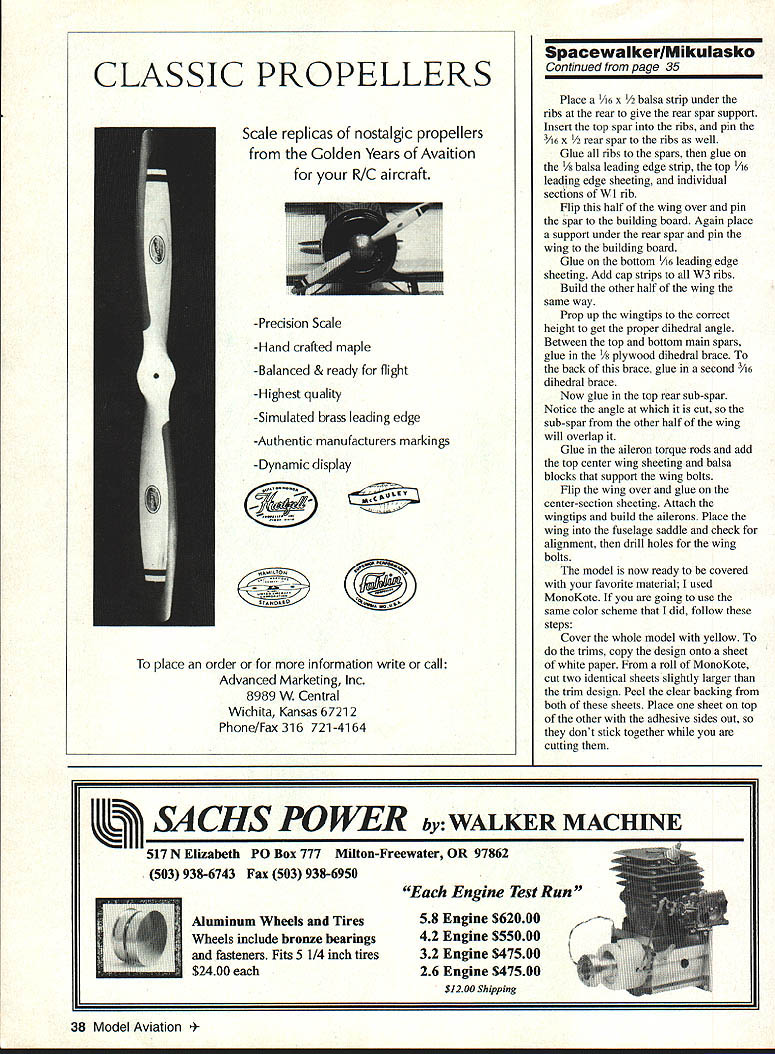 NO OCR TEXT NO OCR TEXT CONSTRUCTION Before start building study plan tried make construction simple possible Select lightest balsa can find Cut out parts possible make kitCut out tail surfaces sand final shape Cover plan clear plastic wrap used cyanoacrylate glue CyA joints Fuselage Pin balsa sides building board directly top plan Glue longerons uprights Glue doubler Notice doubler has vertical cut former C sides can easily tapered Build other half fuselage same way Stand sides upright pin building board directly top plan Before glue formers cut length 1/8 music wire bend match main landing gear pattern Attach gear former B strong thread Put few drops CyA thread Glue lower halves formers C U corners between B glue -inch triangular stock support rear pull fuselage sides together glue cross braces Glue 1/8 balsa sheeting over opening between formers B Flip fuselage right side up add top formers longerons cockpit floor top 1/i6 sheeting way former H Before glue stabilizer fuselage insert U-shaped elevator torque rod slot fuselage insert glue stabilizer making certain square fuselage fin preshaped balsa blocks added next Inside fuselage glue hardwood blocks wing bolts add tail wheel assembly sand fuselage satisfaction cowl wheel pants can made two ways can make mold two halves out balsa blocks vacuumform parts 030 acetate vinyl plastic can make cowl out very light balsa blocks sheets sand shape make easier Easy Built Company Box 1059 Beamsville Ontario Canada LOR lBO can provide vacuum-formed parts low cost used Sonic-Tronics motor mount get motor far enough forward glued balsa block firewall 1/8 plywood support motor mount Wing Build wing halves Pin bottom main spar building board Pin W2 W3 W4 ribs spar Continued poge 38 June1994 35 Wing halves joined dihedral braces sub-spars Lightening holes wing ribs optional Basic wing framework built separate panels Sig Easy Hinges used movable surfaces Completed wing has sheeting tips capstrips added ready drilling bolt holes covering Built-up balsa fuselage under construction CyA glue used joints Type RC Electric Scale Wingspan 54 inches Motor size/type Geared Astro 15 Number channels Four Flying weight 64 ounces Construction Built-up Covering/finish MonoKote Full-size plans availableSee Page 160 0 0 0 ANLL /-6i6NALTI/4 PLY[/B BALSA SI-IT /QnQc-L3-AW SPEEDPLY3/SIX3/W BALSA I/rxI/2 BALSA CARR IEATV31rBALSA3/IrBALSASHTi/rXS/rBALSA[v32][b-1-10-1-10]] WWSIIELD-- RED TOPAND BOTTOM T16 LIE CONTKJESPLY..-3/l6XV2BALSA-YELLOW TOP AND BOTTOM A/4X7/16 BALSA SIlT I/16 BALSA SIlTALL TIE WAY TO TAL BOTTOM OILY YELLOW YELLII---i-A#~- _ ____ --r- 1___WIW213W3,W3 W3W3W3 3/I6X3Ar BALSALJ _____ __W3 W4 lB BALSAVrBALSAsKT .I/16 BALSA SHE EDYELLOW EWALKER SPORT SCALE MODEL CJOESIG1EQ DRAWN AtI 5LT BY WIIGSPAN- 54-I/2 WESNT-4 LBS WI-EELVS BALSA SI-ITPOWER-AS AWED 5 ALL RIGHTS WESERVED YBJLSABLOCAATJLT RED V4ABALSA STOCK 3/BABALSA STOCKHARDWOOD BLOCKYELLOW BALSA BLOCK BLACK L8 BALSA SlEETRE -ELLOW I- CEWALKER DESIGNED DRAWN AND BUILT BY LADDIE MIKULASKO CLASSIC PROPELLERS Scale replicas nostalgic propellers Golden Years Avaition R/C aircraft -Precision Scale -Hand crafted maple -Balanced & ready flight -Highest quality -Simulated brass leading edge -Authentic manufacturers markings -Dynamic display LIY ce order information write call Advanced Marketing Inc 8989 W Central Wichita Kansas 6721 2 Phone/Fax 316 721-4164 Spacewalker/Mikulasko Continued page 35 Place /16 x a strip under ribs rear give rear spar support Insert top spar ribs pin 3A6 X 1/2 rear spar ribs well Glue ribs spars glue /s balsa leading edge strip top 1/16 leading edge sheeting individual sections Wl rib Flip half wing over pin spar building board Again place support under rear spar pin wing building board Glue bottom A6 leading edge sheeting Add cap strips W3 ribs Build other half wing same way Prop up wingtips correct height get proper dihedral angle Between top bottom main spars glue 1/g plywood dihedral brace back brace glue second 3/i6 dihedral brace Now glue top rear sub-spar Notice angle cut sub-spar other half wing will overlap Glue aileron torque rods add top center wing sheeting balsa blocks support wing bolts Flip wing over glue center-section sheeting Attach wingtips build ailerons Place wing fuselage saddle check alignment drill holes wing bolts model now ready covered favorite material used MonoKote going use same color scheme did follow steps cover whole model yellow trims copy design onto sheet white paper roll MonoKote cut two identical sheets slightly larger trim design Peel clear backing both sheets Place sheet top other adhesive sides out dont stick together cutting SACHS POWER WALKER MACHIINE 517 N Elizabeth P0 Box 777 Milton-Freewater OR 97862 503 938-6743 Fax 503 938-6950 Aluminum Wheels Tires Wheels include bronze bearings fasteners Fits 5 1/4 inch tires $2400 Engine Test Run 58 Engine $62000 42 Engine $55000 32 Engine $47500 26 Engine $47500 $1200 Shipping 38 Model Aviation ENEO WITH ENDUIiH STREIISTH TOIN MY OPINION ITS PRODUCT WHOSE TIME HAS COMESAFELY HOLD MOST SPORT THRIJ I5IANTAND ONE THATSHOULD BE CONSIDERED BYEVERYAMA SCALE PLAIIE5ICHARTERED FIELD- GARY SHA W -SAFETY COLUMNMODEL AVIATION AUGUST 1993 ELIMINATE RUN-A-WAY PLANES HOLOINE SLIPPERY FUSELALiES PREMATURE RELEASII115 AND I7OMMUNICATIDN PRDRL EMS ARMS ARE FREE-FLDATIND AND AUTOMATICALLY LOCK IN UPRIDHT POSITION FODT PEDAL IS USED FOR E-Z ONE STEP RELEASE Wm*I g Together AMA Industry Associate 1ES FULLY ASSEMRL ED UDES FOUR 10 INCH HOLD DOWN STAKES FOAM EUSHIDNINS FOR PROTECTION OF THE LEA DINIi EDDE AND SAFETY PEDAL STOP Place paper pattern design top secure masking tape cutting board sharp knife cut through paper plastic First cut radii freehand use straightedge cut straight lines complete will have mirror images original trim design prevent bubbles forming under trim sheets can puncture pinholes covering before iron trims make certain holes under trims place trim proper location mark outline sunbursts soft felt tip
