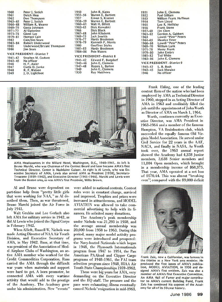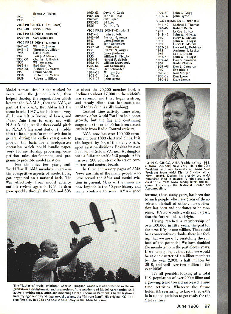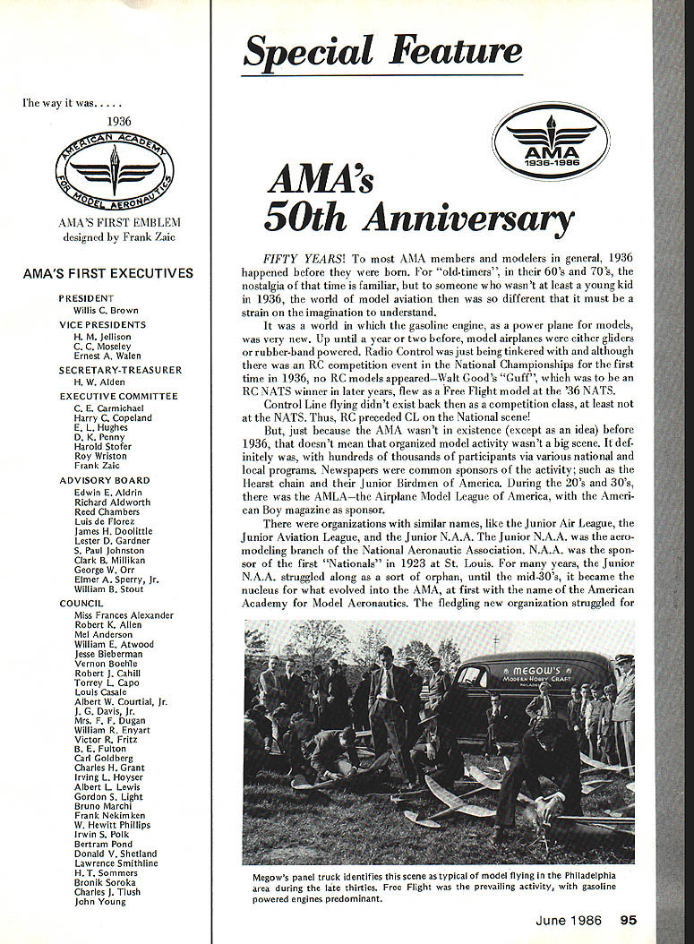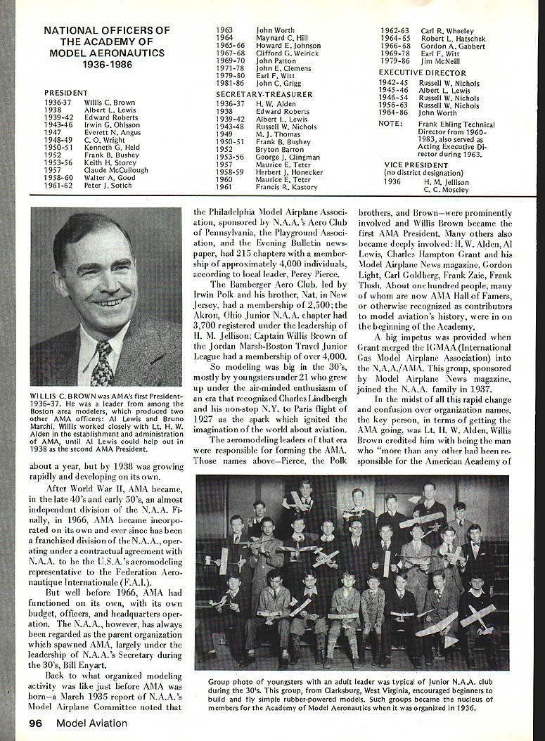 Ihe way 1936 #4 AMAS FIRST EMBLEM designed Frank Zaic AMAS FIRST EXECUTIVES PRESIDENT Willis C Brown VICE PRESIDENTS H M Jellison C C Moseley Ernest Walen SECRETARY-TREASURER H W Alden EXECUTIVE COMMITTEE C E Carmichael Harry C Copeland E L Hughes D K Penny Harold Stofer Roy Wriston Frank Zaic ADVISORY BOARD Edwin E Aidrin Richard Aldworth Reed Chambers Luis de Florez James H Doolittle Lester D Gardner S Paul Johnston Clark B Millikan George W Orr Elmer Sperry Jr William B Stout COUNCIL Miss Frances Alexander Robert K Allen Mel Anderson William E Atwood Jesse Bieberman Vernon Boehie Robert J Cahill Torrey L Capo Louis Casale Albert W Courtial Jr I G Davis Jr Mrs F F Dugan William R Enyart Victor R Fritz B E Fulton Carl Goldberg Charles H Grant Irving L Hoyser Albert L Lewis Gordon S Light Bruno Marchi Frank Nekimken W Hewitt Phillips Irwin S Polk Bertram Pond Donald V Shetland Lawrence Smithline HT Sommers Bronik Soroka Charles J Tlush John Young Special Feature AMA AMAs 50th Anniversary FIFTY YEARS AMA members modelers general 1936 happened before born old-timers 60s 70s nostalgia time familiar someone wasnt least young kid 1936 world model aviation different must strain imagination understand world gasoline engine power plane models very new Up until year two before model airplanes either gliders rubber-band powered Radio Control just being tinkered although RC competition event National Championships first time 1936 no RC models appearedWalt Goods Guff RC NATS winner later years flew Free Flight model 36 NATS Control Line flying didnt exist back competition class least NATS Thus RC preceded CL National scene just because AMA wasnt existence except idea before 1936 doesnt mean organized model activity wasnt big scene def initely hundreds thousands participants via various national local programs Newspapers common sponsors activity such Hearst chain Junior Birdmen America During 2Os 30s AMLAthe Airplane Model League America Ameri can Boy magazine sponsor organizations similar names like Junior Air League Junior Aviation League Junior NAA Junior NAA aero modeling branch National Aeronautic Association NAA spon sor first Nationals 1923 St Louis years Junior NAA struggled along sort orphan until mid-30s became nucleus what evolved AMA first name American Academy Model Aeronautics fledgling new organization struggled Megows panel truck identifies scene astypical model flying Philadelphia area during late thirties Free Flight prevailing activity gasoline powered engines predominant June1986 95 NATIONAL OFFICERS OF THE ACADEMY OF MODEL AERONAUTICS 1936- 1986 PRESIDENT 1936-37 Willis C Brown 1938 Albert L Lewis 1939-42 Edward Roberts 1943-46 Irwin G Ohisson 1947 Everett N Angus 1948-49 C 0 Wright 1950-51 Kenneth G Held 1952 Frank B Bushey 1953-56 Keith H Storey 1957 Claude McCullough 1958-60 Walter Good 1961-62 Peter J Sotich 1963 John Worth 1964 Maynard C Hill 1965-66 Howard EJohnson 1967-68 Clifford G Weirick 1969-70 John Patton 1971-78 John E Clemens 1979-80 Earl F Witt 198186 John C Grigg SECRETARY-TREASURER 1936-37 H W Alden 1938 Edward Roberts 1939-42 Albert L Lewis 1 943-48 Russell W Nichols 1949 MJThomas 1950-51 Frank B Bushey 1952 Bryton Barron 1953-56 George Clingman 1957 Maurice E Teter 1958-59 Herbert Honecker 1960 Maurice E Teter 1961 Francis R Kastory 1962-63 Carl R Wheeley 1964-65 Robert L Hatschek 1966-68 Gordon Gabbert 1969-78 Earl F Witt 1979-86 Jim McNeill EXECUTIVE DIRECTOR 1942-45 Russell W Nichols 1945-46 Albert L Lewis 1946-54 Russell W Nichols 1956-63 Russell W Nichols 1964-86 John Worth NOTE Frank Ehling Technical Director 19601 983 also served Acting Executive Di rector during 1963 VICE PRESIDENT no district designation 1936H M Jellison C C Moseley r WILLIS C BROWN AMAs first President193637 leader among Boston area modelers produced two other AMA officers Al Lewis Bruno Marchi Willis worked closely Lt H W Alden establishment administration AMA until Al Lewis could help out 1938 second AMA President about year 1938 growing rapidly developing its own After World War II AMA became late 40s early 50s almost independent division NAA Fi nally 1966 AMA became incorpo rated its own ever since has franchised division NAA oper ating under contractual agreement NAA USAs aeromodeling representative Federation Aero nautique Internationale FAI well before 1966 AMA functioned its own its own budget officers headquarters oper ation NAA however has always regarded parent organization spawned AMA largely under leadership NAA s Secretary during 30s Bill Enyart Back what organized modeling activity like just before AMA borna March 1935 report NAA s Model Airplane Committee noted Philadelphia Model Airplane Associ ation sponsored NAA s Aero Club Pennsylvania Playground Associ ation Evening Bulletin news paper 215 chapters member ship approximately 4000 individuals according local leader Percy Pierce Bamberger Aero Club led Irwin Polk brother Nat New Jersey membership 2500thc Akron Ohio Junior NAA chapter 3700 registered under leadership H M Jellison Captain Willis Brown Jordan Marsh-Boston Travel junior League membership over 4000 So modeling big 30s mostly youngstersunder2l grew up under air-minded enthusiasm era recognized Charles Lindbergh non-stop NY Paris flight 1927 spark ignited imagination world about aviation aeromodeling leaders era responsible forming AMA names abovePierce Polk brothers Brownwere prominently involved Willis Brown became first AMA President others also became deeply involved H W Alden Al Lewis Charles Hampton Grant Model Airplane News magazine Gordon Light Carl oldberg Frank Zaic Frank Tlush About hundred people now AMA Hall Famers otherwise recognized contributors model aviations history beginning Academy big impetus provided Grant merged IG MAA International Gas Model Airplane Association NAA/AMA group sponsored Model Airplane News magazine joined NAA family 1937 midst rapid change confusion over organization names key person terms getting AMA going Lt H W Al