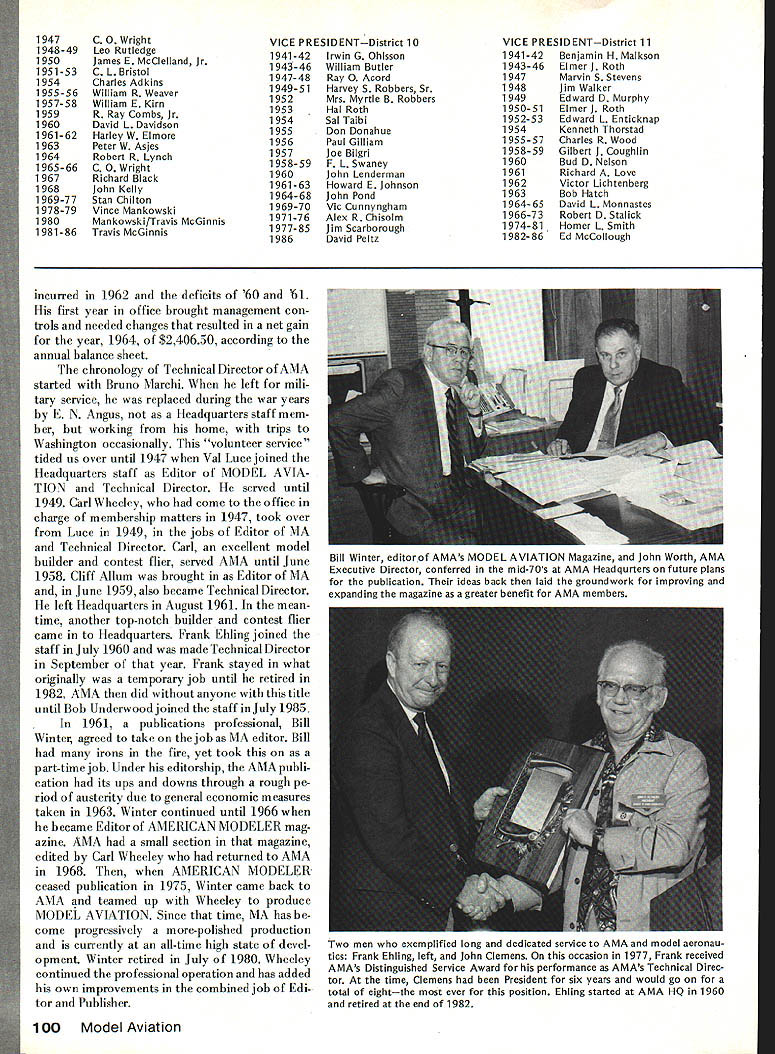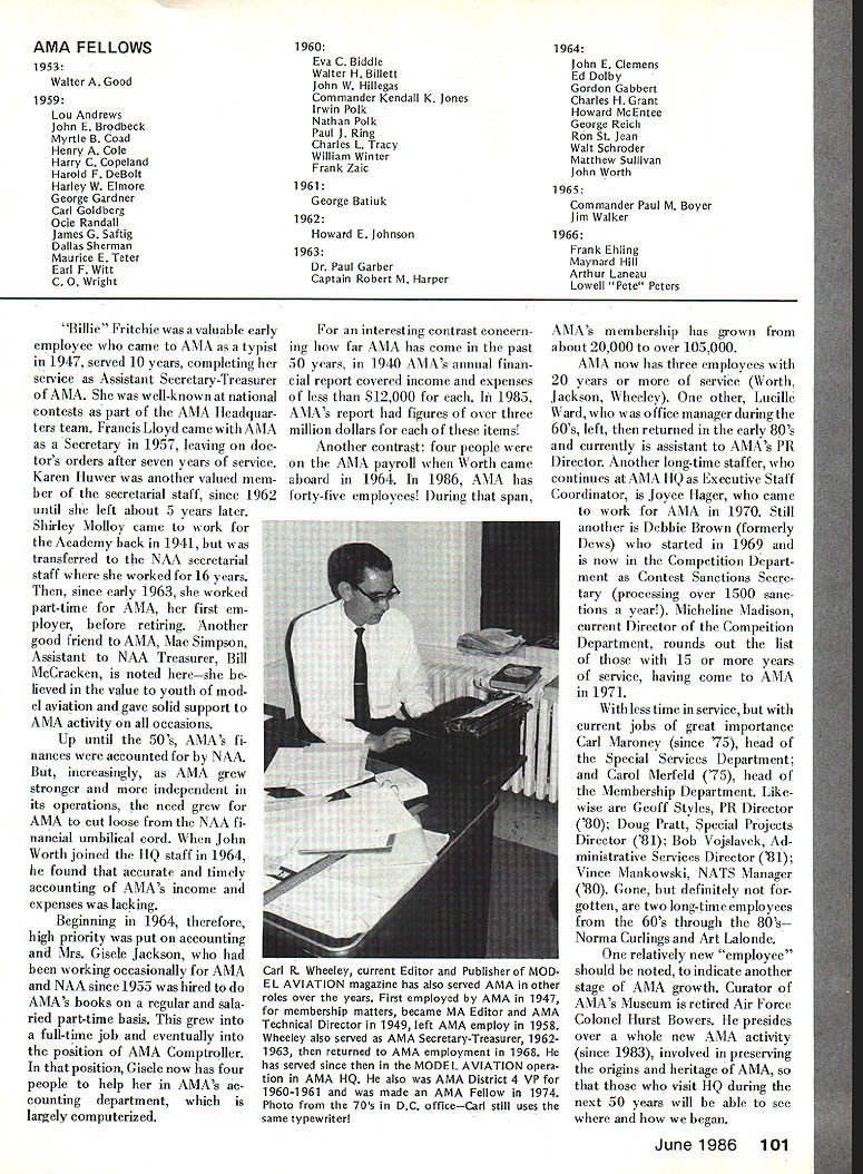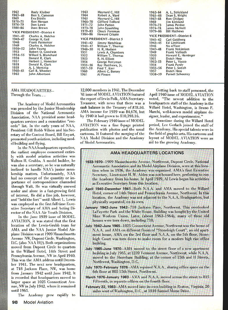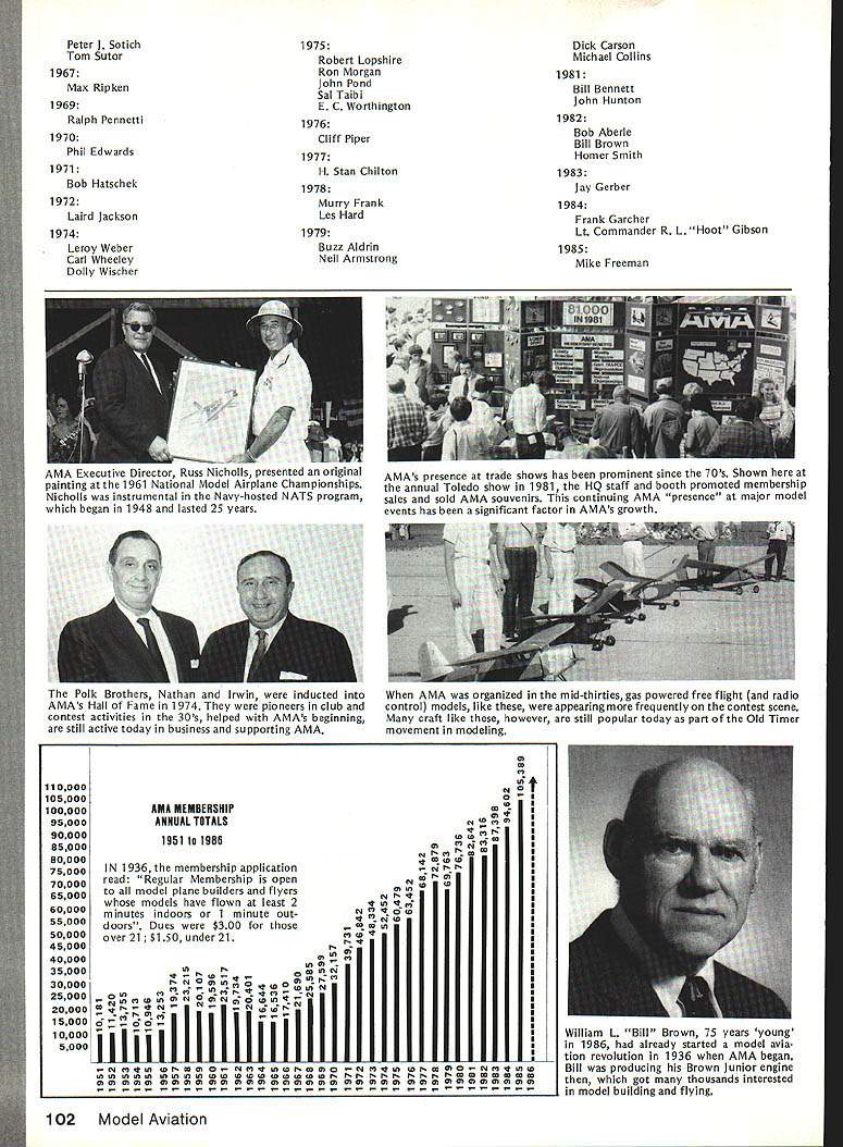 Ihe way 1936 #4 AMAS FIRST EMBLEM designed Frank Zaic AMAS FIRST EXECUTIVES PRESIDENT Willis C Brown VICE PRESIDENTS H M Jellison C C Moseley Ernest Walen SECRETARY-TREASURER H W Alden EXECUTIVE COMMITTEE C E Carmichael Harry C Copeland E L Hughes D K Penny Harold Stofer Roy Wriston Frank Zaic ADVISORY BOARD Edwin E Aidrin Richard Aldworth Reed Chambers Luis de Florez James H Doolittle Lester D Gardner S Paul Johnston Clark B Millikan George W Orr Elmer Sperry Jr William B Stout COUNCIL Miss Frances Alexander Robert K Allen Mel Anderson William E Atwood Jesse Bieberman Vernon Boehie Robert J Cahill Torrey L Capo Louis Casale Albert W Courtial Jr I G Davis Jr Mrs F F Dugan William R Enyart Victor R Fritz B E Fulton Carl Goldberg Charles H Grant Irving L Hoyser Albert L Lewis Gordon S Light Bruno Marchi Frank Nekimken W Hewitt Phillips Irwin S Polk Bertram Pond Donald V Shetland Lawrence Smithline HT Sommers Bronik Soroka Charles J Tlush John Young Special Feature AMA AMAs 50th Anniversary FIFTY YEARS AMA members modelers general 1936 happened before born old-timers 60s 70s nostalgia time familiar someone wasnt least young kid 1936 world model aviation different must strain imagination understand world gasoline engine power plane models very new Up until year two before model airplanes either gliders rubber-band powered Radio Control just being tinkered although RC competition event National Championships first time 1936 no RC models appearedWalt Goods Guff RC NATS winner later years flew Free Flight model 36 NATS Control Line flying didnt exist back competition class least NATS Thus RC preceded CL National scene just because AMA wasnt existence except idea before 1936 doesnt mean organized model activity wasnt big scene def initely hundreds thousands participants via various national local programs Newspapers common sponsors activity such Hearst chain Junior Birdmen America During 2Os 30s AMLAthe Airplane Model League America Ameri can Boy magazine sponsor organizations similar names like Junior Air League Junior Aviation League Junior NAA Junior NAA aero modeling branch National Aeronautic Association NAA spon sor first Nationals 1923 St Louis years Junior NAA struggled along sort orphan until mid-30s became nucleus what evolved AMA first name American Academy Model Aeronautics fledgling new organization struggled Megows panel truck identifies scene astypical model flying Philadelphia area during late thirties Free Flight prevailing activity gasoline powered engines predominant June1986 95 NATIONAL OFFICERS OF THE ACADEMY OF MODEL AERONAUTICS 1936- 1986 PRESIDENT 1936-37 Willis C Brown 1938 Albert L Lewis 1939-42 Edward Roberts 1943-46 Irwin G Ohisson 1947 Everett N Angus 1948-49 C 0 Wright 1950-51 Kenneth G Held 1952 Frank B Bushey 1953-56 Keith H Storey 1957 Claude McCullough 1958-60 Walter Good 1961-62 Peter J Sotich 1963 John Worth 1964 Maynard C Hill 1965-66 Howard EJohnson 1967-68 Clifford G Weirick 1969-70 John Patton 1971-78 John E Clemens 1979-80 Earl F Witt 198186 John C Grigg SECRETARY-TREASURER 1936-37 H W Alden 1938 Edward Roberts 1939-42 Albert L Lewis 1 943-48 Russell W Nichols 1949 MJThomas 1950-51 Frank B Bushey 1952 Bryton Barron 1953-56 George Clingman 1957 Maurice E Teter 1958-59 Herbert Honecker 1960 Maurice E Teter 1961 Francis R Kastory 1962-63 Carl R Wheeley 1964-65 Robert L Hatschek 1966-68 Gordon Gabbert 1969-78 Earl F Witt 1979-86 Jim McNeill EXECUTIVE DIRECTOR 1942-45 Russell W Nichols 1945-46 Albert L Lewis 1946-54 Russell W Nichols 1956-63 Russell W Nichols 1964-86 John Worth NOTE Frank Ehling Technical Director 19601 983 also served Acting Executive Di rector during 1963 VICE PRESIDENT no district designation 1936H M Jellison C C Moseley r WILLIS C BROWN AMAs first President193637 leader among Boston area modelers produced two other AMA officers Al Lewis Bruno Marchi Willis worked closely Lt H W Alden establishment administration AMA until Al Lewis could help out 1938 second AMA President about year 1938 growing rapidly developing its own After World War II AMA became late 40s early 50s almost independent division NAA Fi nally 1966 AMA became incorpo rated its own ever since has franchised division NAA oper ating under contractual agreement NAA USAs aeromodeling representative Federation Aero nautique Internationale FAI well before 1966 AMA functioned its own its own budget officers headquarters oper ation NAA however has always regarded parent organization spawned AMA largely under leadership NAA s Secretary during 30s Bill Enyart Back what organized modeling activity like just before AMA borna March 1935 report NAA s Model Airplane Committee noted Philadelphia Model Airplane Associ ation sponsored NAA s Aero Club Pennsylvania Playground Associ ation Evening Bulletin news paper 215 chapters member ship approximately 4000 individuals according local leader Percy Pierce Bamberger Aero Club led Irwin Polk brother Nat New Jersey membership 2500thc Akron Ohio Junior NAA chapter 3700 registered under leadership H M Jellison Captain Willis Brown Jordan Marsh-Boston Travel junior League membership over 4000 So modeling big 30s mostly youngstersunder2l grew up under air-minded enthusiasm era recognized Charles Lindbergh non-stop NY Paris flight 1927 spark ignited imagination world about aviation aeromodeling leaders era responsible forming AMA names abovePierce Polk brothers Brownwere prominently involved Willis Brown became first AMA President others also became deeply involved H W Alden Al Lewis Charles Hampton Grant Model Airplane News magazine Gordon Light Carl oldberg Frank Zaic Frank Tlush About hundred people now AMA Hall Famers otherwise recognized contributors model aviations history beginning Academy big impetus provided Grant merged IG MAA International Gas Model Airplane Association NAA/AMA group sponsored Model Airplane News magazine joined NAA family 1937 midst rapid change confusion over organization names key person terms getting AMA going Lt H W Al