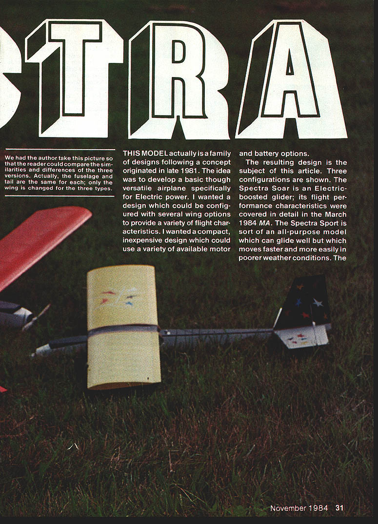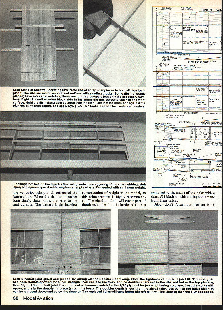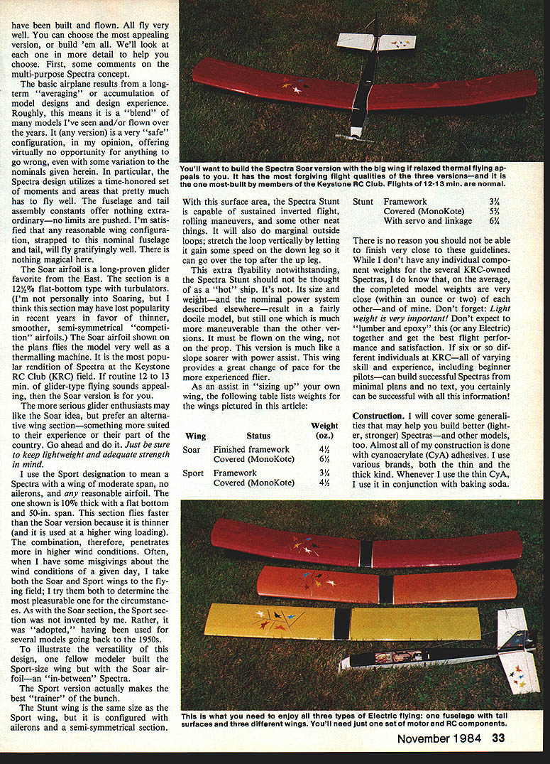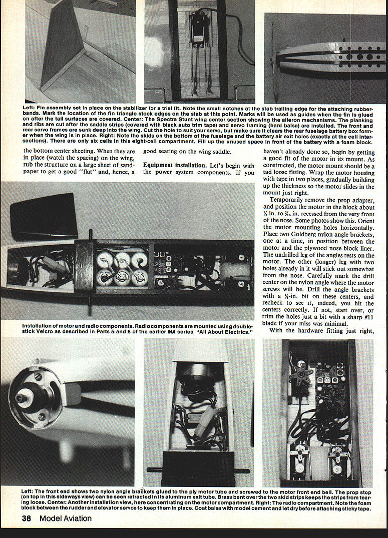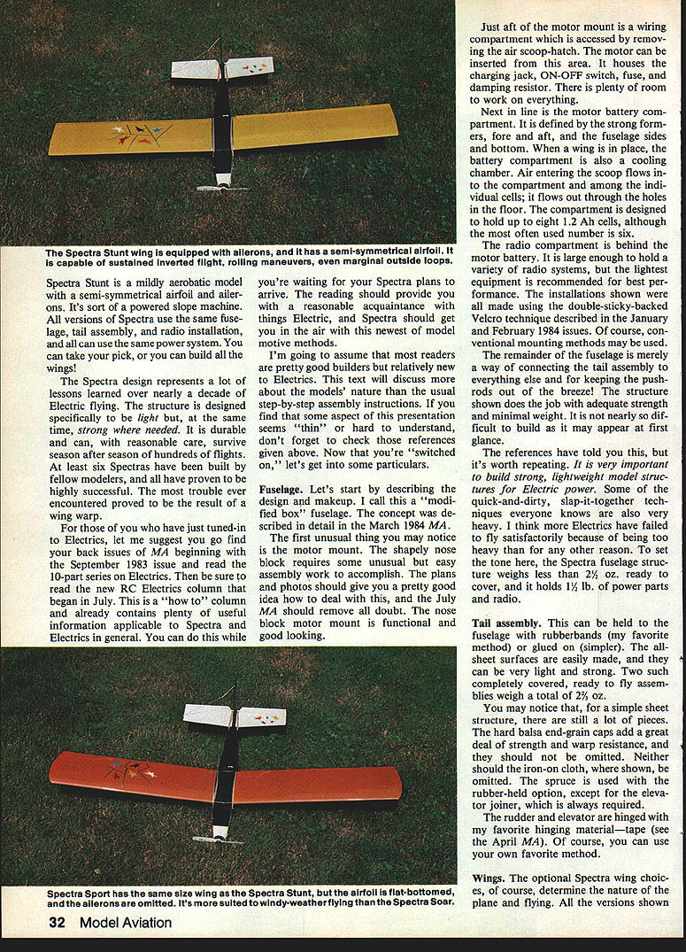 NO OCR TEXT NO OCR TEXT Spectra Stunt mildly aerobatic model semi-symmetrical airfoil ailer ons Its sort powered slope machine versions Spectra use same fuse lage tail assembly radio installation can use same power system can take pick can build wings Spectra design represents lot lessons learned over nearly decade Electric flying structure designed specifically light same time strong needed durable can reasonable care survive season after season hundreds flights least six Spectras have built fellow modelers have proven highly successful trouble ever encountered proved result wing warp have just tuned-in Electrics let suggest go find back issues MA beginning September 1983 issue read 10-part series Electrics sure read new RC Electrics column began July column already contains plenty useful information applicable Spectra Electrics general can youre waiting Spectra plans arrive reading should provide reasonable acquaintance things Electric Spectra should get air newest model motive methods Im going assume readers pretty good builders relatively new Electrics text will discuss about models nature usual step-by-step assembly instructions find some aspect presentation seems thin hard understand dont forget check references given above Now youre switched lets get some particulars Fuselage Lets start describing design makeup call modi fied box fuselage concept de scribed detail March 1984 MA first unusual thing may notice motor mount shapely nose block requires some unusual easy assembly work accomplish plans photos should give pretty good idea deal July MA should remove doubt nose block motor mount functional good looking Just aft motor mount wiring compartment accessed remov ing air scoop-hatch motor can inserted area houses charging jack ON-OFF switch fuse damping resistor plenty room work everything Next line motor battery com partment defined strong form ers fore aft fuselage sides bottom wing place battery compartment also cooling chamber Air entering scoop flows compartment among indi vidual cells flows out through holes floor compartment designed hold up eight 12 Ah cells although often used number six radio compartment behind motor battery large enough hold variety radio systems lightest equipment recommended best per formance installations shown made using double-sticky-backed Velcro technique described January February 1984 issues course con ventional mounting methods may used remainder fuselage merely way connecting tail assembly everything else keeping pushrods out breeze structure shown does job adequate strength minimal weight nearly dif ficult build may appear first glance references have told its worth repeating very important build strong lightweight model struc tures Electric power Some quick-and-dirty slap-it-together tech niques everyone knows also very heavy think Electrics have failed fly satisfactorily because being too heavy other reason set tone Spectra fuselage struc ture weighs less 2% oz ready cover holds 11/2 lb power parts radio Tail assembly can held fuselage rubberbands favorite method glued simpler allsheet surfaces easily made can very light strong Two such completely covered ready fly assem blies weigh total 2% oz may notice simple sheet structure still lot pieces hard balsa end-grain caps add great deal strength warp resistance should omitted Neither should iron-on cloth shown omitted spruce used rubber-held option except eleva tor joiner always required rudder elevator hinged favorite hinging materialtape see April MA course can use own favorite method Wings optional Spectra wing choic es course determine nature plane flying versions shown 32 Model Aviation Spectra Stunt wing equipped capable sustained inverted flight seml-symmelrlcal arTuu ii maneuvers marginai outside ioops Spectra Sport has same size wing Spectra Stunt airfoil fiat-bottomed ailerons omitted its suited windy-weatherflylng Spectra Soar have built flown fly very well can choose appealing version build em Well look detail help choose First some comments multi-purpose Spectra concept basic airplane results longterm averaging accumulation model designs design experience Roughly means blend models Ive seen and/or flown over years version very safe configuration opinion offering virtually no opportunity anything go wrong some variation nominals given herein particular Spectra design utilizes time-honored set moments areas pretty much has fly well fuselage tail assembly constants offer nothing extra ordinaryno limits pushed Im satis fied reasonable wing configura tion strapped nominal fuselage tail will fly gratifyingly well nothing magical Soar airfoil long-proven glider favorite East section l21Ao flat-bottom type turbulators Im personally Soaring think section may have lost popularity recent years favor thinner smoother semi-symmetrical competi tion airfoils Soar airfoil shown plans flies model very well thermalling machine popu lar rendition Spectra Keystone RC Club KRC field routine 12 13 mm glider-type flying sounds appeal ing Soar version serious glider enthusiasts may like Soar idea prefer alterna tive wing sectionsomething suited experience part country Go ahead Just sure keep lightweight adequate strength mind use Sport designation mean Spectra wing moderate span no ailerons reasonable airfoil shown 10% thick flat bottom 50-in span section flies faster Soar version because thinner used higher wing loading combination therefore penetrates higher wind conditions Often have some misgivings about wind conditions given day take both Soar Sport wings fly ing field try both determine pleasurable circumstanc es As Soar section Sport sec tion invented Rather adopted having used several models going back 1950s illustrate versatility design fellow modeler built Sport-size wing Soar air foilan in-between Spectra Sport version actually makes best trainer bunch Stunt wing same size Sport wing configured ailerons semi-symmetrical section surface area Spectra Stunt capable sustained inverted flight rol