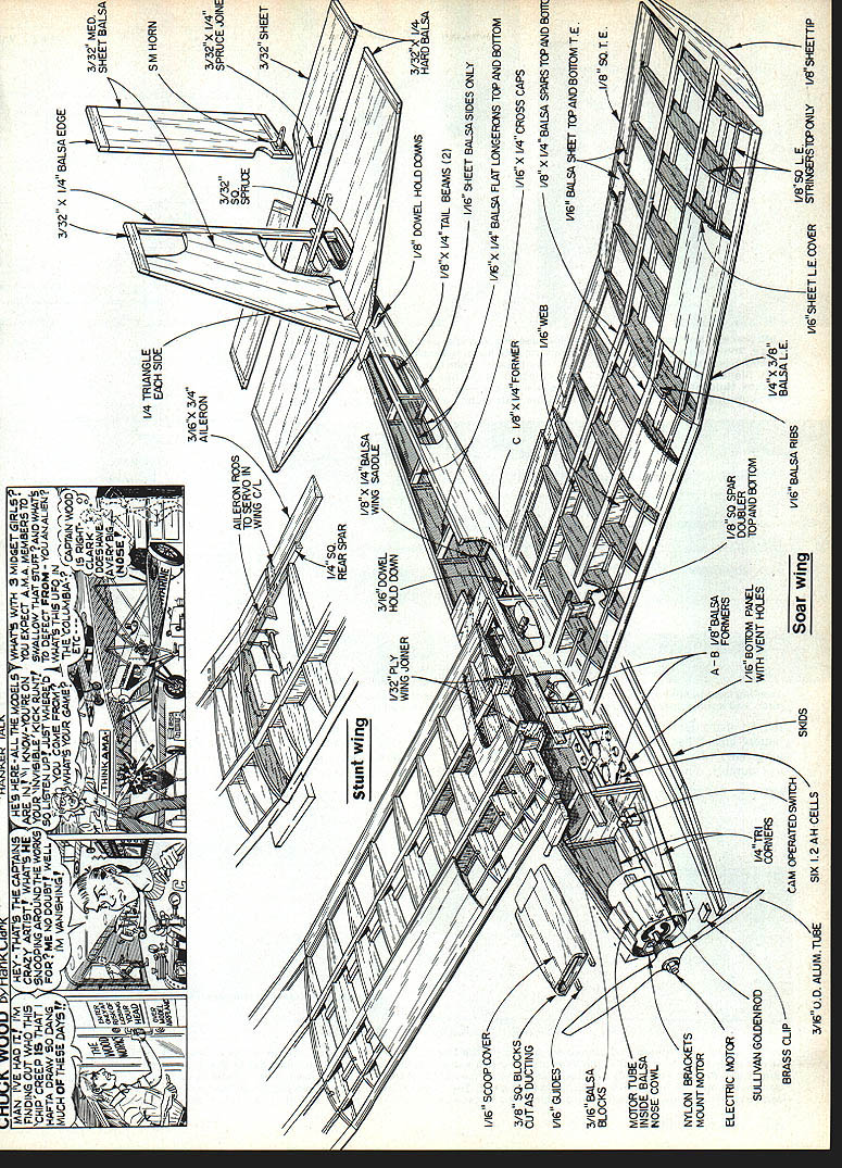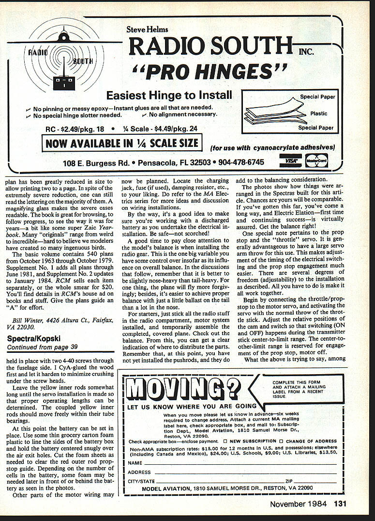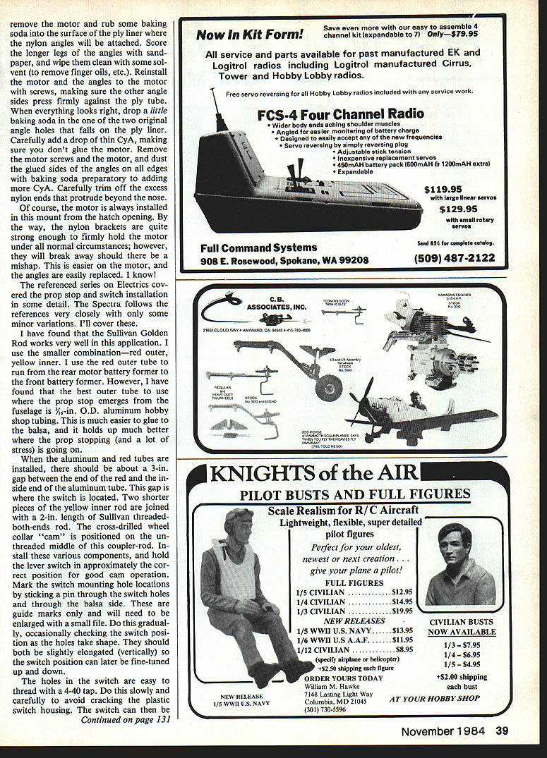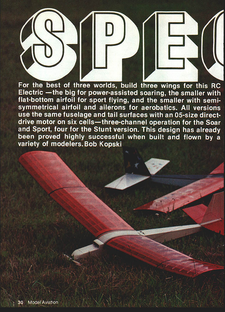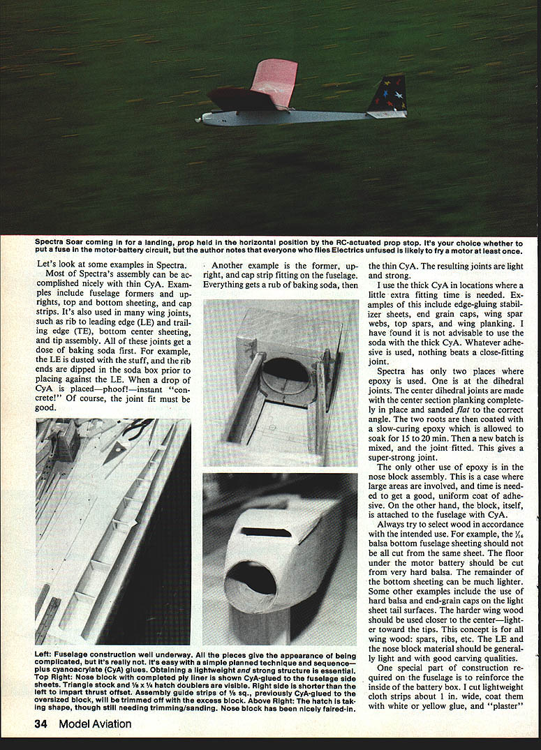 NO OCR TEXT NO OCR TEXT Spectra Stunt mildly aerobatic model semi-symmetrical airfoil ailer ons Its sort powered slope machine versions Spectra use same fuse lage tail assembly radio installation can use same power system can take pick can build wings Spectra design represents lot lessons learned over nearly decade Electric flying structure designed specifically light same time strong needed durable can reasonable care survive season after season hundreds flights least six Spectras have built fellow modelers have proven highly successful trouble ever encountered proved result wing warp have just tuned-in Electrics let suggest go find back issues MA beginning September 1983 issue read 10-part series Electrics sure read new RC Electrics column began July column already contains plenty useful information applicable Spectra Electrics general can youre waiting Spectra plans arrive reading should provide reasonable acquaintance things Electric Spectra should get air newest model motive methods Im going assume readers pretty good builders relatively new Electrics text will discuss about models nature usual step-by-step assembly instructions find some aspect presentation seems thin hard understand dont forget check references given above Now youre switched lets get some particulars Fuselage Lets start describing design makeup call modi fied box fuselage concept de scribed detail March 1984 MA first unusual thing may notice motor mount shapely nose block requires some unusual easy assembly work accomplish plans photos should give pretty good idea deal July MA should remove doubt nose block motor mount functional good looking Just aft motor mount wiring compartment accessed remov ing air scoop-hatch motor can inserted area houses charging jack ON-OFF switch fuse damping resistor plenty room work everything Next line motor battery com partment defined strong form ers fore aft fuselage sides bottom wing place battery compartment also cooling chamber Air entering scoop flows compartment among indi vidual cells flows out through holes floor compartment designed hold up eight 12 Ah cells although often used number six radio compartment behind motor battery large enough hold variety radio systems lightest equipment recommended best per formance installations shown made using double-sticky-backed Velcro technique described January February 1984 issues course con ventional mounting methods may used remainder fuselage merely way connecting tail assembly everything else keeping pushrods out breeze structure shown does job adequate strength minimal weight nearly dif ficult build may appear first glance references have told its worth repeating very important build strong lightweight model struc tures Electric power Some quick-and-dirty slap-it-together tech niques everyone knows also very heavy think Electrics have failed fly satisfactorily because being too heavy other reason set tone Spectra fuselage struc ture weighs less 2% oz ready cover holds 11/2 lb power parts radio Tail assembly can held fuselage rubberbands favorite method glued simpler allsheet surfaces easily made can very light strong Two such completely covered ready fly assem blies weigh total 2% oz may notice simple sheet structure still lot pieces hard balsa end-grain caps add great deal strength warp resistance should omitted Neither should iron-on cloth shown omitted spruce used rubber-held option except eleva tor joiner always required rudder elevator hinged favorite hinging materialtape see April MA course can use own favorite method Wings optional Spectra wing choic es course determine nature plane flying versions shown 32 Model Aviation Spectra Stunt wing equipped capable sustained inverted flight seml-symmelrlcal arTuu ii maneuvers marginai outside ioops Spectra Sport has same size wing Spectra Stunt airfoil fiat-bottomed ailerons omitted its suited windy-weatherflylng Spectra Soar have built flown fly very well can choose appealing version build em Well look detail help choose First some comments multi-purpose Spectra concept basic airplane results longterm averaging accumulation model designs design experience Roughly means blend models Ive seen and/or flown over years version very safe configuration opinion offering virtually no opportunity anything go wrong some variation nominals given herein particular Spectra design utilizes time-honored set moments areas pretty much has fly well fuselage tail assembly constants offer nothing extra ordinaryno limits pushed Im satis fied reasonable wing configura tion strapped nominal fuselage tail will fly gratifyingly well nothing magical Soar airfoil long-proven glider favorite East section l21Ao flat-bottom type turbulators Im personally Soaring think section may have lost popularity recent years favor thinner smoother semi-symmetrical competi tion airfoils Soar airfoil shown plans flies model very well thermalling machine popu lar rendition Spectra Keystone RC Club KRC field routine 12 13 mm glider-type flying sounds appeal ing Soar version serious glider enthusiasts may like Soar idea prefer alterna tive wing sectionsomething suited experience part country Go ahead Just sure keep lightweight adequate strength mind use Sport designation mean Spectra wing moderate span no ailerons reasonable airfoil shown 10% thick flat bottom 50-in span section flies faster Soar version because thinner used higher wing loading combination therefore penetrates higher wind conditions Often have some misgivings about wind conditions given day take both Soar Sport wings fly ing field try both determine pleasurable circumstanc es As Soar section Sport sec tion invented Rather adopted having used several models going back 1950s illustrate versatility design fellow modeler built Sport-size wing Soar air foilan in-between Spectra Sport version actually makes best trainer bunch Stunt wing same size Sport wing configured ailerons semi-symmetrical section surface area Spectra Stunt capable sustained inverted flight rol