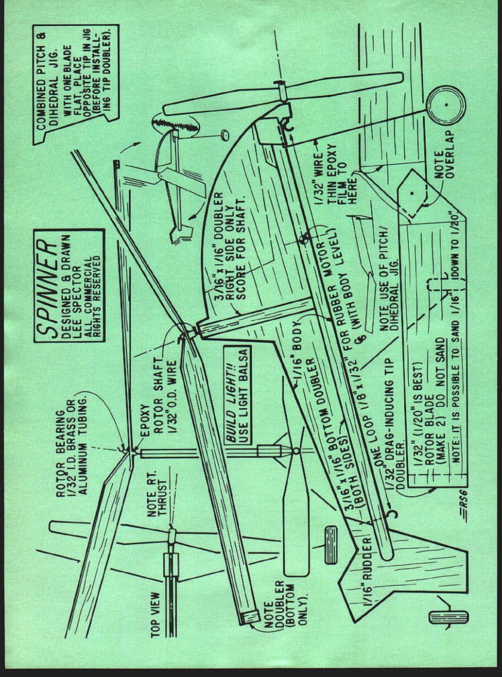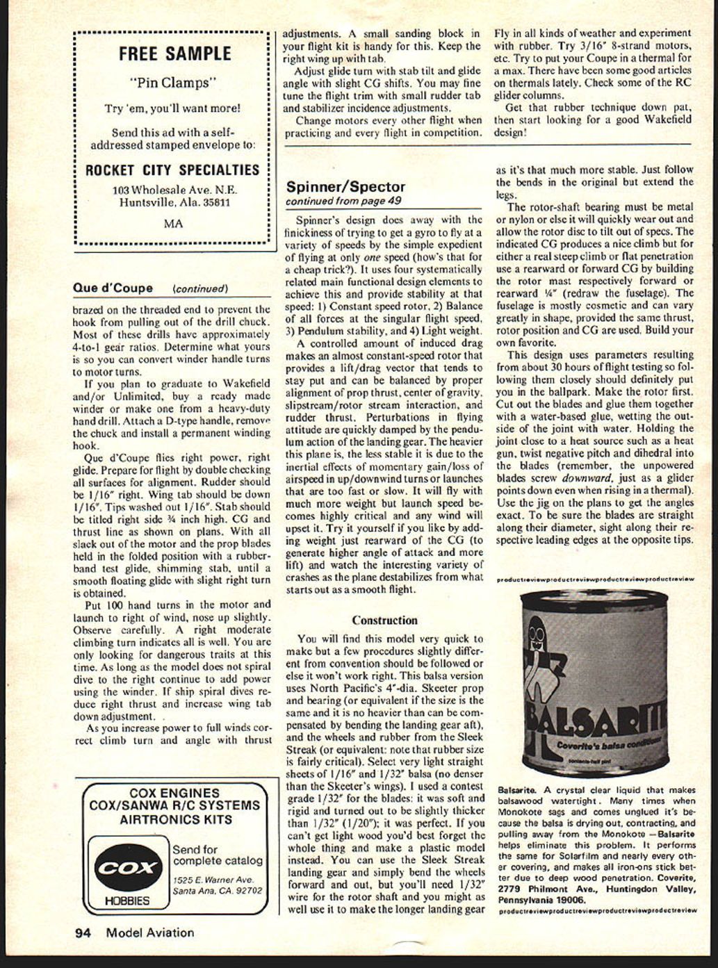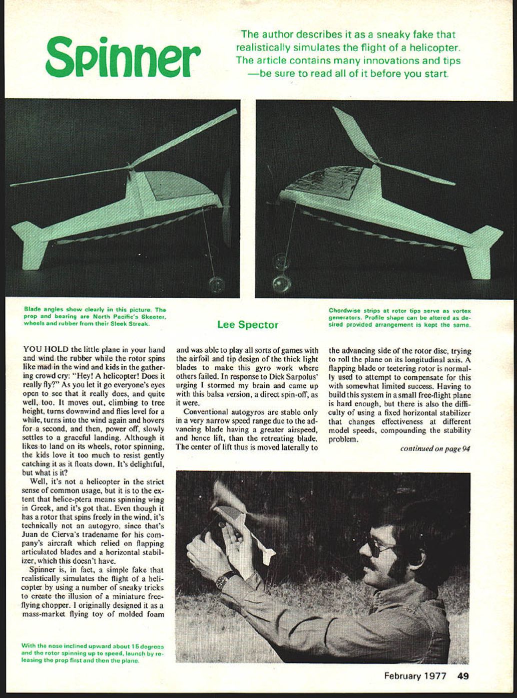 NO OCR TEXT Spinner author describes sneaky fake realistically simulates flight helicopter article contains innovations tips sure read before start Lee Spector YOU HOLD little plane hand wind rubber rotor spins like mad wind kids gather ing crowd cry Hey helicopter Does really fly As let go everyones eyes open see really does quite well too moves out climbing tree heigbt turns downwind flies level turns wind again hovers second power off slowly settles graceful landing Although likes land its wheels rotor spinning kids love too much resist gently catching it floats down Its delightful what Well its helicopter strict sense common usage ex tent helice-ptera means spinning wing Greek its got though has rotor spins freely wind its technically autogyro since thats Juan de Ciervas tradename com panys aircraft relied flapping articulated blades horizontal stabil izer doesnt have Spinner fact simple fake realistically simulates flight heli copter using number sneaky tricks create illusion miniature freeflying chopper originally designed mass-market flying toy molded foam nose inclined upward about 15 degrees rotor spinning up speed launch re leasing prop first plane able play sorts games airfoil tip design thick light blades make gyro work others failed response Dick Sarpolus urging stormed brain came up balsa version direct spin-off Conventional autogyros stable very narrow speed range due ad vancing blade having greater airspeed hence lift retreating blade center lift thus moved laterally advancing side rotor disc trying roll plane its longitudinal axis flapping blade teetering rotor normal ly used attempt compensate somewhat limited success Having build system small free-flight plane hard enough also diffi culty using fixed horizontal stabilizer changes effectiveness different model speeds compounding stability problem February 1977 49 Blade angles show clearly picture Th prop bearing North Pacifics Skeeter wheels rubber Sleek Streak Chordwise strips rotor tips serve vortex generators Profile shape can altered de sired provided arrangement kept same continued page 94 FREE SAMPLE Pin Clamps Try em youll want Send ad selfaddressed stamped envelope ROCKET CITY SPECIALTIES 103 Wholesale Ave NE Huntsville Ala 35811 MA Que dCoupecontinued brazed threaded end prevent hook pulling out drill chuck Most drills have approximately 4-to-i gear ratios Determine what yours can convert winder handle turns motor turns plan graduate Wakefield and/or Unlimited buy ready made winder make heavy-duty hand drill Attach D-type handle remove chuck install permanent winding hook Que dCoupe flies right power right glide Prepare flight double checking surfaces alignment Rudder should 1/16 right Wing tab should down 1/16 Tips washed out 1/16 Stab should titled right side high CU thrust line shown plans slack out motor prop blades held folded position rubberband test glide shimming stab until smooth floating glide slight right turn obtained Put 100 hand turns motor launch right wind nose up slightly Observe carefully right moderate climbing turn indicates well looking dangerous traits time As long model does spiral dive right continue add power using winder ship spiral dives re duce right thrust increase wing tab down adjustment As increase power full winds cor rect climb turn angle thrust adjustments small sanding block flight kit handy Keep right wing up tab Adjust glide turn stab tilt glide angle slight CU shifts may fine tune flight trim small rudder tab stabilizer incidence adjustments Change motors other flight practicing flight competition Spinner/Spector continued page 49 Spinners design does away fin ickiness trying get gyro fly variety speeds simple expedient flying speed hows cheap trick uses four systematically related main functional design elements achieve provide stability speed 1 Constant speed rotor 2 Balance forces singular flight speed 3 Pendulum stability 4 Light weight controlled amount induced drag makes almost constant-speed rotor provides lift/drag vector tends stay put can balanced proper alignment prop thrust center gravity slipstream/rotor stream interaction rudder thrust Perturbations flying attitude quickly damped pendu lum action landing gear heavier plane less stable due inertial effects momentary gain/loss airspeed up/downwind turns launches too fast slow will fly much weight launch speed comes highly critical wind will upset Try yourself like add ing weight just rearward CU generate higher angle attack lift watch interesting variety crashes plane destabilizes what starts out smooth flight Construction will find model very quick make few procedures slightly differ ent convention should followed else wont work right balsa version uses North Pacifics 4-dia Skeeter prop bearing equivalent size same no heavier can com pensated bending landing gear aft wheels rubber Sleek Streak equivalent note rubber size fairly critical Select very light straight sheets 1/16 1/32 balsa no denser Skeeters wings used contest grade 1/32 blades soft rigid turned out slightly thicker 1/32 1/20 perfect cant get light wood youd best forget whole thing make plastic model instead can use Sleek Streak landing gear simply bend wheels forward out youll need 1/32 wire rotor shaft might well use make longer landing gear Fly kinds weather experiment rubber Try 3/16 8-strand motors etc Try put Coupe thermal max have some good articles thermals lately Check some RC glider columns Get rubber technique down pat start looking good Wakefield design its much stable Just follow bends original extend legs rotor-shaft bearing must metal nylon else will quickly wear out allow rotor disc tilt out specs indicated CG produces nice climb either real steep climb flat penetration use rearward forward CU building rotor mast respectively forward rearward aw fuselage fuselage mostly cosmetic can vary greatly shape provided same thrust rotor position CU used Build own favorite design uses parameters resulting about 30 hours flight testing fol lo