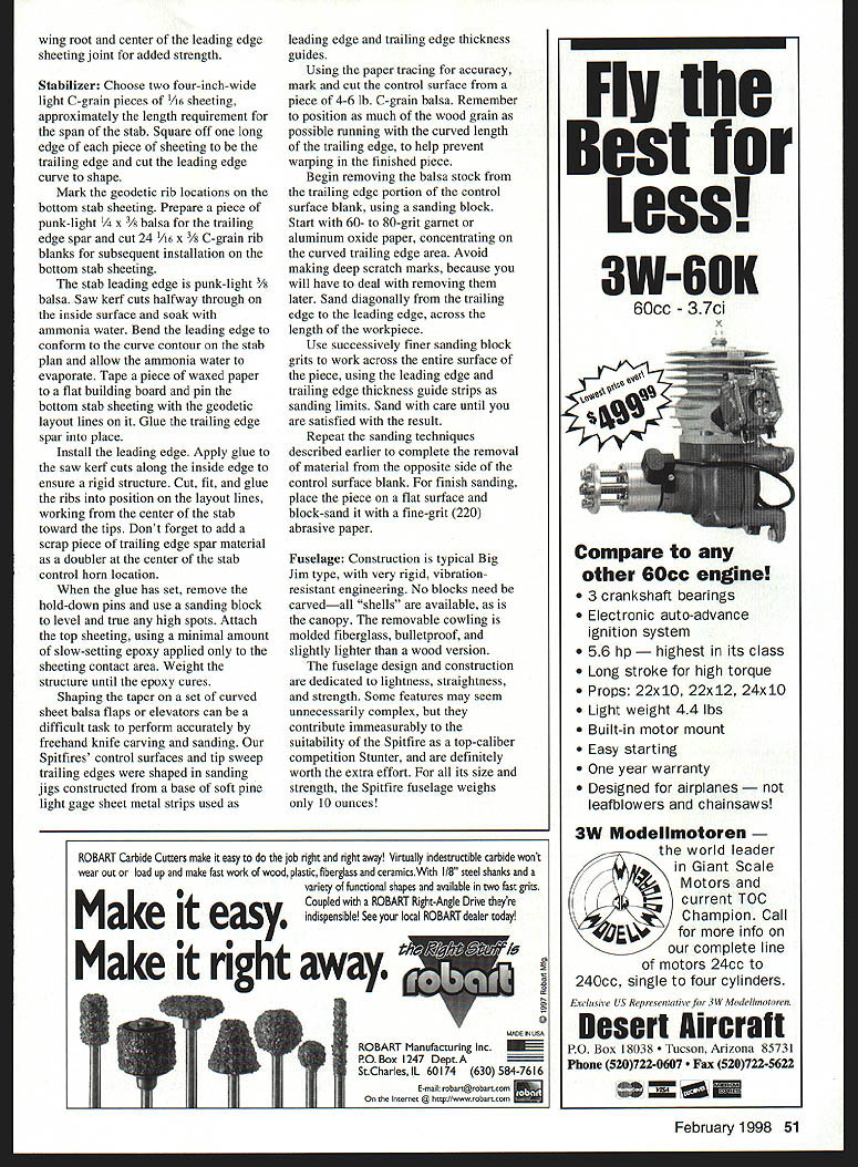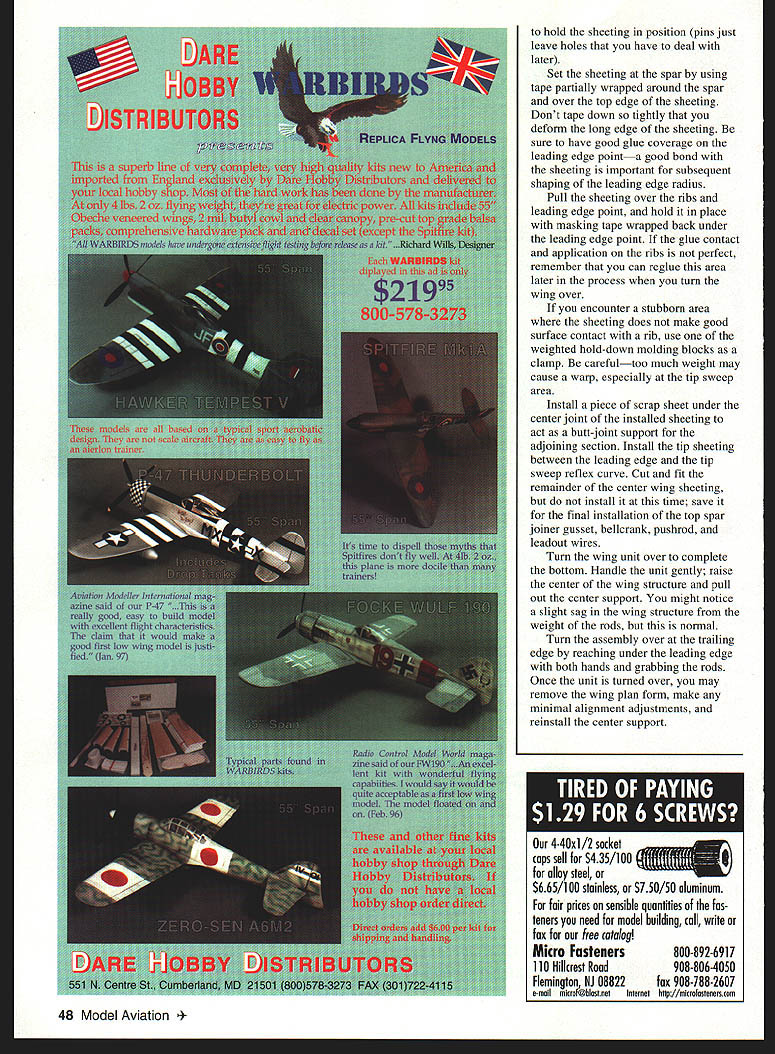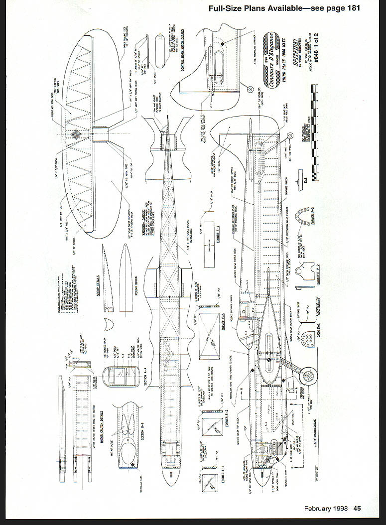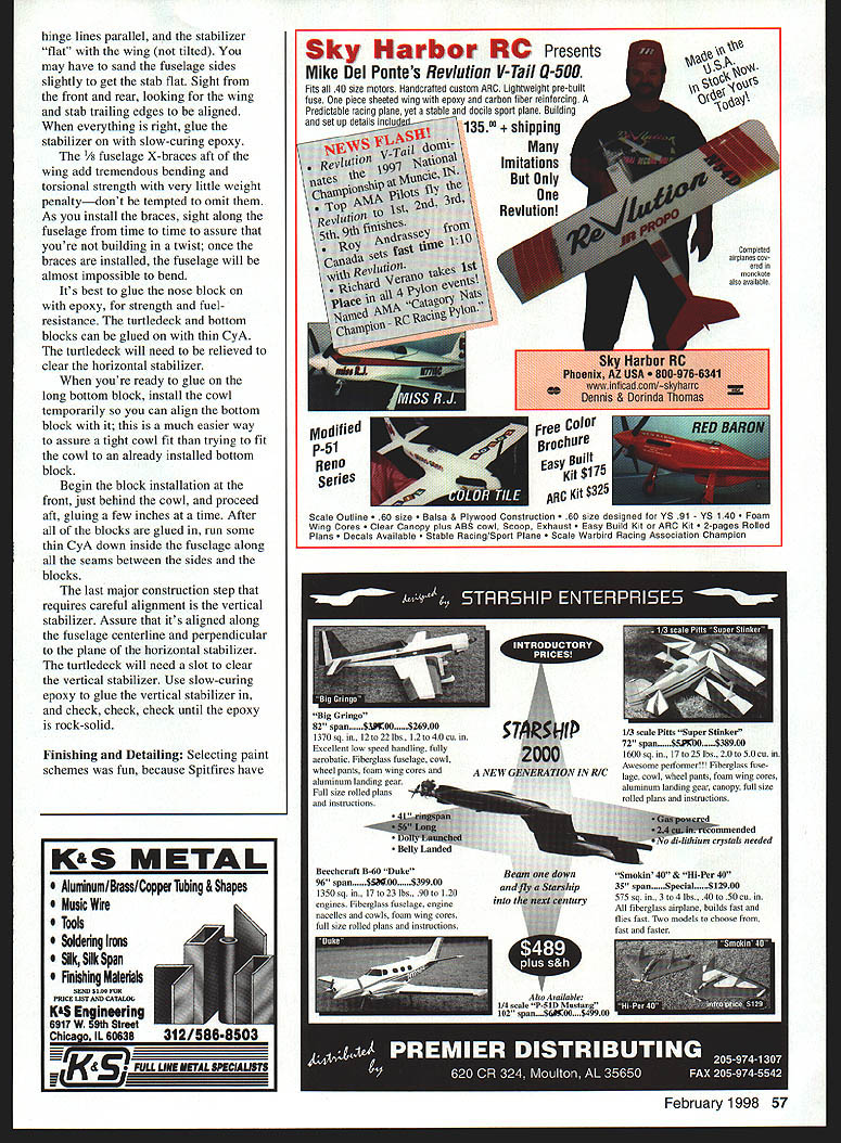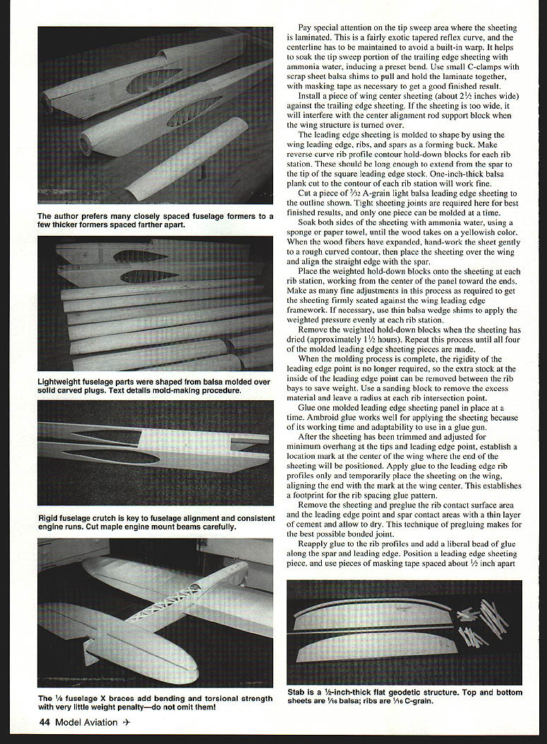bhI U Windy Urtnowski & Joe Adamusko Joe Adamusko have shared love Spitfires years spring 1995 committed what ultimately Spitfire Project Little did realize just all-consuming project would become people would contribute significantly final outcome Bob Martens created finest sets drawings CL Stunter did drawings actual parts templates used construct original two Spitfire models Ed Gallagher instrumental composite material work expert machining spinner male molds backplates Ron Kieffer anodizing George Venturini vacuumforming canopies done Dave Midgley As design evolving went back forth almost endlessly Joe drew up plans postman commented increase mail spring Joe massaged drawings made changes eventually arrived design see didnt come easily cheaply quickly result exactly what minds eyes beginning airfoil pure Patternmaster Big Jim Greenaway designer Pattemmaster has gift fine wing design help feedback instrumental finalizing aspects Spitfires areas force arrangements wanted dead-reliable motor runs WW II fighter sound chose Big Jim Superigre 60 hemis decided project should incorporate features seldom ever seen world pro Stunt among Molded leading-edge sheeting Aft top deck bottom block nose block shaped balsa molded over solid carved plugs Geodetic horizontal stabilizer construction Handmade fiberglass spinners cowlings Five-bladed carbon-fiber/epoxy composite props Composite molded nonfunctional exhaust stacks landing gear details 40 Model Aviation os Author Graphic Design Carla Kunz hardest part make carbon-fiber prop couple two-blade props made develop refine molding techniques five-blade tackled After trying U Iir props ultimately usedElresins curing agents Epon 815 TETA came out topk Joe thrilled after test flew others models found well performed Lightning-bolt corners smooth rounds sound throbbing power invasion stripes five-blade props roundelsit truly adventure CONSTRUCTION Wing One reason Spitfires havent modeled wing can complex build Using method Joe devised isnt really very difficult results what Joe calls wicked beauty straight rigid warp-free wing prerequisite Stunt model thats chose use proven rib alignment rod support block method Spitfire technique also lends itself process molding balsa leading edge sheeting rods type 303 stainless steel 3/ x 60 inches can obtained random lengths industrial supply company weight steel rods aids keeping wing assembly alignment rod end support blocks center support block made 3/4 soft pine end support blocks 3 x 7 inches 3/ holes drilled centerline spaced 2A inches apart narrow rod spacing ensures both rod ends exit R-9 tip rib thus allowing trailing edge tip sweep constructed alignment rods installed February 1998 41 Polyester resin-cast exhaust stacks add another touch realism ends hollowed burr grinding tool Canopy molded hand-carved plug Dave Midgicy Rivet details done hand ink Note left-side window Joe Adamusko model combination finished 16th 1996 Nats also won Rookie Year Type CL Stunt Wingspan 62 inches Engine SuperTigre 60 Construction Built-up Finish Sig dope wooden support blocks must have accurate hole locations must correspond rib hole centerlines wooden outer support blocks center support must allow adequate clearance between bottom rib profile flat building surface rods support blocks partiallyassembled wing must turned over complete construction /2-inch-thick plate glass building surface 12 x 65 inches used top flat building board permits shimming plate glass dead-level condition allows rotating wing construction fixture easy access leading edge trailing edge working bench level Cut paper rib profile outlines out very accurately pair scissorsmaking copies rib outlines will save plans Dont cut leading edge notch spar notches leadout rib clearance holes rod alignment holes time Use 3M Spray MountTM artists adhesive fasten paper rib outlines /s light C-grain balsa sheet allows easy removal paper outline later leaves very small amount residue Cut rib outlines balsa sheet allowing about A2 excess beyond paper outline use sanding block shape rib contours paper outlines Cut rib leading edge notches fit leading edge spar notches fit balsa spar material sure keep rib outline form attached rib blank Use piece 3/ diameter brass tubing sharpened around inside edge cut holes alignment support rods rib blank Shape two spar joint bellcrank support gussets floating bellcrank support pin rock-hard maple drill holes both pieces same time trailing edges re medium B-grain balsa tapered inch sure leading edge shaped piece matches profile thickness rib trailing edge leading edge punk-light 3/s square balsa spars re medium Bgrain balsa Insert rod ends through holes wooden inner wing panel support block Allow rod go through about /2 inch wind two wraps masking tape rod ends cant back out holes slide ribs Start inboard R-9 tip rib slide full length rods approximate position over wing plan layout Repeat until complete positioning inboard ribs Use center support piece temporary clearance blocking hold rods inboard ribs off work surface Slide outer wing panel R- 1 root rib onto rods position over wing plan Repeat until outboard R-9 tip rib placed onto rods Install outer alignment rod support block tape rod ends cant work out openings ribs rods align wing plan using right triangle tn-square Make sure minimum inch clearance between tip ribs rod alignment support blocks Install rod center support block clamp screw ensure rods cant pivot during construction Attach shaped trailing edge tapered tip sweeps Add 3/ square leading edge material use 450 angle joint center allow surface contact area strength joint bend leading edge severe toward tips saw kerf cuts inside surface material assist bending process necessary glue saw cuts because inside stock between rib bays will removed later Install bottom top re spars sure spars flush top rib profile prevent uneven leading edge sheeting installation spars will bend curvature rib profile thickness toward tips Use lo