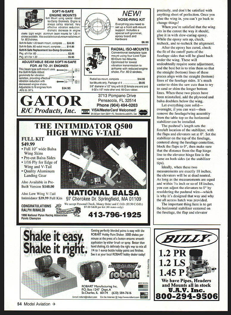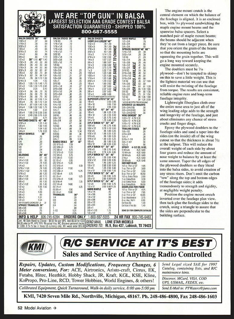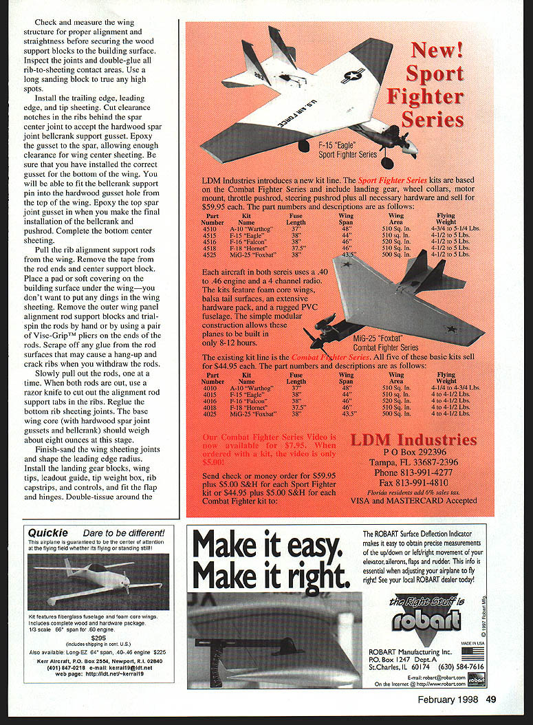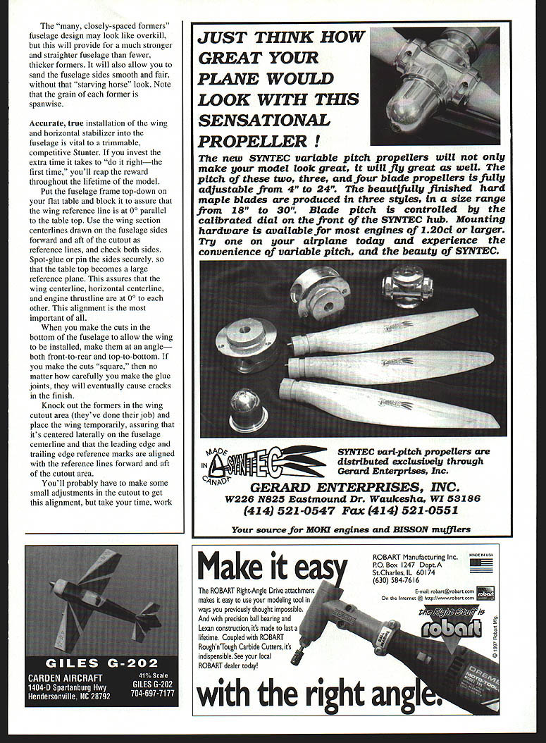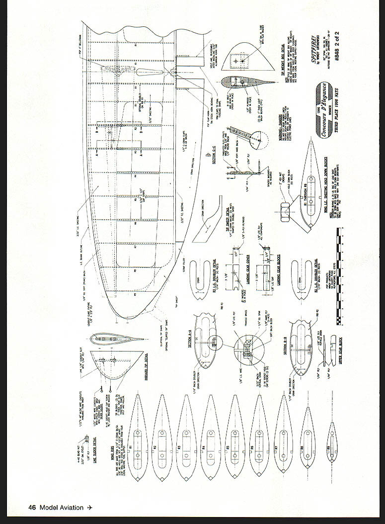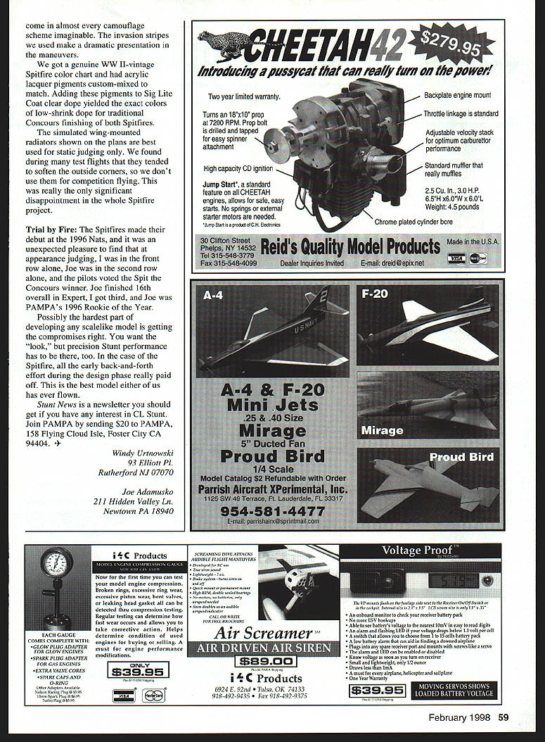 bhI U Windy Urtnowski & Joe Adamusko Joe Adamusko have shared love Spitfires years spring 1995 committed what ultimately Spitfire Project Little did realize just all-consuming project would become people would contribute significantly final outcome Bob Martens created finest sets drawings CL Stunter did drawings actual parts templates used construct original two Spitfire models Ed Gallagher instrumental composite material work expert machining spinner male molds backplates Ron Kieffer anodizing George Venturini vacuumforming canopies done Dave Midgley As design evolving went back forth almost endlessly Joe drew up plans postman commented increase mail spring Joe massaged drawings made changes eventually arrived design see didnt come easily cheaply quickly result exactly what minds eyes beginning airfoil pure Patternmaster Big Jim Greenaway designer Pattemmaster has gift fine wing design help feedback instrumental finalizing aspects Spitfires areas force arrangements wanted dead-reliable motor runs WW II fighter sound chose Big Jim Superigre 60 hemis decided project should incorporate features seldom ever seen world pro Stunt among Molded leading-edge sheeting Aft top deck bottom block nose block shaped balsa molded over solid carved plugs Geodetic horizontal stabilizer construction Handmade fiberglass spinners cowlings Five-bladed carbon-fiber/epoxy composite props Composite molded nonfunctional exhaust stacks landing gear details 40 Model Aviation os Author Graphic Design Carla Kunz hardest part make carbon-fiber prop couple two-blade props made develop refine molding techniques five-blade tackled After trying U Iir props ultimately usedElresins curing agents Epon 815 TETA came out topk Joe thrilled after test flew others models found well performed Lightning-bolt corners smooth rounds sound throbbing power invasion stripes five-blade props roundelsit truly adventure CONSTRUCTION Wing One reason Spitfires havent modeled wing can complex build Using method Joe devised isnt really very difficult results what Joe calls wicked beauty straight rigid warp-free wing prerequisite Stunt model thats chose use proven rib alignment rod support block method Spitfire technique also lends itself process molding balsa leading edge sheeting rods type 303 stainless steel 3/ x 60 inches can obtained random lengths industrial supply company weight steel rods aids keeping wing assembly alignment rod end support blocks center support block made 3/4 soft pine end support blocks 3 x 7 inches 3/ holes drilled centerline spaced 2A inches apart narrow rod spacing ensures both rod ends exit R-9 tip rib thus allowing trailing edge tip sweep constructed alignment rods installed February 1998 41 Polyester resin-cast exhaust stacks add another touch realism ends hollowed burr grinding tool Canopy molded hand-carved plug Dave Midgicy Rivet details done hand ink Note left-side window Joe Adamusko model combination finished 16th 1996 Nats also won Rookie Year Type CL Stunt Wingspan 62 inches Engine SuperTigre 60 Construction Built-up Finish Sig dope wooden support blocks must have accurate hole locations must correspond rib hole centerlines wooden outer support blocks center support must allow adequate clearance between bottom rib profile flat building surface rods support blocks partiallyassembled wing must turned over complete construction /2-inch-thick plate glass building surface 12 x 65 inches used top flat building board permits shimming plate glass dead-level condition allows rotating wing construction fixture easy access leading edge trailing edge working bench level Cut paper rib profile outlines out very accurately pair scissorsmaking copies rib outlines will save plans Dont cut leading edge notch spar notches leadout rib clearance holes rod alignment holes time Use 3M Spray MountTM artists adhesive fasten paper rib outlines /s light C-grain balsa sheet allows easy removal paper outline later leaves very small amount residue Cut rib outlines balsa sheet allowing about A2 excess beyond paper outline use sanding block shape rib contours paper outlines Cut rib leading edge notches fit leading edge spar notches fit balsa spar material sure keep rib outline form attached rib blank Use piece 3/ diameter brass tubing sharpened around inside edge cut holes alignment support rods rib blank Shape two spar joint bellcrank support gussets floating bellcrank support pin rock-hard maple drill holes both pieces same time trailing edges re medium B-grain balsa tapered inch sure leading edge shaped piece matches profile thickness rib trailing edge leading edge punk-light 3/s square balsa spars re medium Bgrain balsa Insert rod ends through holes wooden inner wing panel support block Allow rod go through about /2 inch wind two wraps masking tape rod ends cant back out holes slide ribs Start inboard R-9 tip rib slide full length rods approximate position over wing plan layout Repeat until complete positioning inboard ribs Use center support piece temporary clearance blocking hold rods inboard ribs off work surface Slide outer wing panel R- 1 root rib onto rods position over wing plan Repeat until outboard R-9 tip rib placed onto rods Install outer alignment rod support block tape rod ends cant work out openings ribs rods align wing plan using right triangle tn-square Make sure minimum inch clearance between tip ribs rod alignment support blocks Install rod center support block clamp screw ensure rods cant pivot during construction Attach shaped trailing edge tapered tip sweeps Add 3/ square leading edge material use 450 angle joint center allow surface contact area strength joint bend leading edge severe toward tips saw kerf cuts inside surface material assist bending process necessary glue saw cuts because inside stock between rib bays will removed later Install bottom top re spars sure spars flush top rib profile prevent uneven leading edge sheeting installation spars will bend curvature rib profile thickness toward tips Use lo