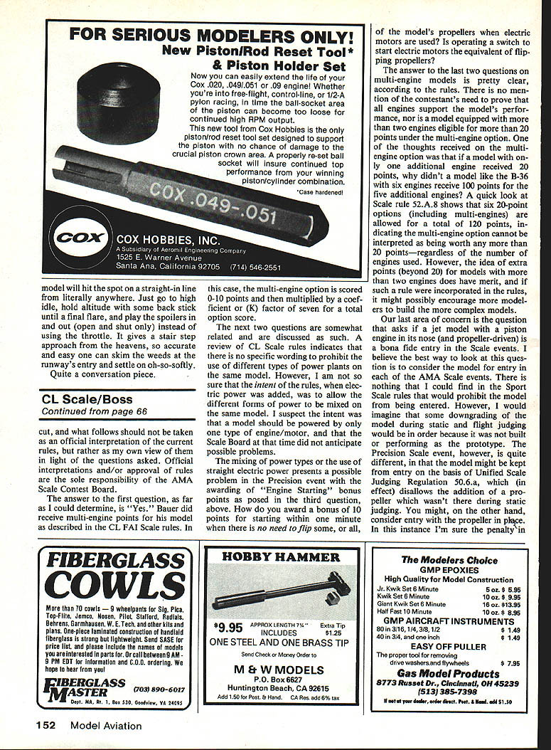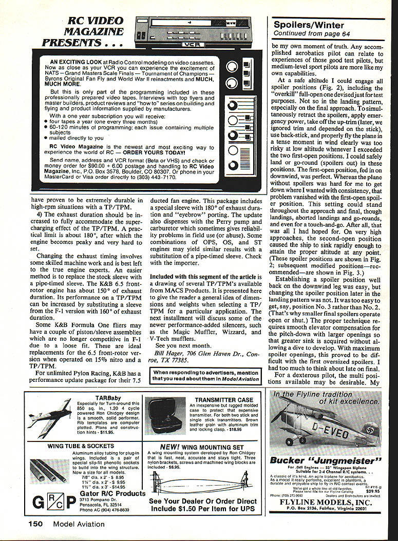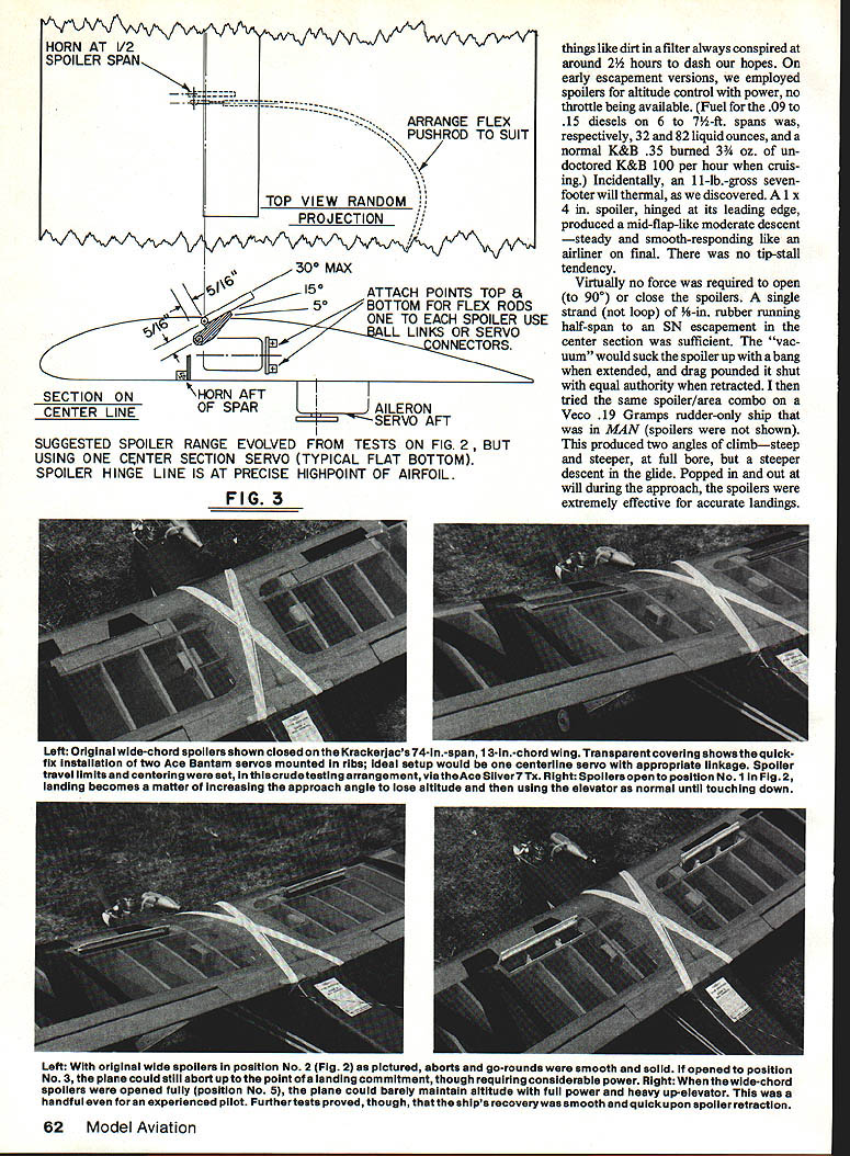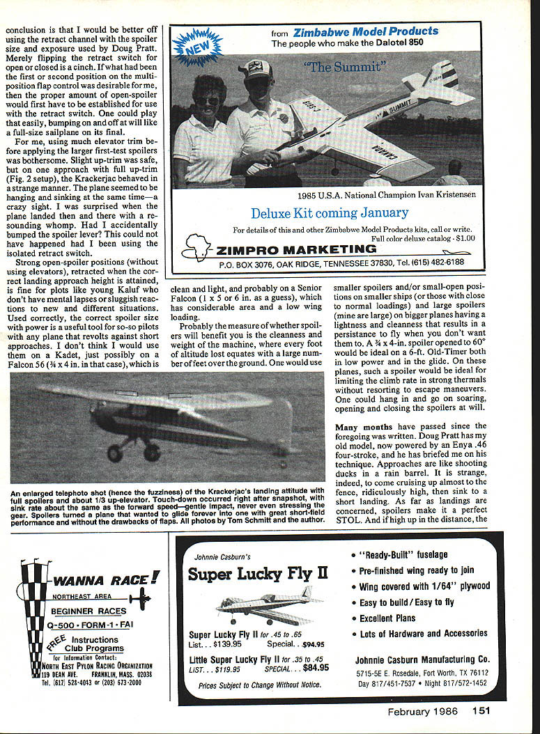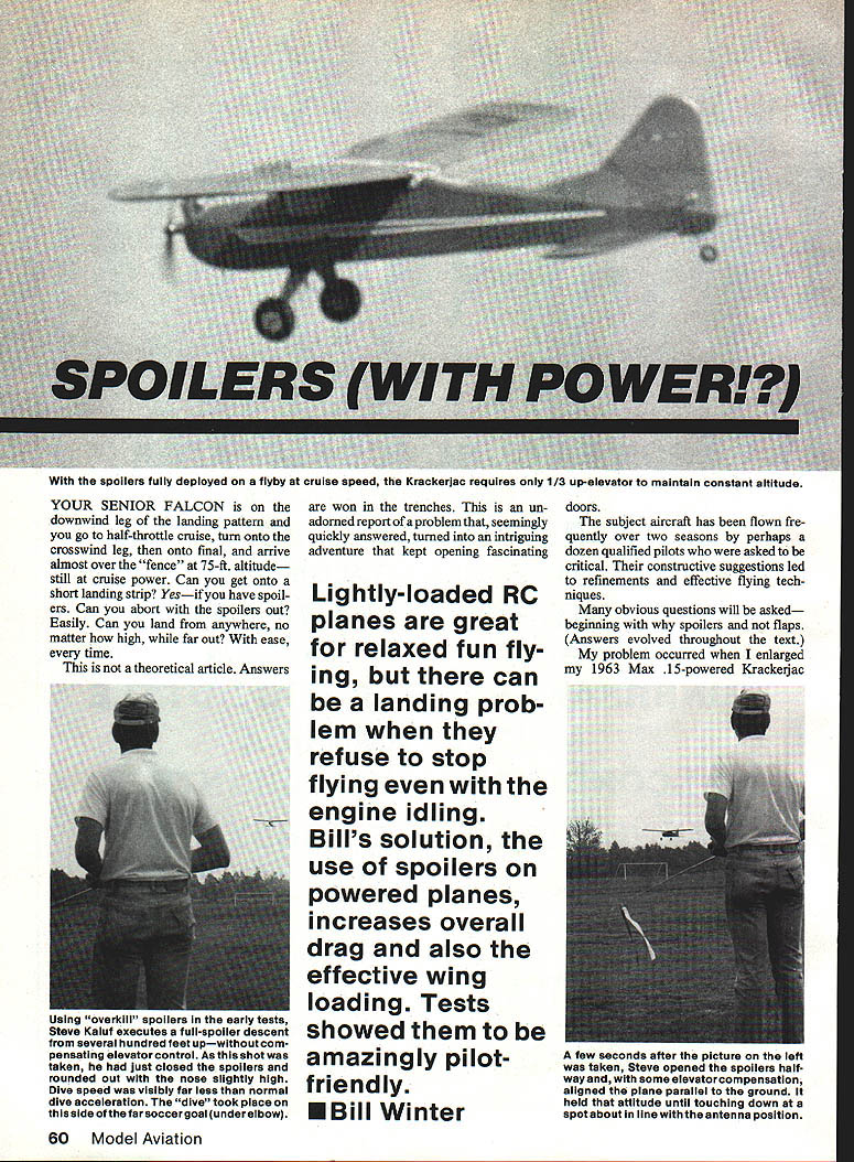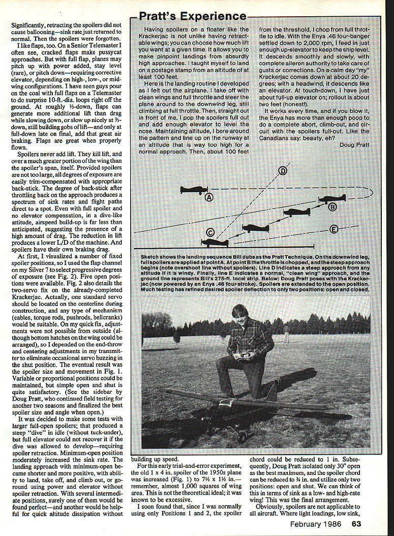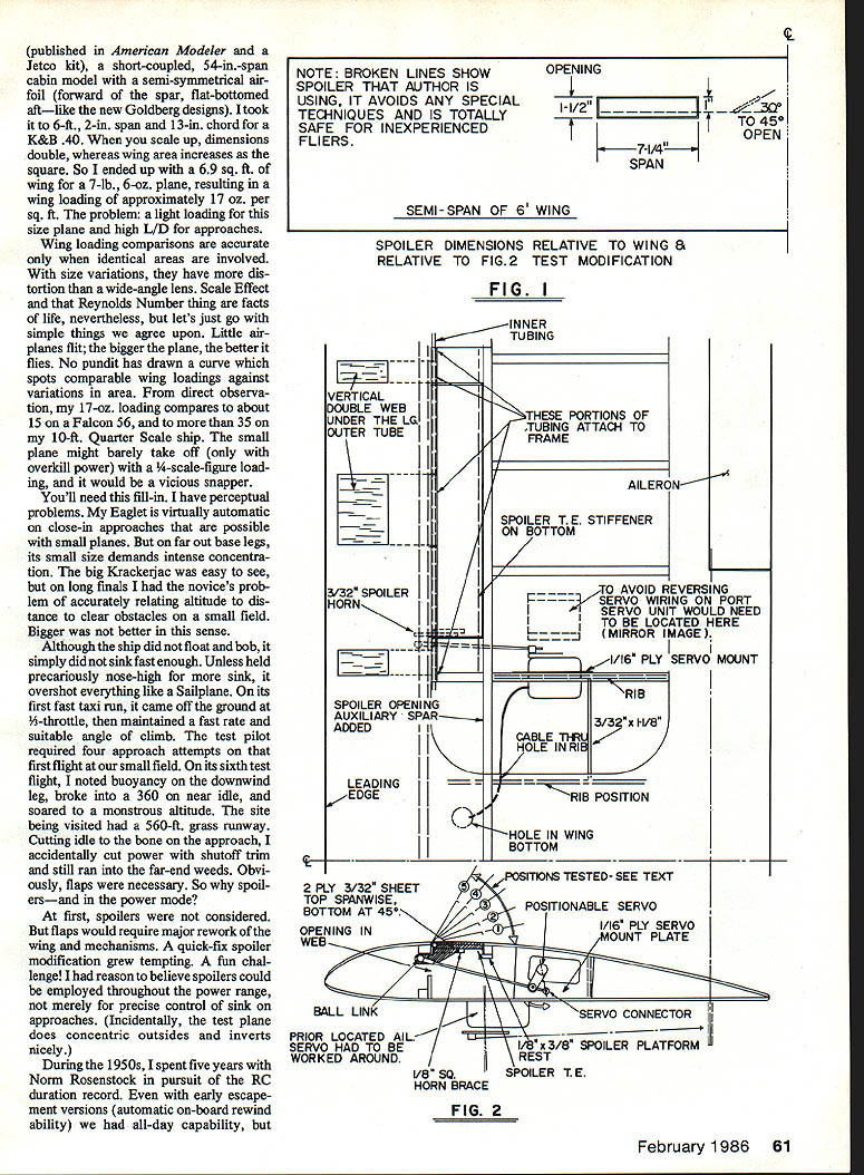 With spoilers fuiiy deployed flyby cruise speed Krackerjac requires 1/3 up-elevator maintain constant altitude YOUR SENIOR FALCON downwind leg landing pattern go half-throttle cruise turn onto crosswind leg onto final arrive almost over fence 75-ft altitude still cruise power Can get onto short landing strip Yesif have spoil ers Can abort spoilers out Easily Can land anywhere no matter high far out ease time theoretical article Answers won trenches un adorned report problem seemingly quickly answered turned intriguing adventure kept opening fascinating Lightly-loaded RC planes great relaxed fun fly ing can landing prob lem refuse stop flying engine idling Bills solution use spoilers powered planes increases overall drag also effective wing loading Tests showed amazingly pilotfriendly U Bill Winter doors subject aircraft has flown fre quently over two seasons perhaps dozen qualified pilots asked critical constructive suggestions led refinements effective flying tech mques obvious questions will asked beginning spoilers flaps Answers evolved throughout text problem occurred enlarged 1963 Max 15-powered Krackerjac few seconds after picture left taken Steve opened spoilers half way some elevatorcompensation aligned plane parallel ground held attitude until touching down spotaboutin line antenna position 60 Model Aviation Using overkill spoilers early tests Steve Kaluf executes full-spoiler descent several hundred feet upwlthoutcom pensating elevator control As shot taken just closed spoilers rounded out nose slightly high Dive speed visibly far less normal dive acceleration dive took place thisside ofthefarsoccergoalunderelbow published American Modeler Jetco kit short-coupled 54-in-span cabin model semi-symmetrical air foil forward spar flat-bottomed aftlike new Goldberg designs took 6-ft 2-ni span 1 3-in chord K&B 40 scale up dimensions double whereas wing area increases square So ended up 69 sq ft wing 7-lb 6-oz plane resulting wing loading approximately 17 oz per sq ft problem light loading size plane high L/D approaches Wing loading comparisons accurate identical areas involved size variations have dis tortion wide-angle lens Scale Effect Reynolds Number thing facts life nevertheless lets just go simple things agree upon Little air planes flit bigger plane better flies No pundit has drawn curve spots comparable wing loadings against variations area direct observa tion 17-oz loading compares about 15 Falcon 56 35 10-ft Quarter Scale ship small plane might barely take off overkill power -scale-figure load ing would vicious snapper Youll need fill-in have perceptual problems Eaglet virtually automatic close-in approaches possible small planes far out base legs its small size demands intense concentra tion big Krackeijac easy see long finals novices prob lem accurately relating altitude dis tance clear obstacles small field Bigger better sense Although ship did float bob simply did sink fast enough Unless held precariously nose-high sink overshot everything like Sailplane its first fast taxi run came off ground Wthrottle maintained fast rate suitable angle climb test pilot required four approach attempts first flight small field its sixth test flight noted buoyancy downwind leg broke 360 near idle soared monstrous altitude site being visited 560-ft grass runway Cutting idle bone approach accidentally cut power shutoff trim still ran far-end weeds Obvi ously flaps necessary So spoil ersand power mode first spoilers considered flaps would require major rework wing mechanisms quick-fix spoiler modification grew tempting fun chal lenge reason believe spoilers could employed throughout power range merely precise control sink approaches Incidentally test plane does concentric outsides inverts nicely During 195 Os spent five years Norm Rosenstock pursuit RC duration record early escape ment versions automatic on-board rewind ability all-day capability SPOILER DIMENSIONS RELATIVE TO WING 8 RELATIVE TO FIG2 TEST MODIFICATION FIG II 7I VERTICAL 0UBLE WEB JNDER THE LG OUTER TUBE ] /32 SPOiLER HORN [Z SPOILER OPEN AUXILIARY SF ADDED LEADING -EDGE NG / / / INNER TUBING THESE PORTIONS OF TUBING ATTACH TO FRAME AILER SPOILER T E STIFFENER ON BOTTOM TO AVOID F IA7Xp0 E LOC HMIRROR ~I/I6 PLY = 1111L HOLE INRIE Ii "RIB 3/32x I-I/B RIB POSITION -HOLE IN WING BOTTOM TOP SPANWISE BOT-rOM AT 45POSITIONABLE SERVO PRIOR LOCATED AIL- SERVO HAD TO BE I8x 3/8 SPOILER PLATFORM WORKED AROUND SPOILER T E HORN BRACE FIG 2 February 1986 61 NOTE BROKEN LINES SHOWOPENING SPOILER THAT AUTHOR ISj USING IT AVOIDS ANY SPECIAL TECHNIQUES AND IS TOTALLY3QO TO 45 SAFE FOR INEXPERIENCEDIOPEN FLIERS 7-1/4 SPAN SEMI-SPAN OF 6 WING EVERSING NG ON PORT T WOULD NEED TED HERE AAGE SERVO MOUNT HORN AT 1/2 SPOILER SPAN ---4 AAAJA/A/vv\AAr ARRANGE FLEX PUSHROD TO SUIT TOP VIEW RANDOM PROJECTION vvVJyVvAsVVA~ 30 MAX 150ATTACH POINTS TOP 8 50BOTTOM FOR FLEX RODS ONE TO EACH SPOILER USE LL LINKS OR SERVO SECTION ON\HORN AFT CENTER LINEOF SPARAILERON SERVO AFT SUGGESTED SPOILER RANGE EVOLVED FROM TESTS ON FIG 2 BUT USING ONE CENTER SECTION SERVO TYPICAL FLAT BOTTOM SPOILER HINGE LINE IS AT PRECISE HIGHPOINT OF AIRFOIL FIG 3 things like dirt filter always conspired around 2 hours dash hopes early escapement versions employed spoilers altitude control power no throttle being available Fuel 09 15 diesels 6 7-ft spans respectively 32 82 liquid ounces normal K&B 35 burned 3 oz un doctored K&B 100 per hour cruis ing Incidentally 1 1-lb-gross sevenfooter will thermal discovered 1 x ler hinged its leading edge produced mid-flap-like moderate descent steady smooth-responding like airliner Cmal no tip-stall tendency Virtually no force required open 900 close spoilers single strand loop -in rubber running half-span SN escapement center section sufficient vac uum would suck spoiler up bang extended drag pounded shut equal authority retracted tried same spoiler/area combo Veco 19 Gramps rudder-only ship MAN spoilers shown produced two angles climbsteep stee