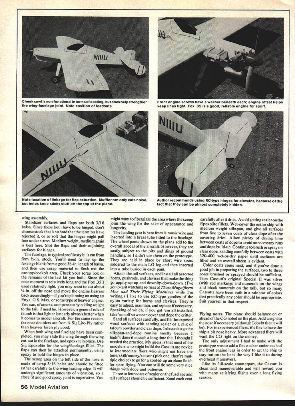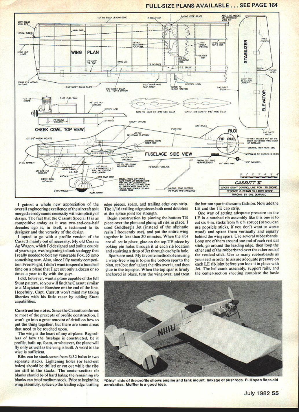 Framed against sky Cassutt semi-Scale profile CL model looks very realistic Its capable full range Stunt maneuvers well looking pretty cheek cowl reinforces usually-vulnerable wing-fuselage joint OVER 25 YEARS AGO then-airline-pilot Capt Tom Cassutt built tiny monoplane racer captured hearts minds air racing fans throughout country Entered competition 1958 Cassutt Special first flew victory 1958 National Air Racing Championships prompted literally hundreds air racing aficionados request plans information about Cassutts clean machine 1959 Cassutt designed smaller version popular ship spanning just under 14 feet called Cassutt Special II diminutive speedster capable speeds excess 230 mph flashed around pylons Its squared-off lines stabilizer tip plates gave uniquely saucy appearance eased up starting line acquaintance Cassutt Special 11 #11 began about year ago local airport advisory board staged Airport Appre ciation Day complete air show EAA static display pylon races As luck would have two Cassutts entered races ample time go over inch-by-inch during time static display Racing airplanes hold special fascination air-minded Cassutt racers have gained lot fans along trophies have profile Control Line version sweet little ship 35 has enough aerobatic capability satisfy flierE Larry Kruse 54 Model Aviation Sub-rudders tail add interest sleek racing plane Prototype designed ex-airline pilot Tom Cassutt has history winning races FULL-SIZE PLANS AVAILABLE . SEE PAGE 164 3BELECRAOMLEADIRO EDGE BRUCE It-t11 II --IL VBROI lAGVRSA NEUCRMI PIATF4BALSATOP ROT 9-IEElTNIS [v33][b-1-10-1-10]]II INGPLANi-1 IIICENTER jjDASA RIB VAR TABGEI IMOSAThG 4c T 1TE SPUCE / VIR SAEET BALSA T E TOP N ROTTOM 3A3V MOBIL WIRECONTROL HORN FLAD SaNERBATCH TO CLEAR PUSFIRGE MAIN RIB- BARE 114k 332 NED BALSA & C TAG SHEET Z CENTER MB RAWE 141- 5532 SHOD BALSA 5/32 MW LU -J n 0 Iii -J w GEPSET RUDDER I/A TO THE BOlT AS ARMED PROM REAR OF AIRPLANE DO BALSA -~THl RAL FICeI BOlT SAlE ---FUSELAGE SIDE VIEWTA6BALSA TIP ROSQER ID REOn AR BA NELLCRWR OR BALSAMOCRITING RAtSBALSA FCGELAGE LR[DTSGLO FAIRIND-SEE LA E FROM JAD CENTER C /1 ARC ThO LA LAMNATBAG RANT N EROGIED TO RIME Aos SHOBRNAMBRSROM BIRTHLALSNO DEAR BATTEWS GERBER BIRE-STECER 10 MARS___________________ LAIW GEARIAR MARC IBRE- 0 REOURED 0 23CSB LIII SSL/TTIX 11111 BY TRW INEROTR gained whole new appreciation overall engineering excellence aircraft merged aerodynamic necessity simplicity design fact Cassutt Special II competitive today two-and-one-half decades ago itself testament its designer veracity design opted go profile version Cassutt mainly out necessity old Cessna Ag Wagon Id designed built couple years ago beginning look doggy really needed bolt venerable Fox 35 onto something new Also since fly mostly competi tion Free Flight didnt want spend bunch time plane get out dozen times year fly guys did however want plane capable full Stunt pattern will find Cassutt similar Magician Banshee end line Hopefully Capt Cassutt wont mind taking liberties little racer adding Stunt capabilities Construction notes Since Cassutt conforms precepts profile construction wont go great amount detail put thing together some areas need touched upon wing heart airplane Regard less fuselage constructed profile built-up foam whatever plane will fly well wing built word wise sufficient Ribs can stack-sawn 3/32 balsa two separate stacks Lightening holes lead-out holes should drilled cut out ribs still stacks center-section rib blanks should hard balsa remaining rib blanks can medium stock Prior beginning wing assembly splice up leading edge trailing edge pieces spars trailing edge cap strip 1/16 trailing edge pieces both need doublers splice joint strength Begin construction pinning bottom TE piece over plan gluing ribs place used Goldbergs Jet instead aliphatic resin frequently use put entire wing together less 30 minutes ribs set place glue top TE piece poking pin holes through rib location squirting drop Jet through pin hole Spars next favorite method ensuring warp-free wing pin bottom spar plan setbut dont glue ribs over glue top spar top spar firmly anchored place turn wing over treat bottom spar same fashion Now add LE TE cap strip way getting adequate pressure LE notched rib assembly like cut six 4-in sticks spruce can use popsicle sticks dont want waste wood space vertically equally behind wing spars Use several rubberbands Loop around end vertical stick go around leading edge loop other end rubberband over other end vertical stick Use ruhherhands need order assure adequate pressure LE rib joint before lock place Jet bellcrank assembly support rails center-section sheeting complete basic July 198255 SOFT BALSA AHAB T1PB VA DR slaNG LINES IO SO BALSA LEADIRO EDGE 7 SCRAP FILL ATTACH TO FLAP 3IE OFEET BALSA ELADS FOGB Dirty side profile shows engine tank mount linkage 0 pusnroas 1-uli-span REaps aio aerobatics Muffler good idea wing assembly Stabilizer surfaces flaps both 3/16 balsa Since both have hinged dont choose stock hard termites have rejected soft hinges might pull free under stress Medium weight medium grain best Slot flaps adjoining surfaces hinges fuselage typical profile style cut firm -in stock Youll need lay up fuselage blank good 36-in length balsa use scrap material flesh Out canopy/cockpit Frea Check scrap box remains last kit built Since nose moment relatively long Fox 35 used relatively light may want cut about -in off nose move engine bearers back accordingly youre planning using Enya OS Max some type heavier engine can course compensate adding weight tail need However general rule thumb lighter nearly always better comes model aircraft same reason nose doublers Lite-Ply rather heavier birch plywood both wing fuselage have com pleted may slide wing through wing cut-out fuselage epoxy place Use Sig Epoxolite wing/fuselage fillet flaps can attached permanently using epoxy hold hinges place scoop area left side nose made scrap 3/16 balsa should fitted rather carefu