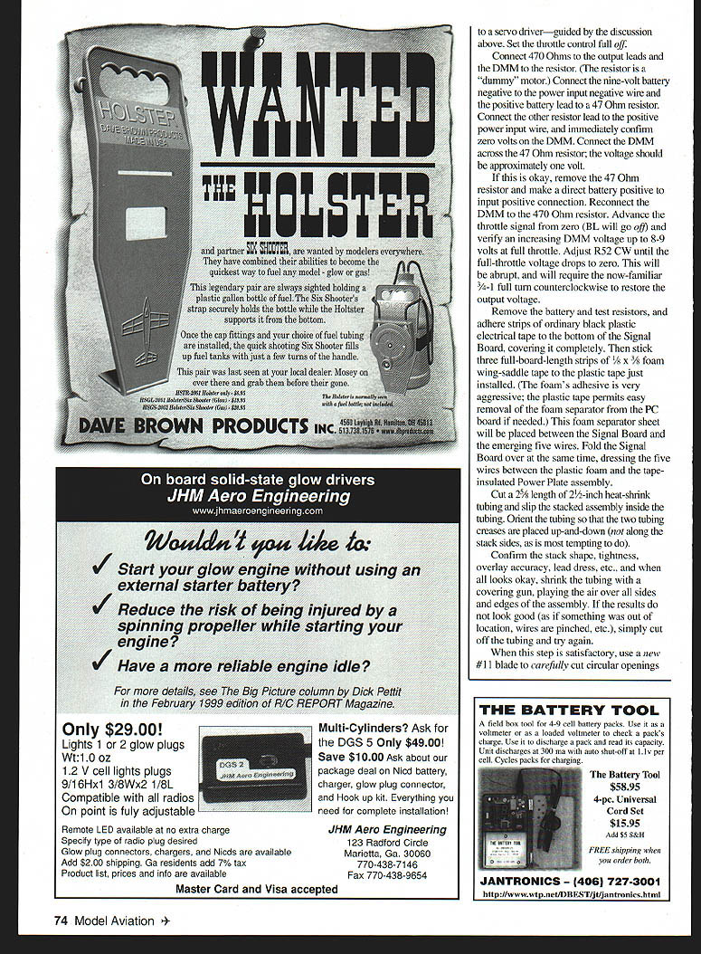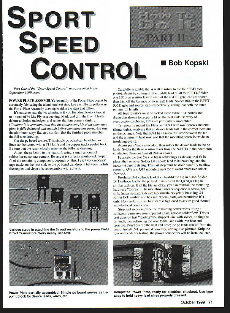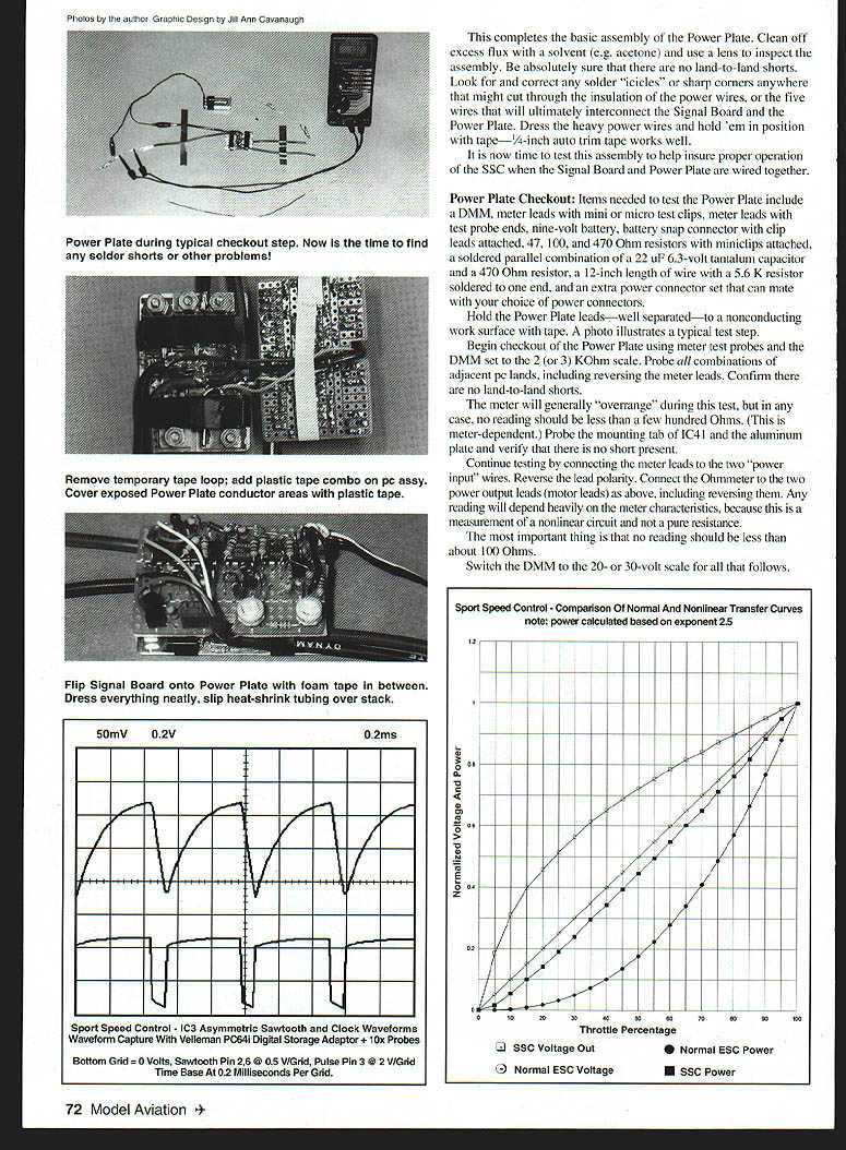SPORT SPEED Co NTROL Part Sport Speed Control presented September 1999 issue POWER PLATE ASSEMBLY Assembly Power Plate begins accurately fabricating aluminum heat sink Use full-size patterns Power Plate Assembly drawing aid steps follow Its easier saw 1A2 aluminum first double-stick tape scrap 1/ Lite Ply hacking Mark drill five 1/ holes deburr holes edges radius four corners slightly Caution very important component side aluminum plate fully deburred smooth before mounting parts sure aluminum stays flat confirm finished piece matches full-size drawing Cut pc board size simple pc board can etched lines can scored #11 knife copper tracks peeled back sure result closely matches full-size drawing Attach pc hoard heat sink using small amount rnbber-based contact cement sure correctly positioned proper fit remaining components depends use two temporary tape tracks heat sink pc board can drop between Polish copper clean subassembly solvent Carefully assemble / watt resistors four FETs see photo Begin cutting off middle lead four FETs Solder 150 ohm resistor lead N-FET gate leads shown trim off balance gate leads Solder R64 P-FET Q61 gate source leads respectively noting both latter remain full length four resistors must tucked close FET bodies dressed shown properly fit heat sink wary electrostatic discharge EEls particularly susceptible Temporarily mount FETs 1C41 4-40 screws nuts finger tight verifying device leads fall correct locations pc lands Note 1C41 has mica insulator between tab aluminum heat sink mounting screw inside insulating eyelet Adjust parts/leads needed solder device leads pc lands Solder three resistor leads N-PETs common conductor Dress install R44 shown Fabricate two A2 x s solder lugs shown trial-fit place remove Solder D41 anode lead its brass lug motor - wire its lug last step must done carefully allow room Q42 Q43 mounting nuts fit avoid excessive solder flow-out Preshape D41 cathode lead trial-fit lug place Solder D41 cathode lead pc land Trial-install Q42/Q43 lug similar fashion fits okay can reinstall mounting hardware real mounting fastener sequence screw heat sink mica insulator device tab insulator eyelet brass lug #4 spring lock washer hex nut parts peculiar 1C41 Now make sure hardware tightened assure good thermal electrical conduction Strip solder place remaining power wires using sufficiently massive iron permit fast smooth solder flow best done first loading stripped wire solder tinning pc lands reflowing wire lands iron heat pressure Dont overdo heat time pc lands can lift board Install C41 polarized correctly nesting pictured Strip four wire ends testing power connectors will installed later October 1999 71 U Bob Kopski Various steps attaching /8 watt resistors power Field Effect Transistors Work neatly see text Power Plate partially assembled Simple pc board serves tie-Completed Power Plate ready electrical checkout Use tape point block device leads wires etcwrap hold heavy lead wires properly dressed Photos author t3raphic Design Jill Ann Gavanaugh - completes basic assembly Power Plate Clean off excess flux solvent eg acetone use lens inspect assembly absolutely sure no land-to-land shorts Look correct solder icicles sharp corners anywhere might cut through insulation power wires five wires will ultimately interconnect Signal Board Power Plate Dress heavy power wires hold em position tape-inch auto trim tape works well now time test assembly help insure proper operation SSC Signal Board Power Plate wired together Power Plate Checkout Items needed test Power Plate include DMM meter leads mini micro test clips meter leads test probe ends nine-volt battery battery snap connector clip leads attached 47 100 470 Ohm resistors miniclips attached soldered parallel combination 22 uF 63-volt tantalum capacitor 470 Ohm resistor 12-inch length wire 56 K resistor soldered end extra power connector set can mate choice power connectors Hold Power Plate leadswell separatedto nonconducting work surface tape photo illustrates typical test step Begin checkout Power Plate using meter test probes DMM set 2 3 KOhm scale Probe combinations adjacent pc lands including reversing meter leads Confirm no land-to-land shorts meter will generally overrange during test case no reading should less few hundred Ohms meter-dependent Probe mounting tab 1C4 aluminum plate verify no short present Continue testing connecting meter leads two power input wires Reverse lead polarity Connect Ohmmeter two power output leads motor leads above including reversing Any reading will depend heavily meter characteristics because measurement nonlinear circuit pure resistance important thing no reading should less about 100 Ohms Switch DMM 20- 30-volt scale follows 54 0 72 Model Aviation r Plate during typical checkout step Now time find solder shorts other problems Remove temporary tape loop add plastic tape combo pc assy Cover exposed Power Plate conductor areas plastic tape Flip Signal Board onto Power Plate foam tape between Dress everything neatly slip heat-shrink tubing over stack 5OmV02VO2ms Sport Speed Control 1C3 Asymmetric Sawtooth Clock Waveforms Waveform Capture Velleman PC64i Digital Storage Adaptor Probes Bottom Grid 0 Volta Sawtooth Pin 26 0 05 V/Grid Pulse Pin 3 0 2 V/Grid Time Base 02 Milliseconds Per Grid Sport Speed Control Comparison Normal Nonlinear Transfer Curves note power calculated based exponent 25 4 S 0 0 0 00 0 0 4 N S 0 z 5152030405085708055150 Throttle Percentage Li SSC Voltage OutS Normal ESC Power 9 Normal ESC VoltageU SSC Power Connect nine-volt battery negative negative power input lead battery positive 100 Ohm resistor Connect other resistor lead positive input wire Power Plate Connect DMM across 100 Ohm resistor reading should fall between 5 2 volts Connect DMM clip leads across resistor-capacitor parallel combination Power Plate connected above touch R-C-DMM combination between 1C4 1 5 Volt output land negative pc land capacitor positive 1C41 output reading almost ex