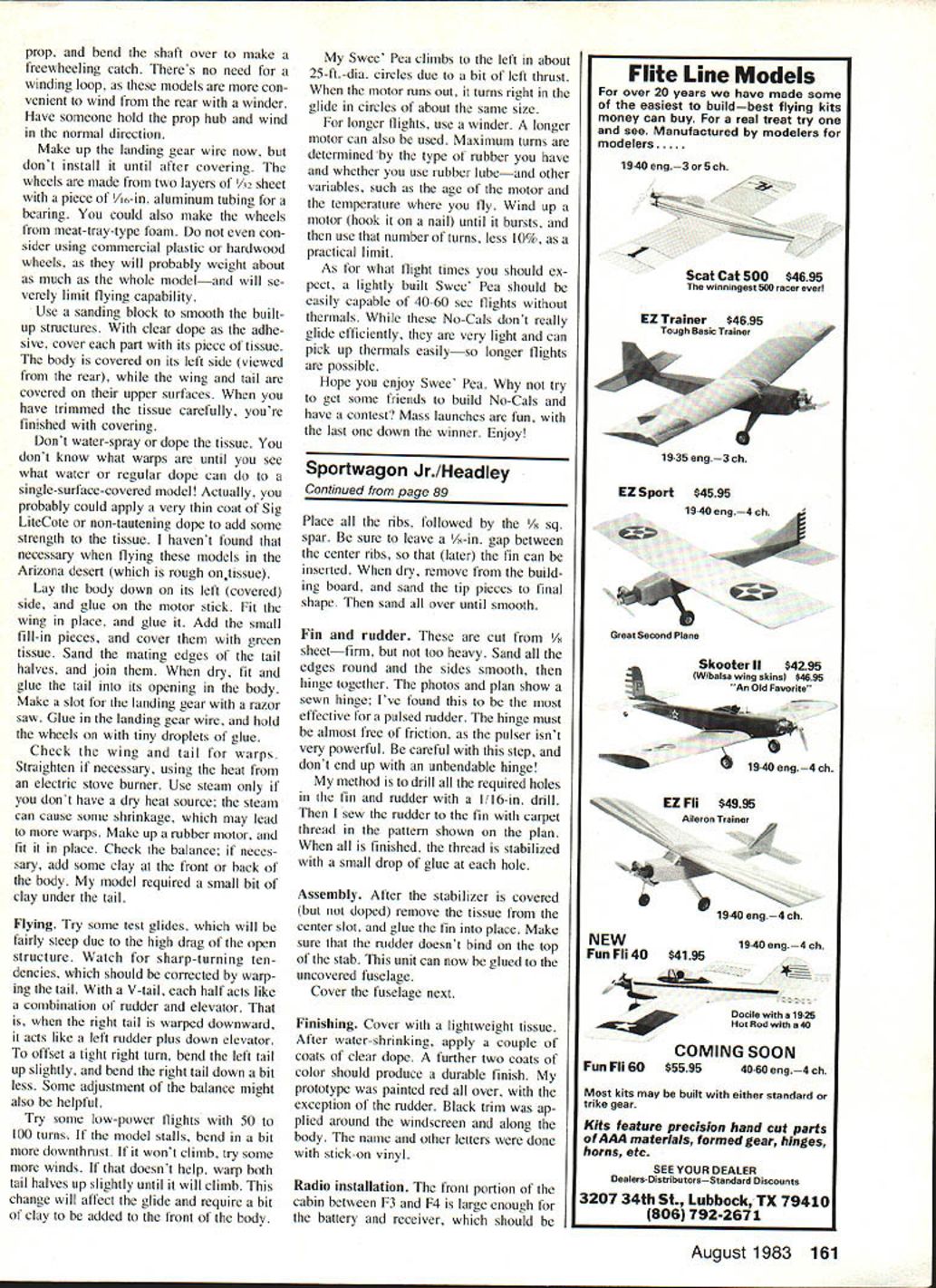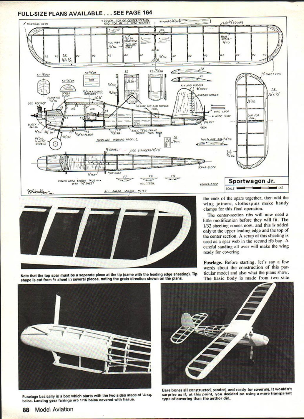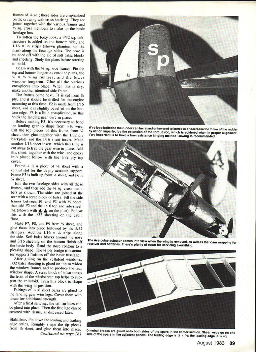 y tQ carry ir wing rubb L r- ti LWUUFIII9 iodelh tempted als& Sii main interest ra olIege years strictly caDital C ne ne reaso asic F PqWer models low aspect ratK hot diesel pured m ether castor oiland nnrateu other Although won few contests about later great fun background its complete mys tery built obtiined Sportwagon Sportwagon famil iar design product fertile brain Calhoun Smith plans 86 Model Aviation aces its ancestry sport Free F Smith Builds quickly arid ecor Uses flying 02 Cox- Peethe Ace sytem Its basic looks U Jack wanted ished short-lived magazine England during Fifties design antithesis type model cabin wheels cavernous fuselage However good flier used both fun contest work usually obtaining consistent max out sight score best-remembered type result flight contest Huddersfield usual went out-ofsight after few minutes wind always blows Huddersfield finally landed golf course Halifax cant recall what happened model end does anyone remember fate old relics however year ago got urge remake Sportwagon friend Toronto happened have copy original English maga zine prevailed him Xerox copy thanks Mike set about scaling up However usual grasshopper mind took left turn Rather remaking full-sized bird decided produce singlechannel version fly local park single-channel model subject article Someday however Im sure Ill remake original Does anyone out have Elfin 1 8 diesel tubular tank back might need Construction model shown plans just scaled-down version original did quite bit redesign work simplification though think pre served original flavor its big brother prototype built very leisurely during rainy week using slow super glues built primarily Ace pulse radio theres no reason small Cannon two-channel set couldnt have used addition small elevator back stabilizer However following notes strictly singlechannel model Wing made initially single piece cut two halves re-joined correct dihedral angle Start pin ning down lower main spar trailing edge strip onto plans Make wing ribs favorite manner make hard balsa template cut out quickly assemble block sand saw out spar notches Glue ribs place except center tip ones add leading edge strip /8 sheet wing tips cut out added next followed tip ribs upper main spar Carefully cut wing half center sand resulting spar ends correct bevel Make wing joiners hard sheet Re-join wing pieces done following manner Pin wing halves onto plan find solid block prop up other wing tip use scrap off old 2 x 4 purpose Move block around until correct height found under tip case 4 Glue August 1983 87 Charming Lisa Headley poses fathers tiny lightweight RC design original covered tissue given two coats clear dope followed two Coats red except rudder FULL-SIZE PLANS AVAILABLE . SEE PAGE 164 COVER OP CENTER SECTION AND TOP OF LE WITH IAiSHEET PI-PLT FS- NI46 SN 32SHAROUND SCRAPWINDOWS BLOCK PLANKING 4 15 SN PEE WEE LASc0 ENES Vs AND RUDDER HHt HEE AD UNGE 6WR U AND OROS/ /WRE00 ABE _______ P3 FR F PR61/16 PLT SN 346SHpPBBASIC 850 ERA SHPWNME P6 PUSELASE ARD PROFILE____tSH TAILPLANE RIBJ165H BDOWELSIDE STBINISEBN1f6 I _______________ F op ONLT Pr COVER AREA SHORJN THUS I6SHEET LE 3 4650 SCRAP BLOCK PB ALL BSH PR B SHEET TIPS /K SAP POP PIN Sportwagon Jr WEIGH T-7BOZ SCALEINS ends spars together add wing joiners clothespins make handy clamps final operation center-section ribs will now need little modification before will fit 1/32 sheeting comes now added upper leading edge top center section scrap sheeting used spar web second rib bay careful sanding over will make wing ready covering Fuselage Before starting lets say few words about construction par ticular model also what plans show basic body made two side 88 Model Aviation 2 DIHEDRAL HERE LE~BSIiUARE — _-_ --- --- _-7SNMAIN SPARS ALL RIBS SPAR WEBfraso 46 SNOB11 R2B152R2R2R2P2 CE R2- _______ _______ _______________________ 8 ____ ____ ____ ________ ____ _____________ ALL BALSA UNLESS NOTED Note top spar must separate piece tip same leading edge sheeting Tip shape cut 1/ sheet several pieces noting grain direction shown plans Fuselage basically box starts two sides made I/ sq balsa Landing gear fairings 1/16 balsa covered tissue Bare bones constructed sanded ready covering wouldnt surprise us point decidd using transparent type covering author did frames sq sides emphasized drawing cross hatching joined together various frames sq cross members make up basic fuselage box soften boxy look 3/32 sq sub structure added bottom side 1/16 x strips shown phantom plan along fuselage sides nose rounded off aid soft balsa blocks sheeting Study plans before starting build Begin sq side frames Pin top bottom longerons onto plans / x wing runners lower window longeron Glue various crosspieces place dry make another identical side frame frames come next Ft cut ply should drilled engine mounting time F2 made 1/16 sheet slightly bevelled bot tom edge F3 little complicated holds landing gear wire place Before making F3 its necessary bend landing gear shape 1/16 wire Cut top pieces frame sheet glue together 1/32 ply backplate 1/16 sheet insert Make another 1/16 sheet insert time cut away trap gear wire place Add sheet together wire epoxy place follow 1/32 ply top cover Frame 4 piece sheet central slot ply actuator support Frame F5 built up sheet F6 sheet Join two fuselage sides frames add sq cross mem bers shown sides joined rear scrap block balsa Fill side frames between Fl F3 sheet add F2 1/16 top side sheet ing shown A-A plan Follow 1/32 sheeting cabin floor Make F7 F8 F9 sheet glue place followed 3/32 stringers Add 1/16 X strips along side Soft balsa blocks around nose 3/16 sheeting bottom finish off basic body Sand nose contour pleasing shape ply bridge actua tor support finishes off basic fuselage After gluing celluloid windows 1/32 balsa sheeting glued top widen window frames produce rear window shape scrap block balsa across front windscreen top helps sup port celluloid Trim block shape wing position Fairings 1/16 sheet balsa glu