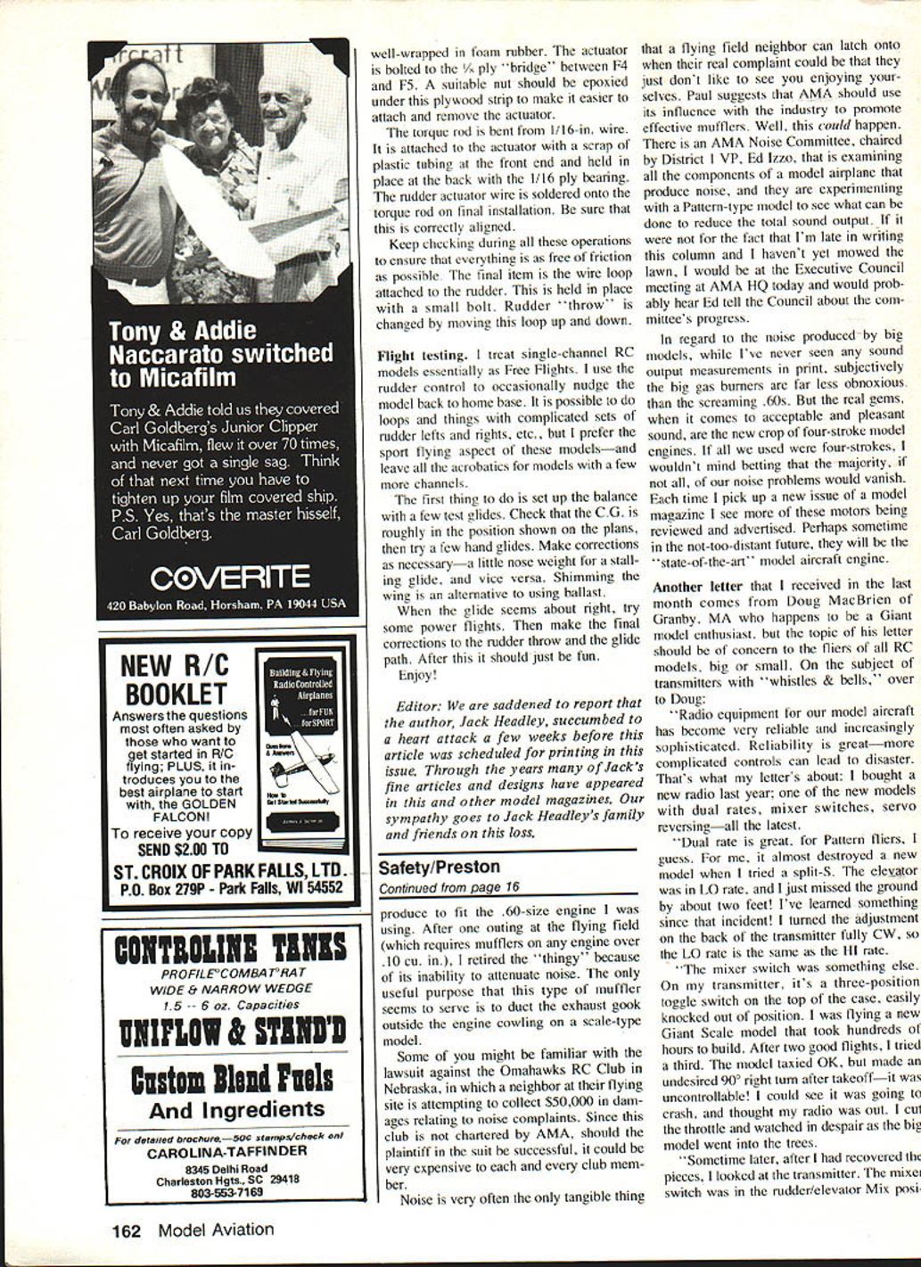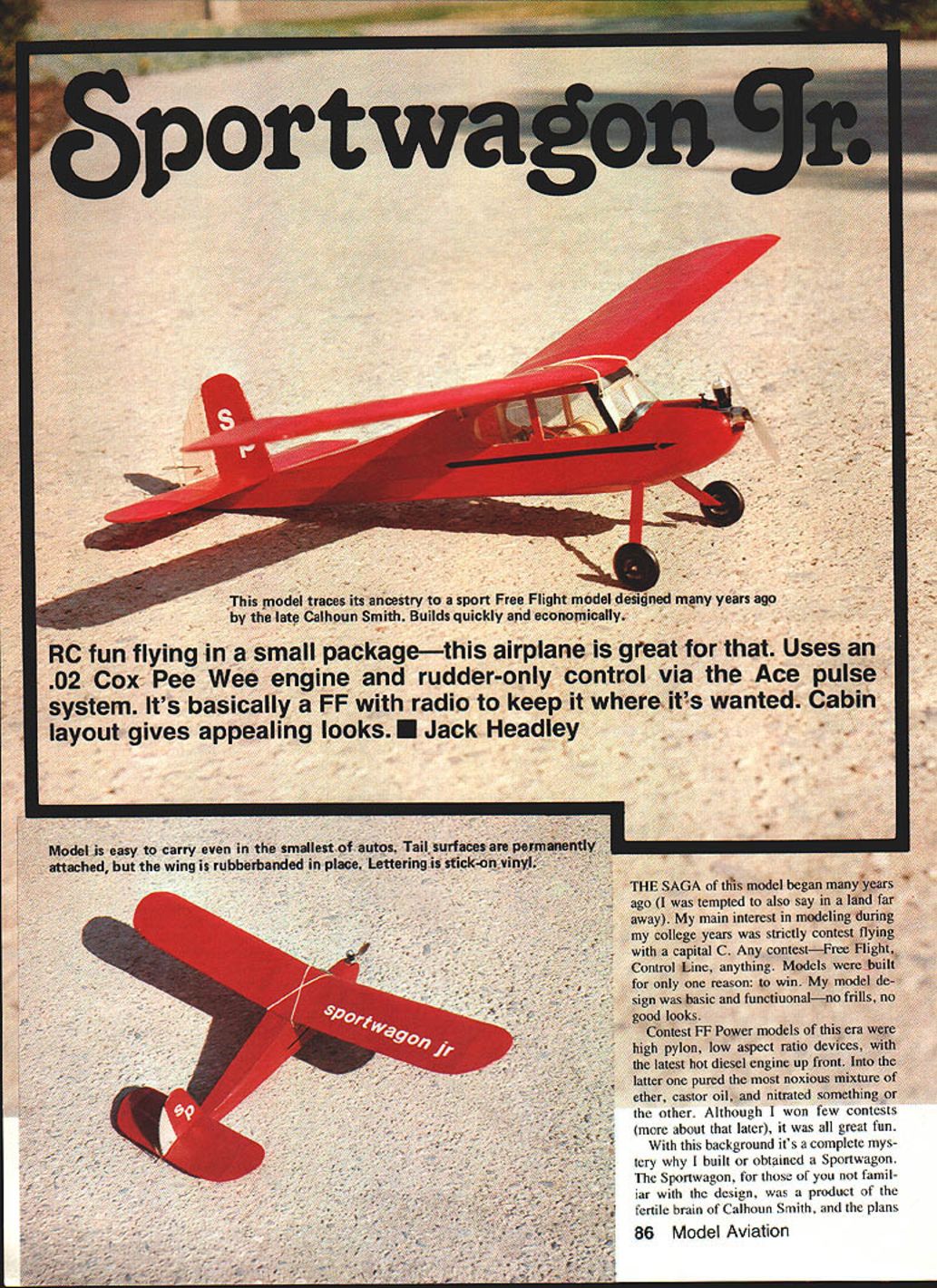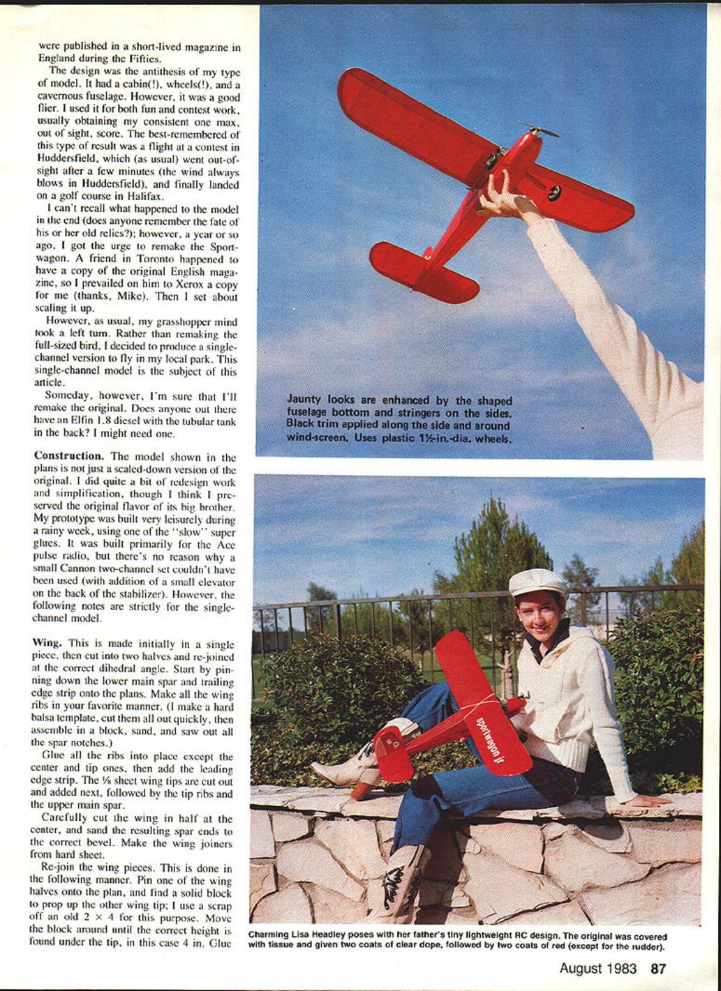 y tQ carry ir wing rubb L r- ti LWUUFIII9 iodelh tempted als& Sii main interest ra olIege years strictly caDital C ne ne reaso asic F PqWer models low aspect ratK hot diesel pured m ether castor oiland nnrateu other Although won few contests about later great fun background its complete mys tery built obtiined Sportwagon Sportwagon famil iar design product fertile brain Calhoun Smith plans 86 Model Aviation aces its ancestry sport Free F Smith Builds quickly arid ecor Uses flying 02 Cox- Peethe Ace sytem Its basic looks U Jack wanted ished short-lived magazine England during Fifties design antithesis type model cabin wheels cavernous fuselage However good flier used both fun contest work usually obtaining consistent max out sight score best-remembered type result flight contest Huddersfield usual went out-ofsight after few minutes wind always blows Huddersfield finally landed golf course Halifax cant recall what happened model end does anyone remember fate old relics however year ago got urge remake Sportwagon friend Toronto happened have copy original English maga zine prevailed him Xerox copy thanks Mike set about scaling up However usual grasshopper mind took left turn Rather remaking full-sized bird decided produce singlechannel version fly local park single-channel model subject article Someday however Im sure Ill remake original Does anyone out have Elfin 1 8 diesel tubular tank back might need Construction model shown plans just scaled-down version original did quite bit redesign work simplification though think pre served original flavor its big brother prototype built very leisurely during rainy week using slow super glues built primarily Ace pulse radio theres no reason small Cannon two-channel set couldnt have used addition small elevator back stabilizer However following notes strictly singlechannel model Wing made initially single piece cut two halves re-joined correct dihedral angle Start pin ning down lower main spar trailing edge strip onto plans Make wing ribs favorite manner make hard balsa template cut out quickly assemble block sand saw out spar notches Glue ribs place except center tip ones add leading edge strip /8 sheet wing tips cut out added next followed tip ribs upper main spar Carefully cut wing half center sand resulting spar ends correct bevel Make wing joiners hard sheet Re-join wing pieces done following manner Pin wing halves onto plan find solid block prop up other wing tip use scrap off old 2 x 4 purpose Move block around until correct height found under tip case 4 Glue August 1983 87 Charming Lisa Headley poses fathers tiny lightweight RC design original covered tissue given two coats clear dope followed two Coats red except rudder FULL-SIZE PLANS AVAILABLE . SEE PAGE 164 COVER OP CENTER SECTION AND TOP OF LE WITH IAiSHEET PI-PLT FS- NI46 SN 32SHAROUND SCRAPWINDOWS BLOCK PLANKING 4 15 SN PEE WEE LASc0 ENES Vs AND RUDDER HHt HEE AD UNGE 6WR U AND OROS/ /WRE00 ABE _______ P3 FR F PR61/16 PLT SN 346SHpPBBASIC 850 ERA SHPWNME P6 PUSELASE ARD PROFILE____tSH TAILPLANE RIBJ165H BDOWELSIDE STBINISEBN1f6 I _______________ F op ONLT Pr COVER AREA SHORJN THUS I6SHEET LE 3 4650 SCRAP BLOCK PB ALL BSH PR B SHEET TIPS /K SAP POP PIN Sportwagon Jr WEIGH T-7BOZ SCALEINS ends spars together add wing joiners clothespins make handy clamps final operation center-section ribs will now need little modification before will fit 1/32 sheeting comes now added upper leading edge top center section scrap sheeting used spar web second rib bay careful sanding over will make wing ready covering Fuselage Before starting lets say few words about construction par ticular model also what plans show basic body made two side 88 Model Aviation 2 DIHEDRAL HERE LE~BSIiUARE — _-_ --- --- _-7SNMAIN SPARS ALL RIBS SPAR WEBfraso 46 SNOB11 R2B152R2R2R2P2 CE R2- _______ _______ _______________________ 8 ____ ____ ____ ________ ____ _____________ ALL BALSA UNLESS NOTED Note top spar must separate piece tip same leading edge sheeting Tip shape cut 1/ sheet several pieces noting grain direction shown plans Fuselage basically box starts two sides made I/ sq balsa Landing gear fairings 1/16 balsa covered tissue Bare bones constructed sanded ready covering wouldnt surprise us point decidd using transparent type covering author did frames sq sides emphasized drawing cross hatching joined together various frames sq cross members make up basic fuselage box soften boxy look 3/32 sq sub structure added bottom side 1/16 x strips shown phantom plan along fuselage sides nose rounded off aid soft balsa blocks sheeting Study plans before starting build Begin sq side frames Pin top bottom longerons onto plans / x wing runners lower window longeron Glue various crosspieces place dry make another identical side frame frames come next Ft cut ply should drilled engine mounting time F2 made 1/16 sheet slightly bevelled bot tom edge F3 little complicated holds landing gear wire place Before making F3 its necessary bend landing gear shape 1/16 wire Cut top pieces frame sheet glue together 1/32 ply backplate 1/16 sheet insert Make another 1/16 sheet insert time cut away trap gear wire place Add sheet together wire epoxy place follow 1/32 ply top cover Frame 4 piece sheet central slot ply actuator support Frame F5 built up sheet F6 sheet Join two fuselage sides frames add sq cross mem bers shown sides joined rear scrap block balsa Fill side frames between Fl F3 sheet add F2 1/16 top side sheet ing shown A-A plan Follow 1/32 sheeting cabin floor Make F7 F8 F9 sheet glue place followed 3/32 stringers Add 1/16 X strips along side Soft balsa blocks around nose 3/16 sheeting bottom finish off basic body Sand nose contour pleasing shape ply bridge actua tor support finishes off basic fuselage After gluing celluloid windows 1/32 balsa sheeting glued top widen window frames produce rear window shape scrap block balsa across front windscreen top helps sup port celluloid Trim block shape wing position Fairings 1/16 sheet balsa glu