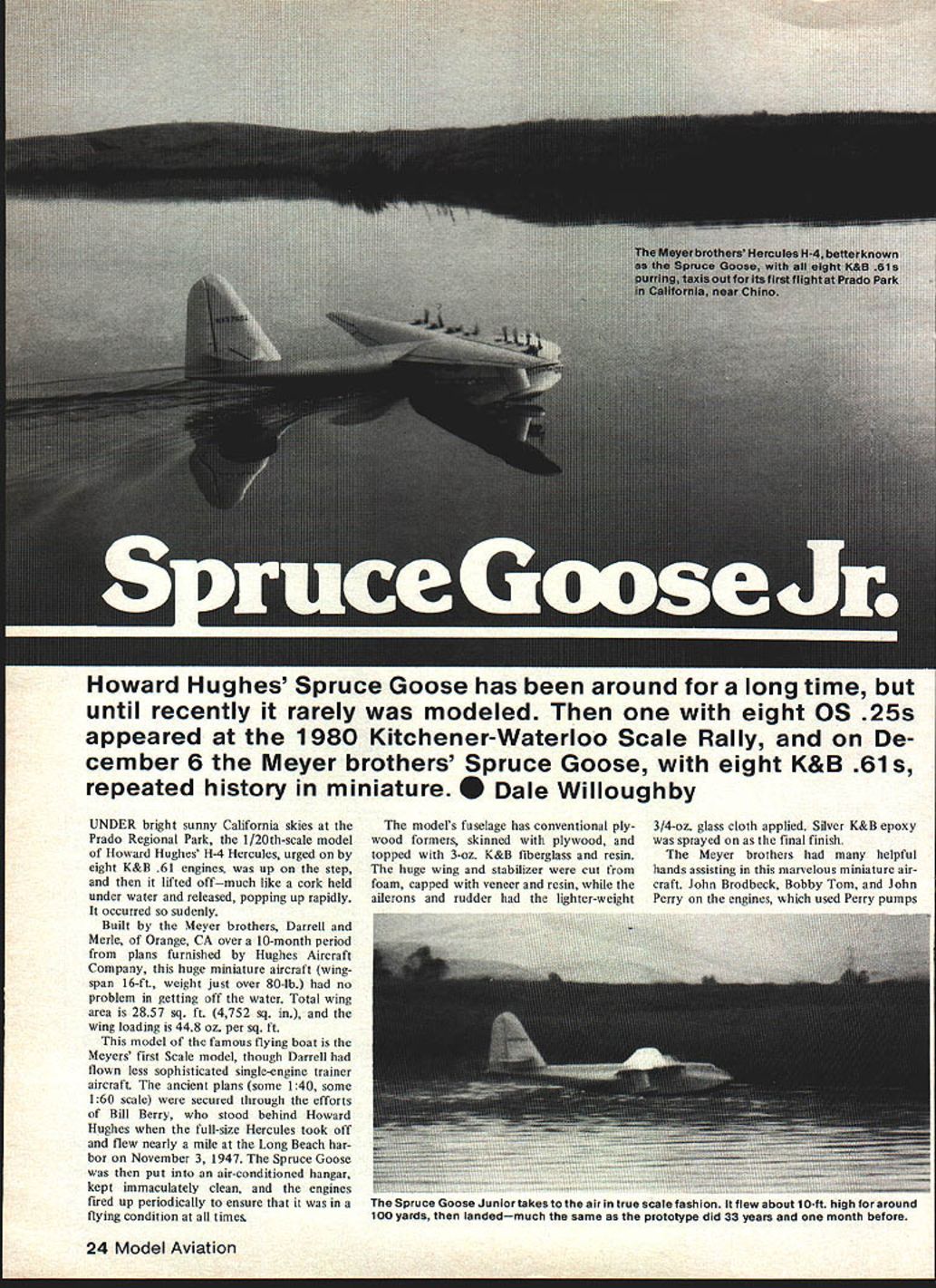 Howard Hughes Spruce Goose has around long time until recently rarely modeled eight OS 25s appeared 1980 Kitchener-Waterloo Scale Rally De cember 6 Meyer brothers Spruce Goose eight K&B 61 s repeated history miniature@ Dale Willoughby UNDER bright sunny California skies Prado Regional Park 1/20th-scale model Howard Hughes H-4 Hercules urged eight K&B 61 engines up step lifted offmuch like cork held under water released popping up rapidly occurred sudenly Built Meyer brothers Darrell Merle Orange CA over 10-month period plans furnished Hughes Aircraft Company huge miniature aircraft wing span 16-ft weight just over 80-lb no problem getting off water Total wing area 2857 sq ft 4752 sq wing loading 448 oz per sq ft model famous flying boat Meyers first Scale model though Darrell flown less sophisticated single-engine trainer aircraft ancient plans some 140 some 160 scale secured through efforts Bill Berry stood behind Howard Hughes full-size Hercules took off flew nearly mile Long Beach har bor November 3 1947 Spruce Goose put air-conditioned hangar kept immaculately clean engines fired up periodically ensure flying condition times models fuselage has conventional ply wood formers skinned plywood topped 3-oz K&B fiberglass resin huge wing stabilizer cut foam capped veneer resin ailerons rudder lighter-weight 3/4-oz glass cloth applied Silver K&B epoxy sprayed final finish Meyer brothers helpful hands assisting marvelous miniature air craft John Brodbeck Bobby Tom John Perry engines used Perry pumps 24 Model Aviation Spruce Goose Juniortakes air true scale fashion flew about 10-ft high around 100 yards landedmuch same prototype did 33 years month before carburetors Chip Conklin C&D Enter prises custom-built on-board glow plug driver using eight printed-circuit boards 6V motorcycle battery Glenn Toma Fu taba custom-built transmitter 7296 MHz four sliding controls shutting down engines plus trim knobs throttles found previous Saturdays flo tation tests two outboard engines too powerful used power turn ing inboard engines used pairs maneuvering water Fiber-filled Master Airscrews balanced used first Continued page 103 Bottom view wing center assume showing eight printed circuits edge C&D Enterprises glow driver March 1981 25 Standard Futaba transmitter used fortlight con trols custom-made unit used controlling throttles trim eight engines Triumphantly miniature Spruce Goose taxis back dock after its short significant flight Engines 3 7 8 killed water spray landing Pictures author nor removaoie riignr oec wirn 1 twin-scale models Howard Hughes floppy hat Dave Grant right seat Bill Berry Darrell Meyer foreground watches Big John Elliott carefully lattertunes engine NO maximum thrust Merle Meyer just behind Elliott Lots guys turned out event Plans Hughes Aircraft Hercules H-4 urnisneu tnrougn tne efforts Bill Berry used Meyer brothers 120-scale model Plans different scales integrated Note Assume use Fourmost Racing Pro ducts Gapless Hinge similar instal lation avoid discussion effect control surface gap significant Control surface deflection angle required pullout dive depends very strongly altitude pullout starts Maximum deflection angle usually chosen basis tlight testing minimum angle reliably produces spin entry Let D case D a Elevator parameters Span nches Chord Area 8 sq V 130 mph D therefore F 588 b Elevator Hinge torque F 130 x 130 x 48 x 2 x 0000588 in-oz 3 Now turn box servos pick likely candidate Try Ace RC Atlas Output wheel radius 325 Stroke half-stroke 1 230 ne D 342 7xL1/L2 325/672 Servo torque required L9T 339 x 955 in-oz Servo torque available in-oz Atlas OK Now can see people get away flying large airplanes small servos use small deflection angles fly level much possible simple static analysis does take account shock vibration factors can increase servo requirements bvfactors four must remember thank flying buddies George Druhak Tom Hunt valuable help developing simplified analysis Next month will take up shock vibration factors will calculate servo size Norm Rosenstocks Waco talk bit about pushrod size strength Later will take up subject larger battery packs required support new larger servos Keep letters flowing George M Myers 70 Froehlich Farm Rd Hicks iille NY 11801 Spruce Goose Jr/Willoughby Continued page 25 flight second transmitter 72240 MHz con trolled rudder elevator flaps ailerons fifth sixth channels operated 18 lights included two landing lights wing between engines 3 4 tween 5 6 plus float called taxi lights John Elliott handled flight transmitter Darrell Meyer performed duties flight engineer though feet still dock Other members ground crew started engines synchronized tach checking high low speeds detailed hang onto rud der full-power check What sweet sound eight engines made Throttled back idle huge silver bird carried deposited upon water could just feel excitement 80or-si helpers spectators bystanders taxied out flight Awesome Power 2I3rds Thirst 1980 Features * Improved By-pass Design * Longer Crankshaft/BearIng * Better Balance * Mark X Carburetor $6495 Bushing Schnuerl can lot active flying far less fuel 40 sized engine compared big 60 Probably popular displacement range R/O flying sites Power spare wealth kit designs available Reasonable cost too Hot Line 5011 646-165e MFG CO 5305 TOWSON AVE FORT SMITH ARK 72901 A uthorizecF DQdIO ervice FACTORYAUTHORIZED SERVICE FOR ALL OF THE FOLLOWING BRANDS Ace Aero Sport Cannon Cirrus Kraft World Engines EK Logictrol Micro Avionics Pro Line Orbit Mathes D&D RS Systems Royal Simprop Jerobee ALSO WARRANTY SERVICE EXPERT SER VICE FOR ALL BRANDS Z Don McCarthy Factory trained technicians over 15 years Radio Control Electronics S HOURS Closed Sun & Mon lOam-S pmWedFri lOam-6 pm Sat lOam-2 pm 714 639-8886 941 N MAIN ST ORANGE CALIFORNIA 92667 first flight no length football field approximating flight original Hercules about 10-ft altitude seemed tu mc flew about scale speed descent like Sail plane landinglong protracted did 
