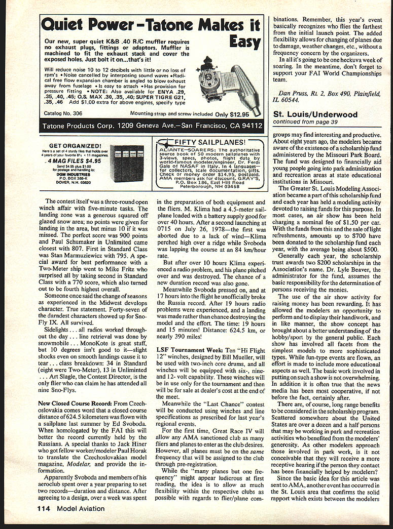 The St Louis Story.. 14-club Greater St Louis Modeling As sociation achieved pro ductive 20-year relation ship St Louis County Department Parks Recreation assuring excellent flying sites U Bob Underwood ALMOST two decades ago modelers St Louis area faced problem others have encountered throughout United States Because increasing pres sures flying fields materializing vanishing alarming rate spite relatively small amount space required control-line activity problem became critical point very new rather small St Louis County Department Parks Recreation approached see land some outlying area might utilized model field individual contacted Mr Wayne Kennedy sympathetic modelers cause guidance association clubs formed time consisting solely control-line grroups space found land donated Mr GA Ruder plans made Original developments field relied heavily work done modelers themselves Circles constructed along pavilion fencing made clear modeling voice St Louis far Park Department con cerned newly formed Greater St Louis Modeling Association Through addition RC field vast improvements working relationship has remained facility Ruder Park has continuously improved now consists asphalt-paved runways circles parking areas pavilions other improvements Association has grown include 14 clubs representing free flight control line radio control well two RC car clubs live steam locomotive group Association has attempted show its appreciation cooperation afforded community way other Continued page 114 June1979 39 formal dedication Buder Park left Bob Underwood Chairman GSLMA Mr Buder family Wayne Kennedy Director Park Department just left pole County Councilman An excellent site RCers rendered homeless also found Ray Wiederhold plc Attime 1972 dedication Buder Parkfacilltles CLarea upper right builtalmost2Oyearsago BC area two 30ft wide 315ff asphalt runways Improvements planned include scale railroad live-steam club GSLMA picnic facilities wooded area Bill Crane plc Official ribbon-cutting new RC runways pavilion Art Biehi RCer Cecil Cooke free flighter hold pole Bob Underwoods plane cuts ribbon Part Scholarship Fund Air Show Quiet Power -Tatone Makes Easy new super quiet K&B 40 R/C muffler requires no exhaust plugs fittings adaptors Muffler machined fit exhaust stack cover exposed holes Just bolt on.thats Will reduce noise 10 12 decibels little no loss rpms Noise cancelled interposing sound waves Radi cal free flow expansion chamber angled blow exhaust away fuselage attach provision pressure fitting Also available ENVA 29 35 40 45 08 MAX 30 35 40 SUPER TIGRE G21 35 46 Add $100 extra above engines specify type Catalog No 306 GET ORGANIZED o set 4 sturdy ties holds over 4 years yoal favorite 5 Ii magazines 4 MAG FILES S495 Send $486 pko sige postage handlerg DON INOUSThIES PO eox 388-K DOWR NH 03820 contest itself three-round open winch affair five-minute tasks landing zone generous squared off glazed snow area no points given landing area minus 10 missed perfect score 900 points Paul Schumaker Unlimited came closest 807 First Standard Class Stan Marmuziewicz 795 spe cial award best performance Two-Meter ship went Mike Fritz surprised taking second Standard Class 770 score also turned out fourth highest overall Someone once said change seasons experienced Midwest develops character True statement Forty-seven darndest characters showed up Sno Fly IX survived Side~ts. radios worked through out day. line retrieval done snoobile. MonoKote great stuff 10 degrees isnt good itslight shocks smooth landings cause tear. class breakdown 34 Standard eight Two-Meter 13 Unliminted . Art Slagle Contest Director flier can claim has attended nine Sno-Flys New Closed Course Record Czech oslovakia comes word closed course distance 6245 kilometers flown sailplane last summer Ed Svoboda homologated FAT will better record currently held Russians special thanks Jack Hiner got fellow worker/modeler Paul Horak translate Czechoslovakian model magazine Modelar provide formation Apparently Svoboda members aeroclub spent over year preparing set two recordsduration distance After agreeing design over week spent Mounting strap screw included Only $129 ZLTFIFTY SAl LPLANES ALIANTESOARERS authoritative source book 50 modern saliplanes 3-views specs photos flight data world-famous modeler/engineer Ferdi Gale NASAF Italy 4 lanu7jjJ collectors scale documentation gifts Check money Order $1495 postpaid AMA members ask discount GRAYS PO Box 186 East Hill Road Peterborough NH 03458 preparation both equipment fliers M Klima 45-meter sail plane loaded battery supply good over 40 hours After second launching 0715 July 26r 1978the first aborted due lack windKlima perched high over ridge Svoboda lapping course 84 km/hour rate after over 10 hours Klima experi enced radio problem plane pitched over destroyed chance new duration record also gone Meanwhile Svoboda pressed 17 hours flight unofficially broke Russia record After 19 hours radio problems experienced landing made rather chance destroying model effort time 19 hours 15 minutes Distance 6245 kin nearly 390 miles LSF Tournament Weelc Ten Hi Flight 12 winches designed Bill Mueller will used two-inch core drums winches will equipped six- nineand 12- volt capability winches will use tournament will sale dealerrs cost end meet Meanwhile Last Chance contest will conducted using winches line specifications prescribed last years regional events first time Great Race IV will allow AMA sanctioned club fliers planes enter club desires However planes must same frequency will assigned club through pre-registration planes fre quency might appear ludicrous first reading idea allow much flexibility within respective clubs possible regards flier/plane com binations Remember years event basically recognizes flies farthest initial launch point added flexibility allows changing planes due damage weather changes etc frequency concern organizers its going heckuva week soaring meantime dont forget support FAI World Cham