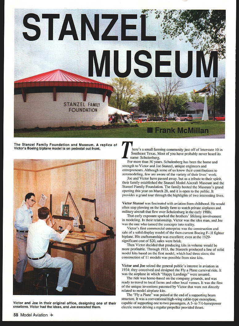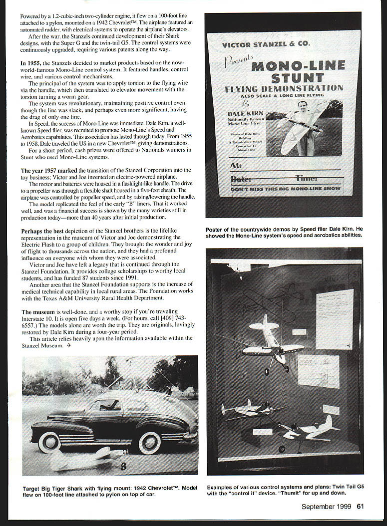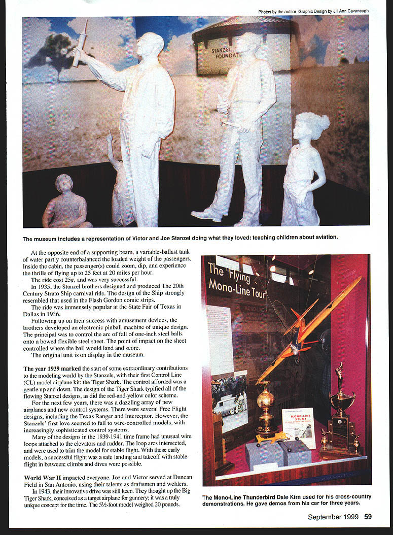 heres small farming community just off Interstate 10 Southeast Texas Most have probably never heard its name Schulenburg 50 years Schulenberg has home strength Victor Joe Stanzel unique engineers entrepreneurs Although some us know contributions aeromodeling few aware variety lives work Joe Victor have passed away hut tribute spirit family established Stanzel Model Aircraft Museum Stanzel Family Foundation family hosted Museums grand opening year March 28 open public provides grand tour through highlights two interesting lives Victor Stanzel fascinated aviation childhood would often stop plowing family farm watch private airplanes military aircraft flew over Schulenburg early 1900s early exposure sparked brothers lifelong involvement modeling relationship Victor idea man Joe turned concepts reality Victors first commercial enterprise construction sale solid display model then-current Boeing F-18 fighter biplane craftsmanship excellent 1929significant cost $20 sales brisk Victor decided producing kits volume would profitable Through 1933 Stanzels produced line solid model kits based first model three sizes construction 11 models possible nine kits Victor Joe seized general publics interest aviation 1934 conceived designed Fly Plane carnival ride airplane Happy Landings assured ride home-based company grounds ready travel local farms other local venues first unique inventions patented Victor directly related model airplane kits Fly Plane poised end supporting beam structure conventional high-wing cabin-type monoplane capable supporting two passengers 5- 7-horsepower electric motor driving regular propeller provided thrust 58 Model Aviation Stanzel Family Foundation Museum replica Victors Boeing biplane model pedestal out front Victor Joe original office designing creations Victor ideas Joe executed Ita thu ujuw GuaNo Design Jill Ann Oavmnu&flI opposite end supporting beam variable-ballast tank water partly counterbalanced loaded weight passengers Inside cabin passengers could zoom dip experience thrills flying up 25 feet 20 miles per hour ride cost 25 very successful 1935 Stanzel brothers designed produced 20th Century Strato Ship carnival ride design Ship strongly resembled used Flash Gordon comic strips ride immensely popular State Fair Texas Dallas 1936 Following up success amusement devices brothers developed electronic pinball machine unique design principal control arc fall one-inch steel balls onto bowed flexible steel sheet point impact sheet controlled ball would land score original unit display museum year 1939 marked start some extraordinary contributions modeling world Stanzels first Control Line CL model airplane kit Tiger Shark control afforded gentle up down design Tiger Shark typified flowing Stanzel designs did red-and-yellow color scheme next few years dazzling array new airplanes new control systems several Free Flight designs including Texas Ranger Interceptor However Stanzels first love seemed fall wire-controlled models increasingly sophisticated control systems designs 1939-1941 time frame unusual wire loops attached elevators rudder loop arcs intersected used trim model stable flight early models successful flight safe landing takeoff stable flight between climbs dives possible World War II impacted everyone Joe Victor served Duncan Field San Antonio using talents draftsmen welders 1943 innovative drive still keen thought up Big Tiger Shark conceived target airplane gunnery truly unique concept time 5-foot model weighed 20 pounds September1999 59 museum includes representation Victor Joe Stanzel doing what loved teaching children about aviation Mono-Line Thunderbird Dale Kim used cross-country demonstrations gave demos car three years Powered 12-cubic-inch two-cylinder engine flew 100-foot line attached pylon mounted 1942 ChevroletTM airplane featured automated rudder electrical systems operate airplanes elevators After war Stanzels continued development Shark designs Super G twin-tail C5 control systems continuously upgraded requiring various patents along way Iti 1955 Stanzels decided market products based nowworld-famous Mono-Line control system featured handles control wire various control mechanisms principal system apply torsion flying wire via handle translated elevator movement torsion turning worm gear system revolutionary maintaining positive control though line slack perhaps significant having drag line Speed success Mono-Line immediate Dale Kim wellknown Speed flier recruited promote Mono-Lines Speed Aerobatics capabilities association has lasted through today 1955 1958 Dale traveled US new ChevroletlM giving demonstrations short period cash prizes offered Nationals winners Stunt used Mono-Line systems year 1957 marked transition Stanzel Corporation toy business Victor Joe invented electric-powered airplane motor batteries housed flashlight-like handle drive propeller through flexible shaft housed five-foot sheath airplane controlled propeller speed raisingllowering handle model replicated feel early B liners worked well financial success shown varieties still production todaymore 40 years after initial production Perhaps best depiction Stanzel brothers lifelike representation museum Victor Joe demonstrating Electric Flash group children brought wonder joy flight thousands across nation profound influence everyone associated Victor Joe have left legacy continued through Stanzel Foundation provides college scholarships worthy local students has funded 87 students since 1991 Another area Stanzel Foundation supports increase medical technical capability local rural areas Foundation works Texas A&M University Rural Health Department museum well-done worthy stop youre traveling Interstate 10 open five days week hours call L409] 7436557 models alone worth trip originals lovingly restored Dale Kim during four-year period article relies heavily upon information available within Stanzel Museum 4September 1999 61 Poster countrywide demos Speed flier Dale Kim showe