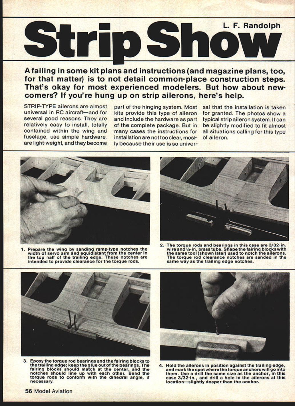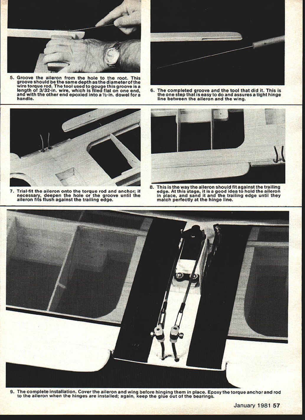 A failing some kit plans instructions magazine plans too matter detail common-place construction steps Thats okay experienced modelers about new comers youre hung up strip ailerons heres help STRIP-TYPE ailerons almost universal RO aircraftand several good reasons relatively easy install totally contained within wing fuselage use simple hardware light-weight become part hinging system Most kits provide type aileron include hardware part complete package cases instructions installation too clear ly because use univer sal installation taken granted photos show typical strip aileron system can slightly modified fit almost situations calling type aileron 1 Prepare wing sanding ramp-type notches width servo arm equidistant center top half trailing edge notches intended provide clearance torque rods 4 Hold ailerons position against trailing edge mark spot torque anchors will go Use drill same size anchor case 3/32-in drill hole ailerons locationslightly deeper anchor 56 Model Aviation 2 The torque rods bearings case /52-in wire 1/a-in brass tube Shape fairing blocks same tool shown later used notch ailerons torque rod clearance notches sanded same way trailing edge notches 3 Epoxy torque rod bearings fairing blocks trailing edge keep glue out bearings fairing blocks should match center notches should line up other Bend torque rods conform dihedral angle necessary 5 Groove aileron hole root groove should same depth diameter wire torque rod tool used gouge groove length 3/32-in wire filed flat end other end epoxied -in dowel handle 9 The complete installation cover aileron wing before hinging place Epoxy torque anchor rod aileron hinges installed again keep glue out bearings January 1981 57 6 The completed groove tool did step easy assures tight hinge line between aileron wing 7 Trial-fit aileron onto torque rod anchor necessary deepen hole groove until aileron fits flush against trailing edge 8 way aileron should fit again5l Iruaming edge stage good idea hold aileron place sand trailing edge until match perfectly hinge line