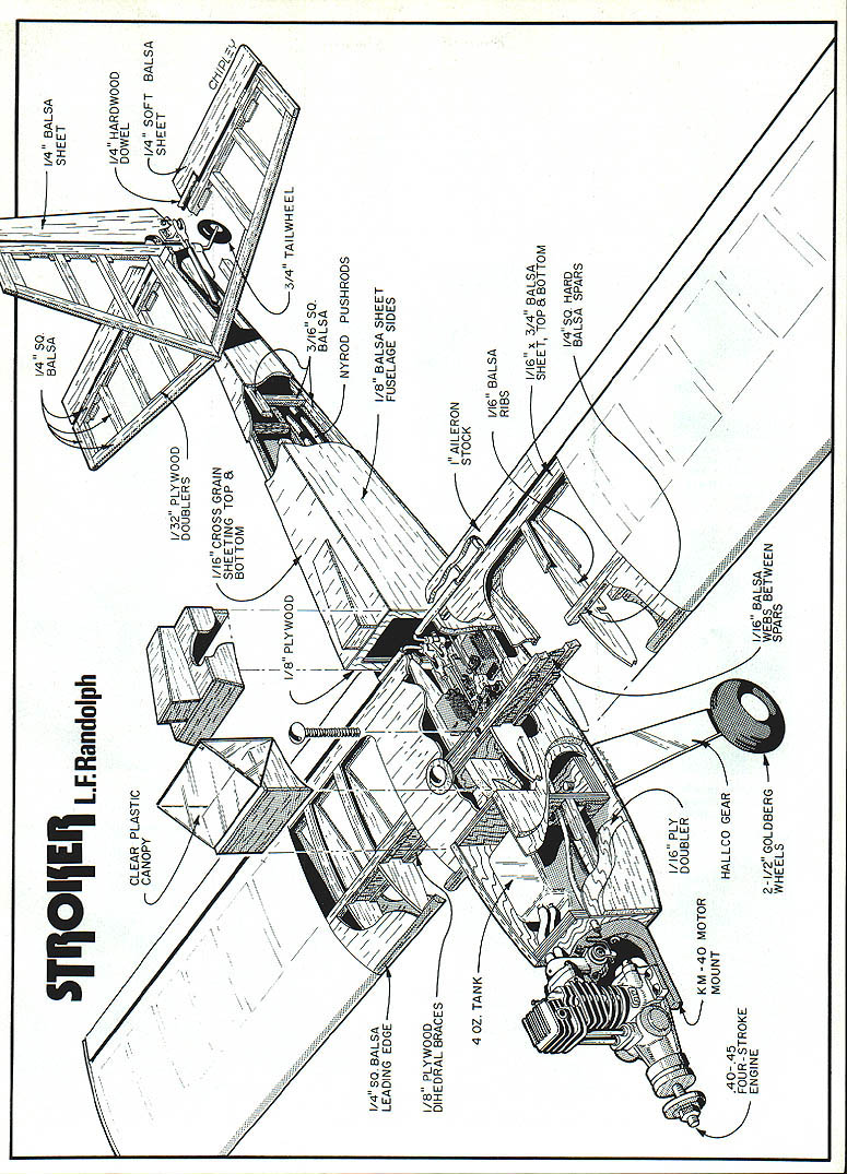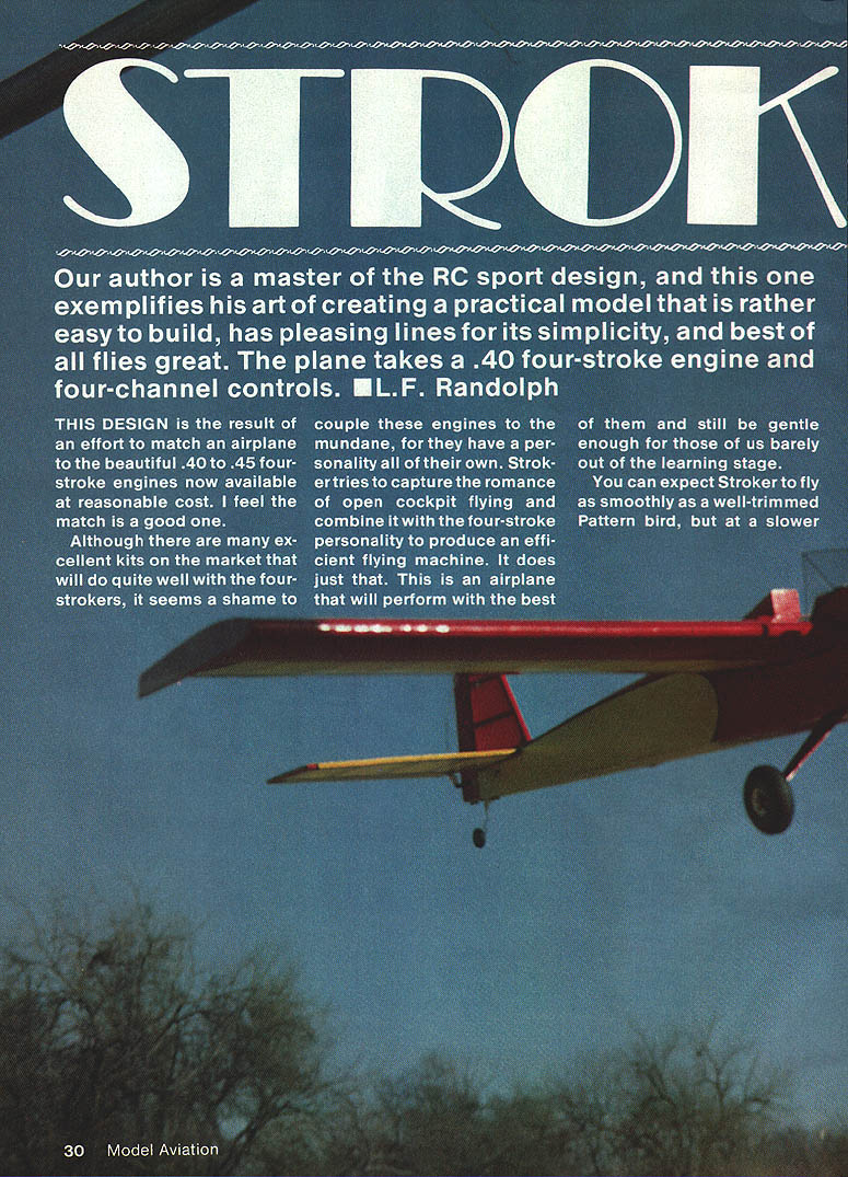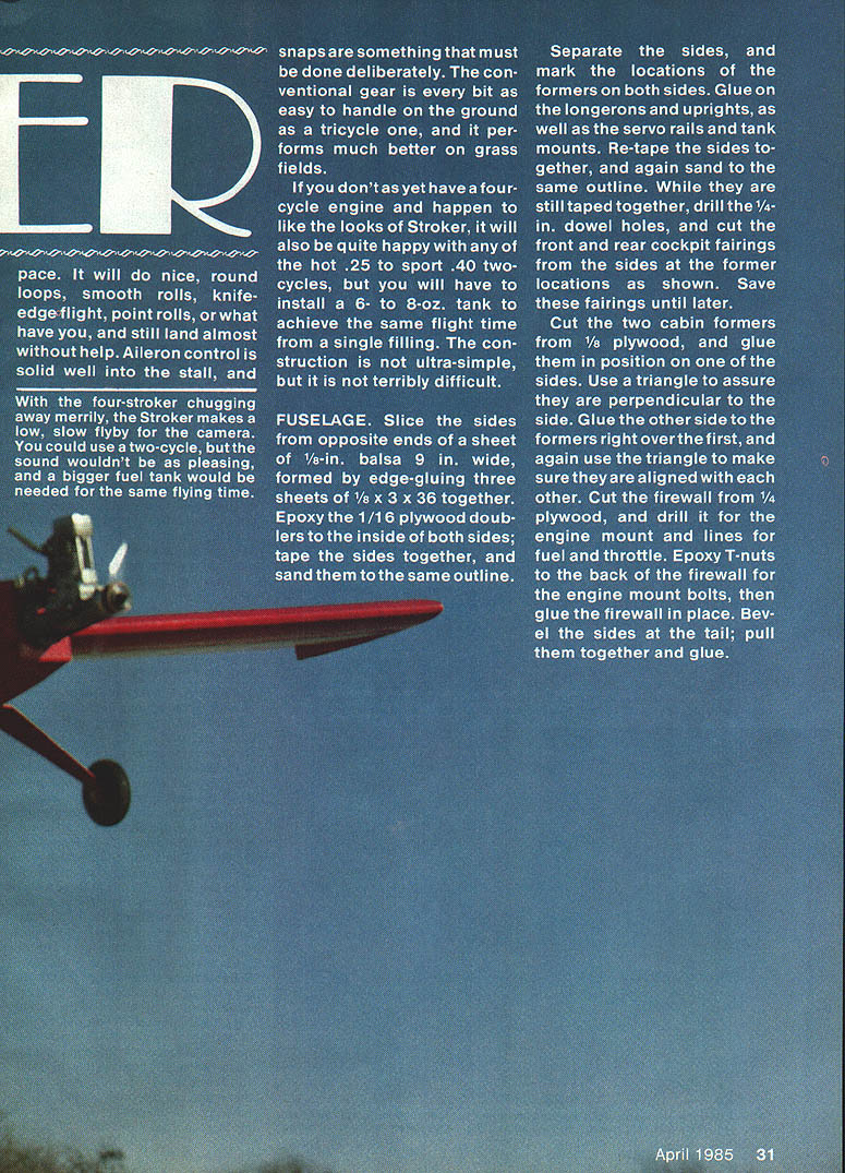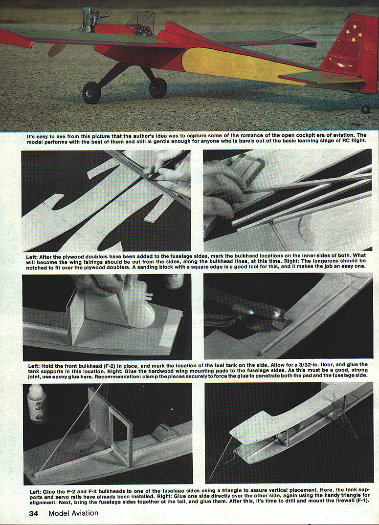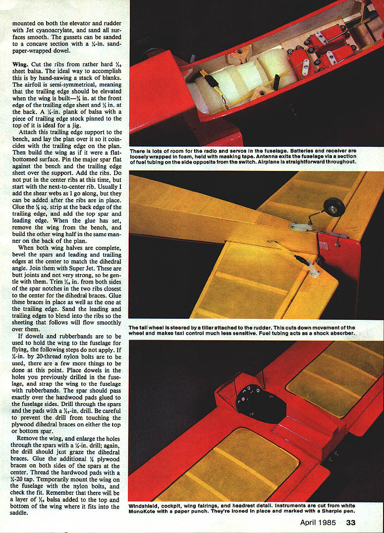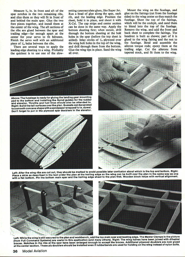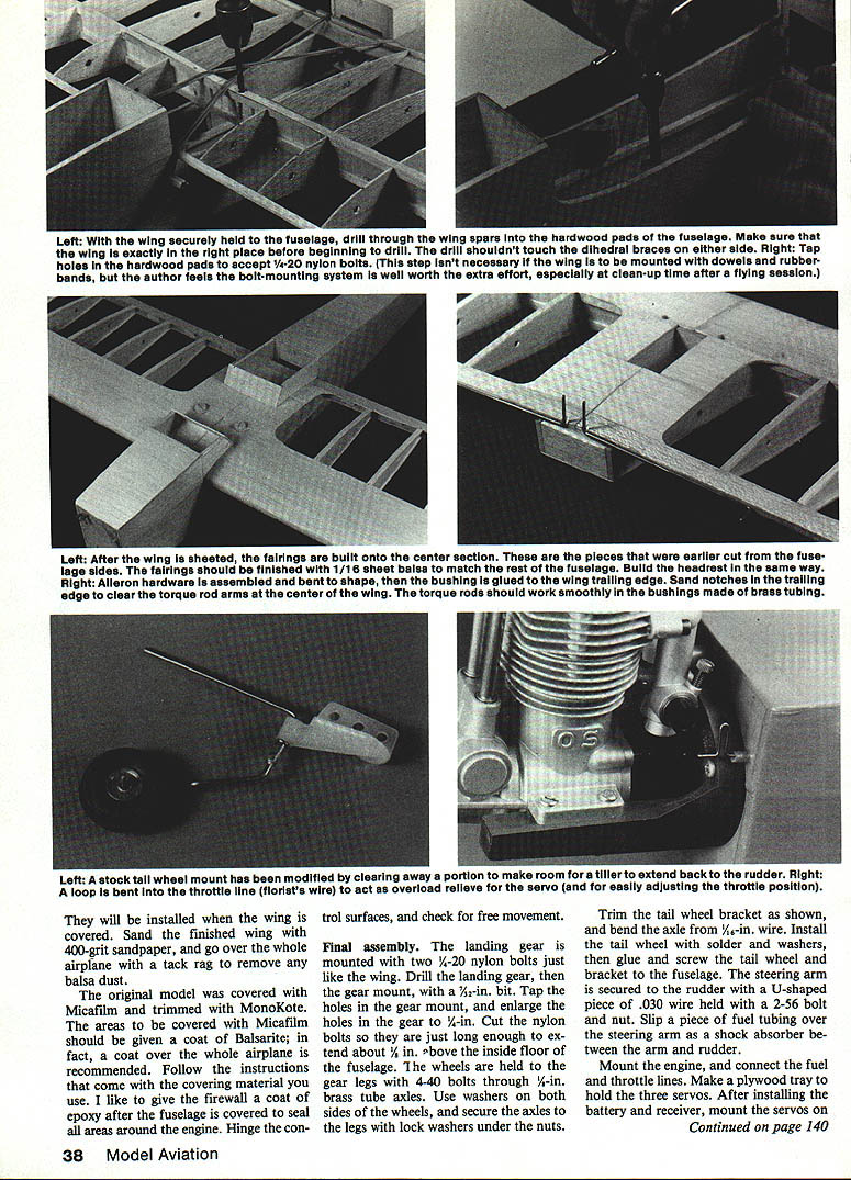 NO OCR TEXT NO OCR TEXT looks like Its ready go goes very nicelyas smooth well-trimmed Pattern ship slower youre new four-strokers may feel first flight engine isnt running fast enough fly plane Please fear Really theres plenty power Cut landing gear mount plywood glue position against front cabin formerflush bottom fuselage Install inner Nyrod throttle line Nyrod guides elevator rudder tank compartment floor / balsa should fitted installed time nylon bolts used wing attach ment hardwood anchors should glued position fuselage sides glue joints must good ones clamp well glue sets Start bottom fuselage sheeting / plywood over landing gear mount tail wheel location finish cross-grain / balsa Install fuel tank lines complete top sheeting headrest will finished later Sand everything Tall surfaces Cut two spar doublers wide 10 long / plywood Laminate doublers center stab trailing edge spar notch other center will form easily shape leading edge Assemble stab right over plan pinning down trailing edge its doubler adding center sheet other ply doubler leading edge ribs cut fit between leading trail ing edges Dont forget gussets corners important prevent wrinkling covering spots Remove stab plan sand smooth Round leading edge tips sand edges trailing edge just enough remove sharpness Cut elevator A-in sheet balsa Before making cutout trailing edge rudder inset A-in hard wood dowel center leading edge Tape elevator trailing edge stab sand both match fin built same stab rudder similarly matched sand ed A-in elevator dowel carrythrough meets rudder sand A-in half-round rudder clearance Harden areas horns will 32 Model Aviation une Tuel ana overriow 11fl65 jO mU IUNK ars Iuu-uy-5Iuu uu mull mu uunuuuiuu iu engine plastic tubing overflow line can used fur exhaust pressure tank aileron servo mounted plywood tray glued w-ln balSa neers servo well airplane covered Micaflim trimmed Monokote Pix author mounted both elevator rudder Jet cyanoacrylate sand sur faces smooth gussets can sanded concave section A-in sand paper-wrapped dowel Wing Cut ribs rather hard /i6 sheet balsa ideal way accomplish hand-sawing stack blanks alrfoil semi-symmetrical meaning trailing edge should elevated wing built% front edge trailing edge sheet /2 back A-in plank balsa piece tralhing edge stock pinned top ideal jig Attach trailing edge support bench lay plan over coin cides trailing edge plan build wing flatbottomed surface Pin major spar flat against bench trailing edge sheet over support Add ribs put center ribs time start next-to-center rib Usually add shear webs go along can added after ribs place Glue sq strip back edge trailing edge add top spar leading edge glue has set remove wing bench build other wing half same man ner back plan both wing halves complete bevel spars leading trailing edges center match dihedral angle Join Super Jet butt joints very strong gen tle Trim A6 both sides spar notches two ribs closest center dihedral braces Glue braces place well the trailing edge Sand leading trailing edges blend ribs sheeting follows will flow smoothly over dowels rubberbands used hold wing fuselage flying following steps apply Y4-in 20-thread nylon bolts used few things done point Place dowels holes previously drilled fuse lage strap wing fuselage rubberbands spar should pass exactly over hardwood pads glued fuselage sides Drill through spars pads 7A2-in drill careful prevent drill touching plywood dihedral braces either top bottom spar Remove wing enlarge holes through spars A-in drill again drill should just graze dihedral braces Glue additional / plywood braces both sides spars center Thread hardwood pads A-20 tap Temporarily mount wing fuselage nylon bolts check fit Remember will layer A6 balsa added top bottom wing fits saddie wmnauniwa COGKpII wing luirung UflU IIUUUIUUL UUIUII SEUWUUIIUUIIL5 U15 uuL uluill MonoKate paper punch Theyre Ironed place marked Sharple pen its easy see picture authors idea capture some 0 romance OT open cockpit era OT aviation modei performs best still gentle enough anyone bareiy out basic learning stage RC flight Left After piywood doublers have added fuseiage sides mark tna DuIKnuuu iucatlons inner sides both What wiii become wing fairings shouid cut sides aiong buikhead iines time Right longerons shouid notched fit over piywood doubiers sanding block square edge good tooi makes job easy Left Hoid front bulkhead F-2 place mark location fuel tank side Allow 3132in floor glue tank supports location Right Glue hardwood wing mounting pads fuselage sides As must good strong joint use epoxy glue Recommendation clamp pieces securely force glue penetrate both pad fuselage side Left Glue F-2 F-3 bulkheads fuselage sides using triangle assure vertical placement tank sup ports servo ralis have already Installed Right Giue side directly over other side again using handy triangie alignment Next bring fuselage sides together tail glue After its time drill mount firewall F1 34 Model Aviation STIIOIIEII IE Randolph CLEAR PLASTIC CANOPY 40-45 FOUR STROKE ENGINE HALLCO GEAR 2-I/2GOLDBERG WHEELS /4 BALSA SHEET /4 HARDWOOD DOWEL /4 SOFT BALSA SHEET 1/32 PLYWOOD DOUBLERS NN N/ I/B PLYWOODN3/4 TAILWHEEL NYROD PUSHRODS I/B BALSA SHEET FUSELAGE SIDES 7 jj7 AILERON STOCK N1/16 BALSA KRIBS 1/16 x 3/4 BALSA SHEET TOPS BOTTOM 1/4 50 HARD BALSA SPARS 7 7 7 WEBS BETWEEN7 77 7 K 7 N Mt I- N 77 \ 1/16 CROSS GRAIN 77 1/4 SQ BALSA LEADING EDGE 1/8 PLYWOOD DIHEDRAL BRACES 4 OZ TANK 1/16 PLY DOUBLER KM-4O MOTOR MOUNT Measure 46 in front aft spar notches two remaining ribs slice will fit front behind main spar Glue two fore pieces together install center wing aft sections ribs glued between spar trailing edgefar enough apart center servo fit between Finish servo well additional piece balsa between ribs several ways apply leading edge sheeting wing Probably quickest use slowsetting cyanoacrylate glues like Super Jet Run bead glue along spar rib leading edge Position sheet hold place shoot X-Cel cap strips center section can d