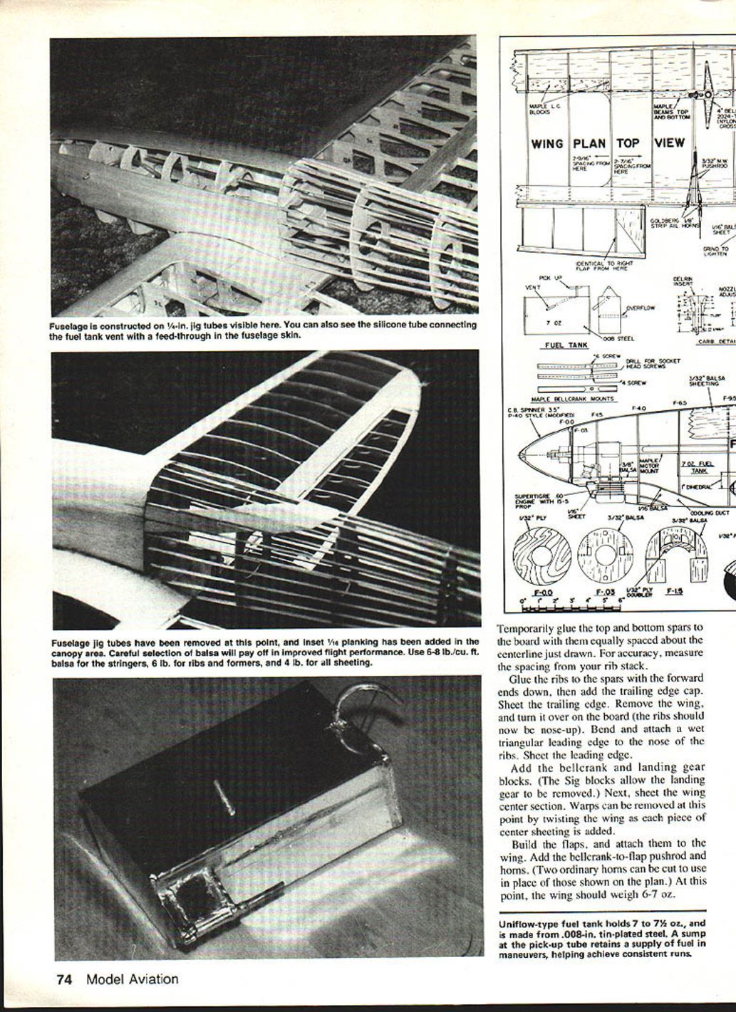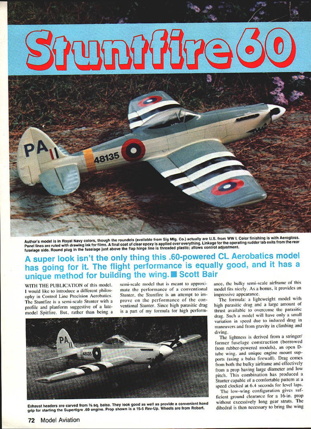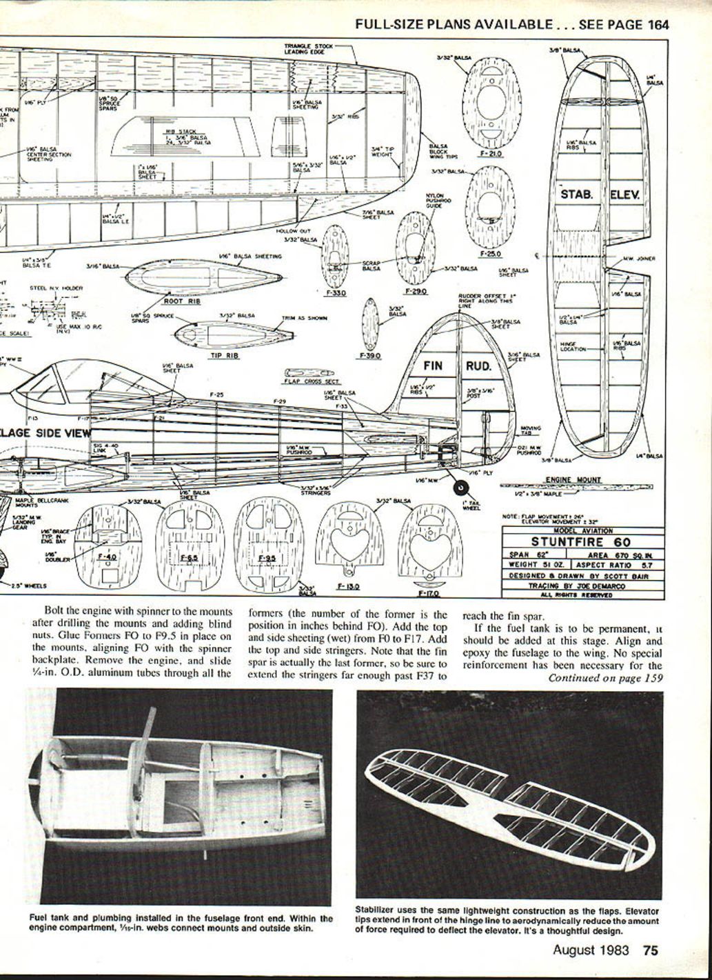 Authors model Royal Navy colors though roundels available Sig Mt g Co actually US WW Color finishing Aerogloss Panel lines ruled drawing ink films final coat clear epoxy applied over everything Linkage operating rudder tab exits rear fuselage side Round plug fuselage just above flap hinge line threaded plastic allows control adjustment super bok isnt thwy t 60-powered CL kerarPcs model fIigh4t S. itML~ WITH THE PUBLICATION modej would like introduce different philos ophy Control Line Precision Aerobatics Stuntfire semi-scale Stunter profile planform suggestive latemodel Spitfire rather being semi-scale model meant approxi mate performance conventional Stunter Stuntfire attempt im prove performance con ventional Stunter Since high parasitic drag part formula high performance bulky semi-scale airframe model fits nicely As bonus provides impressive appearance formula lightweight model high parasitic drag large amount thrust available overcome parasitic drag Such model will have small variation speed due induced drag maneuvers gravity climbing diving lightness derived stringer former fuselage construction borrowed rubber-powered models open D tube wing unique engine mount sup ports using balsa firewall Drag comes both bulky airframe effectively prop having large diameter low pitch combination has produced Stunter capable comfortable pattern speed clocked 64 seconds level laps low-wing configuration gives suf ficient ground clearance 16-in prop excessively long gear struts dihedral necessary bring wing 72 Model Aviation Exhaust headers carved alsa look good well provide convenient hand grip starting Supertigre 60 engine Prop shown 15-5 Rev-Up Wheels Robart tip up vertical center gravity CC elevation No flying problems caused dihedral shown plan low wing mounting also allows tank mounted least partly over leading edge wing reduces CG change resulting stability sensitivity change fuel burned contiguration also puts engine air intake high above ground reducing possibility gesting dirt 4-in bellerank used reduce force required control lines turn ing feel advantage airplane can made turn well very little line tension original bellcrank machined 2024-T-35 alu minum I-beam cross section Nylon bushings used bearing leadout boles pushrod hole shaft made 0-I tool steel heat-treated An aluminum set-screw collar retains crank shaft bushed bellerank weighs 5 grams has pulltested 80 lb An adequate bellerank can made nylon Delrin should thicker adequate strength shaft mounted between pair maple beams cut match dihedral angle lightened milling channel-shaped cross section Outboard engine thrust built gling engine mounts fuselage formers. Balsa /6-in webs connect mounts formers 2 skin obvi ating need plywood firewall very wide body means tank design need compromised fitting narrow fuselage tank features sump retains about 3-sec supply fuel pickup save weight tank permanently installed upright/inverted engine running characteristics equalized raising lowering venturi 0-ring seals usual spraybar/insert type intake used tank should made removable means hatch carb shown plan uses true venturi unlike spraybar-restrictor type fuel system usually used technical discus sion feature beyond scope article advantages reduced restriction inlet air pressure drop same fuel draw use needle valve assembly small orifice makes needle adjustment less sensitive Max IORC assembly particularly useful fuel fitting same side valve assembly valve can ad justed after starting engine having reach over airplane Construction Begin rough-cutting stacking sanding 25 ribs including thick center rib shape root airfoil shown fuselage side view Select very flat piece /2-in plywood length wing Cut slots wide 4 deep rib location Draw two lines representing wing center dihedral should 2 plywood board edge center 1 /2 edge tip August 1983 73 An early 46-powered version Stunifire 58-in span 43-oz weight Plans other pictures fifth model authors semi-scale series strinqer Construction Picture shows unique wing construction method Spars tacked building board proper angle dihedral has cutouts ribs method helps maintain alignment permits easy access wing structure work its progresses Bellcrank spans 4 between lead-out wires Nylon inserts evident wear points Belicrank mounts made maple engine mount material Mounts help brace wing center section Assembled flaps show lightweight construction Spars cut channel cross section trailing edge hollow Spar openings closed 1A6-ln cap Fuselage hg tubes have removed point inset /ie planking has added canopy area Careful selection balsa will pay oft improved flight performance Use 6-8 lb/cu ft balsa stringers 6 lb ribs formers 4 lb sheeting I---- MAPLE L GMAPLE BLOCKSBEAMS TOP4 BE LI ANDBOTTSd2024-U INYLO II CR05 Fl /zl GOLDBERG AR V ISTRIP AlL RGRNvIeBAI IGRIND TO LIGHTEN IDENTICAL TO RIGHT FLAP FROM HERE PIER UPDELR4 INSERT GENTNOZZLE OVERFLOW EELCARA DETAIL FUEL TANK SCREW GRILL FOR SOCKET HEAD SCREWS EZZIZZIEIZZ7C2~3/32 BALSA 4 SCREWSIIEETING MAPLE BELLCBANR MOIINTSF-9S F-AS C B SPINNER 35P40 P40 STYLE IMODIFEDIF-ED F-OO F-OSIL -- ~I3W MOTOR1DLESEL MDIIU DRR0RBJ SUPERTIGRE RO ENDuE WITh IS-S PROPV16OSOLING FilET V32 PLYST 3/32 BALSAS/32 BALSA IC o I11 -if I 01/ U orrSBB Temporarily glue top bottom spars board equally spaced about centerline just drawn accuracy measure spacing rib stack Glue ribs spars forward ends down add trailing edge cap Sheet trailing edge Remove wing turn over board ribs should now nose-up Bend attach wet triangular leading edge nose ribs Sheet leading edge Add bellcrank landing gear blocks Sig blocks allow landing gear removed Next sheet wing center section Warps can removed point twisting wing piece center sheeting added Build flaps attach wing Add bellcrank-to-flap pushrod horns Two ordinary horns can cut use place shown plan point wing should weigh 6-7 oz Unif low-type fuel tank holds 7 7 oz made 008-in tin-plated steel sump pick-up tube retains supply fuel maneuvers1 helping achieve consi