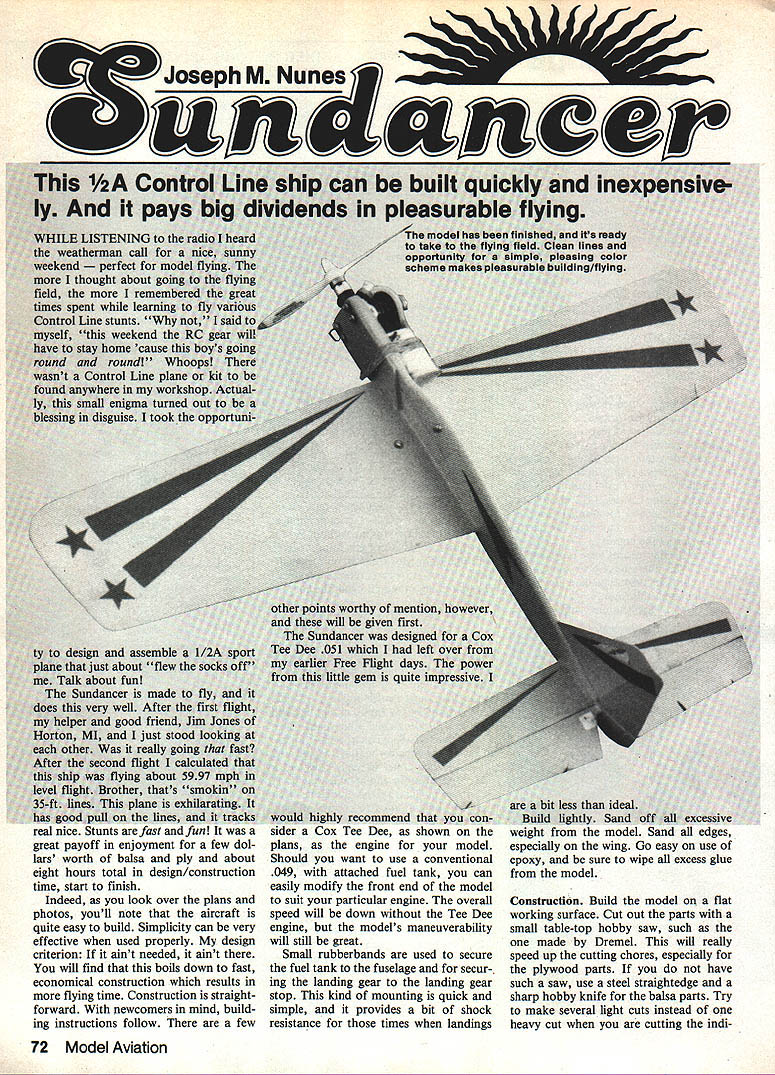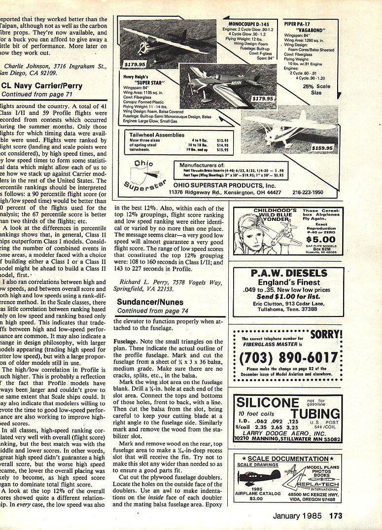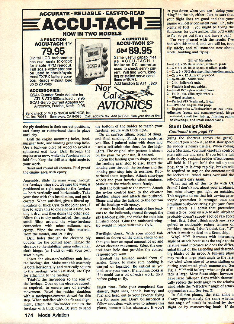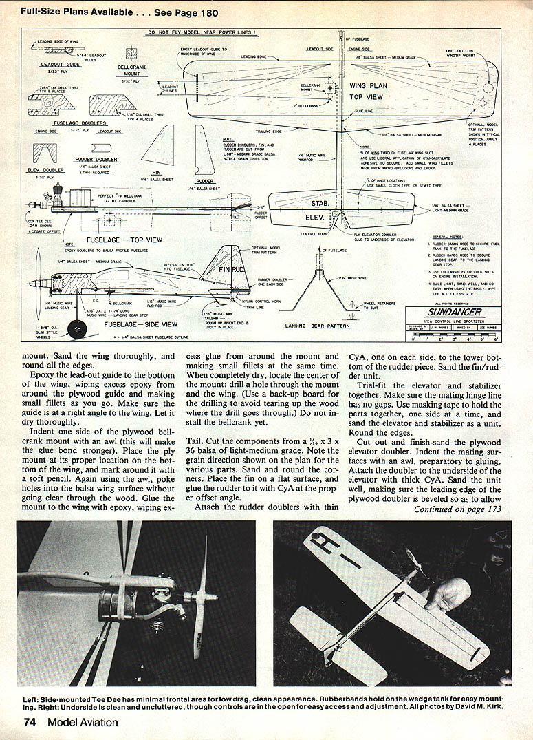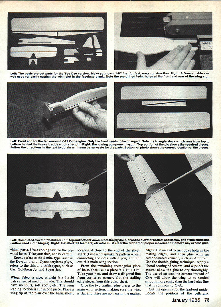 I just stoc really goi d flight lying about flher thats plane ex lines real nice Stunts fast great payoff enjoyment ior few aol lars worth balsa ply about eight hours total design/construction time start finish Indeed look over plans photos youll note aircraft quite easy build Simplicity can very effective used properly design criterion aint needed aint will find boils down fast economical construction results flying time Construction straight forward newcomers mind build ing instructions follow few recommend Tee Dee plans tne engine model Should want use conventional 049 attached fuel tank can easily modify front end model suit particular engine overall speed will down Tee Dee engine models maneuverability will still great Small rubberbands used secure fuel tank fuselage secur- ing landing gear landing gear stop kind mounting quick simple provides bit shock resistance times landings less ideal lightly Sand WLLIL modet ctI1u uI cially wing Go easy use epoxy sure wipe excess glue model Construction Build model flat working surface Cut out parts small table-top hobby saw such made Dremel will really speed up cutting chores especially plywood parts have such saw use steel straightedge sharp hobby knife balsa parts Try make several light cuts instead heavy cut cutting mdi72 Model Aviation Left The basic pro-cut parts Tee Dee version Make own kit first fast easy construction Right Dremel table saw used easily cutting wing slot fuseiage biank Note pre-driiied 1/a-in holes front rear wing siot Left Front end tank-mount 049 Cox engine Only front needs changed Note triangle stock runs top bottom behind firewall adds much strength Right Basic wing component layout Top portion plc shows required pieces Follow directions text obtain minimum balsa waste parts Bottom photo shows correct location pieces Left Completed elevator/stabilizer unit top bottom views Note tlie ply doubler elevator bottom narrow gap atthe hinge line author used cloth hinges Right Installed tail feathers elevator must clear rudder proper movement Remove excess glue vidual parts Use coping saw ply wood items Take time careful Epoxy refers 5-mm type such Devcon brand Cyanoacrylates CyA refers thin thick types such Carl Goldberg Jet Super Jet Wing Select nice straight x 4 x 36 balsa sheet medium grade should have no splits soft spots etc wing leading section cut piece Place wing tip plan over balsa sheet locating close end sheet Mark use dressmakers pattern wheel connecting dots pen cut out main wing section remaining rectangular piece balsa sheet cut piece x 1 x 11 Take pen draw diagonal line corner corner Cut trailing edge pieces balsa sheet Glue two trailing edge pieces main wing section making sure wing flat no gaps mating edges Use awl first poke holes mating edges glue acetone-based cement such Ambroid Use double-gluing technique Apply liberal coating cement wipe off excess allow glue dry thoroughly use acetone cement instead CyA will allow wing sanded smooth easily hard glue line common CyA Cut opening lead-out guide Locate position bellcrank January1985 73 Full-Size Plans Available. See Page 180 DO NOT FLY MODEL NEAR POWER L*ES LEASING EASE GEWBIN LEADOUTGUIBELLCRANK SVSA PLYMOUNT SYD PLY TVSA AC GRILL lIEU ~ISLAA DRILL TIES FUSELAGE DOWLERS ENGINE SEESVSA PLYEAGOJY SCE ELEV DOUBLER RUOER DOUSER IA BALSA ACEET TWO SEACRSEO EPOXY LEAGOUT GLEE TALEASOUT SEE fAGITEGiDLONE CENT COW WISERSIXE OF WING LEASING ERGE NIYR BALSA GREET GROWl GRAMWINGTIP WEIGHT I_ ~~I7zzr~ LEASOITTELLORANAIWING PLAN 41--______TOP VIEW ROT~ RELLCRATE GLUE LISE Al 7 FIN IIS BALSA SlEET 7 LiRETFECT IS WEASTAUC TEEEE FUSELAGE TOP VIEW SOOU DAGGRESO RON AM SORARA APE CAT FRAGI LIATIT GROILMA GRGOF BALSAVA MARC WIRE NOTICE GRAIN CIRECTIOWPO5HTOR RUR VIR BALSA SlEET -j 0R BALSA WEET ARGEMA GRADESHOWN IN TYPEAL AND USE LIBERAL APPLICATION OF CYBAAOMORYLGTE STABJO BALSA SlEET fl~rELEV AYL OATSPLO ELEVATOR APLINLER GLUE TO ASMIEROCE OF ELEVATOR IA BALSA SlEET GROOM GRACE OECESS FIN VIA AlTO FSELACE/ FINI [I (IA MURIC WIRE r IYM AGd FUSELAGE- SIDE VIEW I14 BALSA SSEET FGSELAGE QATLINE UD\ i INLLCTAM15 EISA WIRENYLOI CONTRA TORI RUWASORTRW LME VIA ADA VIVA LONG ERIC GRRELASEIRA SEAR STOPIVR MUSIC WINE IVIS MASIC AIRE LANDING PATTERN RJLO LIGYT SAM WELL ANO GO SUNDANER I~IABBWRIf~EST UEN ~45N mount Sand wing thoroughly round edges Epoxy lead-out guide bottom wing wiping excess epoxy around plywood guide making small fillets go Make sure guide right angle wing Let dry thoroughly Indent side plywood bellcrank mount awl will make glue bond stronger Place ply mount its proper location bot tom wing mark around soft pencil Again using awl poke holes balsa wing surface going clear through wood Glue mount wing epoxy wiping ex cess glue around mount making small fillets same time completely dry locate center mount drill hole through mount wing Use back-up board drilling avoid tearing up wood drill goes through stall bellcrank yet Tail Cut components AR x 3 x 36 balsa light-medium grade Note grain direction shown plan various parts Sand round cor ners Place fin flat surface glue rudder CyA prop er offset angle Attach rudder doublers thin CyA side lower bot tom rudder piece Sand fin/rud der unit Trial-fit elevator stabilizer together Make sure mating hinge line has no gaps Use masking tape hold parts together side time sand elevator stabilizer unit Round edges Cut out finish-sand plywood elevator doubler Indent mating sur faces awl preparatory gluing Attach doubler underside elevator thick CyA Sand unit well making sure leading edge plywood doubler beveled allow Continued page 173 Left Side-mounted Tee Dee has minimal frontal area low drag clean appearance Rubberbands hold wedge tankfor easy mount ing Right Underside clean uncluttered though controls open foreasyaccess adjustment photos David M Kirk 74 Model Aviation eported thai worked better aipan although well carbon ibre props Theyre now available buck can afford give away ittle bit performance later iow work out Charlie 