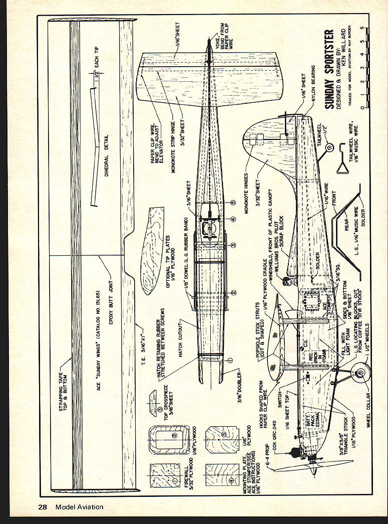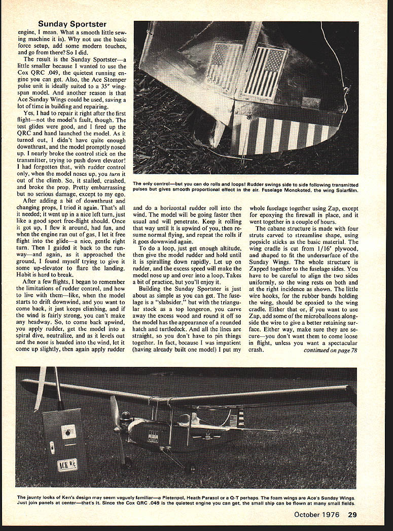 unduy F Sunday sport RCer 049 rudder-only pulse job inexpensive cinch build Ken Willard WHEN WAS ASKED Model vi ion design rudder-only pulse job modelers still enjoying least costly phase RC flying sug gested might try low-wing design just something different So sketched out nice looking little job put together test flew confirmed opinion formed long time ago lowwing models rudder-only control dont mix well Oh yes can get fly lots have flown good rudder-controlled aircraft just cant equal high-wing design So discarded low-wing idea design will used later rudder elevator control started over time went back basics best design rudder-only control sim ple Design good free-flight sport modelone will fly well radio control properly adjusted will recover stalls turns dives itself resume normal flight attitude Back early days radio control Don Mathis got radio enthusiasts riled up remarking radio-controlled airplanes just free-flight models flight path occasionally inter rupted turning rudder time right Now phisticated systems RC planepar ticularly competitive precision contest designis long way being good free-flight model go point recover command So rudder job use good freeflight design made easy years ago1938 exactModelAir plane News published CAVU para sol monoplane designed old Elf ignition engine Ive still got itthe October1976 27 Right The old master fun-model designs himself Sunday Sportsterthe ship reflects direct no-nonsense approach exam pie below simple strut arrangement stay-put gear STRAPPING TAPE TOP S BOTTOM E SUNDAY WINGS CATALOG NO 13L65I7TCTV EACH TIP DIHEDRAL DETAL EPOXY BUTT JOINT -Li-\i7--_ TE _ N I I HATCH RETAINING RUBBER TOP CROSSPECE STRETCHED BETWEEN SCREWS 0000 M6SHEET FIREWALL 3/32k PLYWV16PLYWOOO HATCH CUTOUT x IONAL TIP PLATES 1/16 PLYWOOD I/B DOWEL LG RUBBER BAND PAPER CLIP WIRE BENOTOADJUST ELEVATOR MONOKOTE STRIPHINGE 4 MOUNTING PLATE 1/16 ACE STOMPERCSEE PLYWOOD ACE INSTRUCTIONS V16WOOO V COX ORC049 POPSICLE STICK STRUTS HOOKS SHAPED FROMCUT B SHAPED1/16 PLYWOOD CRADLE PAPER CLIP WIRE WINDSHIELD FRONT OF PLASTIC CANOPY WLLIAMS BROS PILOT SWITCHSCRAP BLOCK 1/16 SHEET TOP7 LI____I/16SHEET I_ iT~-MCK____________NYLON BEARING _____SOLDER___ ___ LIGHT FOAMI/iS SHEET 1/16 PLYWOODLG LOCAT WIG BLOCKS CUT FROM COFFEE STIR StICKSLG I/16MUSIC WIRE SOLDER WHEEL COLLARI 1/2 WHEELS TAILWHEEL WIRE 1/16 MUSIC WIRE SUNDAY SPORTSTER DESIGNED & DRAWN BY KEN WILLARD TRACED FOR MODEL AVIATION BY RAY BORDEN 0I23456 N 0 0 CD 0 0 Sunday Sportster engine mean What smooth little sew ing machine use basic force setup add some modern touches go So did result Sunday Sportstera little smaller because wanted use Cox QRC 049 quietest running en gine can get Also Ace Stomper pulse unit ideally suited 35 wing span model another reason Ace Sunday Wings could used saving lot time building repairing Yes repair right after first flightnot models fault though test glides good fired up QRC hand launched model As turned out didnt have quite enough downthrust model promptly nosed up nearly broke control stick transmitter trying push down elevator forgotten rudder control model noses up turn out climb So stalled crashed broke prop Pretty embarrassing no serious damage except ego After adding bit downthrust changing props tried again Thats needed went up nice left turn just like good sport free-flight should Once got up flew around fun engine ran out gas let free flight glidea nice gentle right turn guided back run wayand again approached ground found myself trying give some up-elevator flare landing Habit hard break After few flights began remember limitations rudder control live themlike model starts drift downwind want come back just keeps climbing wind fairly strong cant make headway So come back upwind apply rudder get model spiral dive neutralize levels out nose headed wind let come up slightly again apply rudder horizontal rudder roll wind model will going faster usual will penetrate Keep rolling way until upwind re sume normal flying repeat rolls goes downwind again loop just get enough altitude give model rudder hold until spiralling down rapidly Let up rudder excess speed will make model nose up over loop Takes bit practice youll enjoy Building Sunday Sportster just about simple can get fuse lage slabsider triangu lar stock top longeron carve away excess wood round off model has appearance rounded hatch turtledeck lines straight dont have pin things together fact because impatient having already built model put whole fuselage together using Zap except epoxying firewall place went together couple hours cabane structure made four struts carved streamline shape using popsicle sticks basic material wing cradle cut 1/16 plywood shaped fit undersurface Sunday Wings whole structure Zapped together fuselage sides have careful align two sides uniformly wing rests both right incidence shown little wire hooks rubber bands holding wing should epoxied wing cradle Either want use Zap add some microballoons along side wire give better retaining sur face Either way make sure se cureyou dont want come loose flight unless want spectacular crashcontinued page 78 October1976 29 controlbut can rolls loopsl Rudder swings side side following transmitted pulses gives smooth proportional effect air Fuselage Monokoted wing Solarfllm jaunty looks Kens design may seam vaguely familiara Piatenpol Heath Parasol QT perhaps foam wings Aces Sunday Wings Just join panels centerthats Since Cox QRC 049 quietest engine can get small ship can flown small fields RC Sport/Van Putte continued page 21 book contest directors new CDs can avoid pitfalls con test has no matter what size Are volunteers Another thing noticed contests far year flying quality has im proved lower classes especially Advanced class old Class B D Novice D Expert setup Class B now called Advanced used lowpopulation hodgepodge fliers widely varying ability First fliers became impatient earning graduation Class now called Novice promoted themselves Class B older flie