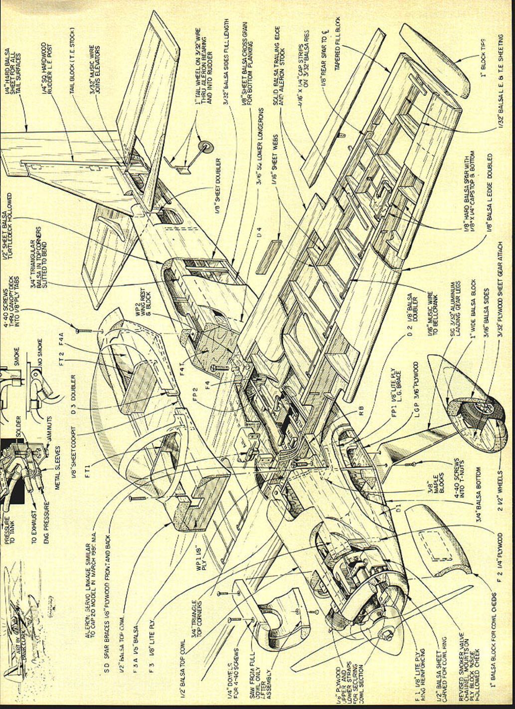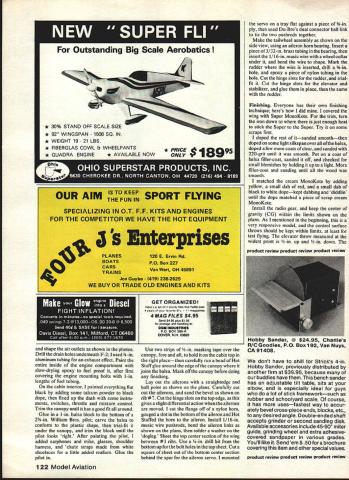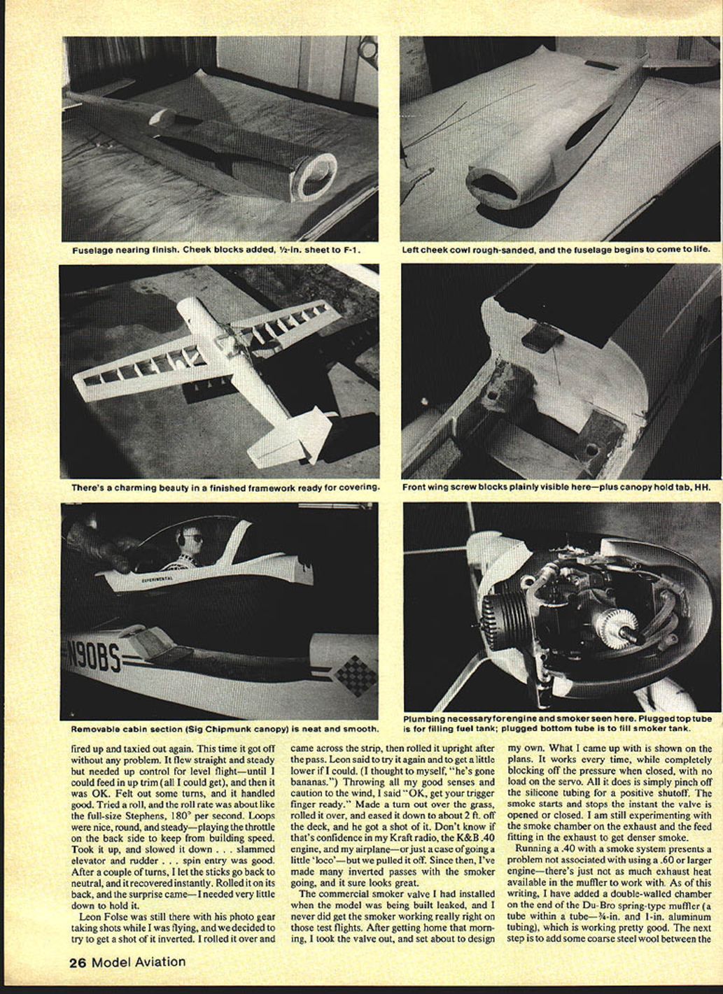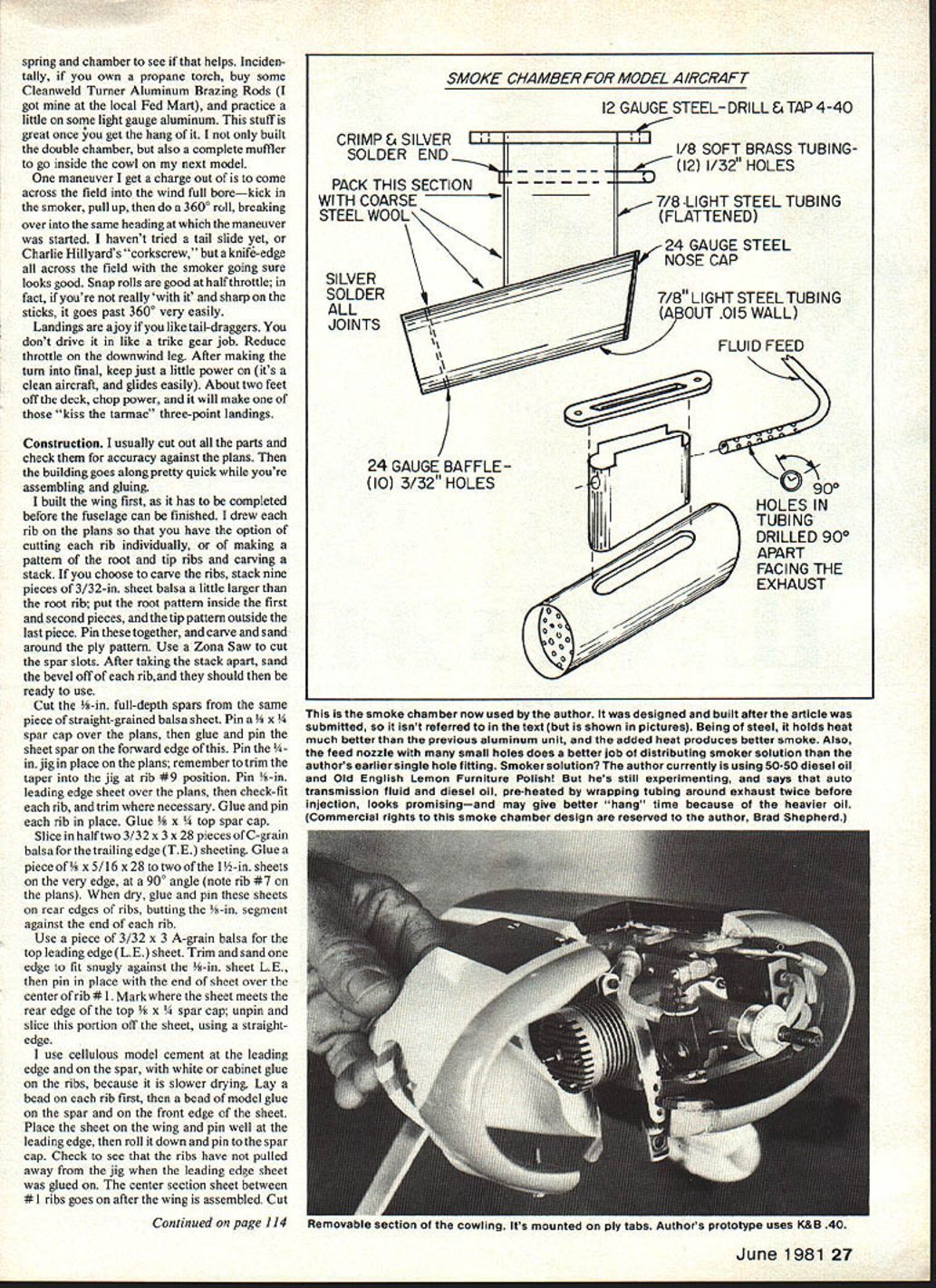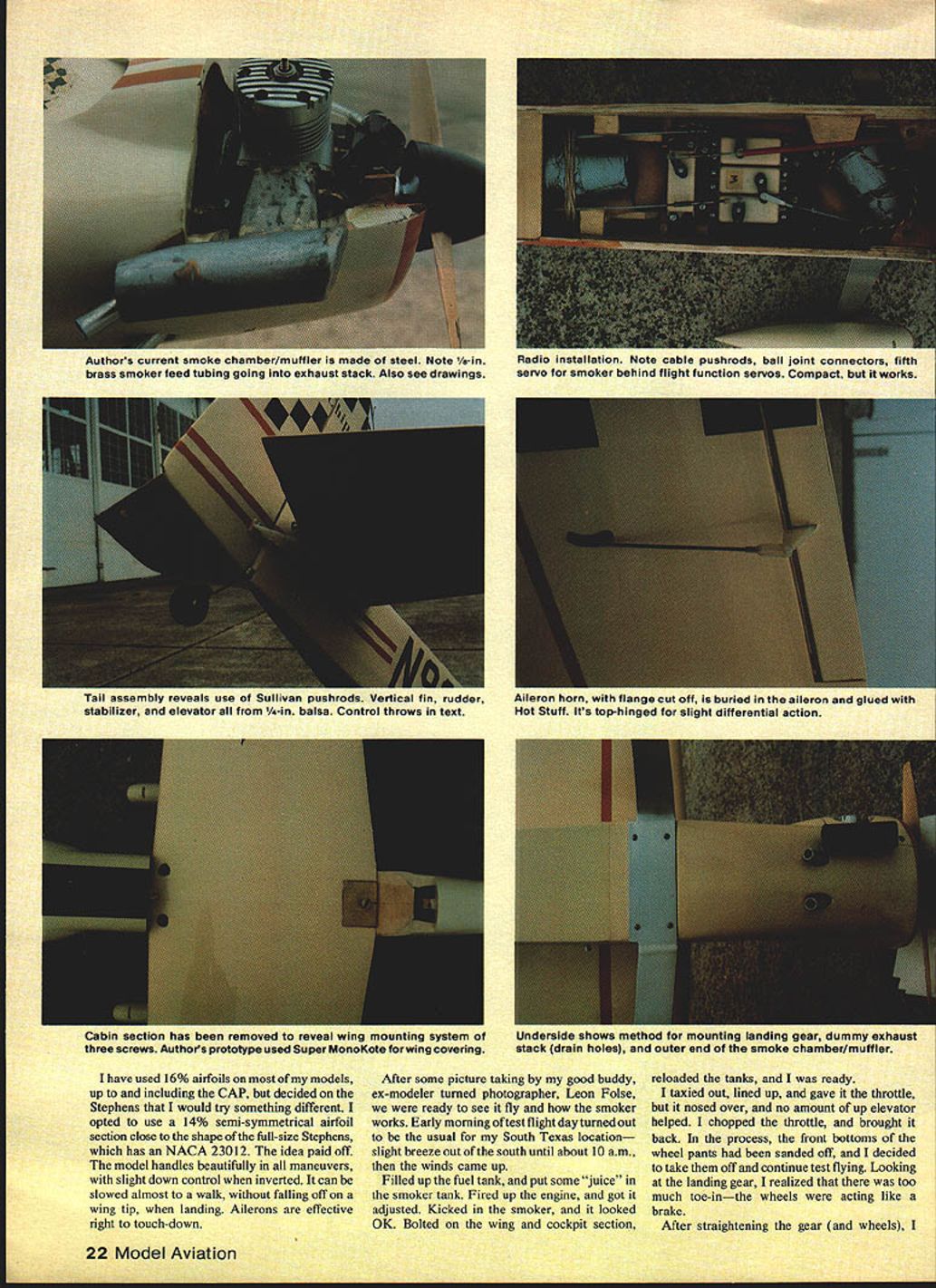NO OCR TEXT NO OCR TEXT Underside shows method mounting landing gear dummy exhaust stack drain holes outer end smoke chamber/muffler have used 16% airfoils models up including CAP decided Stephens would try something different opted use 14% semi-symmetrical airfoil section close shape full-size Stephens has NACA 23012 idea paid off model handles beautifully maneuvers slight down control inverted can slowed almost walk falling off wing tip landing Ailerons effective right touch-down After some picture taking good buddy ex-modeler turned photographer Leon Folse ready see fly smoker works Early morning test flight day turned out usual South Texas location slight breeze out south until about 10 am winds came up Filled up fuel tank put some juice smoker tank Fired up engine got adjusted Kicked smoker looked OK Bolted wing cockpit section reloaded tanks ready taxied out lined up gave throttle nosed over no amount up elevator helped chopped throttle brought back process front bottoms wheel pants sanded off decided take off continue test flying Looking landing gear realized too much toe-in wheels acting like brake After straightening gear wheels 22 Model Aviation Authors current smoke chamber/muffler made steel Note 1am brass smoker feed tubing going exhaust stack Also see drawings Radio installation Note cable pushrods ball joint connectors fifth servo smoker behind flight function servos Compact works Tail assembly reveals use Sullivan pushrods Vertical fin rudder stabilizer elevator /4-in balsa Control throws text Aileron horn flange cut off buried aileron glued Hot Stuff Its top-hinged slight differential action Cabin section has removed reveal wing mounting system three screws Authois prototype used Super MonoKote forwing covering PRESSURE4-40 SCREWS1/2 SHEET BALSA1/4 HARD BALSA 10 TANKTHRU CANOPY DECKTURTLECECK HOLLOWED SHEET FOR ALL TAIL SURFACES ENG PRESSUREBALSA IN TOP CORI\ERS/4 SQ HARDWOOD _RUDDER LE POST TAIL BLOCK TESTOCK AIEROR SERVO LNKALE SIMILAR TO CAP 20 MODEL IN MARCH 198r MA3/32 MUSIC WIRE JOINS ELEVATORS S 0 SPAR BRACES I/8PLYWOOD FRONTAND BACK V2 BALSA TOP COWL F3A I/B BALSA 1/2 BALSA TOP COWL TOP CORNERSWP1I/B1TAJLWHEELON 3/32WIRE THRU AILERON BEARING AND INTO RUDDER 3/32 BALSA SIDES FLLL LENGTh /4 DY//FLS FOR 4-40 SCREWS I/BSI-IEET BALSA CROSS GRAiN SAW FROM FULL FOR BoTroM PLANKING COWL ONLY AFTER 1/16 SHEET WEBSSOLID BALSA TRAILING EDGE AND AILERON STOCK 7/16 X /4CAP STRIPS ON 32BALSA RIBS 1/8 REAR SBAR TO I/b PLrVVOOD TAPERED FILL BIDK UPPER AND LOWER STRAPS OR SECURING F TOUBLER LGP RING REINFORCING3/IGPLYWOOO 1/16 MUSIC WIRE 1/2 BALSA SHEETTO BELLCRANK CARVED FOR COWL RINGBLOCKS SIC 3/32ALUMINUM 4-40 SCREWSLANDING GEAR LEGS REVISED SMOKER VALVEINTO T-NUTS CHAIJNEL MOUNTS ON1 WIDE BALSA BLOCKI/B X L4 CAPSTOP OM PLY BLOCK NSIDE HOLLOWED CHEEK3/4 BALSA BOTTOM 3/16 BALSA SIDESI/B BALSA L EDGE DOUBLED BALSA BLOCK FOR COWL CHEEI 3/32 PLYWOCO SHEET GEAR AlTACH 2 V2 WHEELS1/32 BALSA L B TE SHEETING FULL-SIZE PLANS AVAILABLE . SEE PAGE 140 0 3 Ii0-4 CecOCx CSEEKCOWL 02 --F rI SA CNNWE CAWAIN NA FAA Ij F-I202 ISAF3A-FT2~ SC AS P15iasts SAl CHIPS 24 Model Aviation SmoKer tank goes tne oouom Note roam peung erouno ii smoker valve trial-fitted bottom crankcase viow Lnter wee moved hollowed-out cheek cowl er Diane s. .elage construction Fuel tank already installed1 FULL-SIZE PLANS AVAILABLE . SEE PAGE 140 SR-I Ckilkb June 1981 25 K wing panama uumng guims reuse vs-sq jig strip aiign rear OT ribs wing halves being assemoica riot blOCKS center ana St TIPS CocKpit section being built Separated wing rest fuselage polyethylene Balsa floor 3/32-in conforms airfoil shape uiue i--i form pattern shaping nose blocks fired up taxied Out again time got off problem flew straight steady needed up control level flightuntil could feed up trim could get OK Felt out some tums handled good Tried roll roll rate about like full-size Stephens 1800 per second Loops nice round steadyplaying throttle back side keep building speed Took up slowed down. slammed elevator rudder in entry good After couple turns let sticks go back neutral recovered instantly Rolled its back surprise cameI needed very little down hold Leon Folse still photo gear taking shots flying decided try get shot inverted rolled over caine across strip rolled upright after pass Leon said try again get little lower could thought myself hes gone bananas Throwing good senses caution wind said OK get trigger finger ready Made turn out over grass rolled over eased down about 2 ft off deck got shot Dont know thats confidence Kraft radio K&B 40 engine airplaneor just case going little locobut pulled off Since Ive made inverted passes smoker going sure looks great commercial smoker valve installed model being built leaked never did get smoker working really right test flights After getting home morn ing took valve out set about design own What came up shown plans works time completely blocking off pressure closed no load servo does simply pinch off silicone tubing positive shutoff smoke starts stops instant valve opened closed am still experimenting smoke chamber exhaust feed fitting exhaust get denser smoke Running 40 smoke system presents problem associated using 60 larger enginetheres just much exhaust heat available muffler work As writing have added double-walled chamber end Du-Bro spring-type muffler tube within tube-in 1-in aluminum tubing working pretty good next step add some coarse steel wool between 26 Model Aviation Fuselage nearing finish Cheek blocks added 1/2-in sheet F-i Left cheek cowl rough-sanded fuselage begins come life neres cnarming beauty tinished framework ready covering i-rant wing screw oiocita plainly visigie nerepius canopy noia Tao liii Removable cabin section sig Chipmunk canopy neat smooth piumoing necessaryrorengine ano smoker seen nere riuggedtop tuoe filling fuel tank plugged bottom tube fill smoker tank spring chamber see helps Inciden tally own propane torch buy some Cleanweld Turner Aluminum Brazing Rods got l
