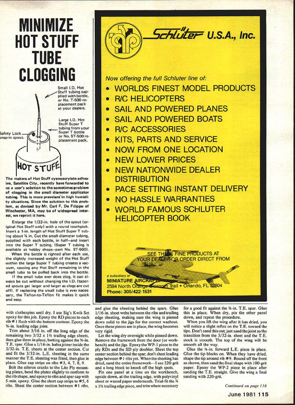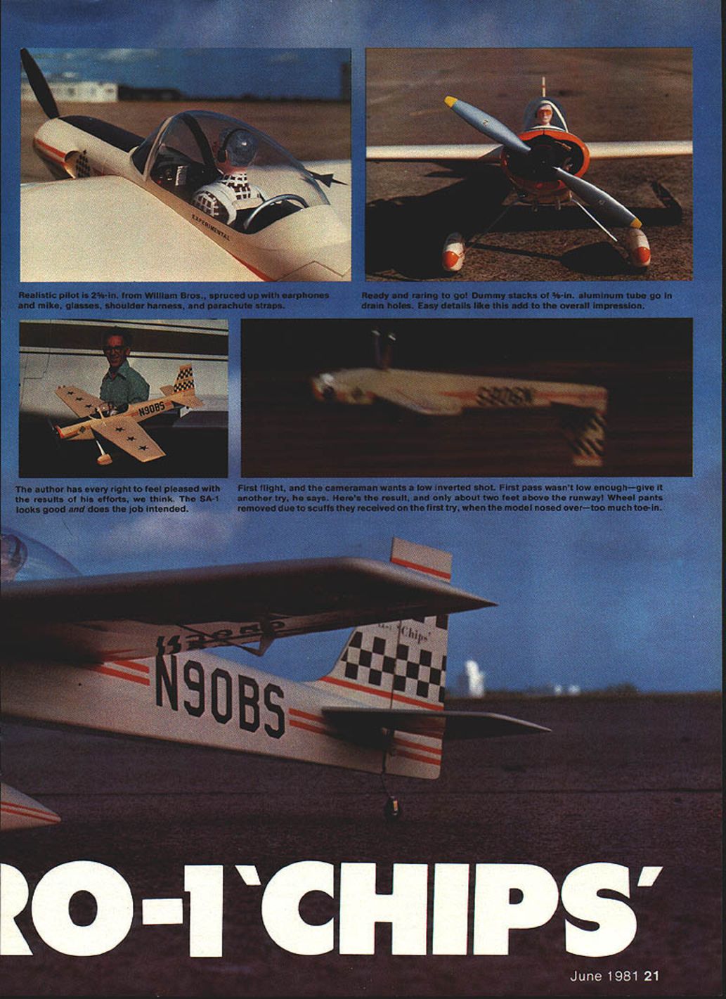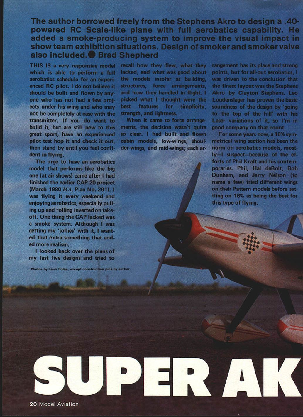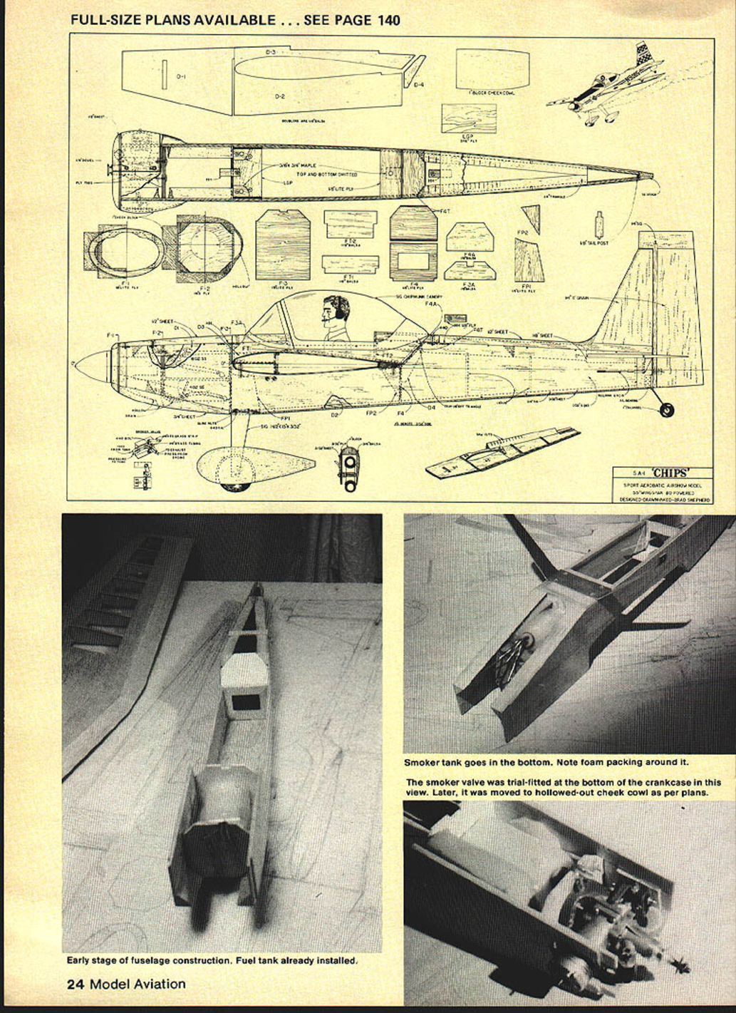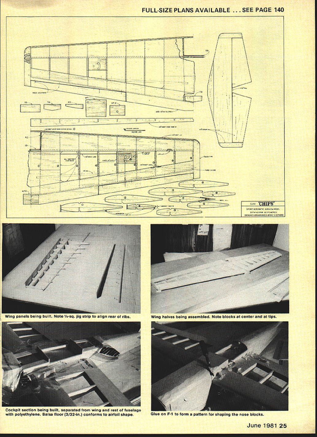 NO OCR TEXT NO OCR TEXT Underside shows method mounting landing gear dummy exhaust stack drain holes outer end smoke chamber/muffler have used 16% airfoils models up including CAP decided Stephens would try something different opted use 14% semi-symmetrical airfoil section close shape full-size Stephens has NACA 23012 idea paid off model handles beautifully maneuvers slight down control inverted can slowed almost walk falling off wing tip landing Ailerons effective right touch-down After some picture taking good buddy ex-modeler turned photographer Leon Folse ready see fly smoker works Early morning test flight day turned out usual South Texas location slight breeze out south until about 10 am winds came up Filled up fuel tank put some juice smoker tank Fired up engine got adjusted Kicked smoker looked OK Bolted wing cockpit section reloaded tanks ready taxied out lined up gave throttle nosed over no amount up elevator helped chopped throttle brought back process front bottoms wheel pants sanded off decided take off continue test flying Looking landing gear realized too much toe-in wheels acting like brake After straightening gear wheels 22 Model Aviation Authors current smoke chamber/muffler made steel Note 1am brass smoker feed tubing going exhaust stack Also see drawings Radio installation Note cable pushrods ball joint connectors fifth servo smoker behind flight function servos Compact works Tail assembly reveals use Sullivan pushrods Vertical fin rudder stabilizer elevator /4-in balsa Control throws text Aileron horn flange cut off buried aileron glued Hot Stuff Its top-hinged slight differential action Cabin section has removed reveal wing mounting system three screws Authois prototype used Super MonoKote forwing covering PRESSURE4-40 SCREWS1/2 SHEET BALSA1/4 HARD BALSA 10 TANKTHRU CANOPY DECKTURTLECECK HOLLOWED SHEET FOR ALL TAIL SURFACES ENG PRESSUREBALSA IN TOP CORI\ERS/4 SQ HARDWOOD _RUDDER LE POST TAIL BLOCK TESTOCK AIEROR SERVO LNKALE SIMILAR TO CAP 20 MODEL IN MARCH 198r MA3/32 MUSIC WIRE JOINS ELEVATORS S 0 SPAR BRACES I/8PLYWOOD FRONTAND BACK V2 BALSA TOP COWL F3A I/B BALSA 1/2 BALSA TOP COWL TOP CORNERSWP1I/B1TAJLWHEELON 3/32WIRE THRU AILERON BEARING AND INTO RUDDER 3/32 BALSA SIDES FLLL LENGTh /4 DY//FLS FOR 4-40 SCREWS I/BSI-IEET BALSA CROSS GRAiN SAW FROM FULL FOR BoTroM PLANKING COWL ONLY AFTER 1/16 SHEET WEBSSOLID BALSA TRAILING EDGE AND AILERON STOCK 7/16 X /4CAP STRIPS ON 32BALSA RIBS 1/8 REAR SBAR TO I/b PLrVVOOD TAPERED FILL BIDK UPPER AND LOWER STRAPS OR SECURING F TOUBLER LGP RING REINFORCING3/IGPLYWOOO 1/16 MUSIC WIRE 1/2 BALSA SHEETTO BELLCRANK CARVED FOR COWL RINGBLOCKS SIC 3/32ALUMINUM 4-40 SCREWSLANDING GEAR LEGS REVISED SMOKER VALVEINTO T-NUTS CHAIJNEL MOUNTS ON1 WIDE BALSA BLOCKI/B X L4 CAPSTOP OM PLY BLOCK NSIDE HOLLOWED CHEEK3/4 BALSA BOTTOM 3/16 BALSA SIDESI/B BALSA L EDGE DOUBLED BALSA BLOCK FOR COWL CHEEI 3/32 PLYWOCO SHEET GEAR AlTACH 2 V2 WHEELS1/32 BALSA L B TE SHEETING FULL-SIZE PLANS AVAILABLE . SEE PAGE 140 0 3 Ii0-4 CecOCx CSEEKCOWL 02 --F rI SA CNNWE CAWAIN NA FAA Ij F-I202 ISAF3A-FT2~ SC AS P15iasts SAl CHIPS 24 Model Aviation SmoKer tank goes tne oouom Note roam peung erouno ii smoker valve trial-fitted bottom crankcase viow Lnter wee moved hollowed-out cheek cowl er Diane s. .elage construction Fuel tank already installed1 FULL-SIZE PLANS AVAILABLE . SEE PAGE 140 SR-I Ckilkb June 1981 25 K wing panama uumng guims reuse vs-sq jig strip aiign rear OT ribs wing halves being assemoica riot blOCKS center ana St TIPS CocKpit section being built Separated wing rest fuselage polyethylene Balsa floor 3/32-in conforms airfoil shape uiue i--i form pattern shaping nose blocks fired up taxied Out again time got off problem flew straight steady needed up control level flightuntil could feed up trim could get OK Felt out some tums handled good Tried roll roll rate about like full-size Stephens 1800 per second Loops nice round steadyplaying throttle back side keep building speed Took up slowed down. slammed elevator rudder in entry good After couple turns let sticks go back neutral recovered instantly Rolled its back surprise cameI needed very little down hold Leon Folse still photo gear taking shots flying decided try get shot inverted rolled over caine across strip rolled upright after pass Leon said try again get little lower could thought myself hes gone bananas Throwing good senses caution wind said OK get trigger finger ready Made turn out over grass rolled over eased down about 2 ft off deck got shot Dont know thats confidence Kraft radio K&B 40 engine airplaneor just case going little locobut pulled off Since Ive made inverted passes smoker going sure looks great commercial smoker valve installed model being built leaked never did get smoker working really right test flights After getting home morn ing took valve out set about design own What came up shown plans works time completely blocking off pressure closed no load servo does simply pinch off silicone tubing positive shutoff smoke starts stops instant valve opened closed am still experimenting smoke chamber exhaust feed fitting exhaust get denser smoke Running 40 smoke system presents problem associated using 60 larger enginetheres just much exhaust heat available muffler work As writing have added double-walled chamber end Du-Bro spring-type muffler tube within tube-in 1-in aluminum tubing working pretty good next step add some coarse steel wool between 26 Model Aviation Fuselage nearing finish Cheek blocks added 1/2-in sheet F-i Left cheek cowl rough-sanded fuselage begins come life neres cnarming beauty tinished framework ready covering i-rant wing screw oiocita plainly visigie nerepius canopy noia Tao liii Removable cabin section sig Chipmunk canopy neat smooth piumoing necessaryrorengine ano smoker seen nere riuggedtop tuoe filling fuel tank plugged bottom tube fill smoker tank spring chamber see helps Inciden tally own propane torch buy some Cleanweld Turner Aluminum Brazing Rods got l