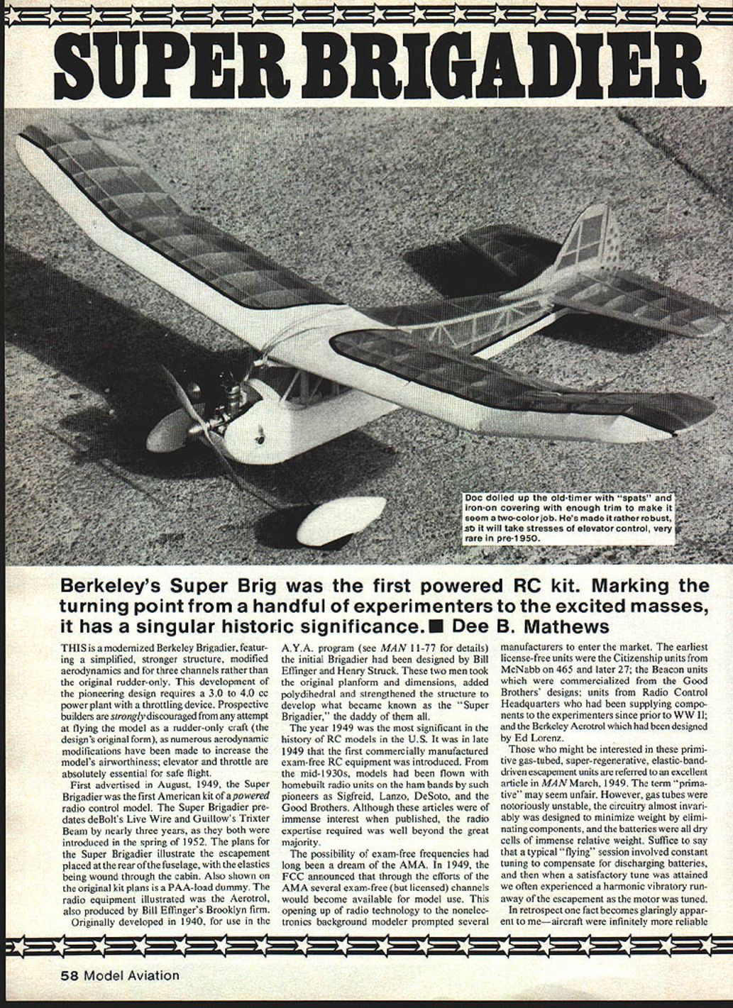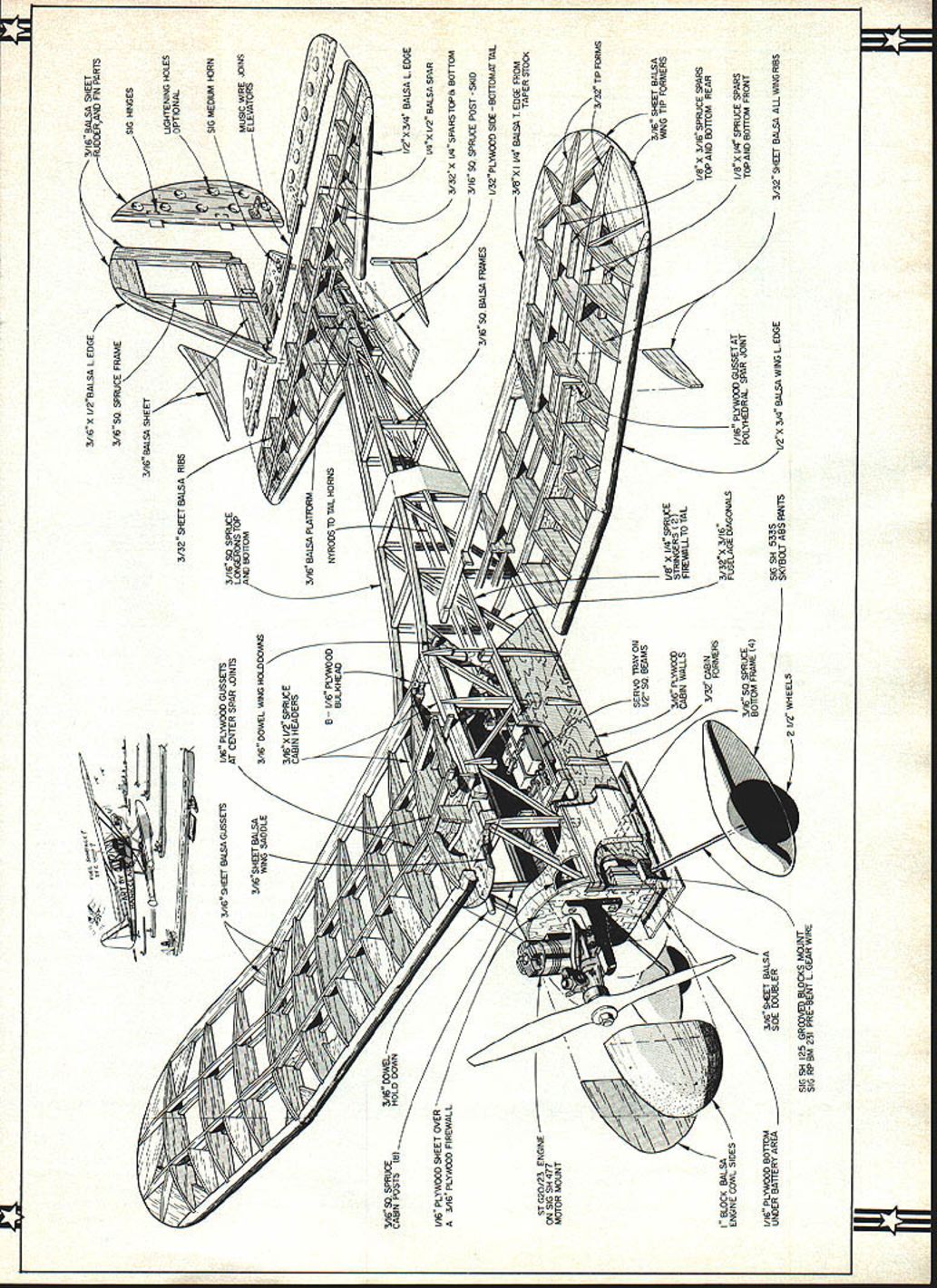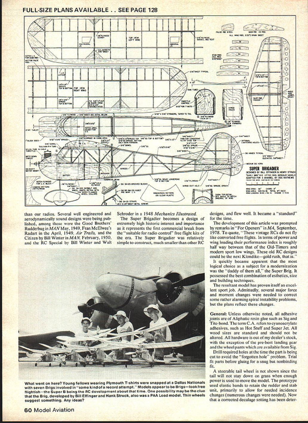 I SUPER BRIGADIER Berkeleys Super Brig first powered RC kit Marking turning point handful experimenters excited masses has singular historic significanceE Dee B Mathews THIS modernized Berkeley Brigadier featur ing simplified stronger structure modified aerodynamics three channels rather original rudder-only development pioneering design requires 30 40 cc power plant throttling device Prospective builders strongly discouraged attempt flying model rudder-only craft designs original form numerous aerodynamic modifications have made increase models airworthiness elevator throttle absolutely essential safe flight First advertised August 1949 Super Brigadier first American kit apowered radio control model Super Brigadier pre dates deBolts Live Wire Guillows Trixter Beam nearly three years both introduced spring 1952 plans Super Brigadier illustrate escapement placed rear fuselage elastics being wound through cabin Also shown original kit plans PAA-load dummy radio equipment illustrated Aerotrol also produced Bill Effingers Brooklyn firm Originally developed 1940 use AYA program see MAN 11-77 details initial Brigadier designed Bill Effinger Henry Struck two men took original planform dimensions added polydihedral strengthened structure develop what became known Super Brigadier daddy year 1949 significant history RC models US late 1949 first commercially manufactured exam-free RC equipment introduced mid-1930s models flown homebuilt radio units ham bands such pioneers Sigfreid Lanzo DeSoto Good Brothers Although articles immense interest published radio expertise required well beyond great majority possibility exam-free frequencies long dream AMA 1949 FCC announced through efforts AMA several exam-free licensed channels would become available model use opening up radio technology nonelec tronics background modeler prompted several manufacturers enter market earliest license-free units Citizenship units McNabb 465 later 27 Beacon units commercialized Good Brothers designs units Radio Control Headquarters supplying compo nents experimenters since prior WW II Berkeley Aerotrol designed Ed Lorenz might interested primi tive gas-tubed super-regenerative elastic-banddriven escapement units referred excellent article MAN March 1949 term prima tive may seem unfair However gas tubes notoriously unstable circuitry almost invari ably designed minimize weight elimi nating components batteries dry cells immense relative weight Suffice say typical flying session involved constant tuning compensate discharging batteries satisfactory tune attained often experienced harmonic vibratory run away escapement motor tuned retrospect fact becomes glaringly appar ent meaircraft infinitely reliable 58 Model Aviation V K BLOCK BALSA ENGINE COWL SIDES 1/16 PLYWOOD BOTTOM3/16 SI-EET BALSA UNDER BATTERY AREASIDE DOUBLER SIG SH 125 GROOVED BLOCKS MOJNT SIG NP BM 231 PRE-BENT LGEAR WIRE 3/16 X I/2BALSA LEDGE3/16 BALSA SHEET RUODERAND FiN PARTS 316 50 SPRUCE FRAME 3/32 SHEET BALSA RIBSI PTIONAL 1LIGHTENING HOLES 3/16 BALSA PLATFORM NYRODS TO TEL HORNS I/2X 3/4 BALSA L EDGE L4X 1/2 BALSA SPAR 3/32X I/4SPARSTOP8 BOTTOM 3/16 50 SPRUCE POST SKID 316 50 BALSA FRAMES I/32PLtWOOD SICE -BOTTOMATTAL 3/32 TIP FORMS Ls X 1/4 SPRUCE STRINGERS 121 RW6LLTO TAL 3/32X 3/16 FUSELAGE DIAGONALS 3/16 SHEET BALSA IARNG TIP FORMERS 7 / 3/32 SHEET BALSA ALL WTNG RIBS /21 3/4 BALSA WING LEDGE 111 I/B X 3/16 SPRUCE SPARS TOP AND BOTTOM REAR I/B X 1/4 SPRUCE SPARS TOP AND BOTTOM FRONT / N 3/16 SHEET BALSA GUSSETS 3/16SHEET BALSA WING SADDLE B 1/16 PLYWOOD BULKHE AD _L 1/16 PLYWOOD GUSSETS AT CENTER SPAR LINTS 316 DOWEL WING HOLD DOWNS 3A6X 1/2 SPRUCE CABIN HEADERS 3/16 50 SPRUCE3/16 DOWEL CABIN POSTS 16HOLD DOWN N 1/16 PLYWOOD SHEET OVER 3/16 PLYBD FIREWALL STG2O/23 ENGINE ON SIG SH 477 MOTOR MOUNT SERVO TRAY ON 1/2 50 BEAMS 3/16 PLYWCCA CABIN WALLS 3/3 CABIN FORMERS 3/16 50 SPRUCE LONGERONS TOP AND BOTTOM 3/BXI V4 BALSATEDGEFROM TAPER STOCK MI 3/1650 SPRUCE POLYHEDRAL SPAR JOINT 1/16 PLY WOOD GUSSET AT BOTTOM FRAME 14 Sb SH 533S 2 WHEELSSKBOJ ABS IWNTS FULL-SIZE PLANS AVAILABLE. SEE PAGE 128 HV IYN0 C YYPNANFFOBA TOP VIEW NIVNT WING LW0 SYW II SPSCOAII-oreO8oroOo II roe BorroflA AoAWWPeFSoAL II/ISYNOIWfl 7 .0r IN BLOCII NMS3132 OTAN OP LEN \tl Ills OOWeL\C\9 S SILLIVOS fl-V TOErINOrTLe\A//~ 321000132 senoo onoil -J ALL NBC AS VOtE ONMJ NEET TCP VEWTVIYAPLYVOOOO LEFT WANGONNeT See Teofi WEONAL STABIa 0 ________0 ___________________________ I SlS2WEsTIZZZ2jI 31NSLECT TYPSOOL iIZIIIi- / I TOFNBOTTWA H 0132 0 OlE ____________1AIR__G TOTAL NT o GOG VOLeS ELEVATOR ONSOWCT ___ BRIGADIER EFFINGER N NEST STAID KITTEG 1505 BoSeeLeT UGOELS CHANNEL NT SAC MATHEWS OSIARO N _~q ---- - -__ NYTON -T SYNOSOS 5 V SeOeIVES SANS0 SEE LOSGESONS NOTCH FIOWOGOfloe N WTTOWIISAFLVWOCEsASSIEOT FAR C 0 BLOCKIAN PLYWOODsIN TFLTSIN WI-lOS ARNAVIA tOOlS COAMBIA FATTENS306 NONET FLYWOTONYSGO eDIT OEVNSG SPSCOC EPOOT CVSFLTWOOO SASTS SNYNOLT ANN SEEL FASTS RerAN WIrY SIRS CLEAR RAYON BCSeN PATTERN YINO 110 radios Several well engineered aerodynamically sound designs being pub lished among Good Brothers RudderbuginMANMay 1949 Fran McElwees Radart April 1949 Air Trails Citizen Bill Winter MAN February 1950 RC Special Bill Winter Walt Schroder 1948 Mechanics Illustrated Super Brigadier becomes design extremely high historic interest importance represents first commercial break Ausuitable radio control free flight kits era Super Brigadier relatively simple construct much smaller other RC designs flew well became standard time development article prompted remarks Openers MA September 1978 quote vintage RCs fly like converted free flights terms power wing loading performance index roughly half way between Old-Timers modern sport low wings old RC designs could next Klondikegold rush quickly became apparent logical choice subject modernization daddy Super Brig possessed best combination esthetics size building techniques resultant model has proven itself excel lent sport job Admittedly seve