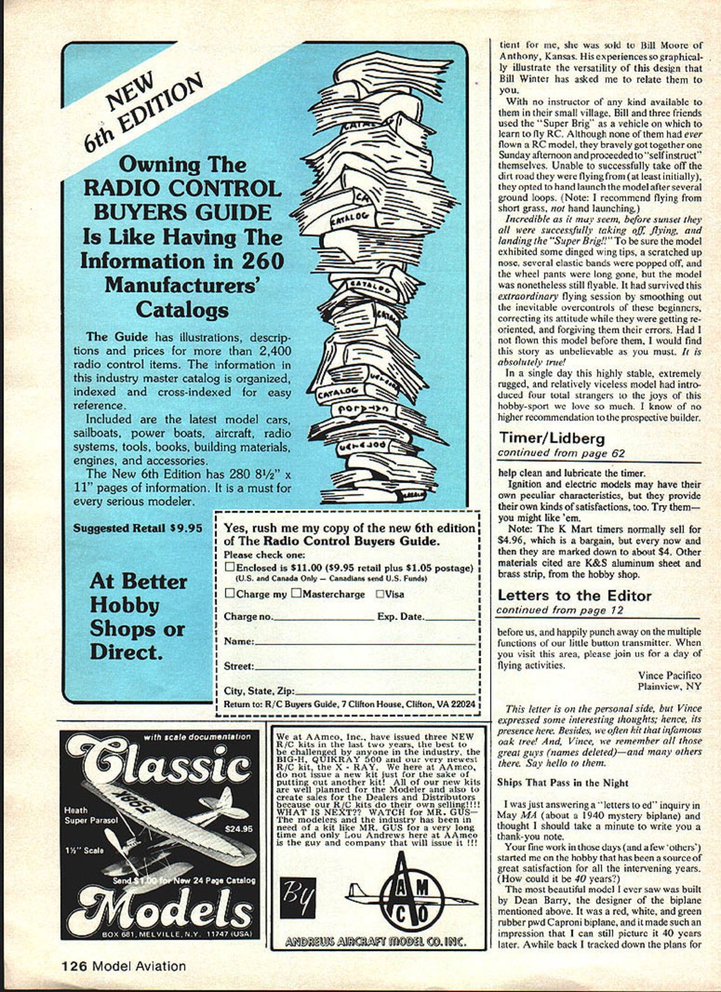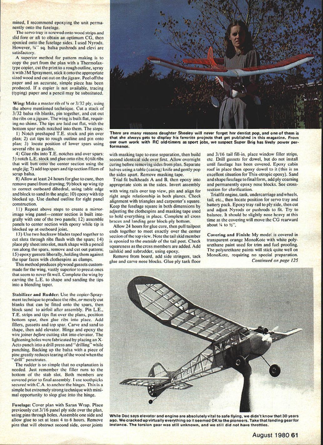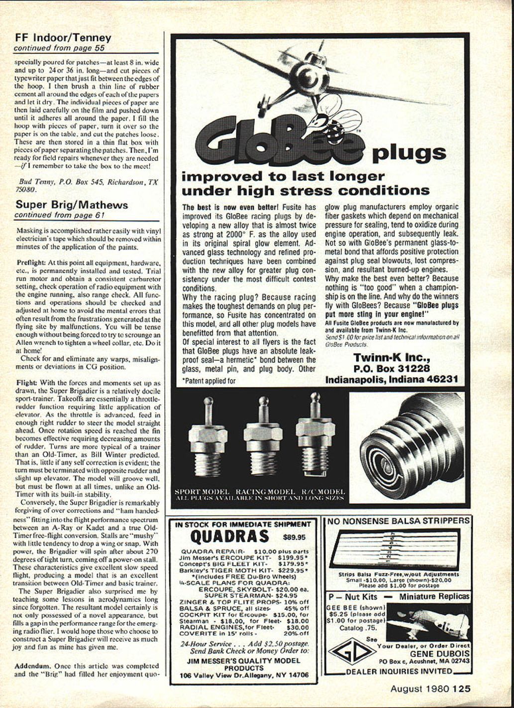 I SUPER BRIGADIER Berkeleys Super Brig first powered RC kit Marking turning point handful experimenters excited masses has singular historic significanceE Dee B Mathews THIS modernized Berkeley Brigadier featur ing simplified stronger structure modified aerodynamics three channels rather original rudder-only development pioneering design requires 30 40 cc power plant throttling device Prospective builders strongly discouraged attempt flying model rudder-only craft designs original form numerous aerodynamic modifications have made increase models airworthiness elevator throttle absolutely essential safe flight First advertised August 1949 Super Brigadier first American kit apowered radio control model Super Brigadier pre dates deBolts Live Wire Guillows Trixter Beam nearly three years both introduced spring 1952 plans Super Brigadier illustrate escapement placed rear fuselage elastics being wound through cabin Also shown original kit plans PAA-load dummy radio equipment illustrated Aerotrol also produced Bill Effingers Brooklyn firm Originally developed 1940 use AYA program see MAN 11-77 details initial Brigadier designed Bill Effinger Henry Struck two men took original planform dimensions added polydihedral strengthened structure develop what became known Super Brigadier daddy year 1949 significant history RC models US late 1949 first commercially manufactured exam-free RC equipment introduced mid-1930s models flown homebuilt radio units ham bands such pioneers Sigfreid Lanzo DeSoto Good Brothers Although articles immense interest published radio expertise required well beyond great majority possibility exam-free frequencies long dream AMA 1949 FCC announced through efforts AMA several exam-free licensed channels would become available model use opening up radio technology nonelec tronics background modeler prompted several manufacturers enter market earliest license-free units Citizenship units McNabb 465 later 27 Beacon units commercialized Good Brothers designs units Radio Control Headquarters supplying compo nents experimenters since prior WW II Berkeley Aerotrol designed Ed Lorenz might interested primi tive gas-tubed super-regenerative elastic-banddriven escapement units referred excellent article MAN March 1949 term prima tive may seem unfair However gas tubes notoriously unstable circuitry almost invari ably designed minimize weight elimi nating components batteries dry cells immense relative weight Suffice say typical flying session involved constant tuning compensate discharging batteries satisfactory tune attained often experienced harmonic vibratory run away escapement motor tuned retrospect fact becomes glaringly appar ent meaircraft infinitely reliable 58 Model Aviation V K BLOCK BALSA ENGINE COWL SIDES 1/16 PLYWOOD BOTTOM3/16 SI-EET BALSA UNDER BATTERY AREASIDE DOUBLER SIG SH 125 GROOVED BLOCKS MOJNT SIG NP BM 231 PRE-BENT LGEAR WIRE 3/16 X I/2BALSA LEDGE3/16 BALSA SHEET RUODERAND FiN PARTS 316 50 SPRUCE FRAME 3/32 SHEET BALSA RIBSI PTIONAL 1LIGHTENING HOLES 3/16 BALSA PLATFORM NYRODS TO TEL HORNS I/2X 3/4 BALSA L EDGE L4X 1/2 BALSA SPAR 3/32X I/4SPARSTOP8 BOTTOM 3/16 50 SPRUCE POST SKID 316 50 BALSA FRAMES I/32PLtWOOD SICE -BOTTOMATTAL 3/32 TIP FORMS Ls X 1/4 SPRUCE STRINGERS 121 RW6LLTO TAL 3/32X 3/16 FUSELAGE DIAGONALS 3/16 SHEET BALSA IARNG TIP FORMERS 7 / 3/32 SHEET BALSA ALL WTNG RIBS /21 3/4 BALSA WING LEDGE 111 I/B X 3/16 SPRUCE SPARS TOP AND BOTTOM REAR I/B X 1/4 SPRUCE SPARS TOP AND BOTTOM FRONT / N 3/16 SHEET BALSA GUSSETS 3/16SHEET BALSA WING SADDLE B 1/16 PLYWOOD BULKHE AD _L 1/16 PLYWOOD GUSSETS AT CENTER SPAR LINTS 316 DOWEL WING HOLD DOWNS 3A6X 1/2 SPRUCE CABIN HEADERS 3/16 50 SPRUCE3/16 DOWEL CABIN POSTS 16HOLD DOWN N 1/16 PLYWOOD SHEET OVER 3/16 PLYBD FIREWALL STG2O/23 ENGINE ON SIG SH 477 MOTOR MOUNT SERVO TRAY ON 1/2 50 BEAMS 3/16 PLYWCCA CABIN WALLS 3/3 CABIN FORMERS 3/16 50 SPRUCE LONGERONS TOP AND BOTTOM 3/BXI V4 BALSATEDGEFROM TAPER STOCK MI 3/1650 SPRUCE POLYHEDRAL SPAR JOINT 1/16 PLY WOOD GUSSET AT BOTTOM FRAME 14 Sb SH 533S 2 WHEELSSKBOJ ABS IWNTS FULL-SIZE PLANS AVAILABLE. SEE PAGE 128 HV IYN0 C YYPNANFFOBA TOP VIEW NIVNT WING LW0 SYW II SPSCOAII-oreO8oroOo II roe BorroflA AoAWWPeFSoAL II/ISYNOIWfl 7 .0r IN BLOCII NMS3132 OTAN OP LEN \tl Ills OOWeL\C\9 S SILLIVOS fl-V TOErINOrTLe\A//~ 321000132 senoo onoil -J ALL NBC AS VOtE ONMJ NEET TCP VEWTVIYAPLYVOOOO LEFT WANGONNeT See Teofi WEONAL STABIa 0 ________0 ___________________________ I SlS2WEsTIZZZ2jI 31NSLECT TYPSOOL iIZIIIi- / I TOFNBOTTWA H 0132 0 OlE ____________1AIR__G TOTAL NT o GOG VOLeS ELEVATOR ONSOWCT ___ BRIGADIER EFFINGER N NEST STAID KITTEG 1505 BoSeeLeT UGOELS CHANNEL NT SAC MATHEWS OSIARO N _~q ---- - -__ NYTON -T SYNOSOS 5 V SeOeIVES SANS0 SEE LOSGESONS NOTCH FIOWOGOfloe N WTTOWIISAFLVWOCEsASSIEOT FAR C 0 BLOCKIAN PLYWOODsIN TFLTSIN WI-lOS ARNAVIA tOOlS COAMBIA FATTENS306 NONET FLYWOTONYSGO eDIT OEVNSG SPSCOC EPOOT CVSFLTWOOO SASTS SNYNOLT ANN SEEL FASTS RerAN WIrY SIRS CLEAR RAYON BCSeN PATTERN YINO 110 radios Several well engineered aerodynamically sound designs being pub lished among Good Brothers RudderbuginMANMay 1949 Fran McElwees Radart April 1949 Air Trails Citizen Bill Winter MAN February 1950 RC Special Bill Winter Walt Schroder 1948 Mechanics Illustrated Super Brigadier becomes design extremely high historic interest importance represents first commercial break Ausuitable radio control free flight kits era Super Brigadier relatively simple construct much smaller other RC designs flew well became standard time development article prompted remarks Openers MA September 1978 quote vintage RCs fly like converted free flights terms power wing loading performance index roughly half way between Old-Timers modern sport low wings old RC designs could next Klondikegold rush quickly became apparent logical choice subject modernization daddy Super Brig possessed best combination esthetics size building techniques resultant model has proven itself excel lent sport job Admittedly seve